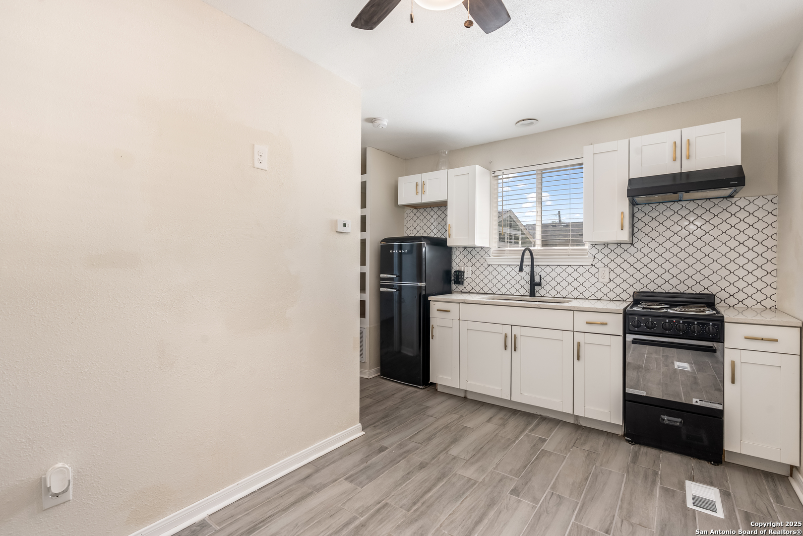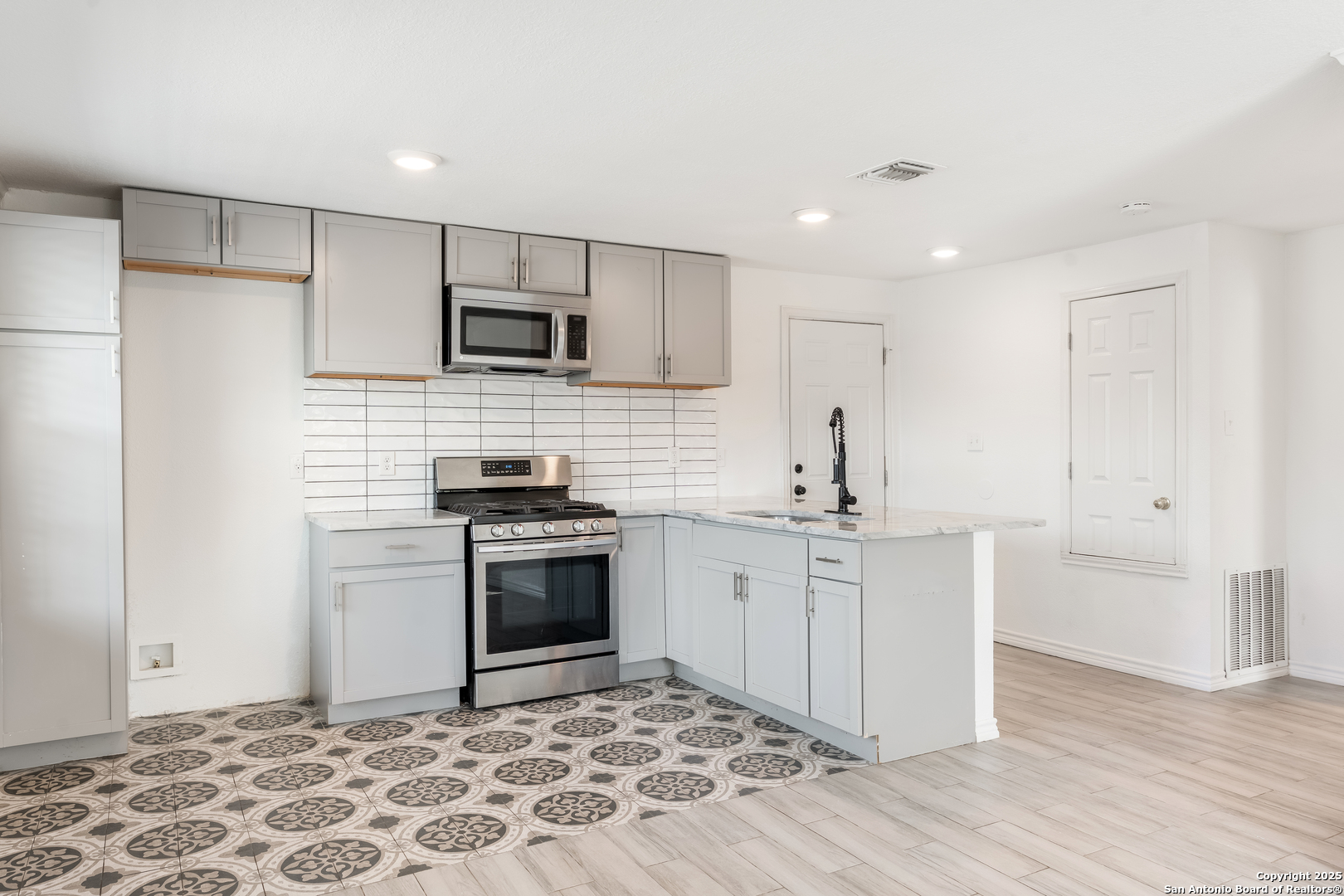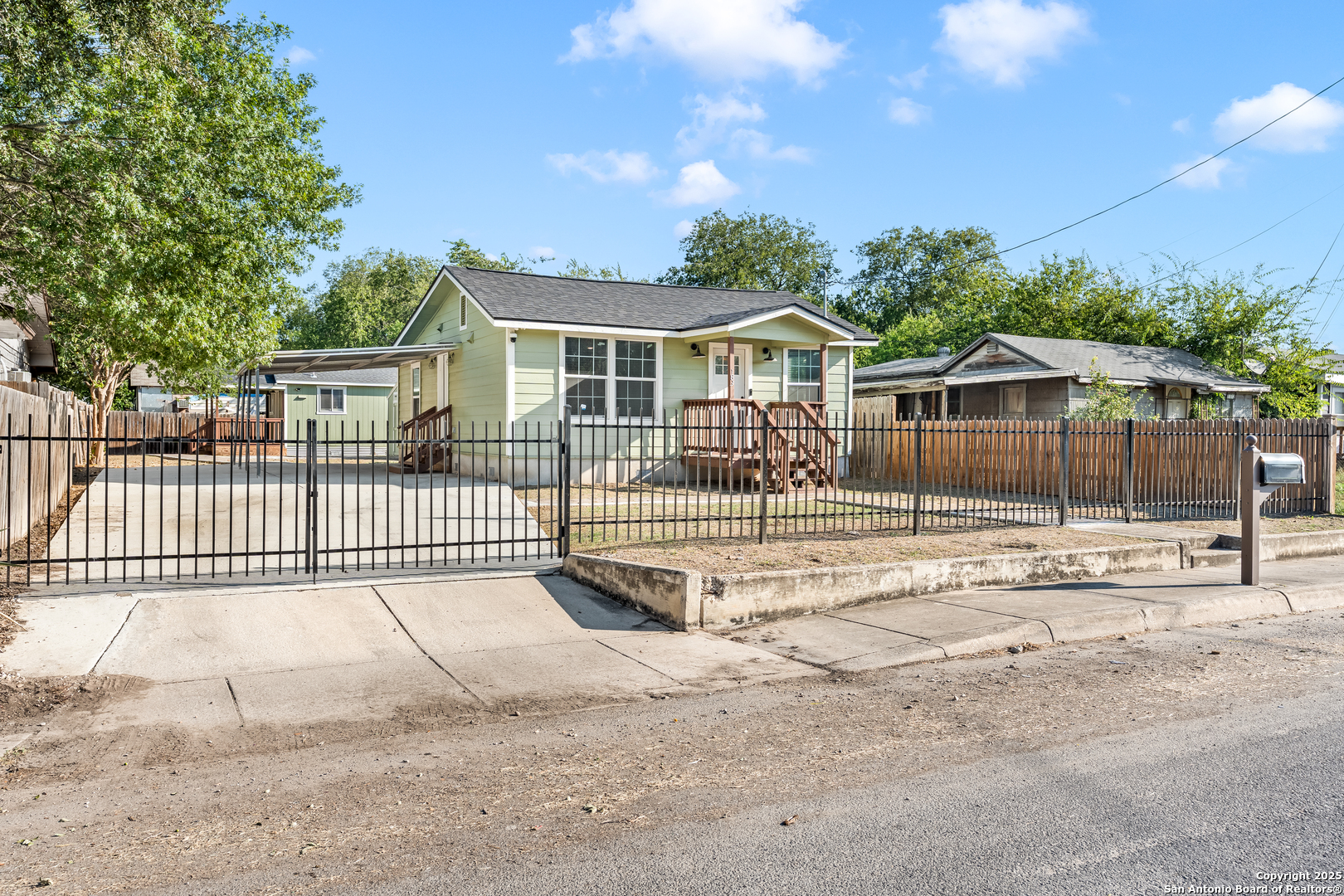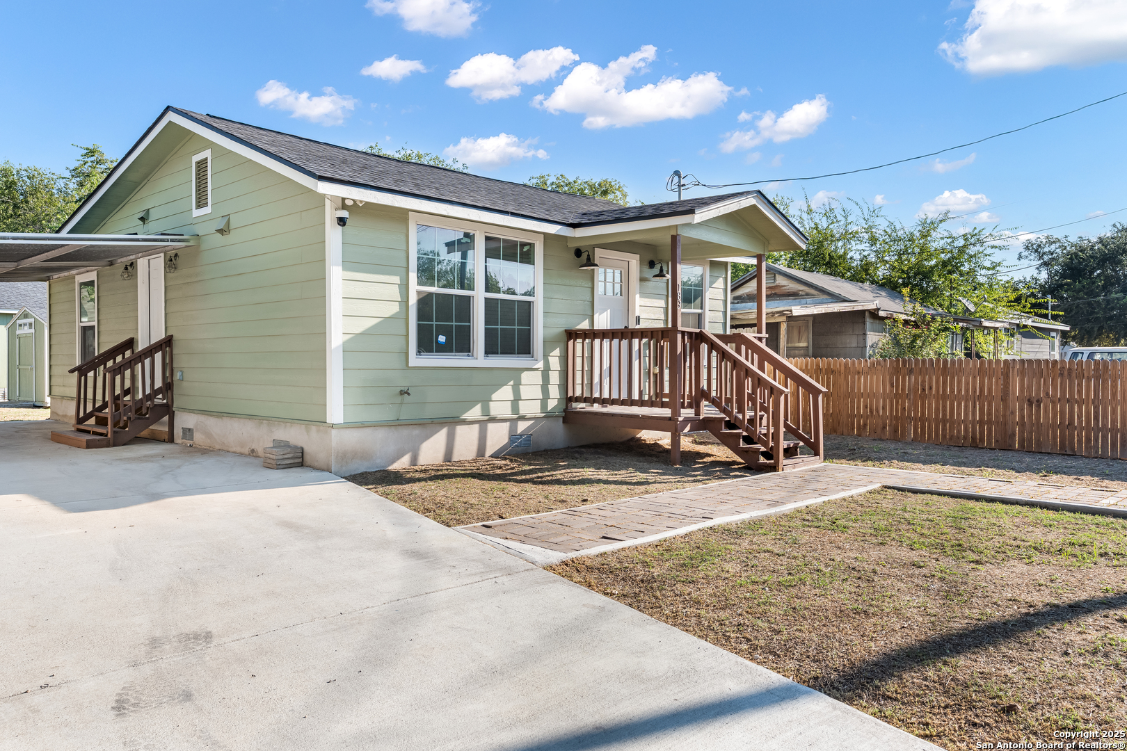 This beautifully updated property features a main home with 2 bed and 1 bath, along with a detached 1 bed, 1 bath unit at the back of the property. The main home offers a bright, open layout with an updated kitchen that includes modern gray cabinetry, subway tile backsplash, stainless steel appliances, marble countertops and gas cooking. The bathroom in the main house has also been remodeled with stylish finishes and a walk-in shower. The detached home is fully equipped with its own kitchen and bathroom with modern updates to include designer backsplash and quartz countertops making it perfect for extended family, guests, or potential rental income. A new air conditioning system was installed in 2021 in both homes, and the property also includes an extended driveway with a gated entrance. A covered carport provides additional parking, while a storage shed adds convenience. This home combines modern updates with flexible living arrangements, offering comfort and versatility, and minutes away from downtown San Antonio.