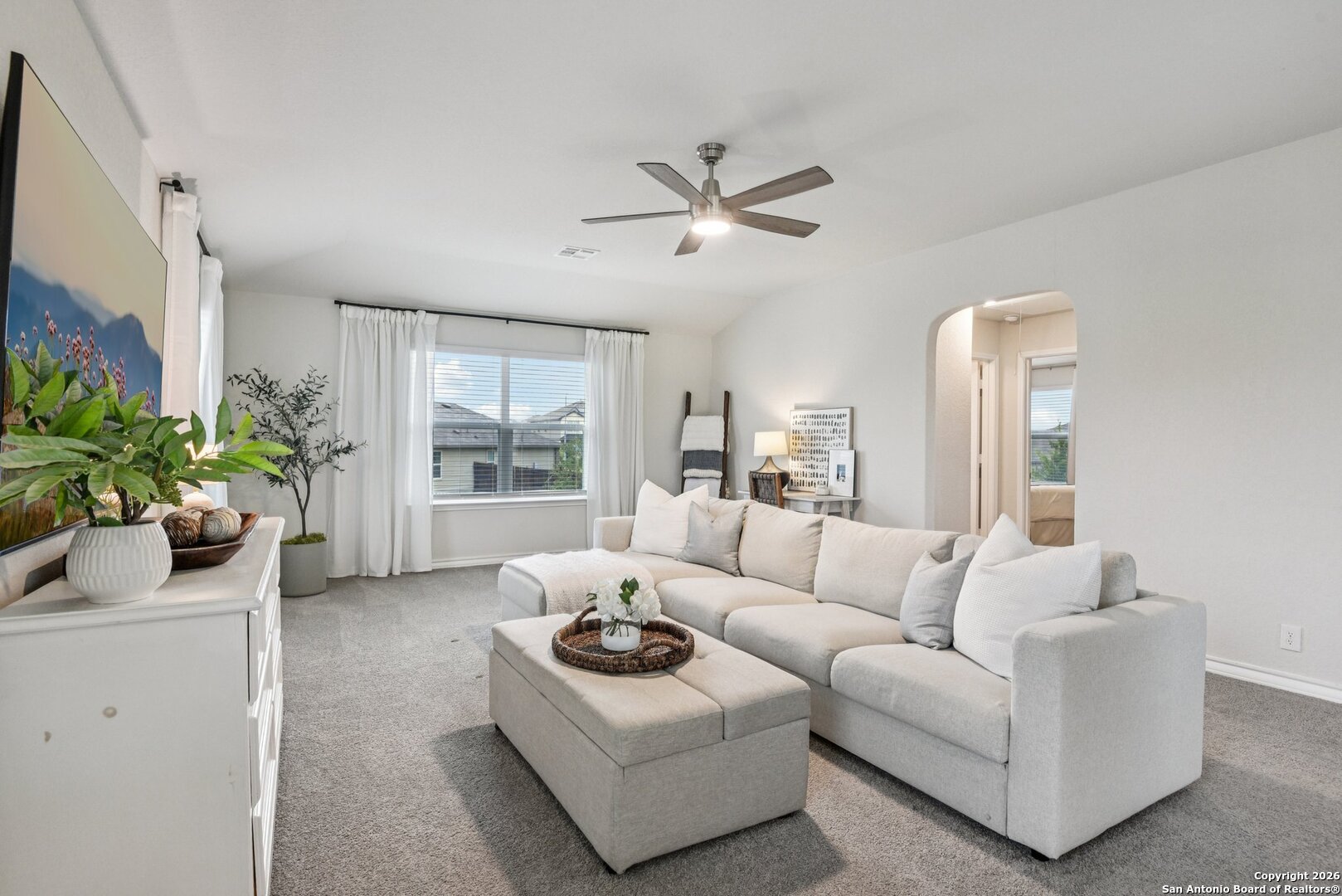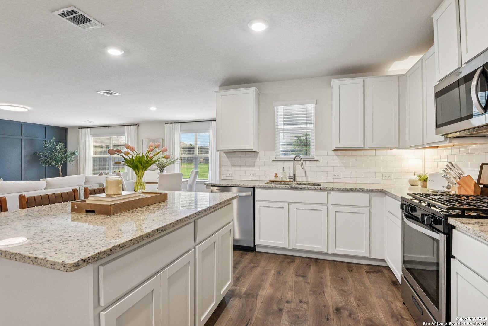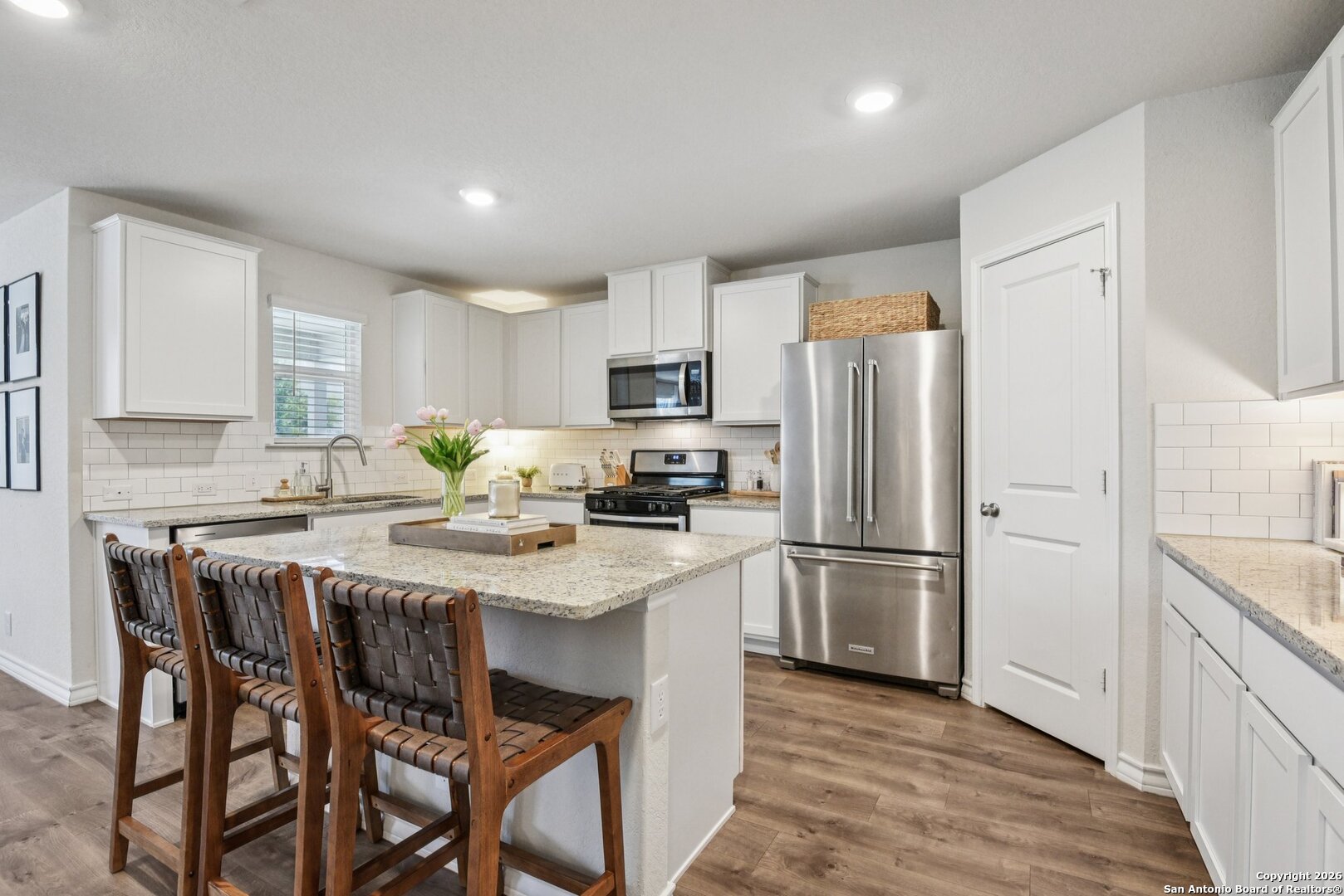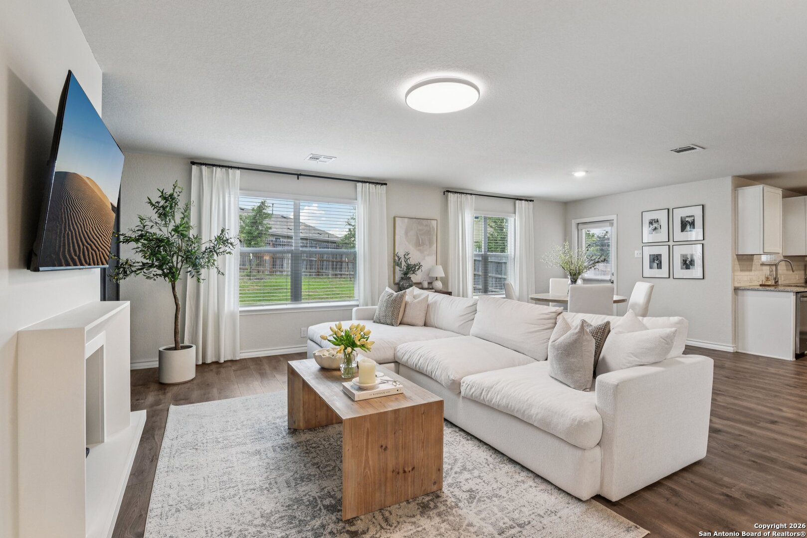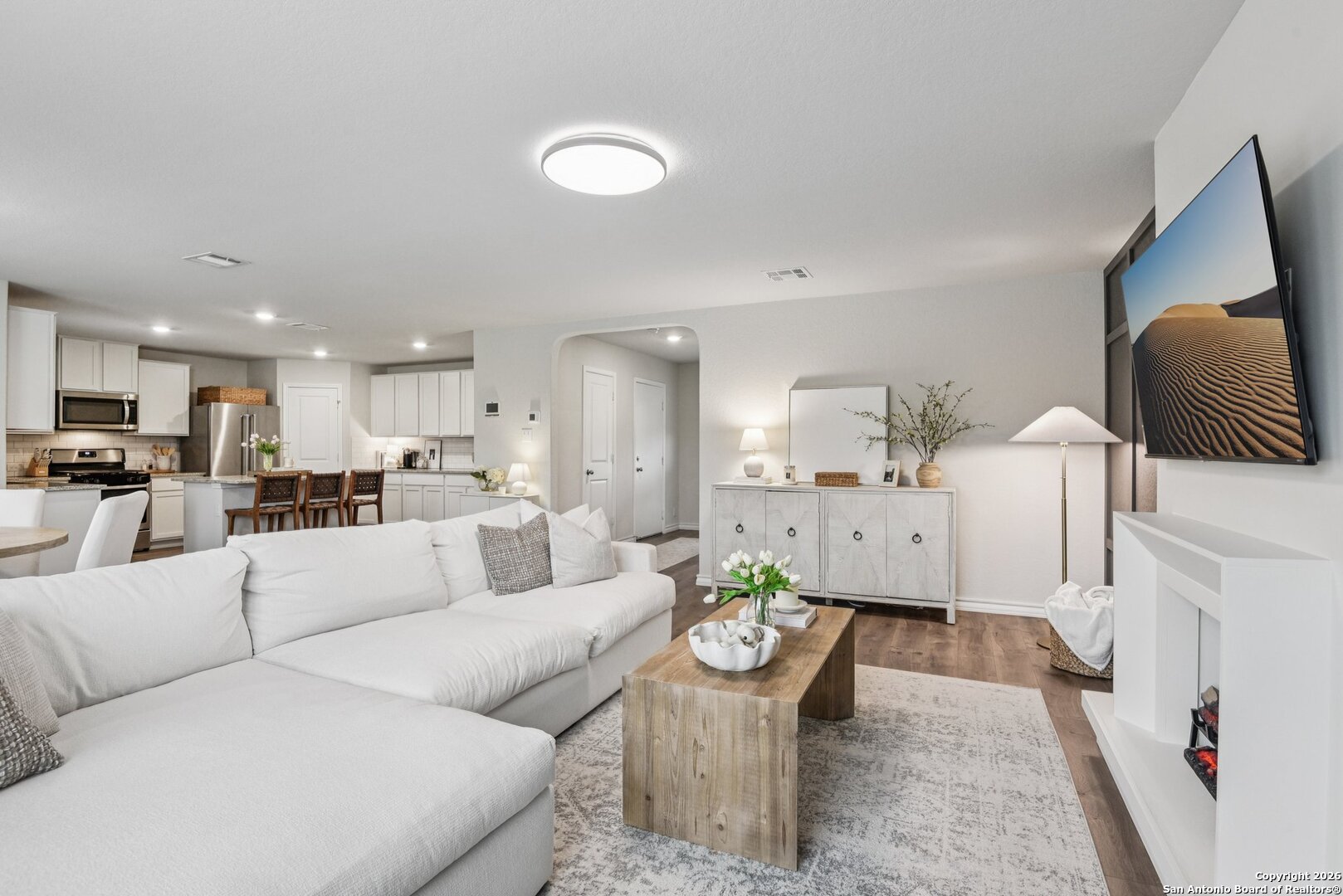 **MULTIPLE OFFERS RECEIVED-PLEASE SUBMIT BEST AND FINAL BY FRIDAY JAN. 23RD AT 6PM**Better than new and truly move-in ready, this beautifully maintained home is packed with upgrades, generous living space, and access to resort-style community amenities. Enjoy approximately 2,279 sq ft of living space with 3 bedrooms, 2.5 bathrooms, and an open-concept design that is ideal for both everyday living and entertaining. Wood-look flooring and cohesive, stylish finishes run throughout, creating a warm and modern feel from the moment you walk in. The open kitchen features quartz countertops, crisp white cabinetry, stainless steel appliances, and a large island that anchors the main living space. The kitchen flows seamlessly into the dining area and out to the expansive backyard patio, creating an effortless indoor-outdoor entertaining layout. An electric fireplace with custom accent wall, ceiling fans, and window treatments add comfort and character to the main level. The spacious primary suite offers a spa-style bath with dual vanities, soaking tub, separate shower, and walk-in closet. Two additional bedrooms, a secondary living area, and a conveniently located laundry room complete the upper level, providing flexibility for a game room, media room, or home office. Step outside to an impressive 34' x 14' backyard patio, offering abundant space for seating, dining, and gatherings. The extended patio makes this backyard an ideal setting for hosting, relaxing, or creating your own outdoor oasis. This home is truly turnkey with a KitchenAid refrigerator plus Samsung washer and dryer included. Located in a resort-style, master-planned community, residents enjoy a pool, splash pad, clubhouse, basketball court, park, and year-round neighborhood events, adding both lifestyle and long-term appeal.