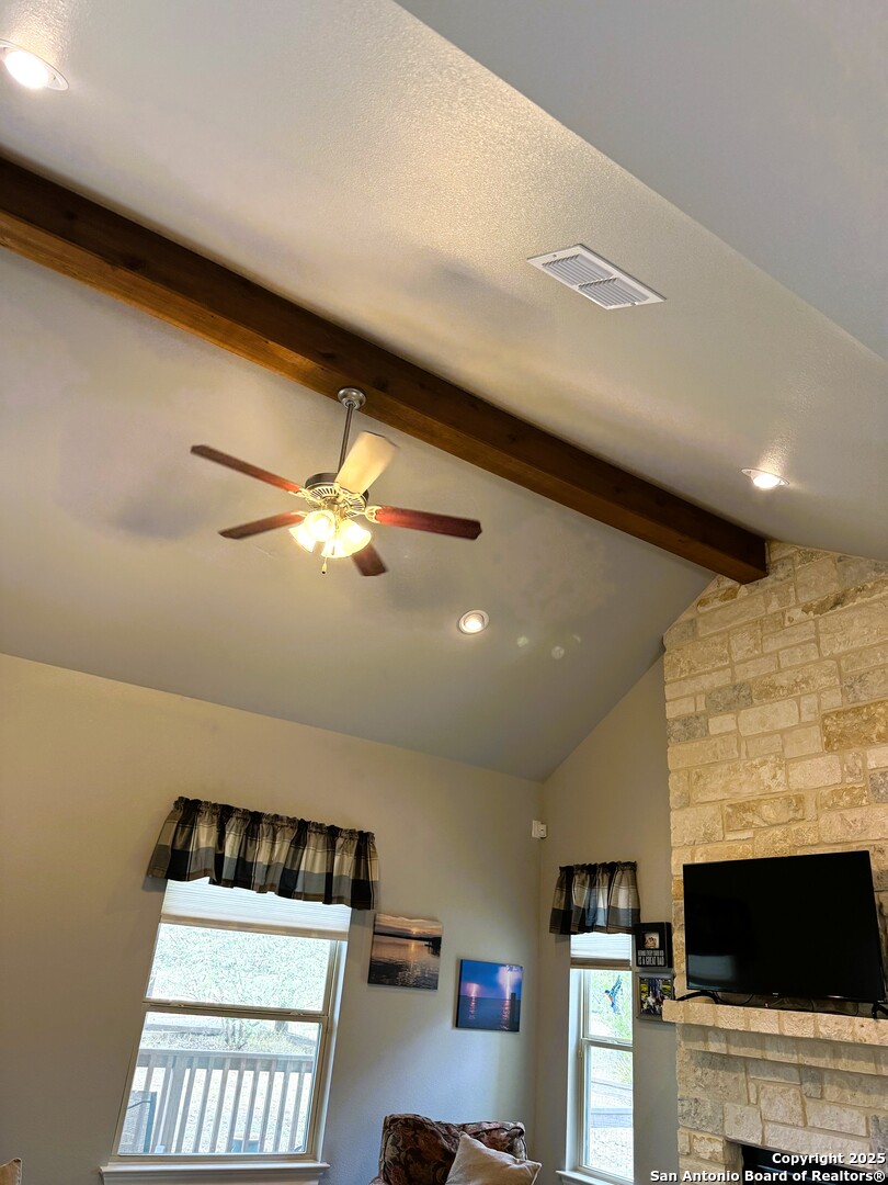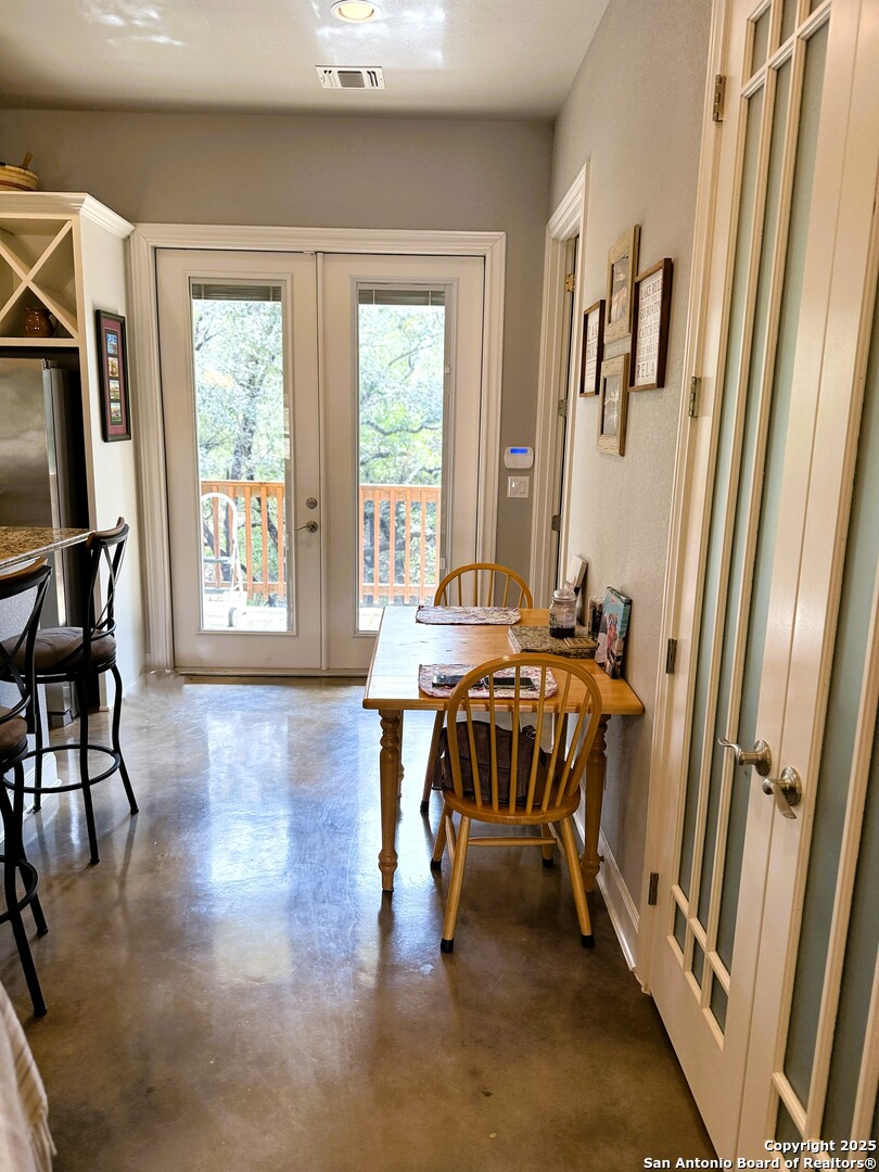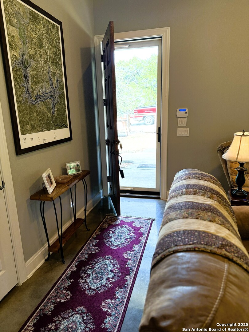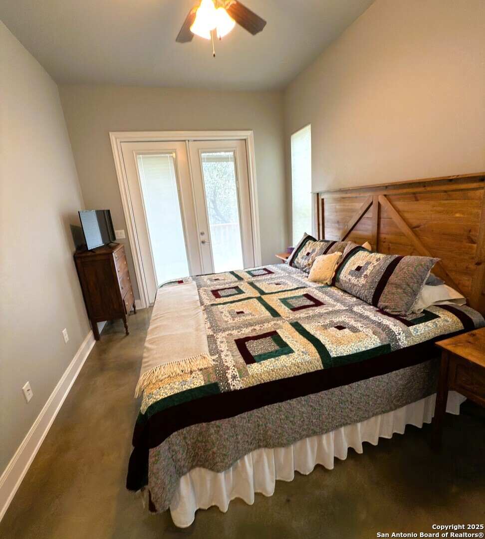 Nestled among rolling hills and shaded by mature oaks, this beautifully crafted Hill Country home blends rustic charm with modern luxury. The thoughtfully designed 2-bedroom, 1-bathroom layout features high-end finishes throughout, including stunning, stained concrete floors, custom cabinetry, and elegant stone accents that reflect the natural beauty of the surrounding landscape. The open-concept living area boasts vaulted ceilings and expansive windows that fill the home with natural light, creating a warm, inviting setting. Two well appointed bedrooms with a beautiful shared bathroom.
