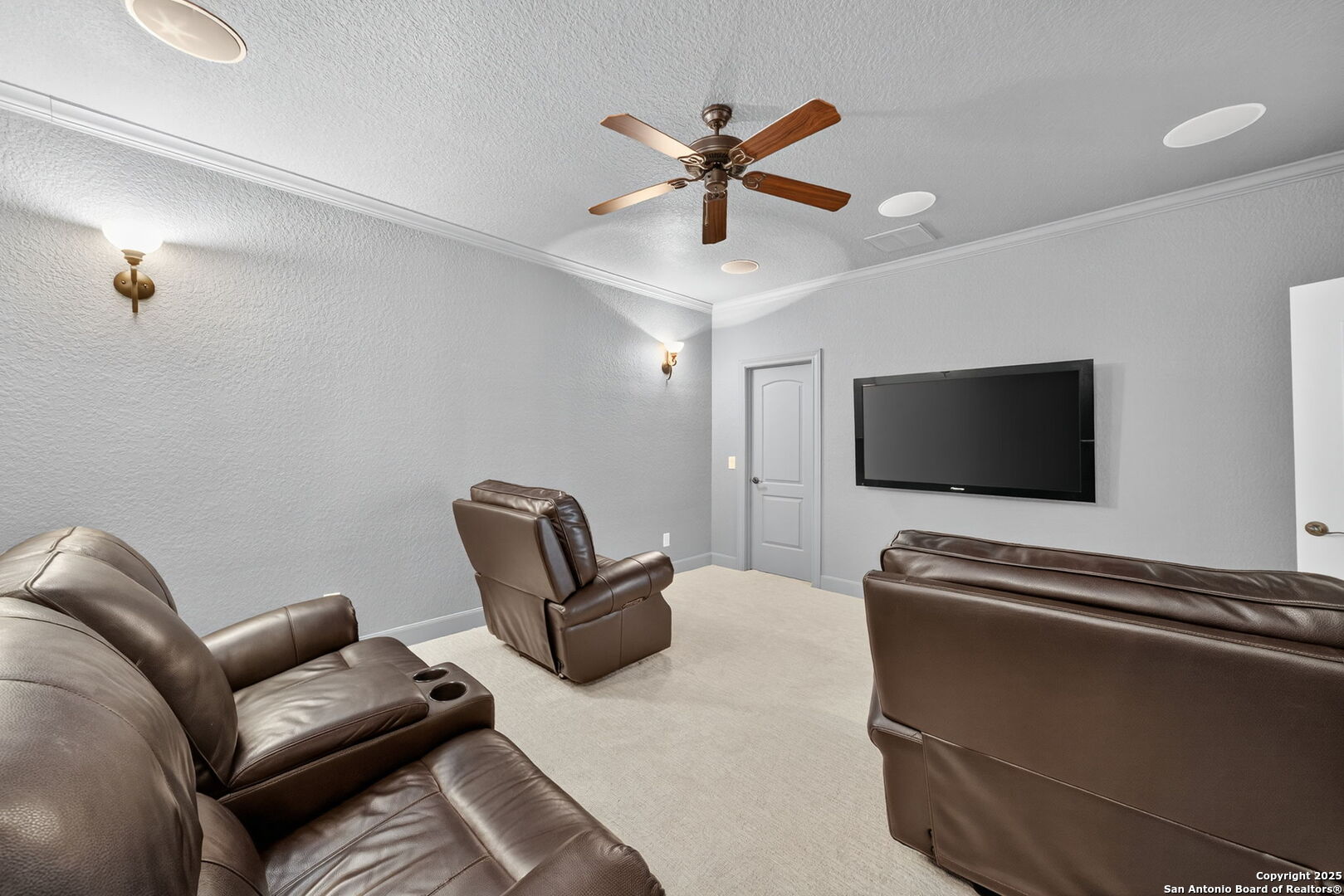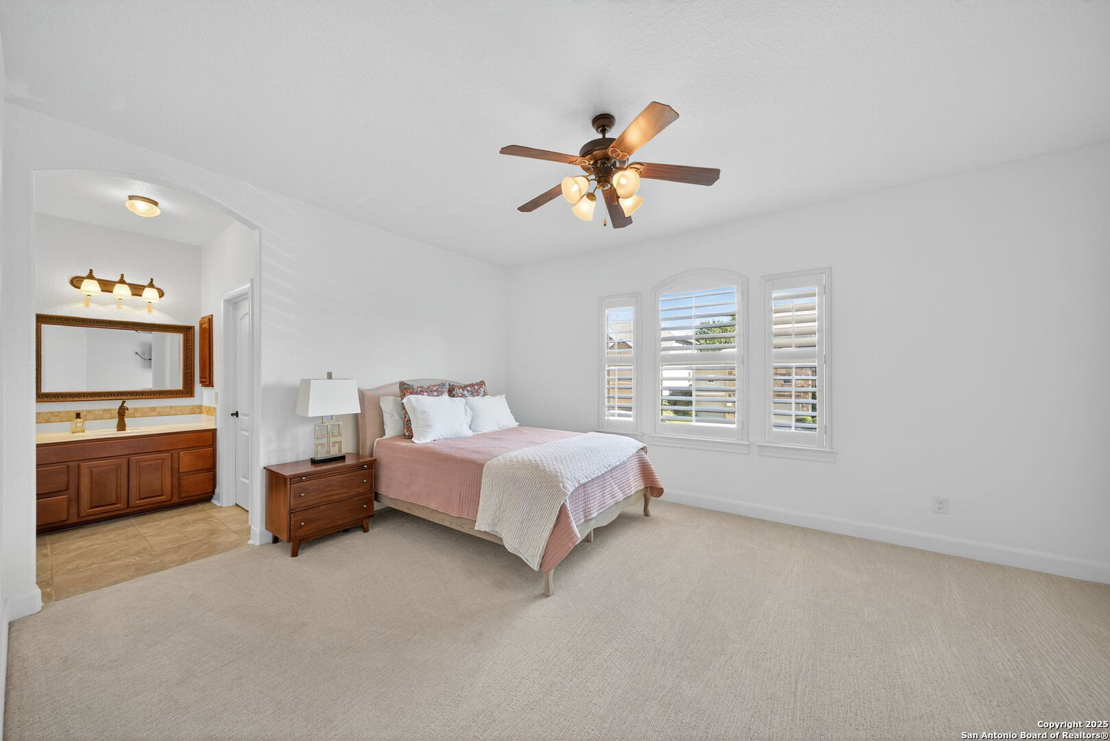 Beautiful 5-bedroom, 3.5-bath home situated on a premium lot in the desirable Rogers Ranch subdivision. The flexible floor plan includes a dedicated study that can serve as a 5th bedroom, along with living and dining areas with high ceilings and an open floor plan. The kitchen features granite countertops, ample cabinetry, double ovens and an large island overlooking the family room. The Butlers pantry includes an ice maker, beverage fridge & a wine fridge. The primary suite on the main level offers a large bath with separate tub and shower and a 2 walk-in closets. Upstairs provides four additional bedrooms, 2 full baths, and a spacious game room & media room. This home also has an amazing amount of closet space along with plantation shutters through out the house. Step outside to a covered patio equipped with a fireplace and outdoor gas grill-ideal for year-round outdoor living and entertaining.
