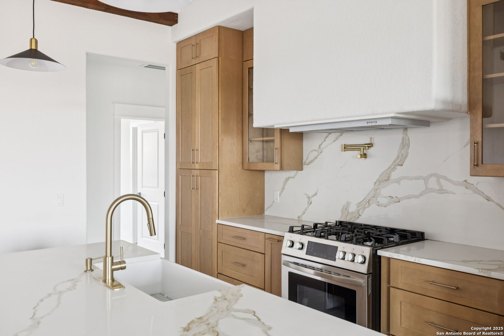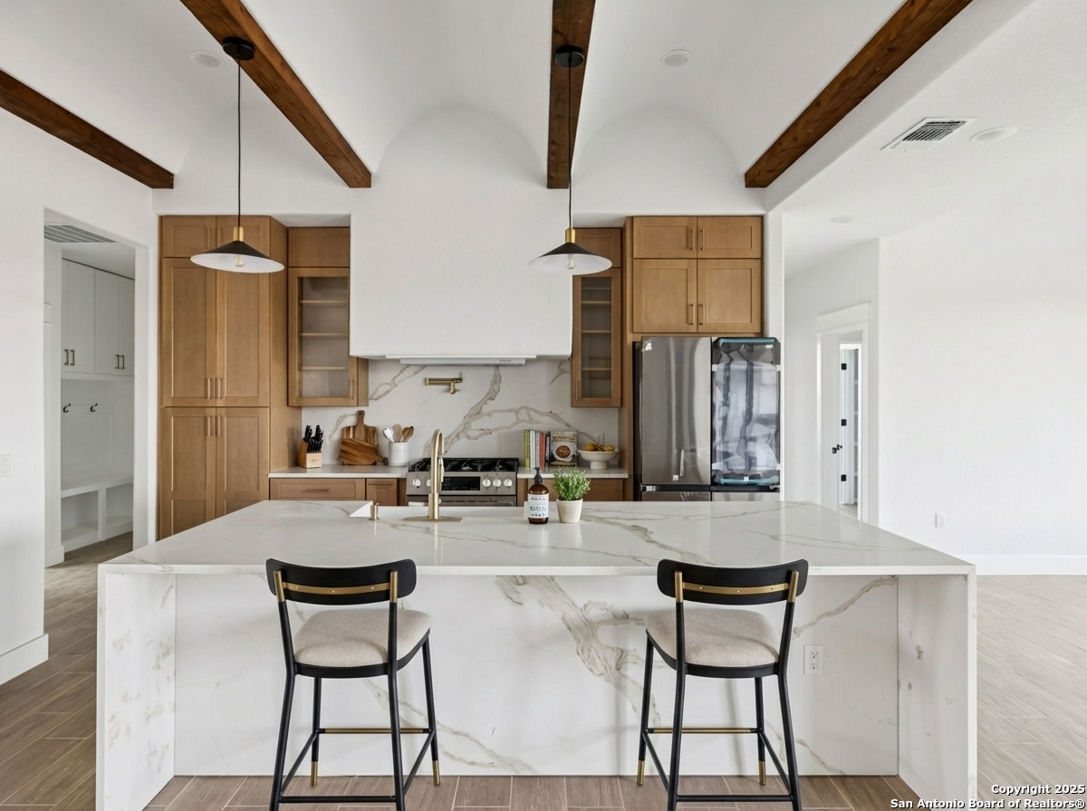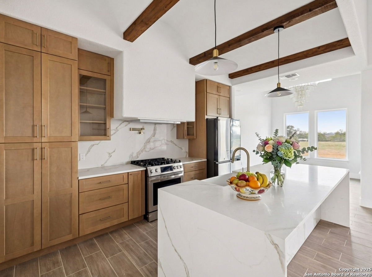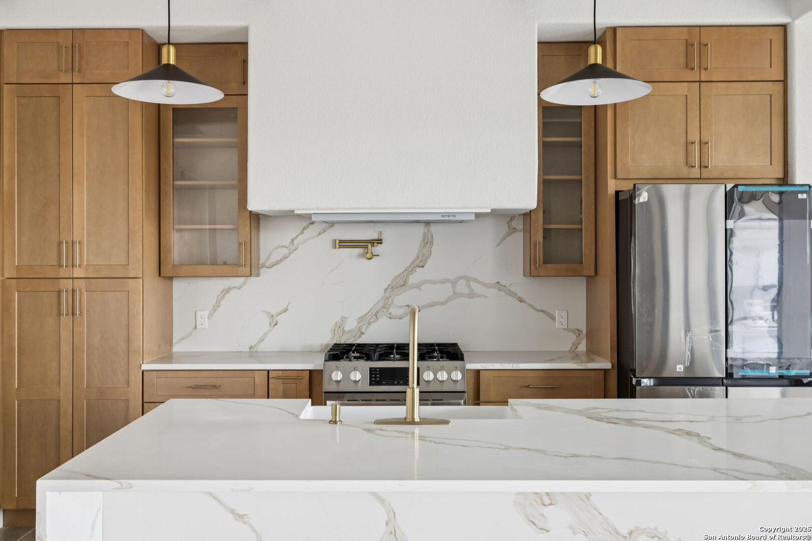 Welcome to a home where luxury living begins the moment you arrive, blending elegance with a sense of peace and tranquility. From the inviting entryway, you're welcomed into a spacious living room with soaring ceilings, a warm fireplace, and abundant natural light that creates a serene atmosphere perfect for unwinding after a long day. The dining area flows seamlessly from the living space, offering a refined yet relaxed setting for gatherings both intimate and grand. The gourmet kitchen is a true centerpiece, featuring brand-new quartz countertops, sleek cabinetry, stainless steel appliances, and a walk-in pantry-all designed to make everyday living effortless and enjoyable. The primary suite is a private retreat, complete with a spa-inspired bath boasting LED mirrors, a walk-in closet, and a soothing tub that invites quiet moments of relaxation. Each additional bedroom offers its own private bathroom and walk-in closet, ensuring comfort and privacy for family and guests while maintaining a calm, restful environment. A dedicated laundry room adds convenience, while the outdoor living space elevates peaceful enjoyment with a covered patio, full outdoor kitchen, and a newly installed sprinkler system that keeps the landscaped yard lush and vibrant. Completing this exceptional property is a spacious three-car garage, providing both practicality and ease for modern living. Surrounded by natural beauty and thoughtful design, this residence offers not only sophistication but also a lifestyle of harmony and comfort.