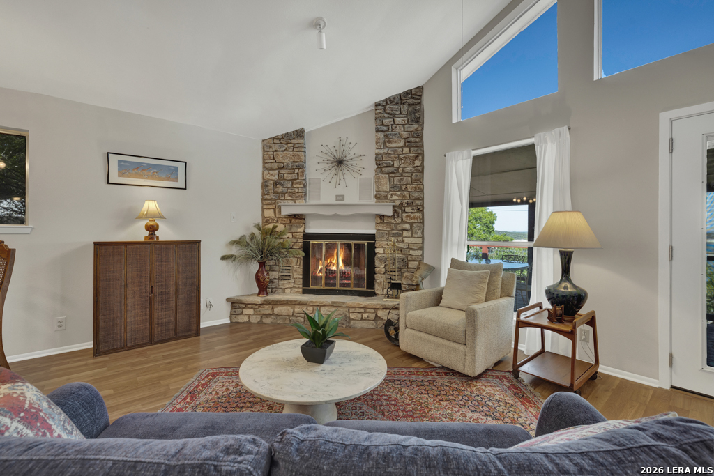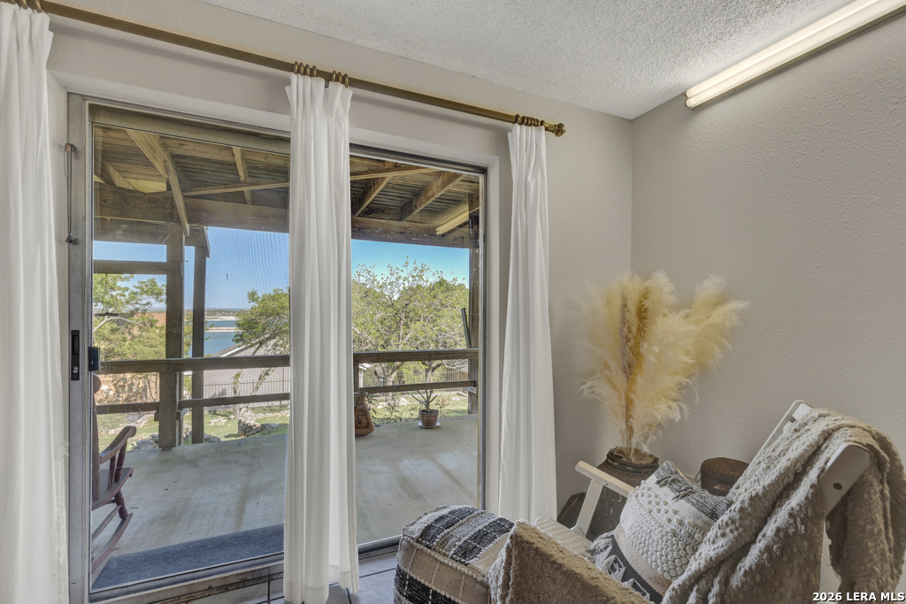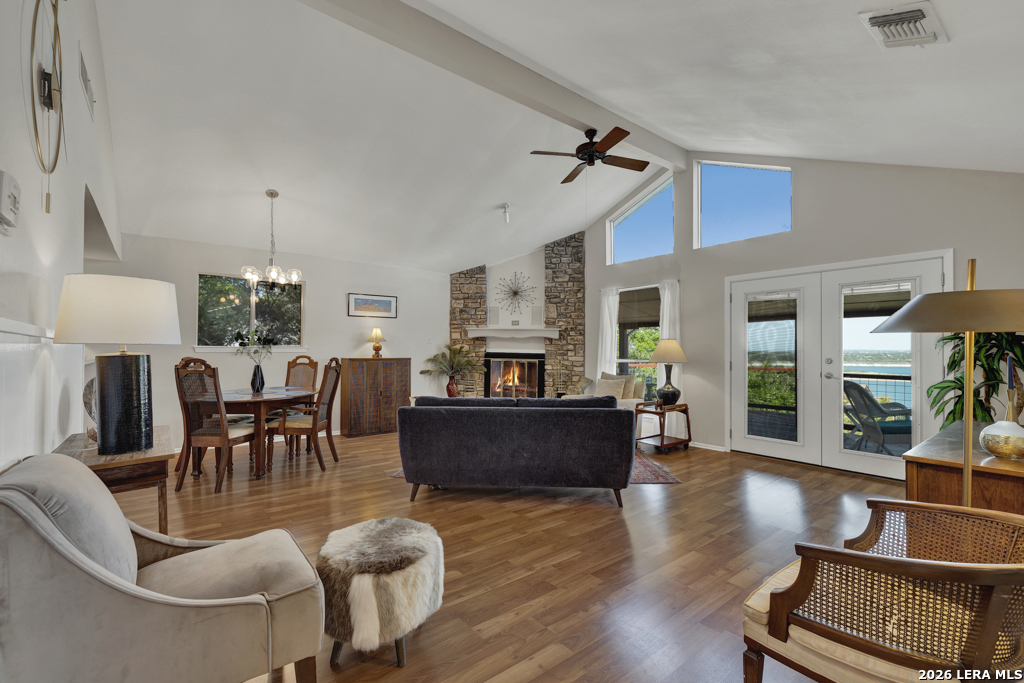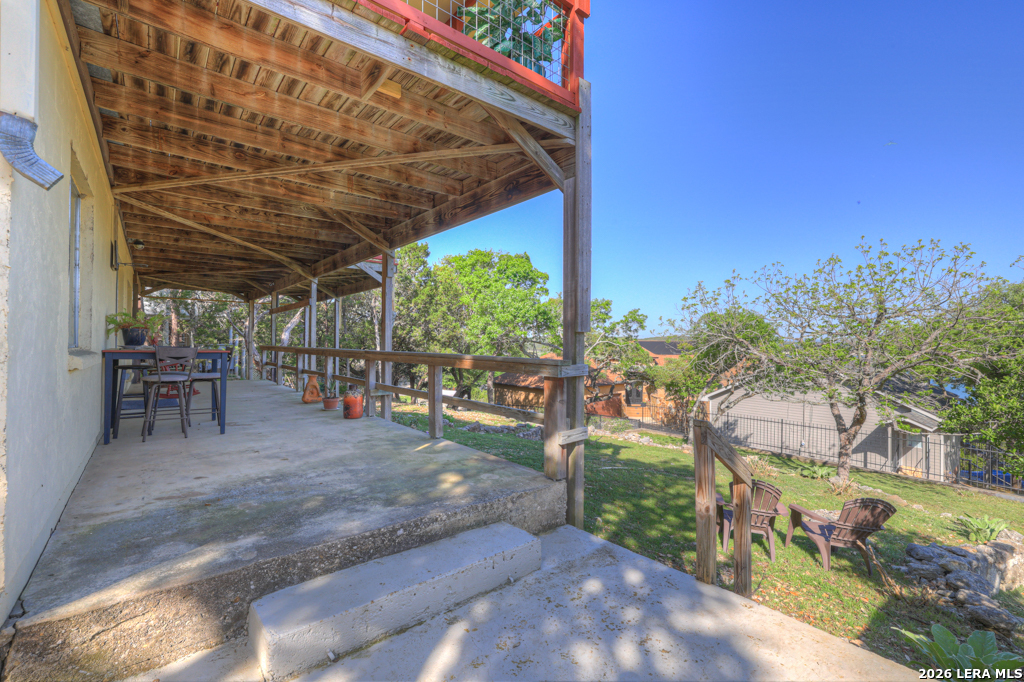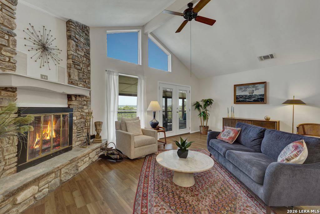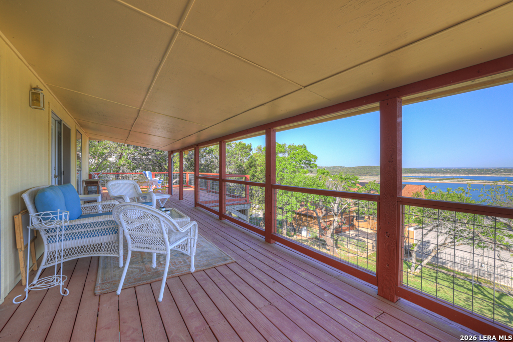 Welcome to your Canyon Lake retreat! Truly two homes in one with breathtaking lake views. Nestled on a .35-acre lot shaded by mature oak trees, this beautifully maintained property offers flexibility, privacy, and exceptional investment potential. The main level lives as the primary residence, featuring 2 bedrooms, 1.5 bathrooms, and an open-concept design that maximizes natural light and captures stunning lake views through soaring ceilings and expansive windows. Laminate flooring and a wood-burning fireplace with blower fan create warmth and charm, while double doors lead to a spacious patio deck, the perfect place to relax and soak in the views. A dedicated laundry room sits conveniently off the kitchen. Connected by an interior spiral staircase, yet also accessible through its own private exterior entrance, the lower level functions as a fully self-contained second home. Complete with 2 bedrooms, 1 full bath, a full kitchen, dining area, living room, and its own laundry room, this space is ideal for multi-generational living, hosting guests, or generating income as a short-term rental. Outside, enjoy two separate driveways, including boat-friendly parking, front and back porches to capture lake views throughout the day, a storage shed, and a grassy yard perfect for relaxing or entertaining. With HOA amenities including tennis courts and a clubhouse, minimal restrictions, and short-term rentals allowed, this property offers both lifestyle and income potential, just minutes from the boat ramp, shopping, and dining. A rare opportunity to own a versatile lake-view property in one of Canyon Lake's most desirable areas.