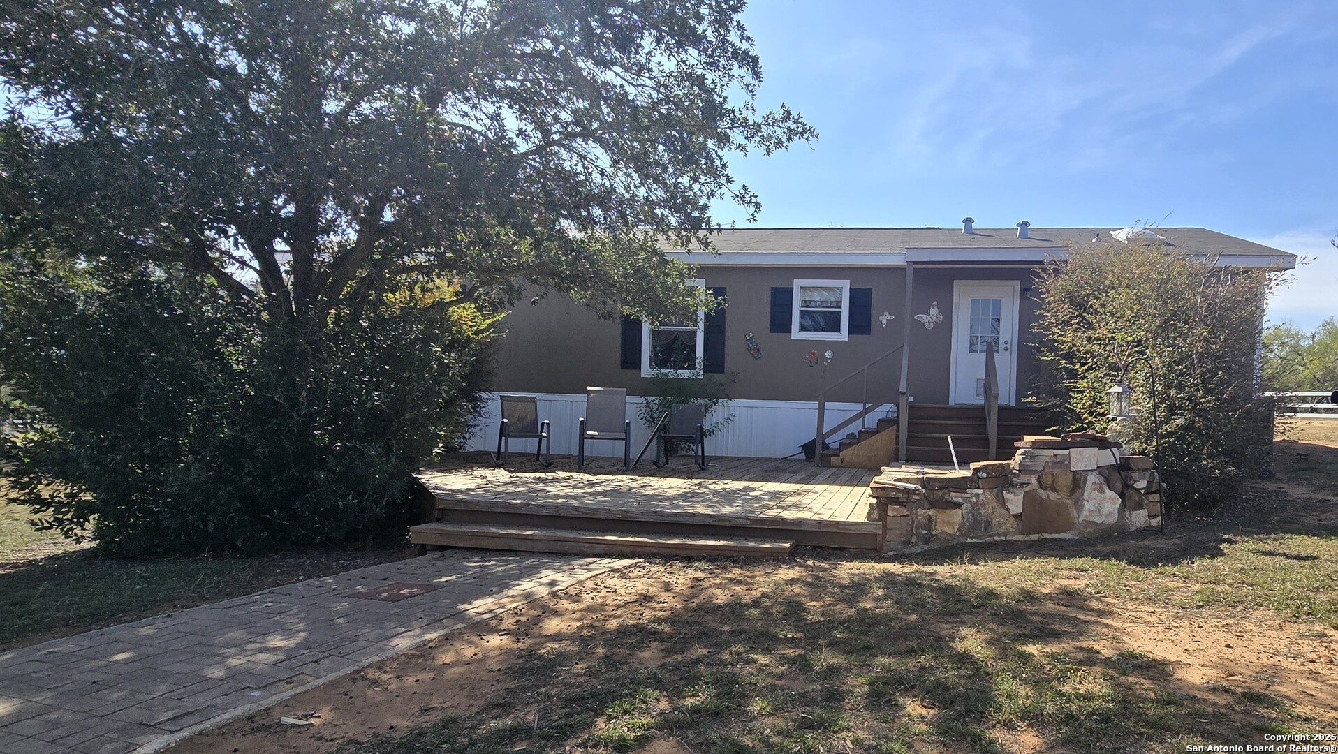 COUNTRY HOME SEEKERS-This immaculate 2006 Clayton manufactured home is situated on 2.075 acres in the fast growing Floresville, TX. Nestled at the end of a culde-de-sac, this property offers a spacious 1474 sq ft layout featuring 4 bedrooms and 2 bathrooms. The inviting living room includes a cozy electric fireplace, and the kitchen boasts an island with ample cabinet space for storage. Step outside to discover country living at its finest. There is a singled carport that leads to a office/study/workshop equipped with water and electricity. The property also includes to additional storage sheds measuring 6'x14 and 8'x11, plus and another open air structure.