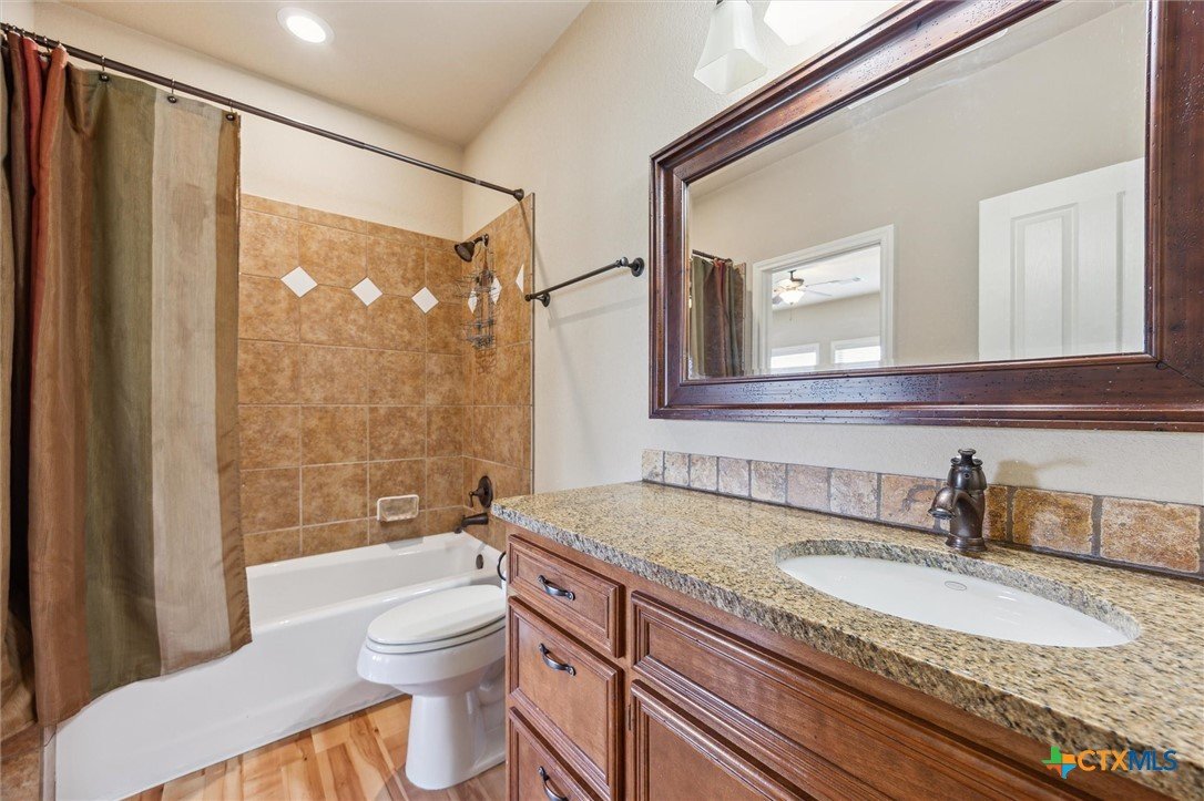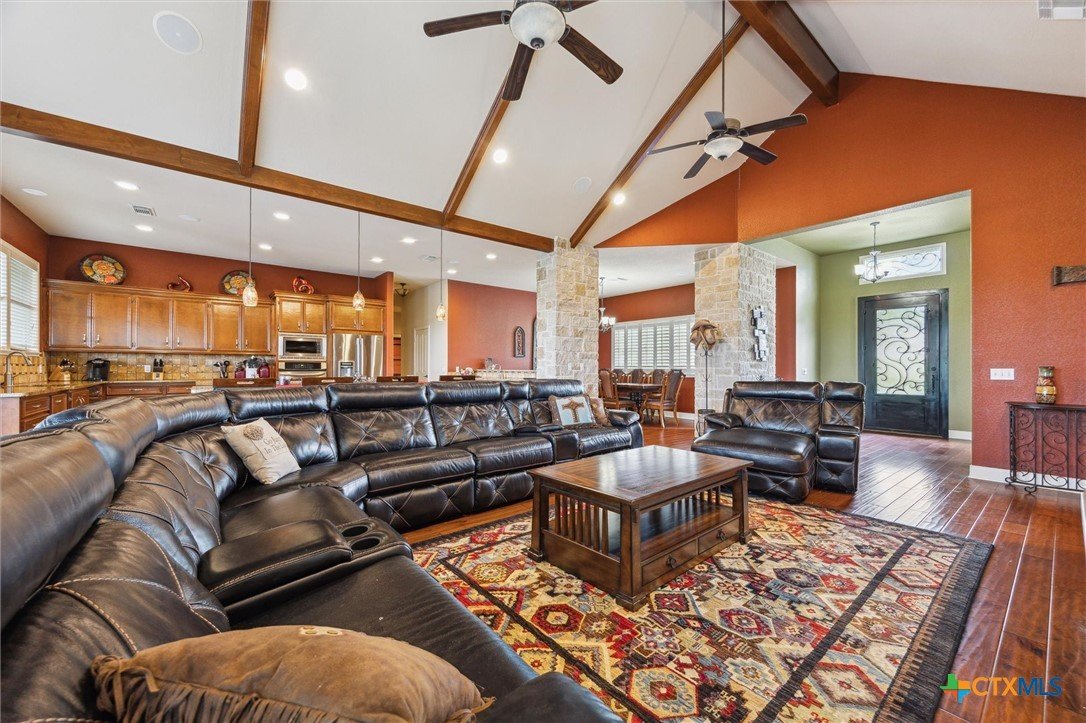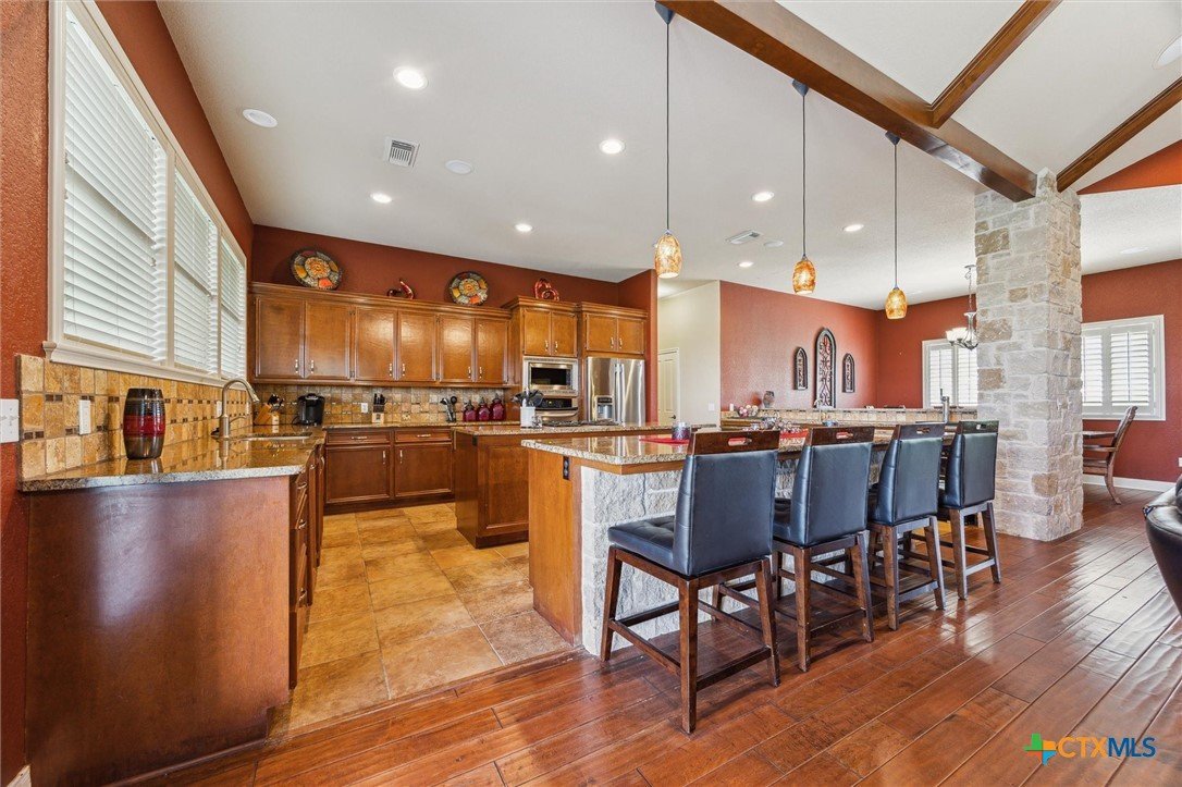 Stunning Hill Country retreat in Mountain Springs Ranch! This 4,337 sq ft custom home on 1.27 acres offers 4 beds, 3.5 baths, and panoramic views of Texas Hill Country. Interior features include soaring ceilings with exposed beams, wood floors, stone accents, and a gourmet kitchen with granite counters, custom cabinetry, stainless appliances, breakfast bar and wet bar. Spacious walk-out basement serves as 4th bedroom or flex space. The 887 sq ft 3-car garage has been converted to a large game/family room—easily returned to garage use if desired. Enjoy the expansive covered patio with outdoor kitchen and fireplace. Community amenities include pools, trails, and fishing pond—all with low HOA. A rare blend of luxury and Texas Hill Country charm!