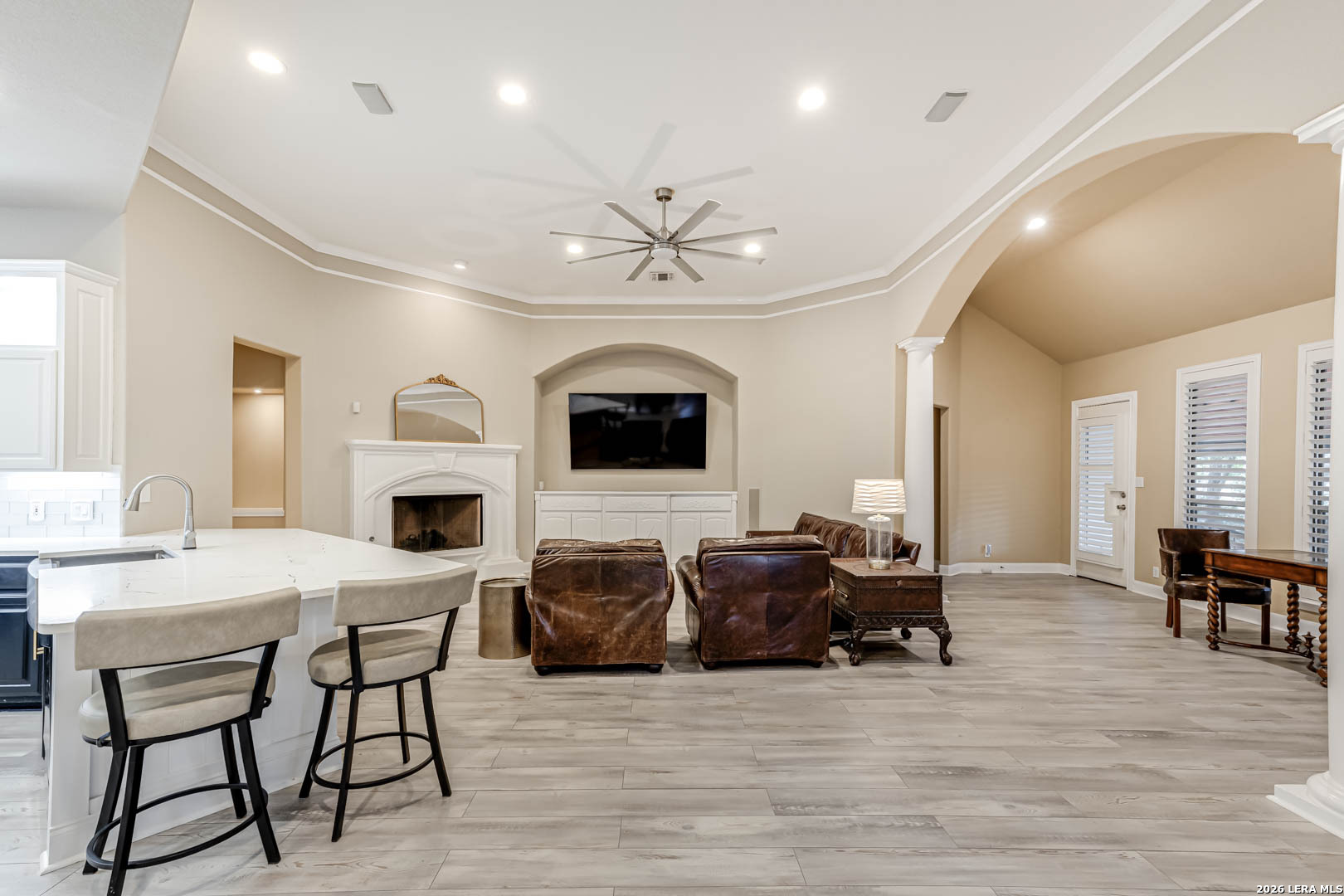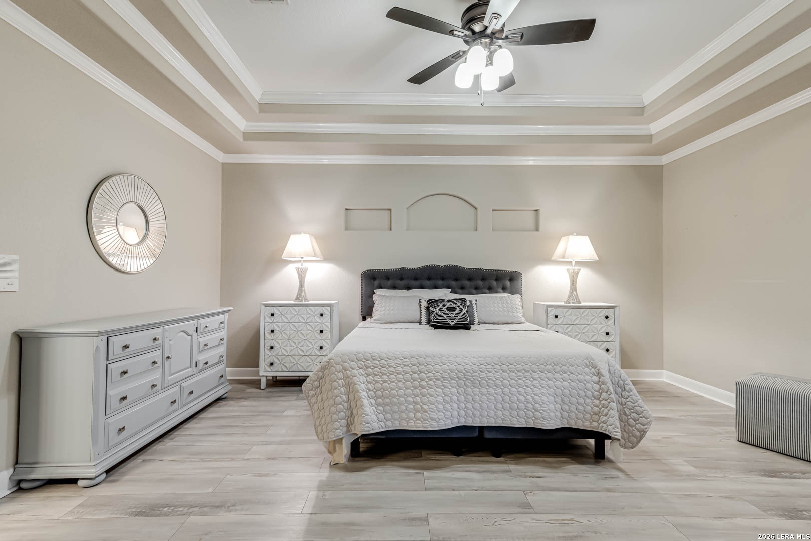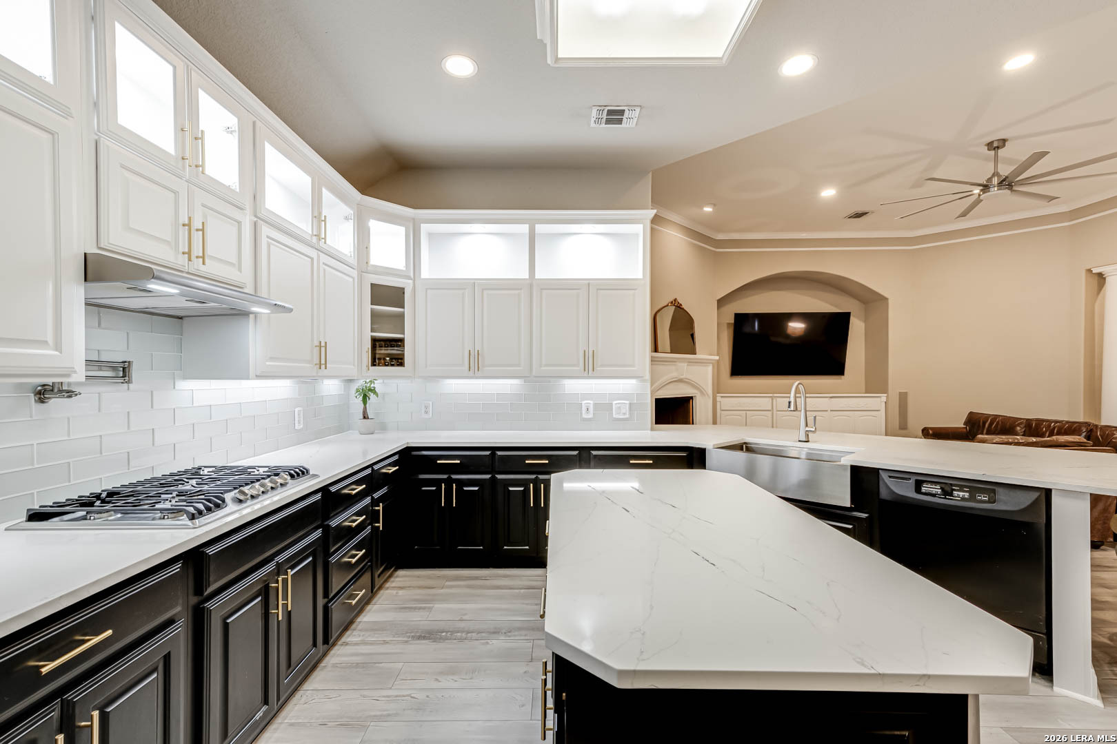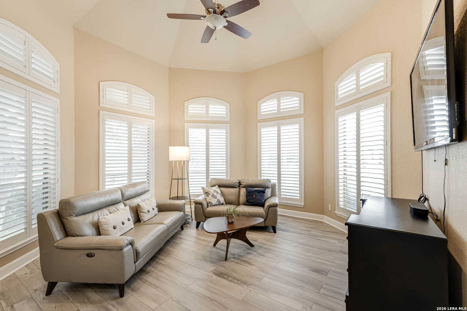 This custom-built Mediterranean-style home offers 3,155 square feet of well-designed living. Located on a cul-de-sac, with direct course access just a short golf cart ride away, 18930 Calle Cierra is ready to be your next home. Step inside to 20-foot ceilings, where you'll feel an immediate sense of openness, complemented by new flooring and fresh interior paint throughout the home. Nearly every surface has been refreshed, including new interior and exterior paint, new flooring throughout, updated kitchen countertops, back-lit custom cabinetry, new appliances, a newly added gas range, and modern hardware. The open concept living room features dramatic ceiling height and connects seamlessly to the kitchen and dining areas. The primary suite truly feels retreat-like, complete with a private seating area, new custom his-and-hers closets, dual vanities, and a separate soaking tub and walk-in shower. A flexible secondary living space provides versatility for an office, additional dining area, or multipurpose use. Outside, an extended, covered patio creates an ideal outdoor living space, fully equipped with a built-in kitchen, grill, and griddle, perfect for entertaining year-round. Designed for low-maintenance luxury, the property features xeriscaping in both the front and back yards. Additionally, a private putting green for at-home practice has recently been installed. A two-car garage with built-in shelving adds convenient storage Located minutes from major shopping, dining, and easy access to 1604, this home blends privacy, convenience, and resort-style living. Country club membership is optional, allowing you to enjoy the lifestyle as you please. You're invited to come check it out in person! Open House SATURDAY (01/31) from 12-3pm.
