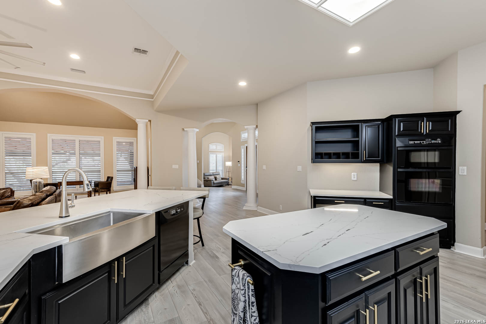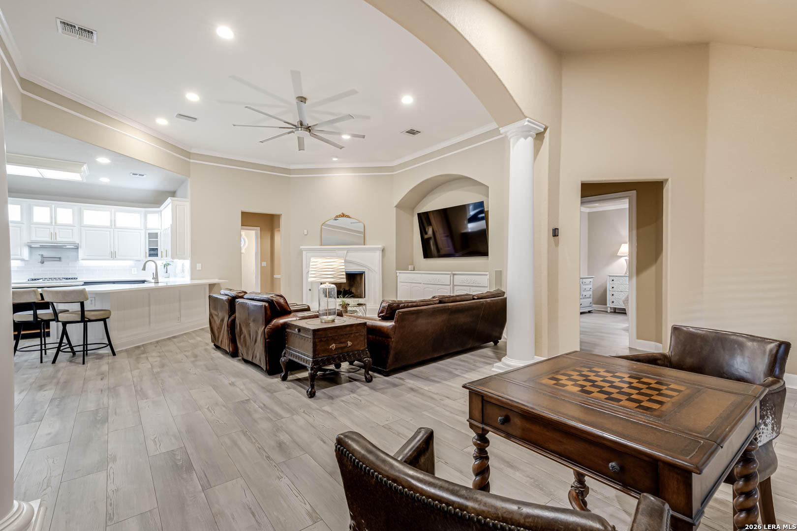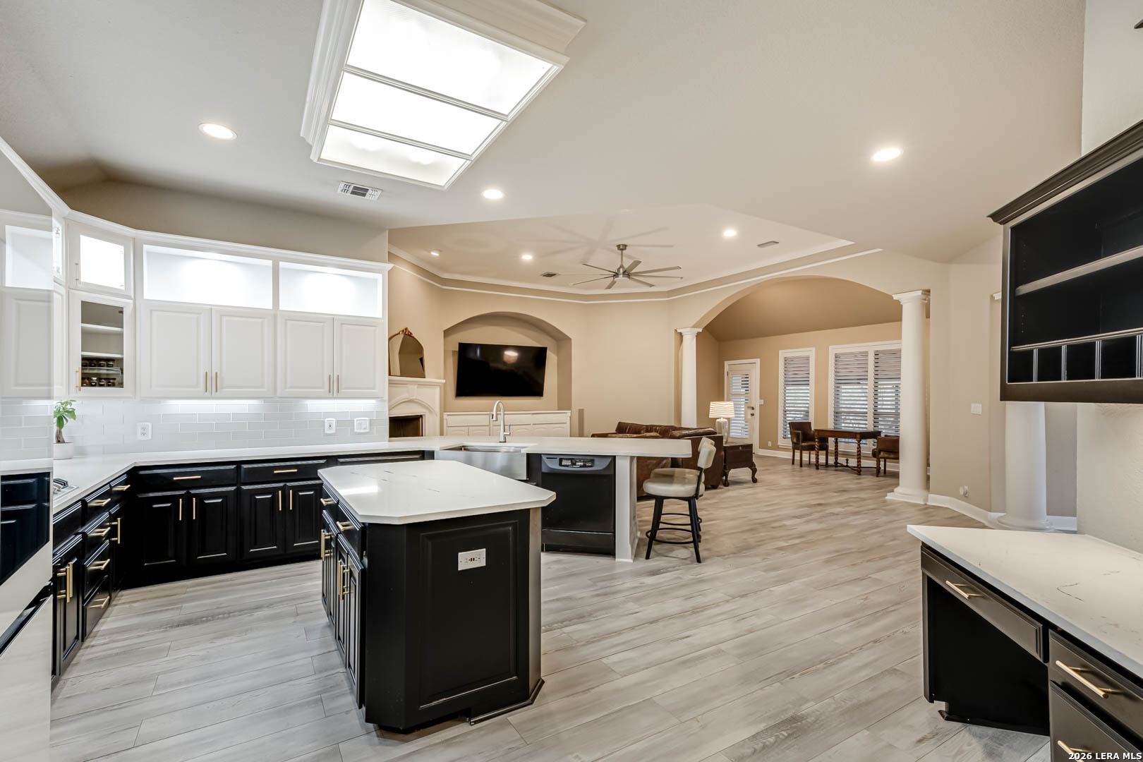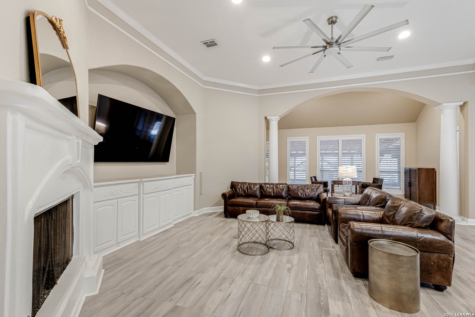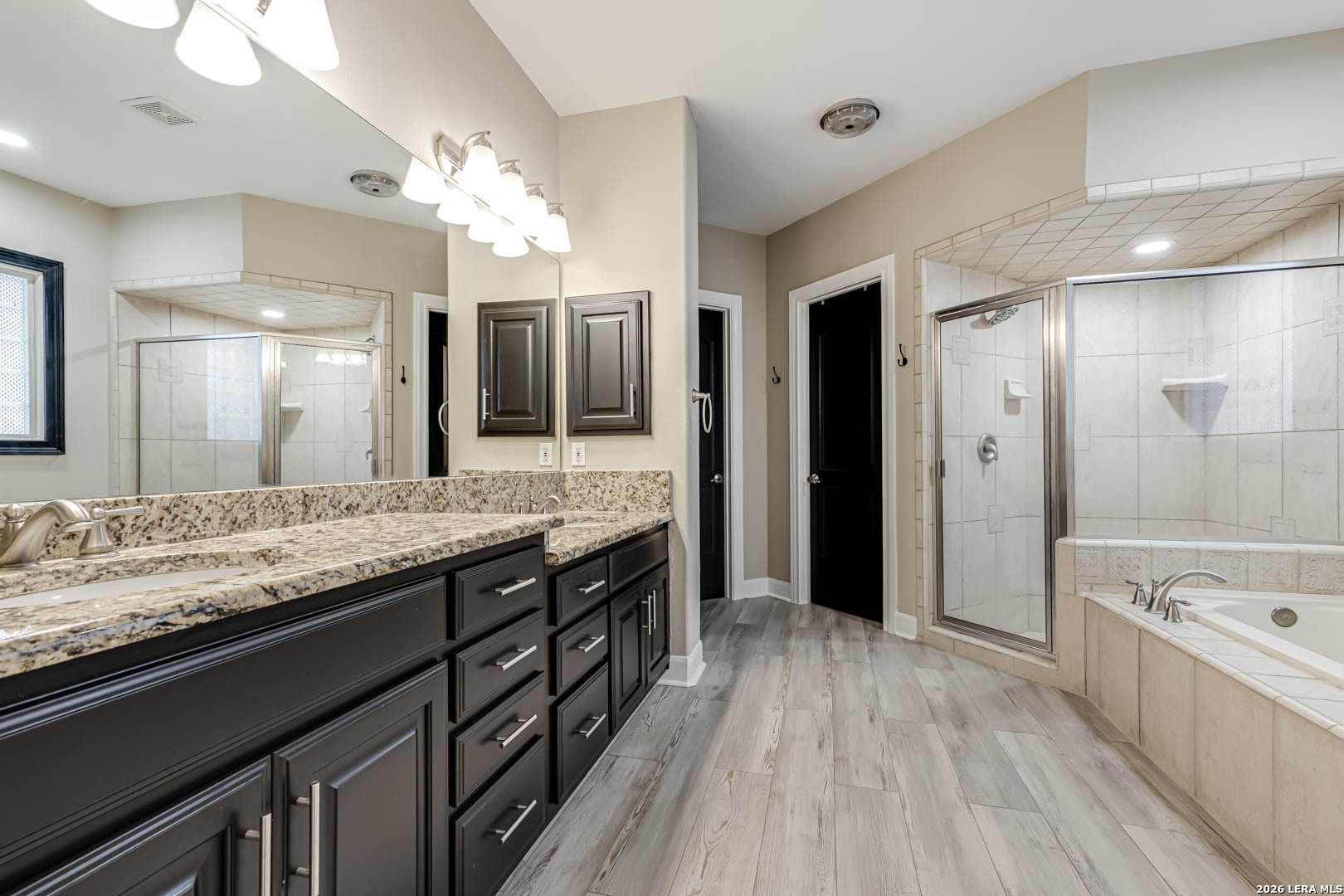 This custom-built Mediterranean-style home offers 3,155 square feet of well-designed living. Located on a cul-de-sac, with direct course access just a short golf cart ride away, 18930 Calle Cierra is ready to be your next home. Step inside to 20-foot ceilings, where you'll feel an immediate sense of openness, complemented by new flooring and fresh interior paint throughout the home. Nearly every surface has been refreshed, including new interior and exterior paint, new flooring throughout, updated kitchen countertops, back-lit custom cabinetry, new appliances, a newly added gas range, and modern hardware. The open concept living room features dramatic ceiling height and connects seamlessly to the kitchen and dining areas. The primary suite truly feels retreat-like, complete with a private seating area, new custom his-and-hers closets, dual vanities, and a separate soaking tub and walk-in shower. A flexible secondary living space provides versatility for an office, additional dining area, or multipurpose use. Outside, an extended, covered patio creates an ideal outdoor living space, fully equipped with a built-in kitchen, grill, and griddle, perfect for entertaining year-round. Designed for low-maintenance luxury, the property features xeriscaping in both the front and back yards. Additionally, a private putting green for at-home practice has recently been installed. A two-car garage with built-in shelving adds convenient storage Located minutes from major shopping, dining, and easy access to 1604, this home blends privacy, convenience, and resort-style living. Country club membership is optional, allowing you to enjoy the lifestyle as you please. You're invited to come check it out in person! Open House SATURDAY (01/31) from 12-3pm.
