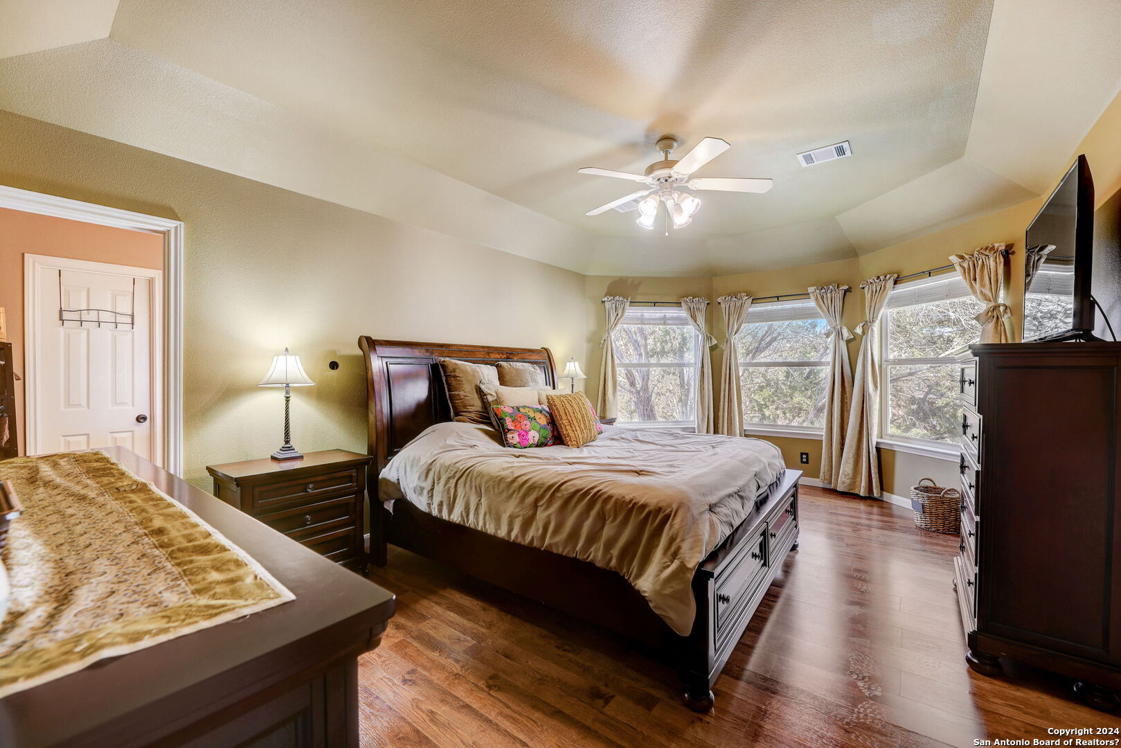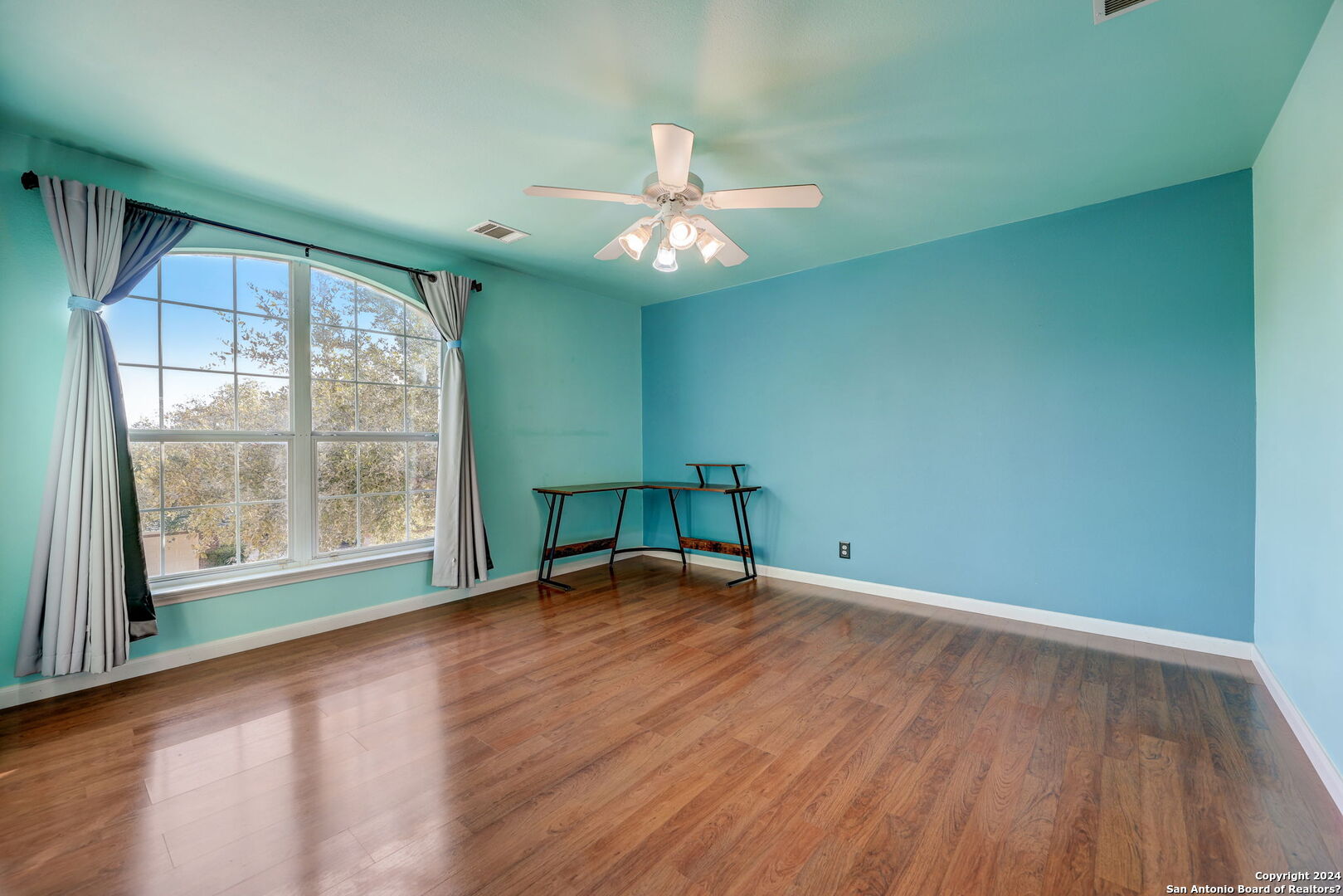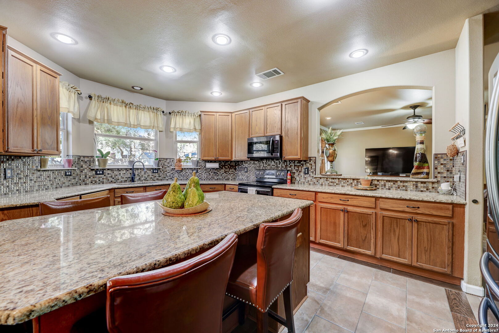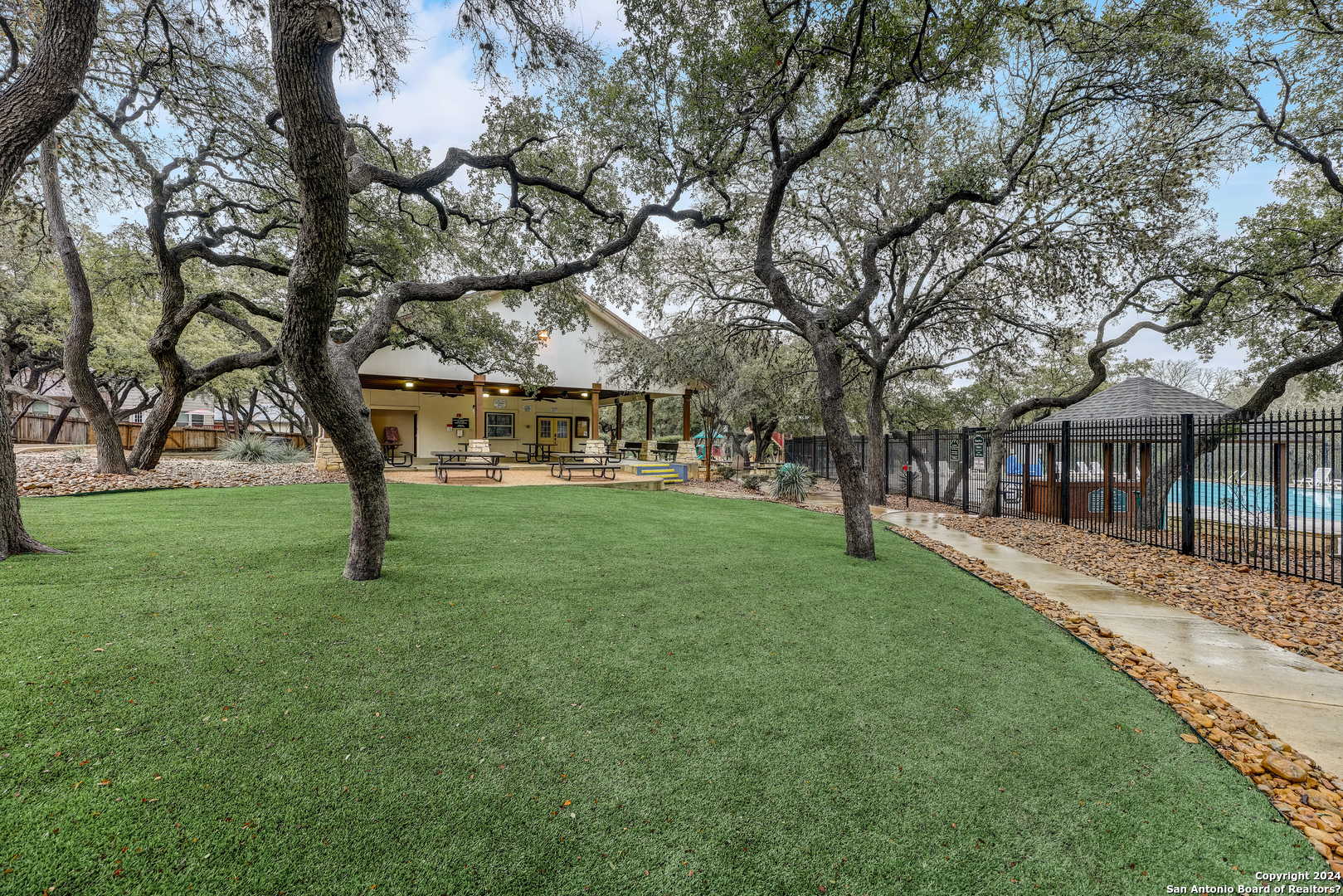 Stunning 2-story home in the gated community of Finesilver Ranch! This warm and inviting and ultra clean home boasts an open floor plan with high ceilings that create an airy and expansive atmosphere. The spacious living room is adorned with a charming fireplace, perfect for cozy gatherings. Adjacent is a versatile room with glass doors that is large enough for a dining room and could also be a study or office. The kitchen features a large island with sitting space, ample storage, custom shelving in cabinets, stainless steel appliances and granite countertops. Kitchen chairs, refrigerator and laundry machines will stay! Immerse yourself in the epitome of relaxation in the primary suite, with sitting space in front of lovely bay windows, and an en suite bath with a jetted tub. Both bathrooms include beautiful frameless glass walk-in showers. The outdoor experience is equally impressive with a large backyard! The extended flagstone patio overlooks a partially xeriscaped yard with a firepit and mature trees that provide great shade, including fig and peach fruit trees! A full sprinkler system ensures easy maintenance. Beyond the home's walls, enjoy excellent curb appeal and convenience. Proximity to schools, shopping, and the largest HEB (just 7 minutes away) enhances daily living. The elementary school is a mere 2 minutes away, the middle school is a short 3-minute drive, and the high school is within a 9-minute reach. Additionally, a public library is conveniently located just 4 minutes away. Enjoy everything the spectacular community has to offer, including a new disc golf course, swimming pool, clubhouse, sports court, park, and more. This home offers not just a residence but a lifestyle that seamlessly combines comfort, style, and accessibility. Book your personal tour today!