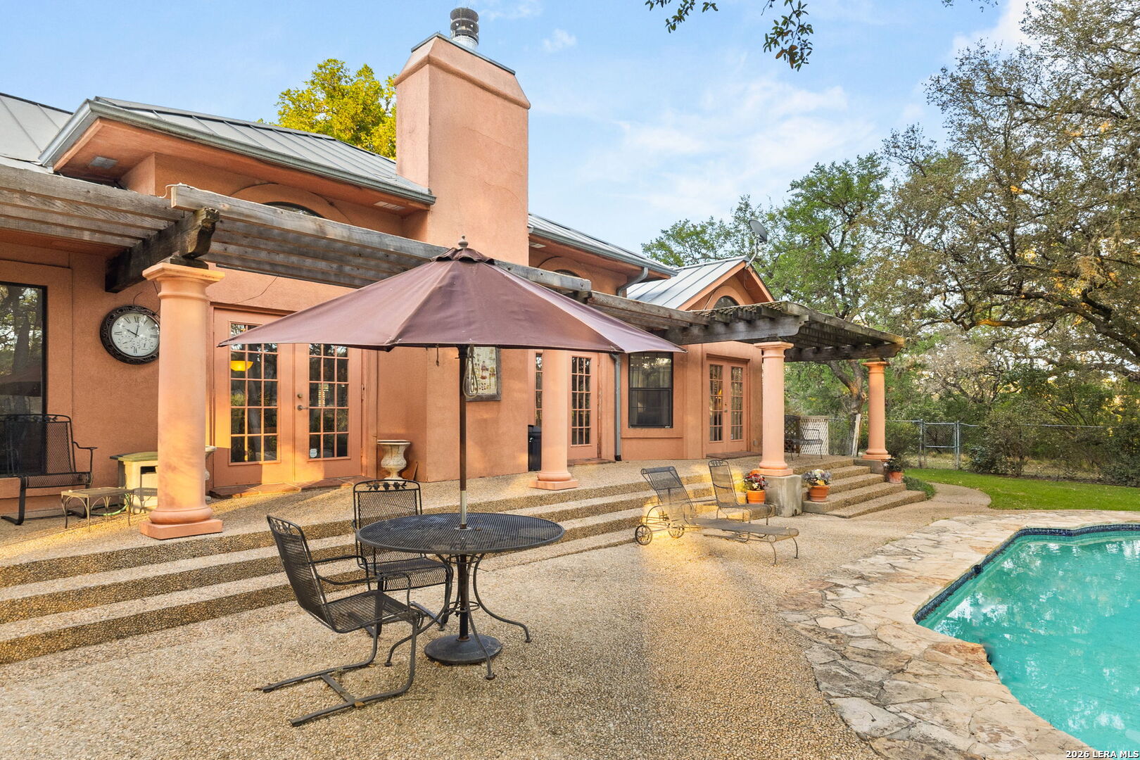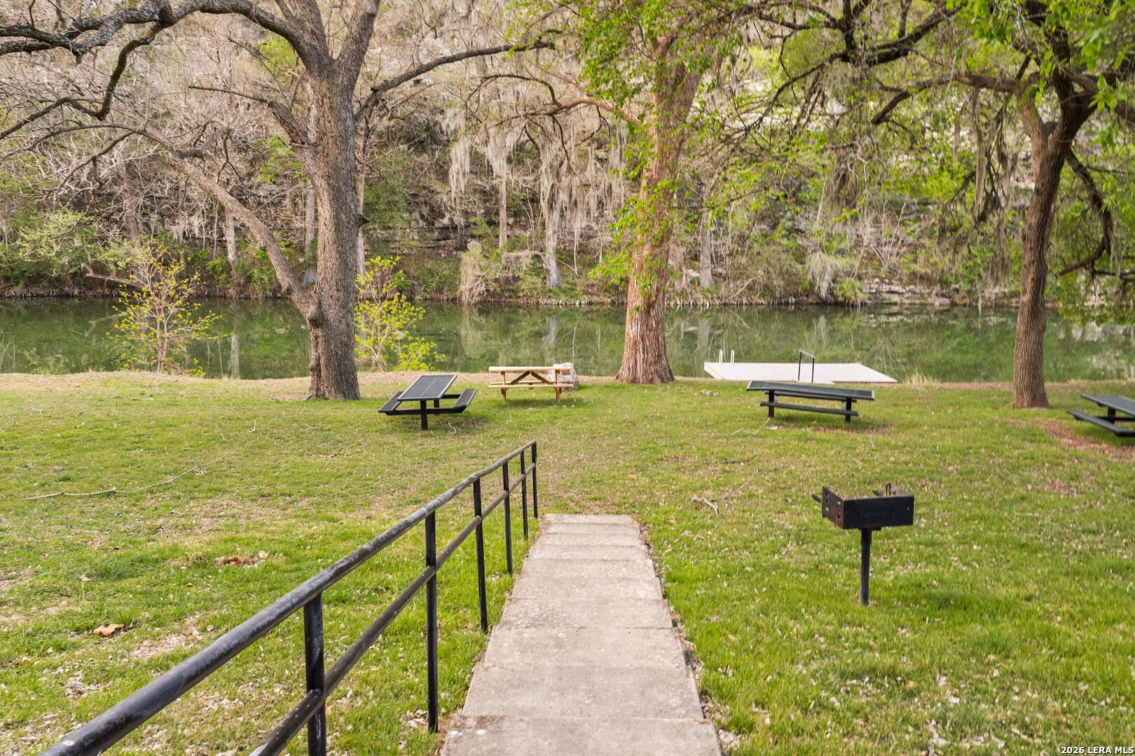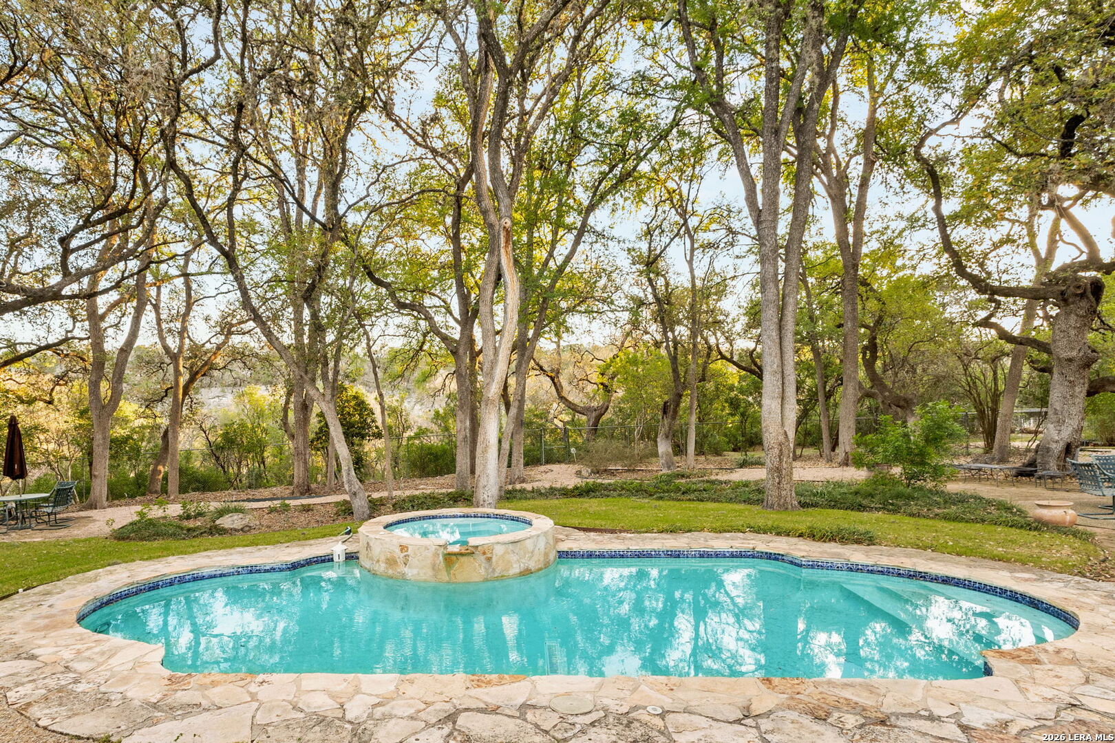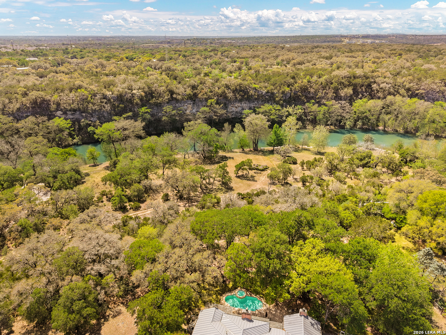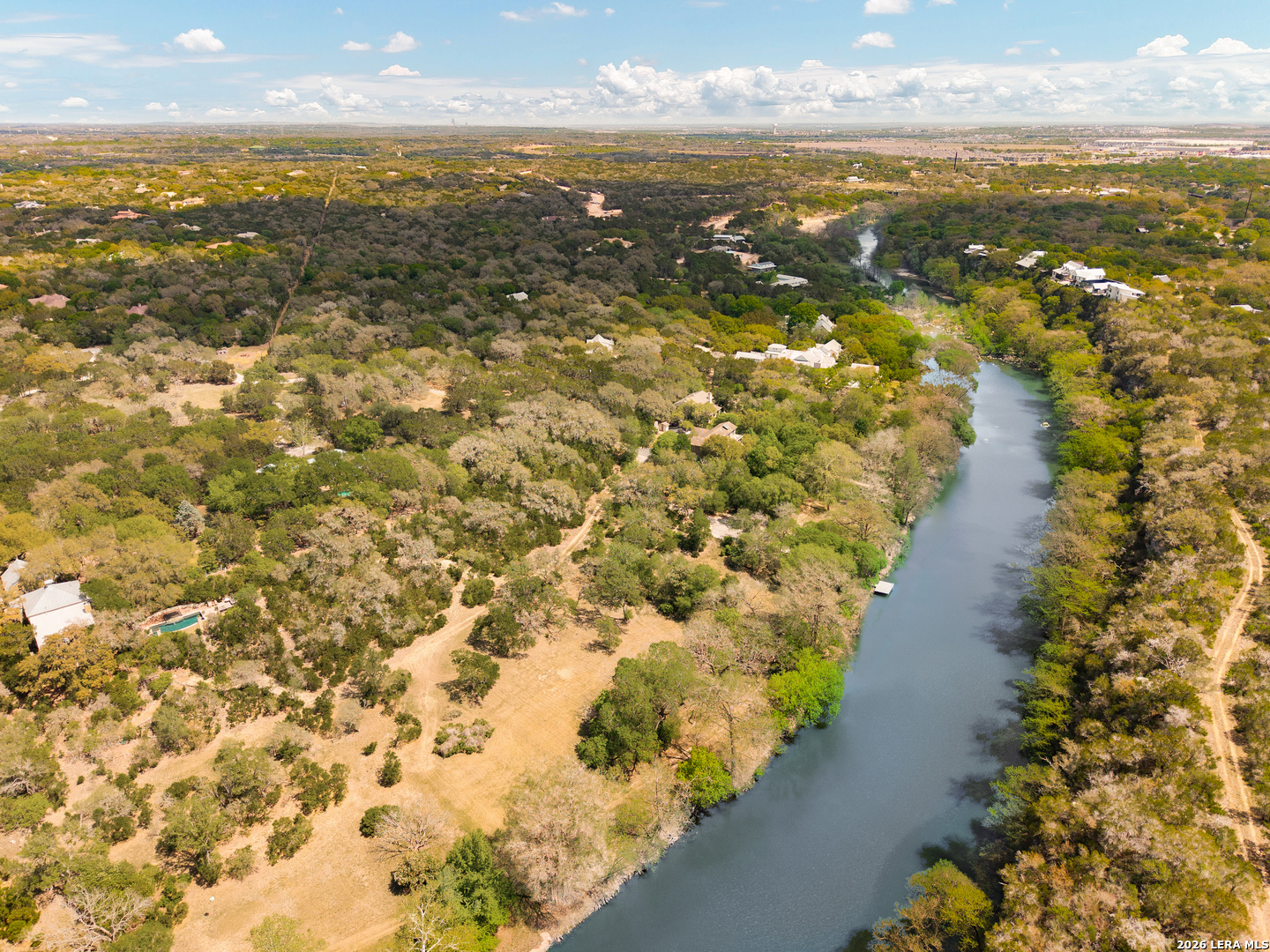 Set within the gated Riada community, this rare Guadalupe Riverfront estate offers an exceptional opportunity in one of New Braunfels' most exclusive neighborhoods. Privately positioned on over 7 acres, the property is framed by mature oak trees and thoughtfully elevated above the river, capturing both stunning natural surroundings and added privacy. The single-story home features an open-concept layout designed for effortless living and entertaining, with light-filled spaces that connect seamlessly to the outdoors. Enjoy a resort-style pool and spa overlooking the peaceful landscape, creating the perfect setting for relaxation or entertaining. With usable acreage, private river access, and a setting that feels worlds away-yet just minutes from town-this is a truly special Hill Country retreat.