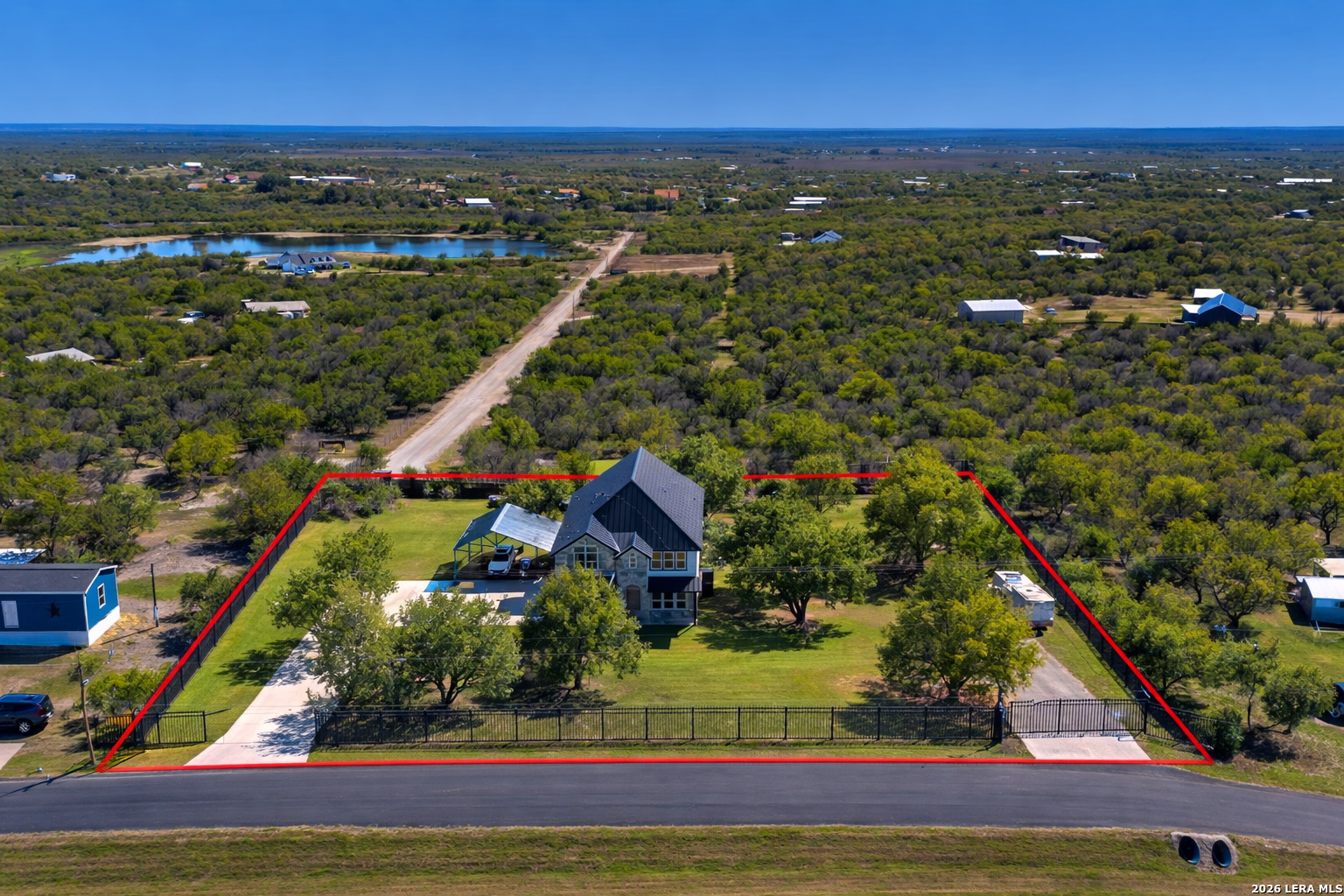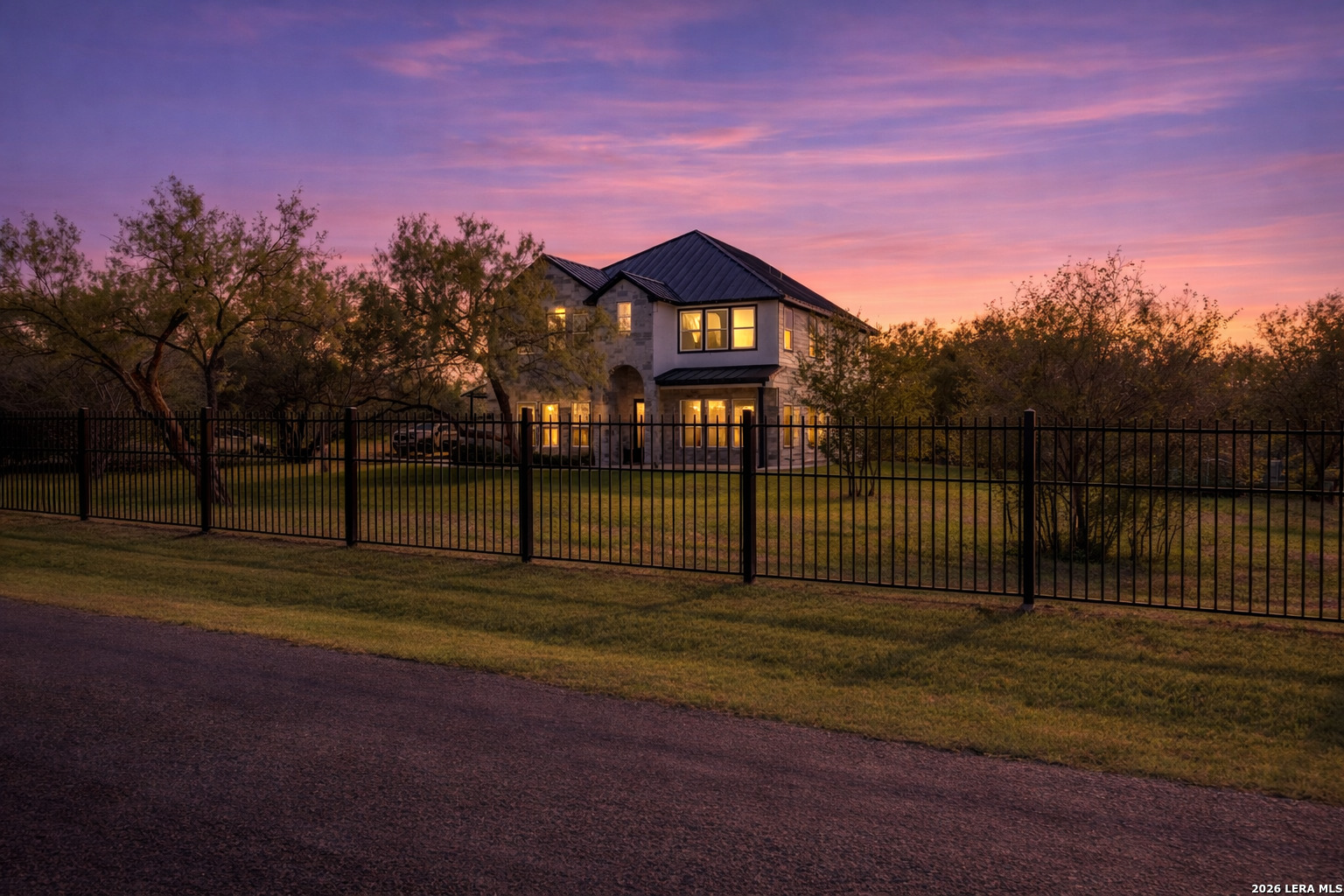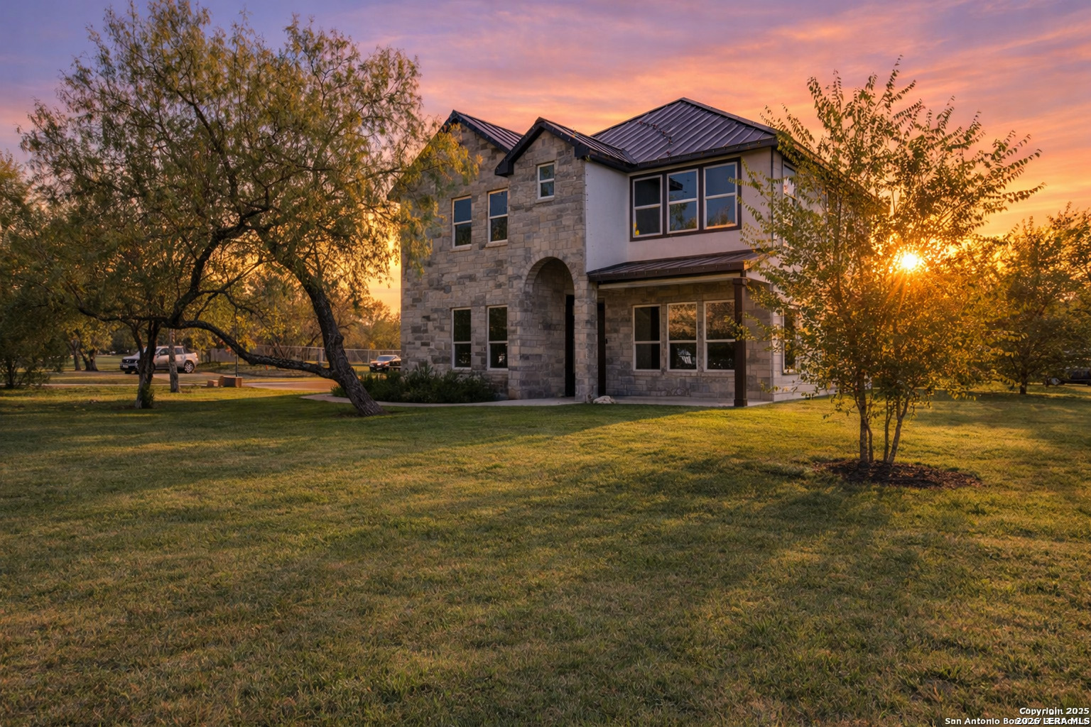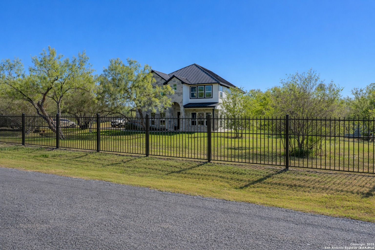 REFINED COUNTRY LIVING - SPACE, STYLE, AND SERENITY COMBINED. The morning breeze carries the quiet rhythm of country life, and beyond the electric gate, a modern Texas retreat welcomes your home. Built in 2022, over 3400 square feet, and set on nearly an acre at a prime Castroville corner, this custom two-story residence pairs sleek contemporary design with timeless Hill Country craftsmanship, crowned by a durable metal roof that enhances both beauty and longevity. A private drive and covered carport create a graceful approach, leading to a stone facade that exudes sophistication. Step inside to soaring 20-foot ceilings, sunlight that dances across porcelain tile floors, and an open-concept layout ideal for entertaining or everyday comfort. The chef's kitchen is a showpiece, black granite counters, custom white cabinetry, designer lighting, and a central island that anchors the space. The main-level primary suite provides an elegant retreat, while a versatile secondary bedroom nearby easily serves as an office, nursery, or guest quarters. Upstairs, four spacious bedrooms include a private suite for added flexibility. Outdoors, unwind beneath an expansive covered patio where morning coffee and Texas sunsets feel equally at home. Here, luxury meets serenity, only minutes from schools, dining, and the conveniences of San Antonio. Extras, sprinkle system front and back and above-ground pool. House located in POA community.