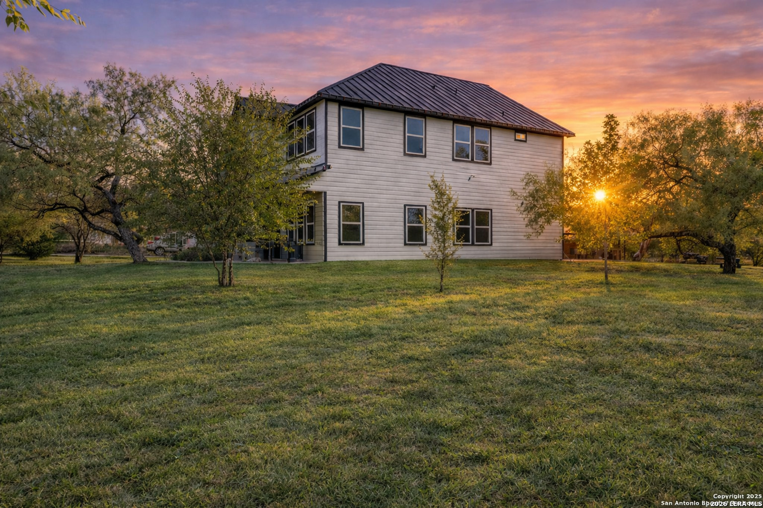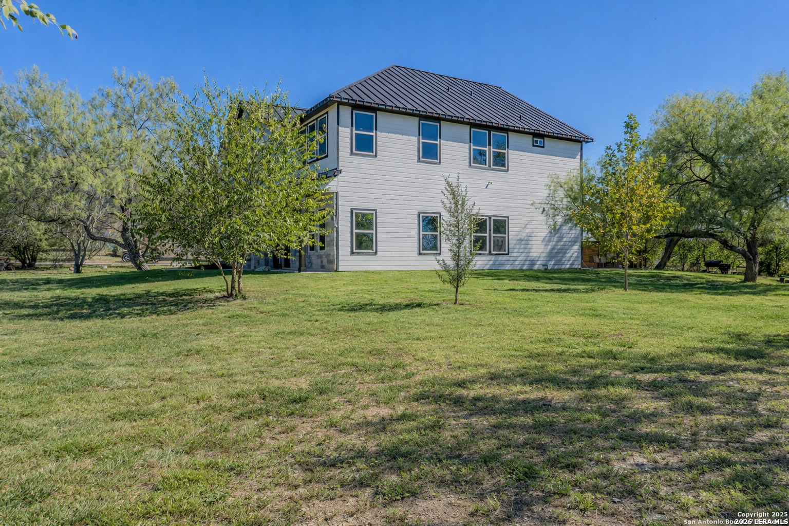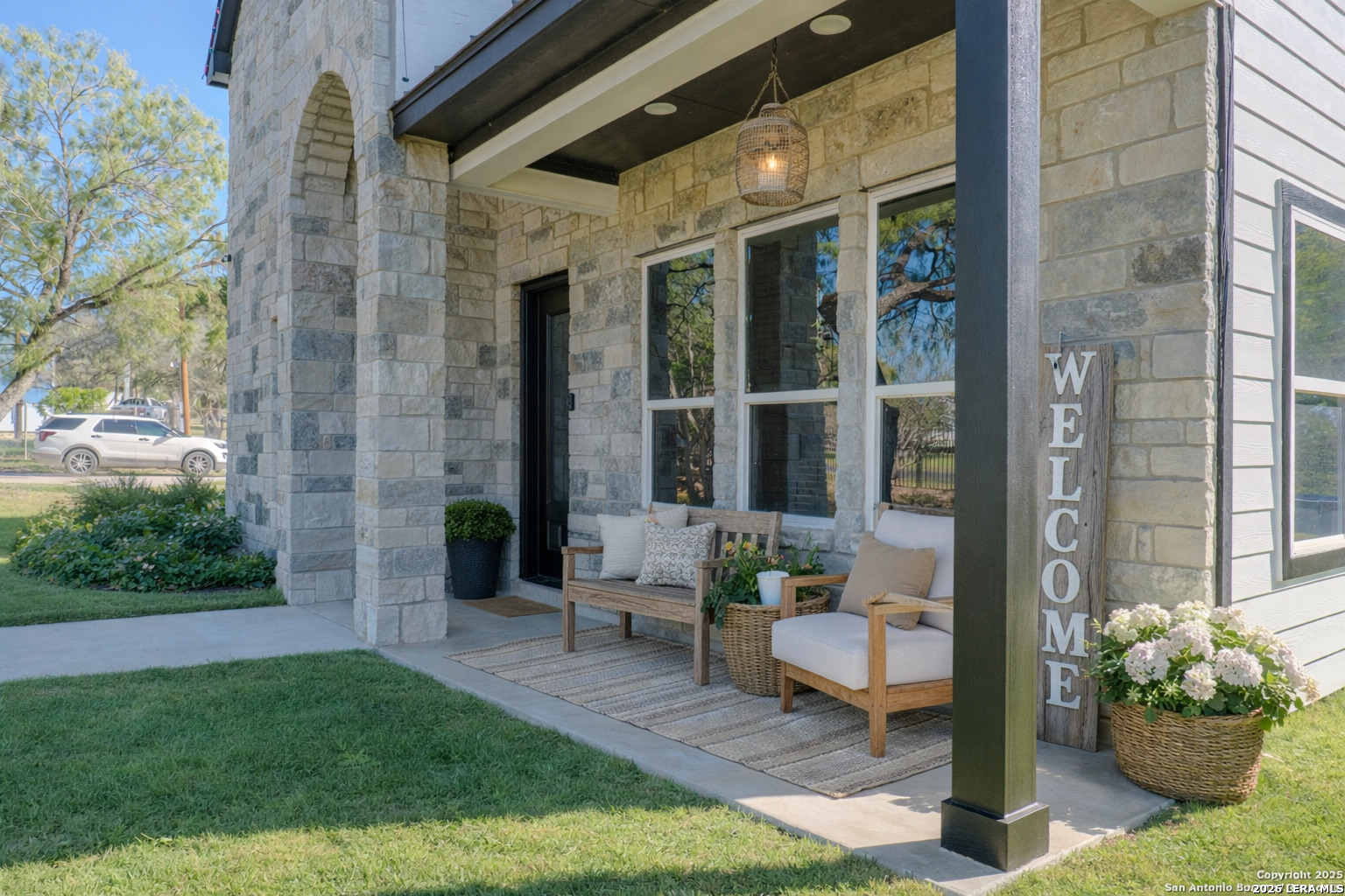 REFINED COUNTRY LIVING - SPACE, STYLE, AND SERENITY COMBINED. The morning breeze carries the quiet rhythm of country life, and beyond the electric gate, a modern Texas retreat welcomes your home. Built in 2022, over 3400 square feet, and set on nearly an acre at a prime Castroville corner, this custom two-story residence pairs sleek contemporary design with timeless Hill Country craftsmanship, crowned by a durable metal roof that enhances both beauty and longevity. A private drive and covered carport create a graceful approach, leading to a stone facade that exudes sophistication. Step inside to soaring 20-foot ceilings, sunlight that dances across porcelain tile floors, and an open-concept layout ideal for entertaining or everyday comfort. The chef's kitchen is a showpiece, black granite counters, custom white cabinetry, designer lighting, and a central island that anchors the space. The main-level primary suite provides an elegant retreat, while a versatile secondary bedroom nearby easily serves as an office, nursery, or guest quarters. Upstairs, four spacious bedrooms include a private suite for added flexibility. Outdoors, unwind beneath an expansive covered patio where morning coffee and Texas sunsets feel equally at home. Here, luxury meets serenity, only minutes from schools, dining, and the conveniences of San Antonio. Extras, sprinkle system front and back and above-ground pool. House located in POA community.
