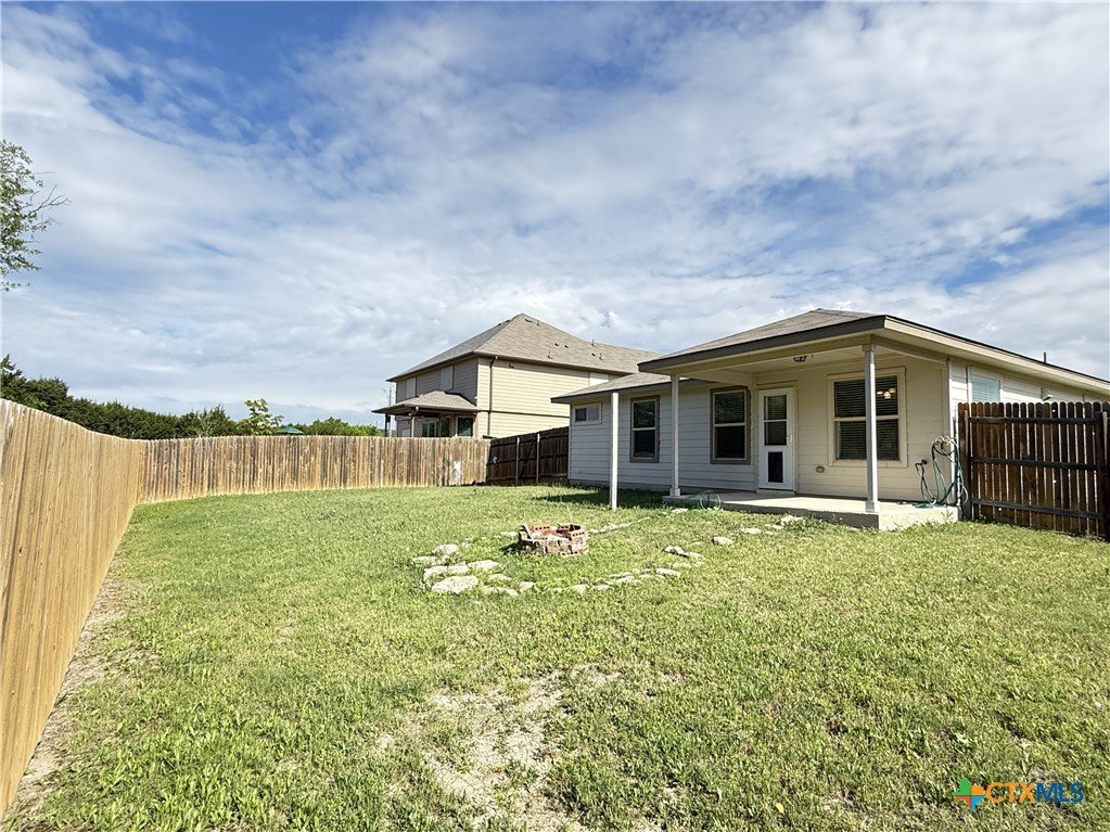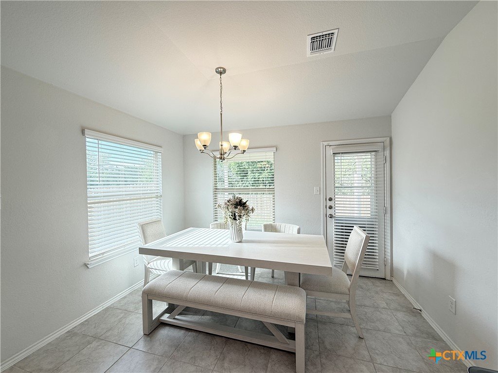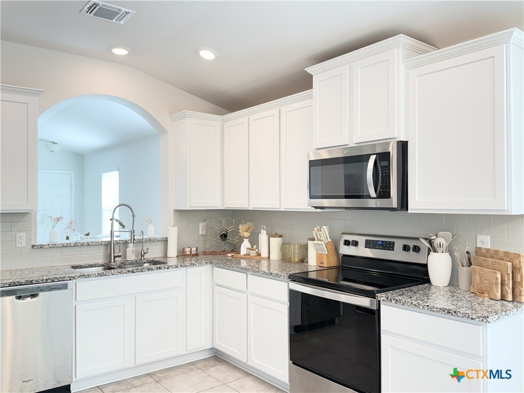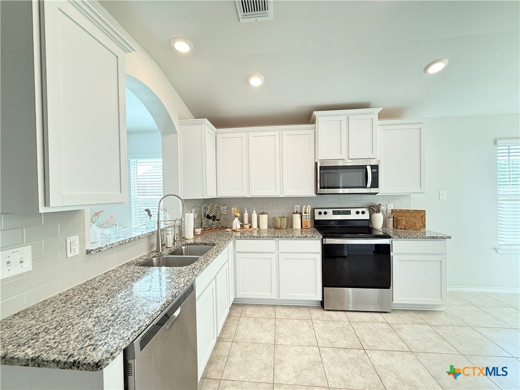 A Rare Discovery!! Unearth many offers before you find one comparable to this D.R. Horton built home nestled in sought-after Creekside Hills. This model-home look-alike in perfect condition awaits a new owner. The well-designed floorplan boasts carefully curated spaces and fun and functional features while presenting an open layout that invites family interaction. Upon entry the tiled foyer opens to the generously scaled living room where elegant elliptical arches transition to the kitchen and dining area without confinement. The kitchen is a culinary delight, equipped with crisp, white cabinets, granite-topped counters, and stainless-steel appliances. A twinset of windows pump natural light into the dining area and captures a view of the backyard. The atrium door leads to the covered patio-an inviting family hang-out spot- and the oversized backyard that offers ample space for little ones and fur babies to roam. You will appreciate the privacy: no roof tops behind your back fence, just an eye-pleasing view of lush greenery and treetops! The primary suite is positioned to the rear of the home for welcomed privacy and exudes an ambiance of tranquility. The beautifully appointed primary bath features an extra-large shower, linen closet, and a dual sink vanity. The two minor bedrooms have generous closet space and ceiling fans for added comfort and sharing a full-size bath. The interior utility room pulls double duty as a voluminous pantry. The dual car sized garage is equipped with pull-down attic access stairs. Extra amenities include Faux-wood blinds dressed windows, security system with exterior cameras, and a welcoming wrap-around front porch.