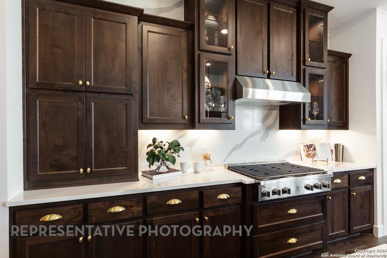 This beautiful model plan has it all! 2 story with brick exterior, front porch, double doors, and a 4th car garage (which also has an exterior door to back yard)! Wood flooring invites you in and runs from entry to family, kitchen/dining, study and halls. This beautiful Farmhouse kitchen has double ovens, added hutch, contrasting cabinet colors, large single-bowl sink, pot filler, trash can pull-out, pendant lights and upgraded countertops. This is a deep homesite and you'll enjoy it from the Extended Covered Patio. The utility room also has a playful upgraded flooring, added cabinets with a sink. The family room has a brick fireplace with wood mantle. Added ceiling fans at all bedrooms and entertainment room. Additional carriage lights.