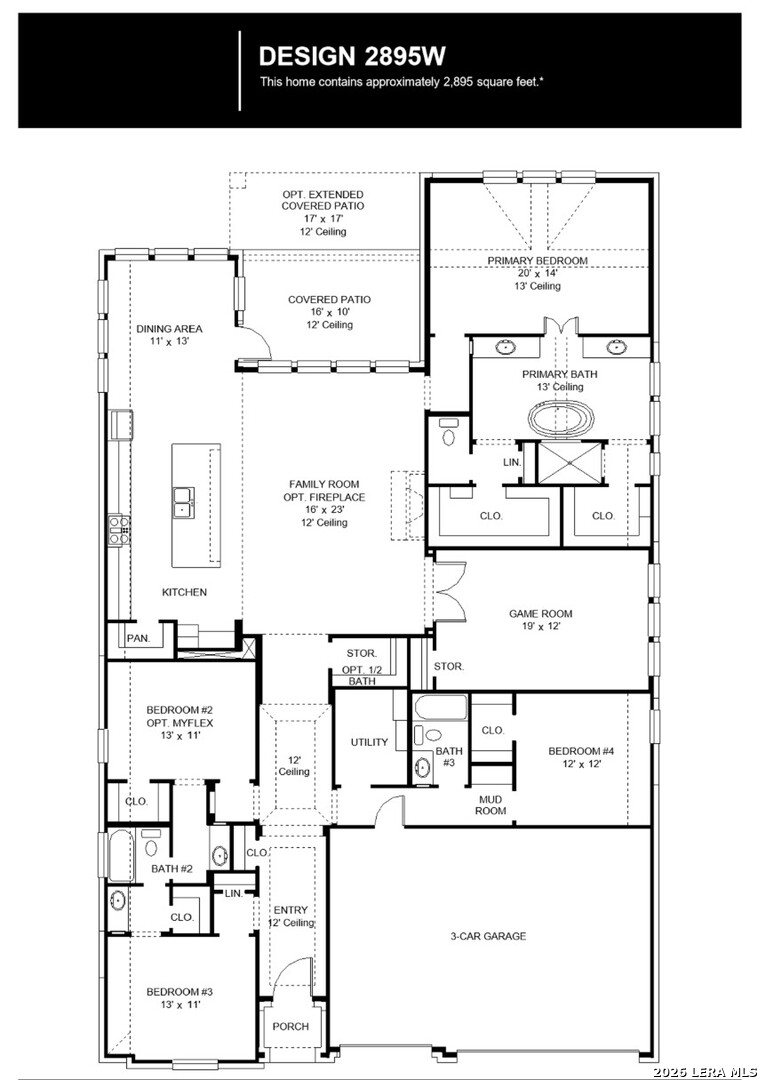 Extended entry leads to open family room, kitchen and dining area. Family room features wall of windows. Kitchen hosts island with built-in seating space. Game room with French doors just off family room. Secluded primary suite. Dual vanities, garden tub, separate glass-enclosed shower and two large walk-in closets in primary bath. A Hollywood bath, high ceilings, large windows and abundant closet space add to this one-story design. Covered backyard patio. Mud room off three-car garage.