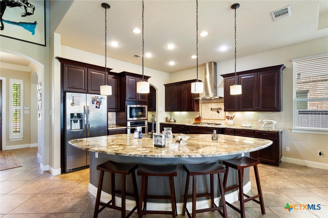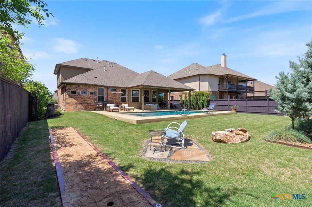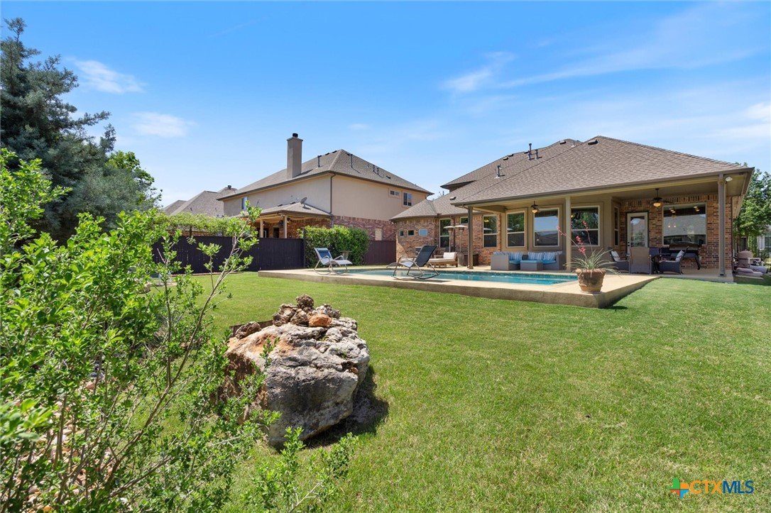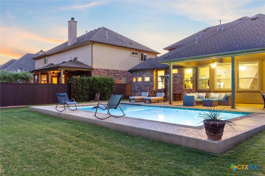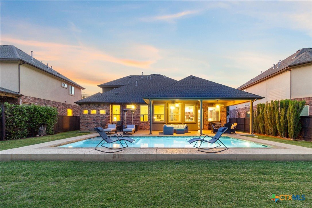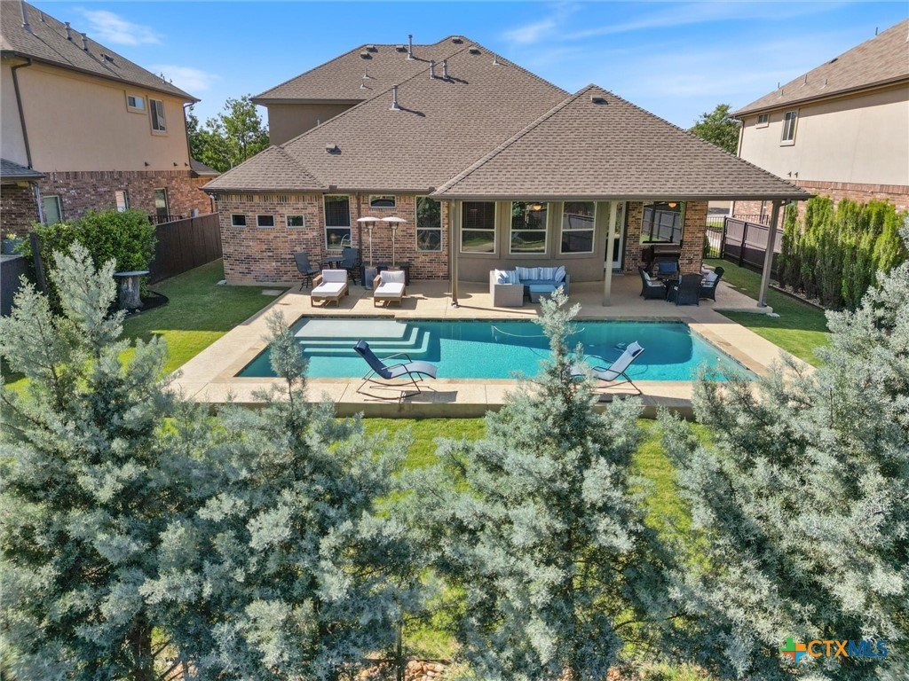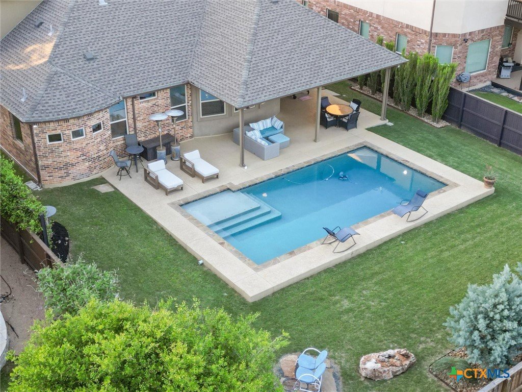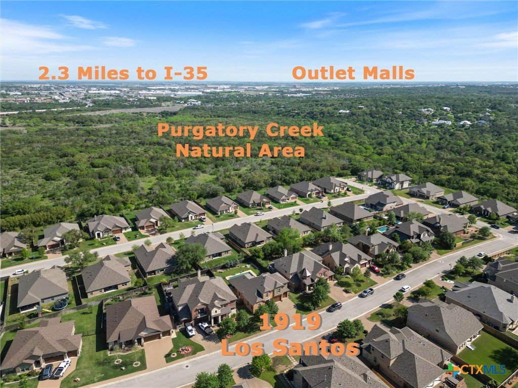 Welcome to 1919 Los Santos Drive, a beautiful home in the lovely Vista De Los Santos community in the Texas Hill Country near downtown San Marcos and Texas State University. This home features four sides of masonry, stainless steel appliances, granite countertops, gas cooking, brick-paved driveways and sidewalks, and a complete irrigation system. The community offers breathtaking views within walking distance of the 570-acre Purgatory Natural Area. Enjoy easy access to IH 35, nearby restaurants, grocery shopping, and the Prime and Tanger Outlets, as well as a convenient location for San Marcos CISD and local private schools. You will enjoy the custom resort-style backyard with a heated pool with LED lighting and a tanning shelf, a washer toss pit, an expansive covered patio, and established landscaping. The owner's suite has a spa-like feel with a separate shower and a large soaking tub. The upstairs features an additional living area, three spacious bedrooms, and two bathrooms. Experience serene and modern living in this premier location today.