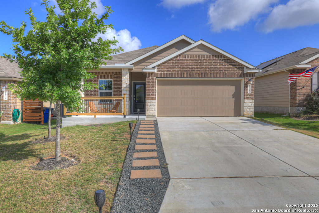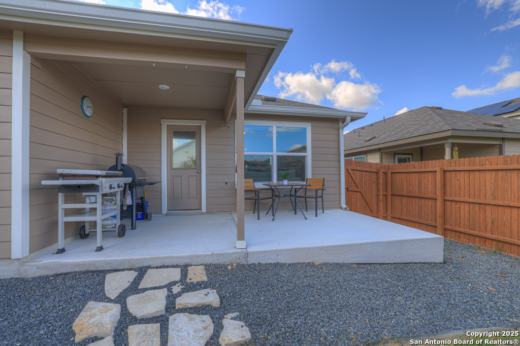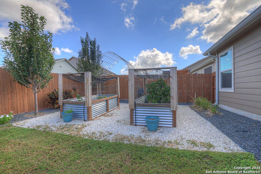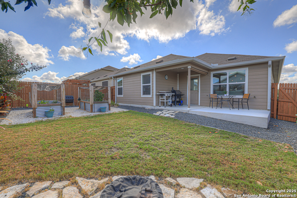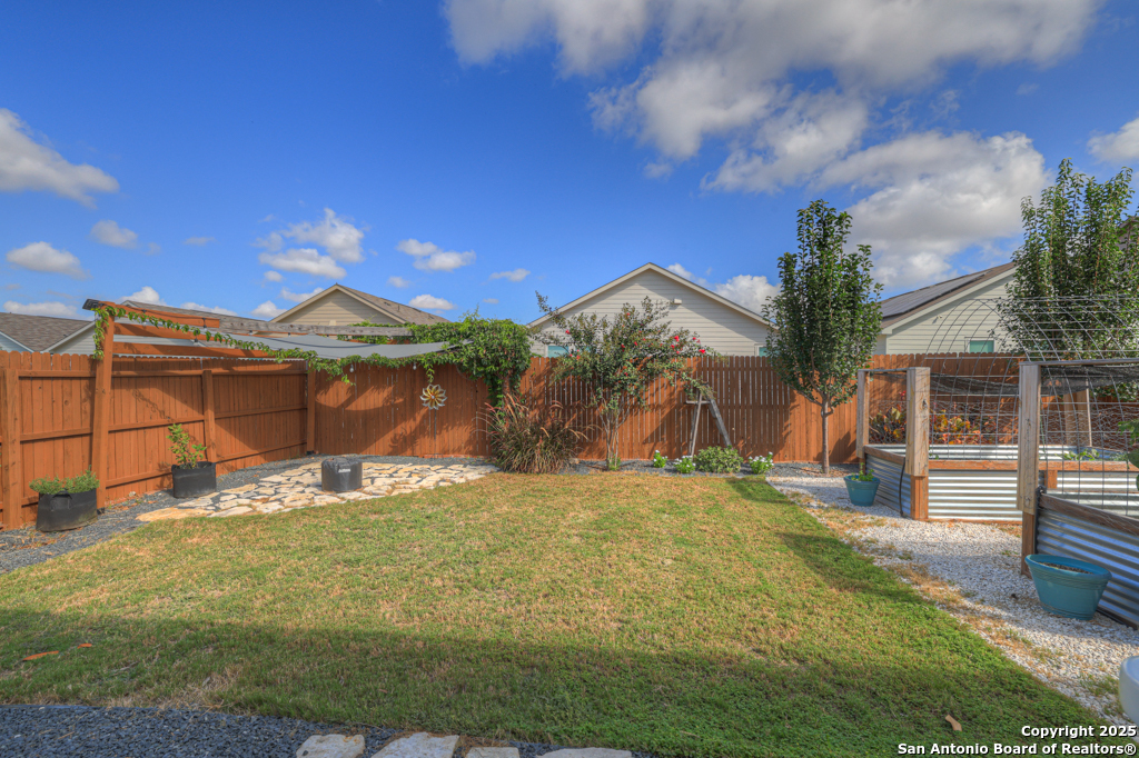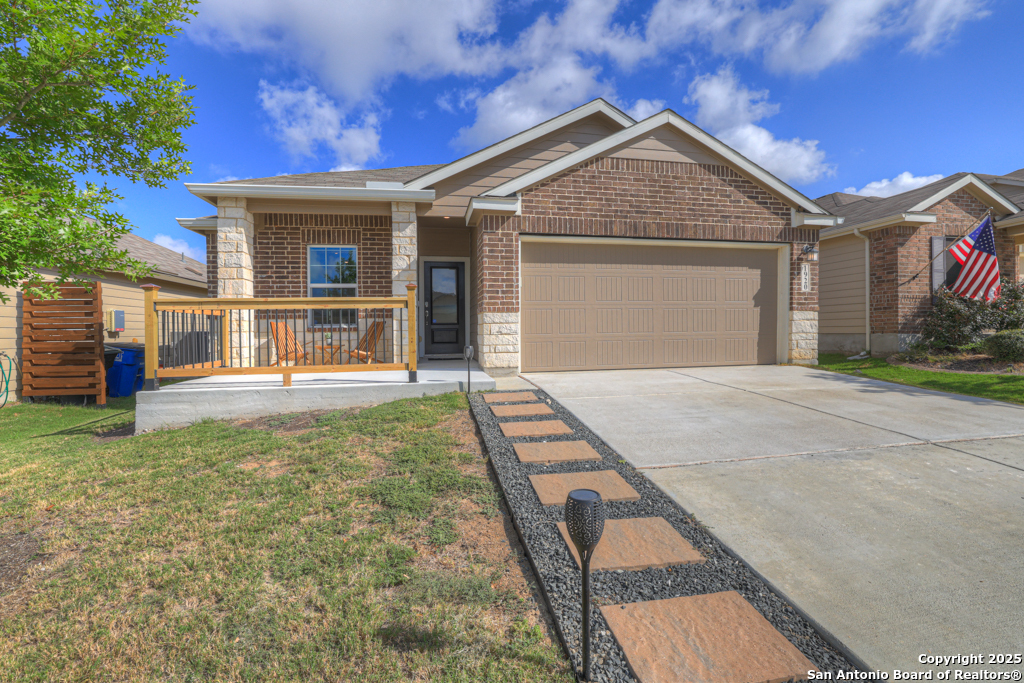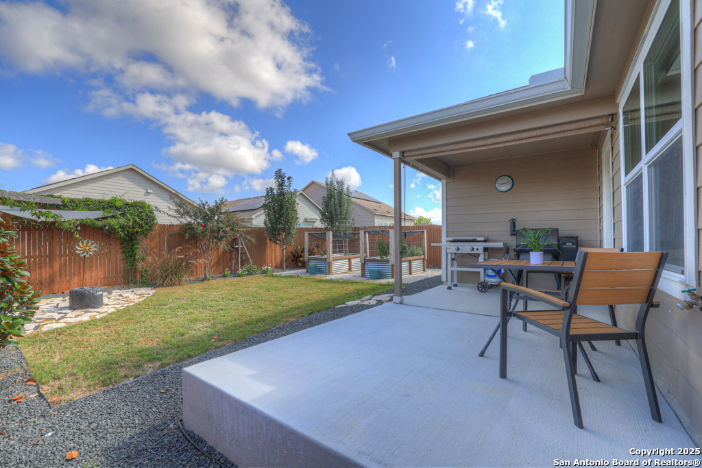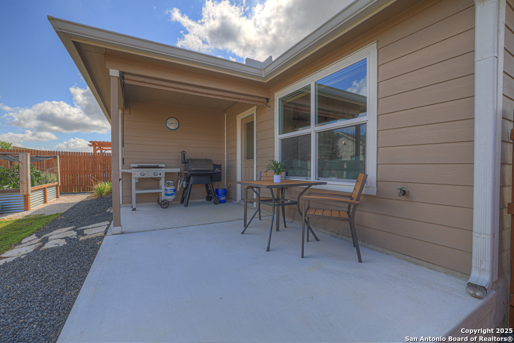 Located on a low-traffic street in the sought-after Voss Farms community, this beautiful one-story home is a true standout! Thoughtful custom features and built-in details-both inside and out-set this home apart from standard tract homes, giving it a unique character and warmth. From the moment you arrive, the inviting curb appeal and pride of ownership are immediately apparent. Step inside to discover an open-concept layout enhanced by high-quality finishes and personal touches that make the home feel anything but ordinary. A versatile front room offers flexible use as a home office, formal dining area, or flexible living space. The spacious primary suite includes an en-suite bath with dual vanities, a walk-in shower, and a large walk-in closet. Two additional bedrooms are generously sized and share a full bathroom. Out back, enjoy your private retreat featuring an extended patio, flagstone seating area, and raised garden beds-perfect for relaxing, entertaining, or growing your own herbs and vegetables. Residents of Voss Farms enjoy access to top-notch community amenities, including a clubhouse, two pools, a playground, walking trails, and community events throughout the year. Conveniently located near shopping, dining, and entertainment in New Braunfels, this home offers an ideal blend of comfort, style, and location. Schedule your showing today to experience the charm and distinction of this exceptional home!