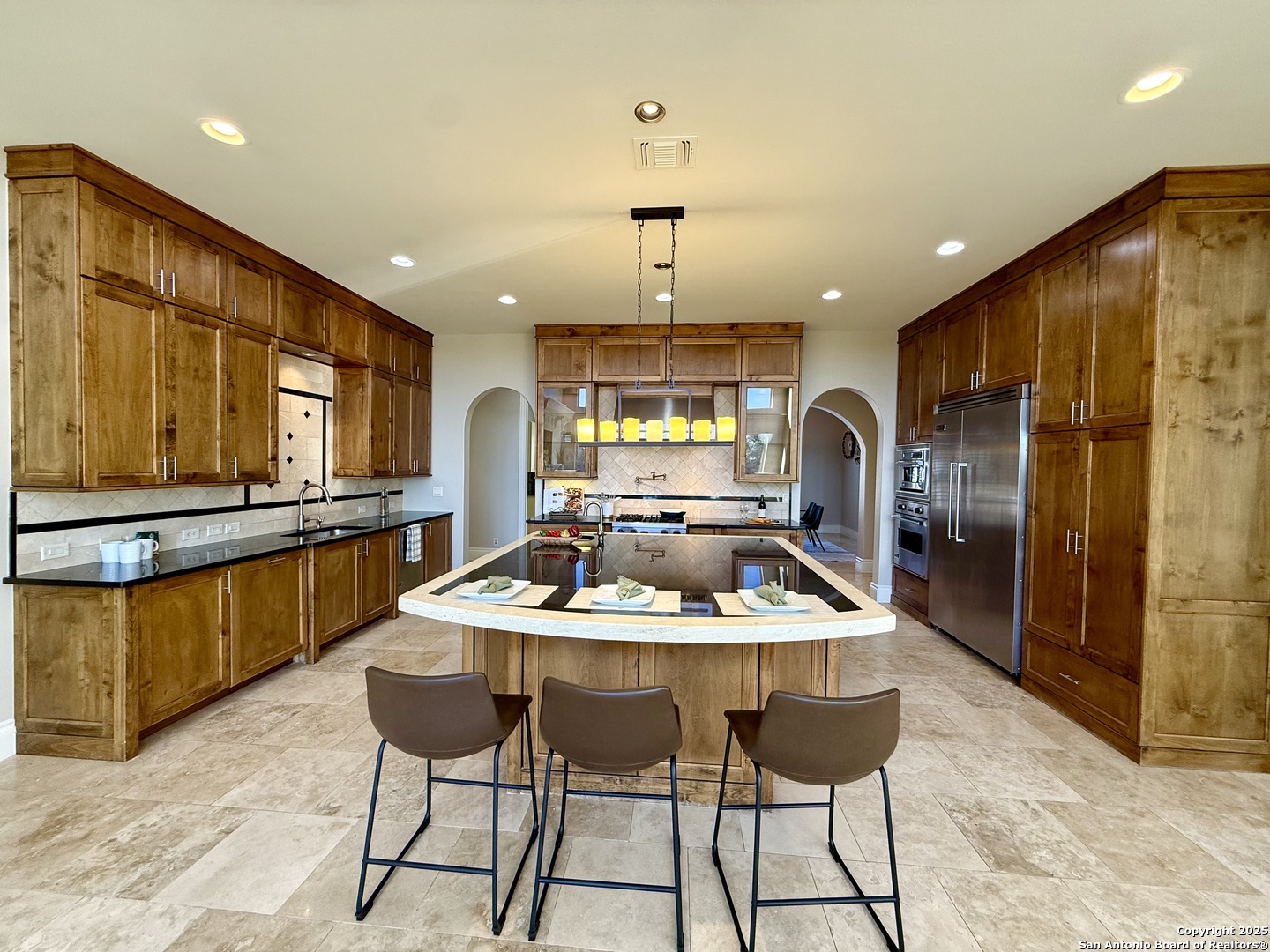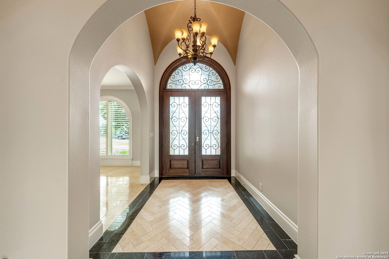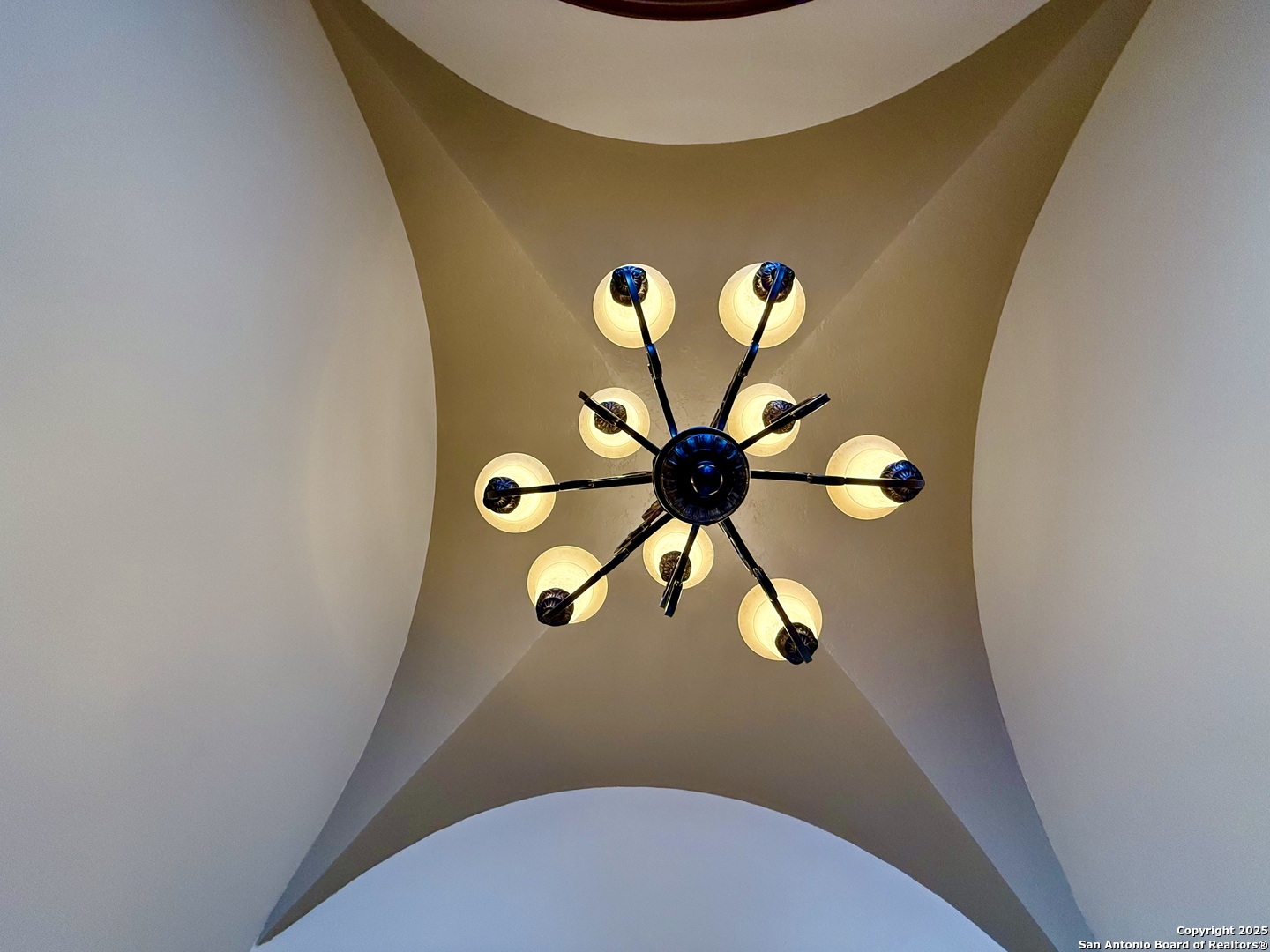 This distinctive estate is located in the scenic Texas Hill Country, where comfort and sophistication are seamlessly integrated. The property sits on a spacious 0.691-acre lot, providing elevated views of San Antonio and the beautiful surrounding landscape. The architectural design features an open floor plan, with ceiling heights ranging from ten to twenty feet, as well as large windows that allow for an abundance of natural light, travertine flooring, and elegantly arched doorways. At the core of the residence is a gourmet kitchen, which boasts a generous granite island and is equipped with high-end "Viking" appliances, custom wood cabinetry, a six-burner gas cooktop, a dedicated vegetable sink, dual-element induction cooking, and an integrated refrigerator, making it an ideal space for those who enjoy cooking. The home also includes two welcoming living areas and three dining areas, along with a study, a substantial exercise room, a media room, and a game room, providing plenty of options for relaxation and entertainment. The primary suite is thoughtfully designed for comfort, featuring a spacious bedroom complete with a walk-in closet and a luxurious bathroom that offers a Jacuzzi tub and a multi-head shower. In addition, there are two secondary bedrooms located on the first floor and two more on the upper level. The property further enhances outdoor living with a rear deck that includes an outdoor kitchen, creating an excellent setting for al fresco dining while enjoying the tranquil environment. The surrounding neighborhood is well-equipped with amenities, such as walking trails, a pavilion, sports courts, a swimming pool, and a basketball court. This home is move-in ready and presents a harmonious blend of convenience, breathtaking views, and luxurious living.