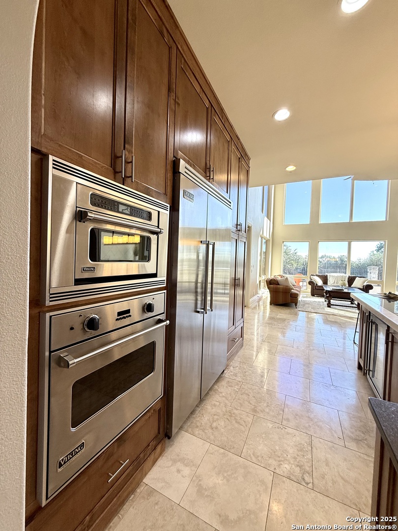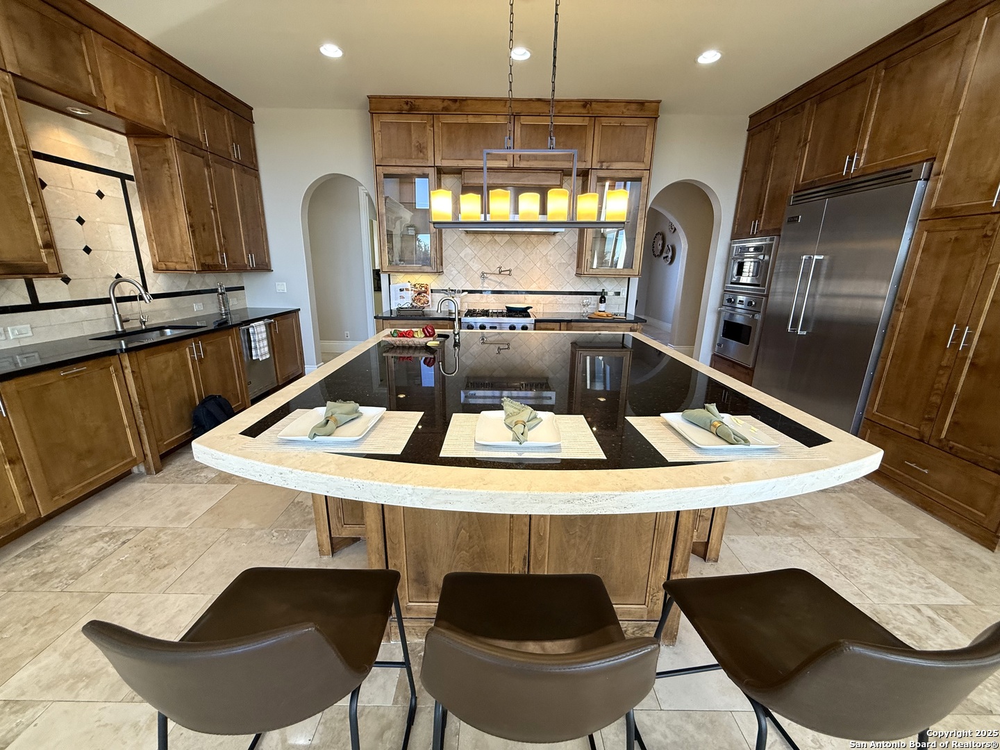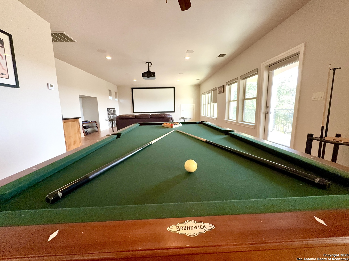 This distinctive estate is located in the scenic Texas Hill Country, where comfort and sophistication are seamlessly integrated. The property sits on a spacious 0.691-acre lot, providing elevated views of San Antonio and the beautiful surrounding landscape. The architectural design features an open floor plan, with ceiling heights ranging from ten to twenty feet, as well as large windows that allow for an abundance of natural light, travertine flooring, and elegantly arched doorways. At the core of the residence is a gourmet kitchen, which boasts a generous granite island and is equipped with high-end "Viking" appliances, custom wood cabinetry, a six-burner gas cooktop, a dedicated vegetable sink, dual-element induction cooking, and an integrated refrigerator, making it an ideal space for those who enjoy cooking. The home also includes two welcoming living areas and three dining areas, along with a study, a substantial exercise room, a media room, and a game room, providing plenty of options for relaxation and entertainment. The primary suite is thoughtfully designed for comfort, featuring a spacious bedroom complete with a walk-in closet and a luxurious bathroom that offers a Jacuzzi tub and a multi-head shower. In addition, there are two secondary bedrooms located on the first floor and two more on the upper level. The property further enhances outdoor living with a rear deck that includes an outdoor kitchen, creating an excellent setting for al fresco dining while enjoying the tranquil environment. The surrounding neighborhood is well-equipped with amenities, such as walking trails, a pavilion, sports courts, a swimming pool, and a basketball court. This home is move-in ready and presents a harmonious blend of convenience, breathtaking views, and luxurious living.