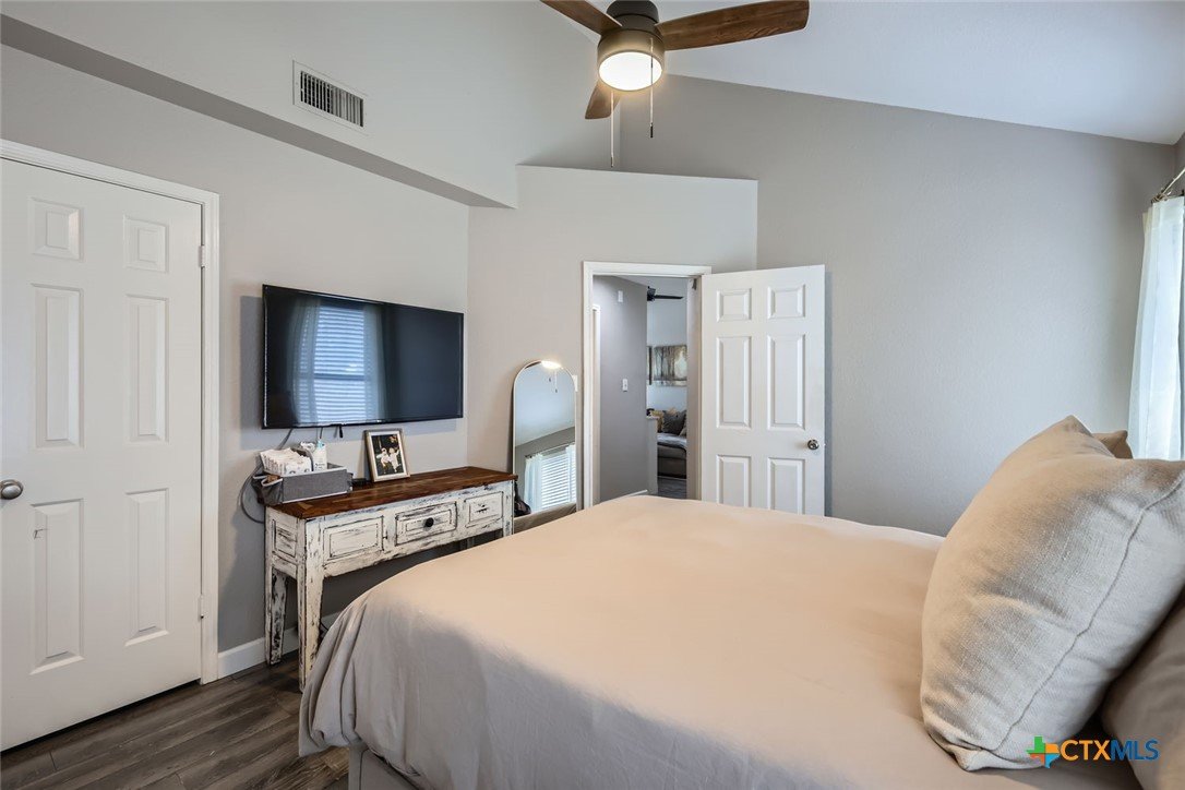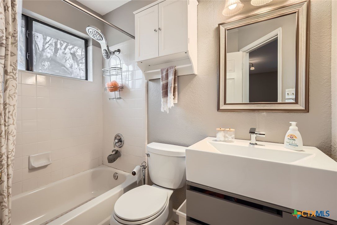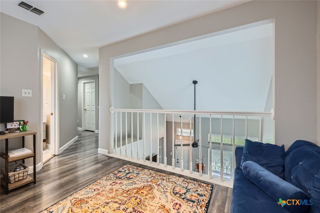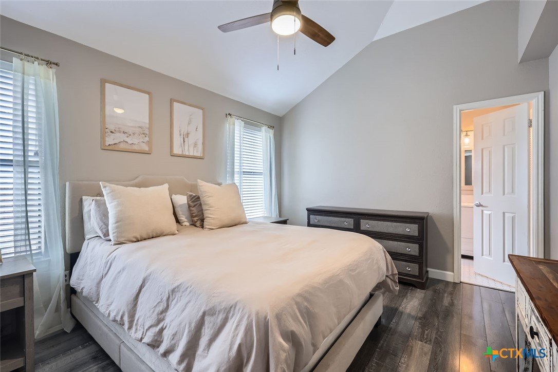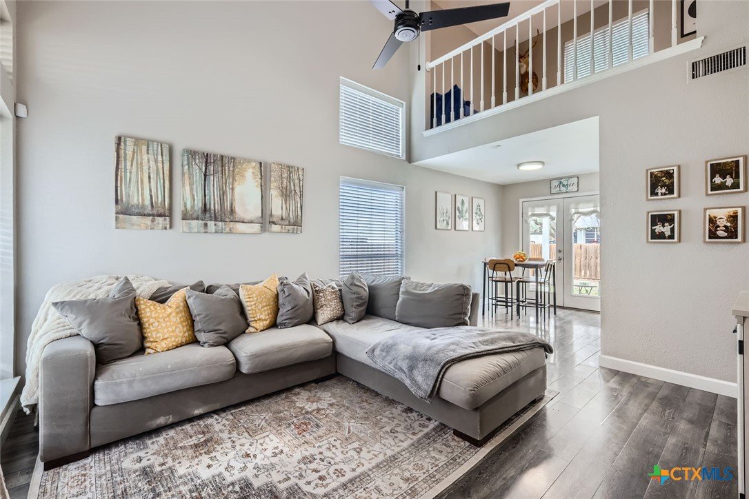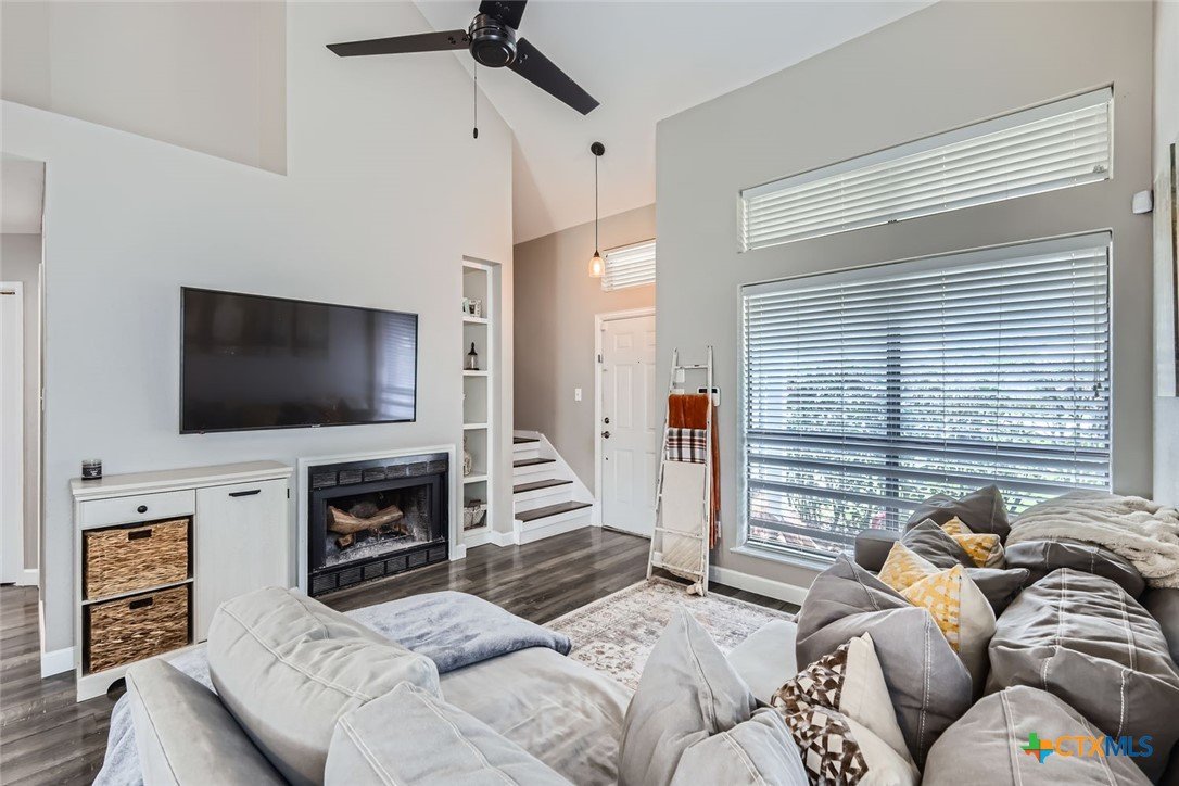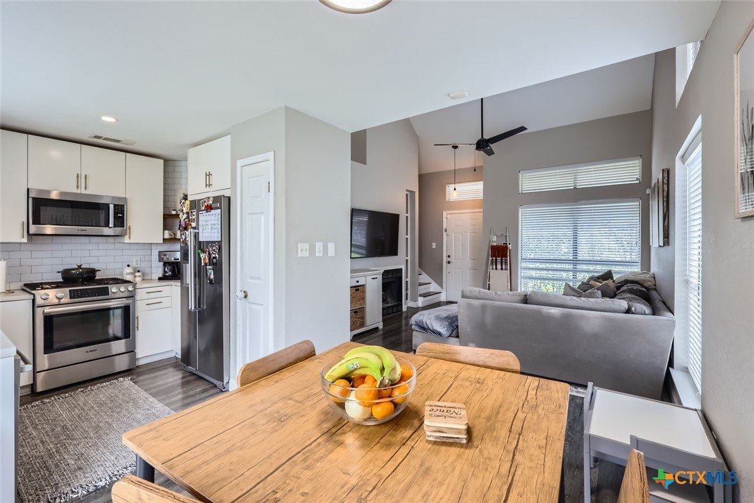 Welcome to this inviting home, perfectly blending modern style with timeless charm. Featuring neutral paint colors and high-end finishes, this residence offers a bright and airy atmosphere with tall ceilings and abundant natural light. The open-concept living spaces are complemented by beautiful laminate floors throughout, adding warmth and elegance. The kitchen is equipped with sleek stainless steel appliances, making it both stylish and functional. A spacious upstairs flex area provides endless possibilities—ideal for a home office, playroom, or workout space. The master suite features an ensuite bathroom with a double vanity. Outside, the private backyard is shaded by large, mature trees and includes a covered patio—perfect for relaxing or entertaining year-round. Situated on an established lot in the heart of San Marcos, this home offers unbeatable convenience, with easy access to shopping, dining, entertainment, and Texas State University. Don’t miss out on this incredible opportunity to own a home in one of the city’s most desirable locations!