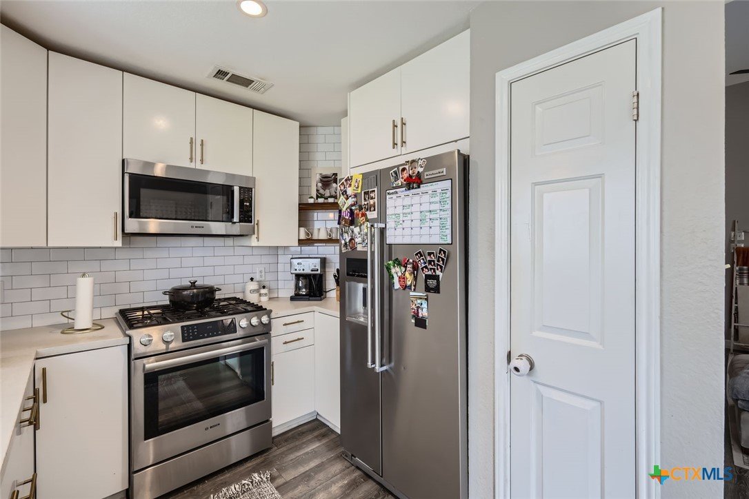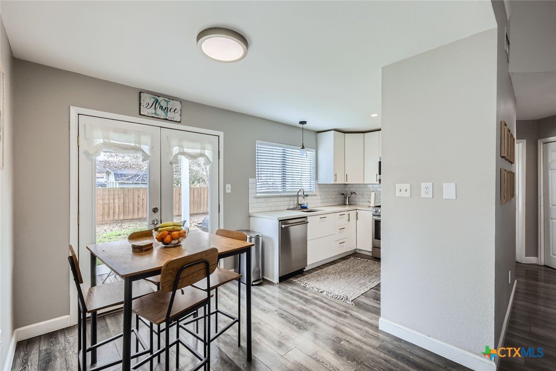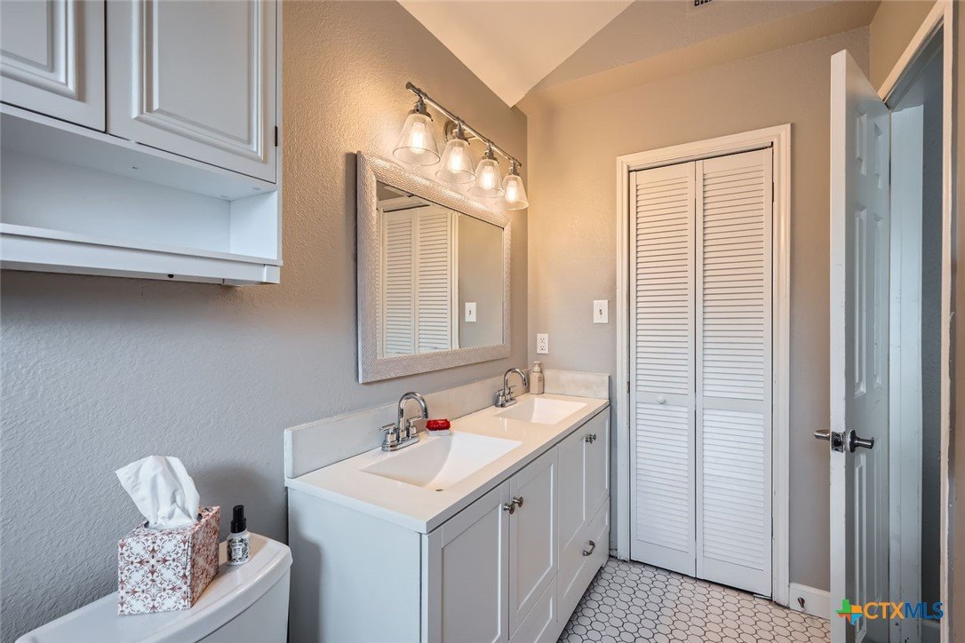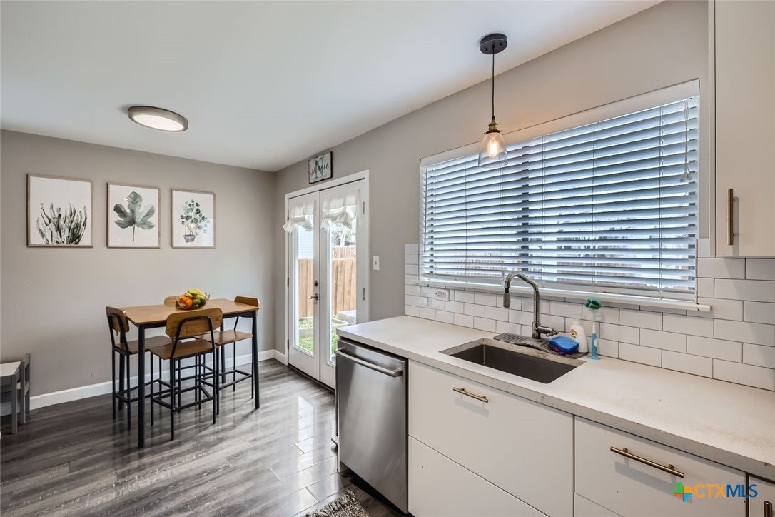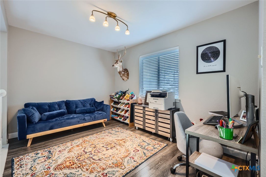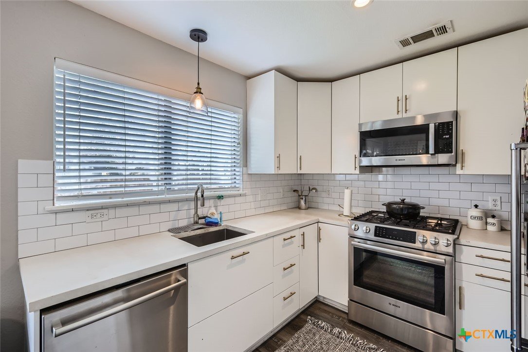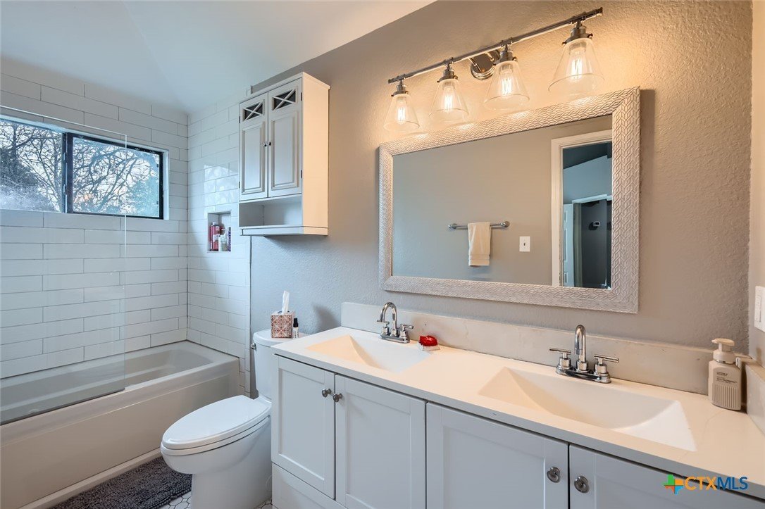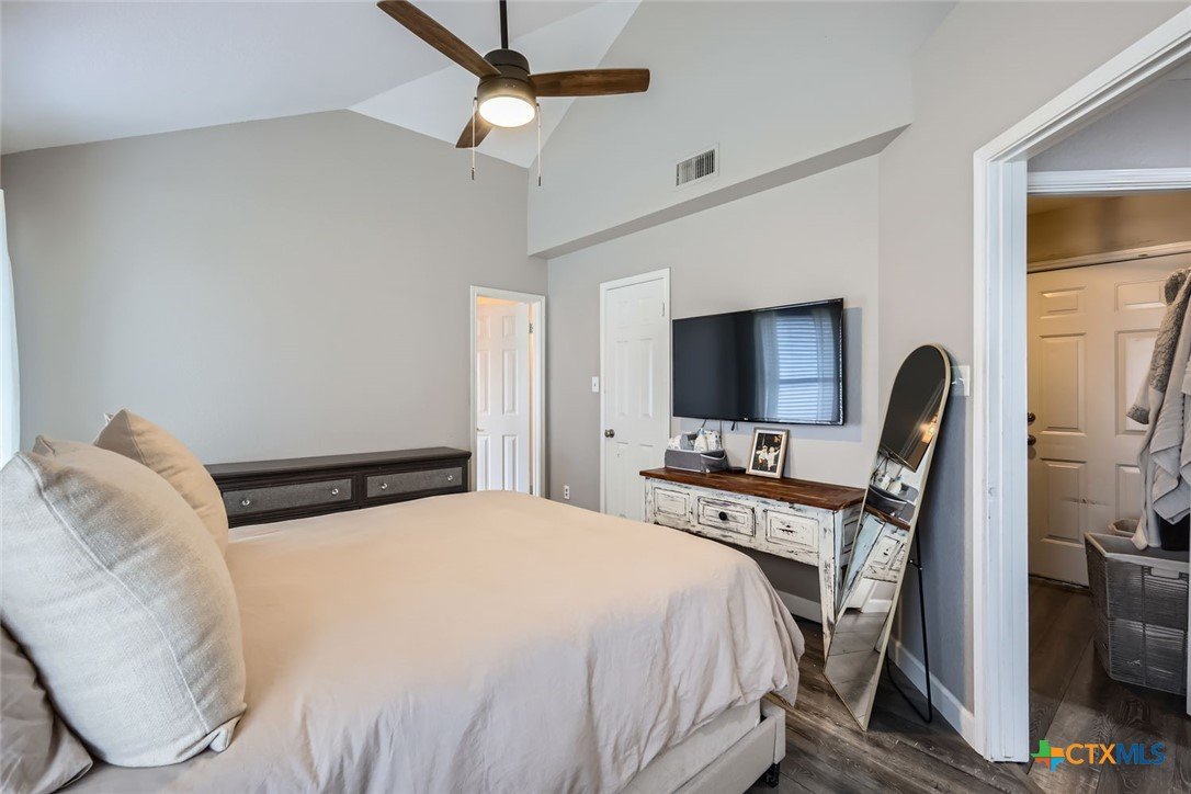 Welcome to this inviting home, perfectly blending modern style with timeless charm. Featuring neutral paint colors and high-end finishes, this residence offers a bright and airy atmosphere with tall ceilings and abundant natural light. The open-concept living spaces are complemented by beautiful laminate floors throughout, adding warmth and elegance. The kitchen is equipped with sleek stainless steel appliances, making it both stylish and functional. A spacious upstairs flex area provides endless possibilities—ideal for a home office, playroom, or workout space. The master suite features an ensuite bathroom with a double vanity. Outside, the private backyard is shaded by large, mature trees and includes a covered patio—perfect for relaxing or entertaining year-round. Situated on an established lot in the heart of San Marcos, this home offers unbeatable convenience, with easy access to shopping, dining, entertainment, and Texas State University. Don’t miss out on this incredible opportunity to own a home in one of the city’s most desirable locations!