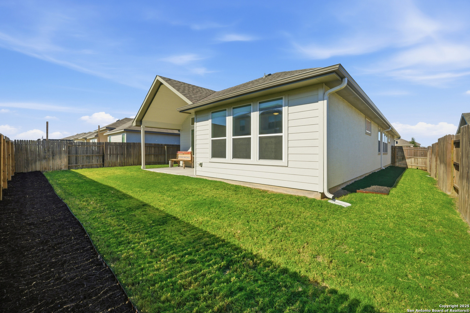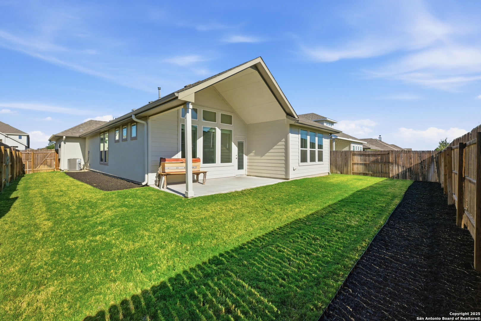 Open House This Sat and Sunday (Nov. 15&16) from 11am-3pm. Welcome home to this thoughtfully designed single-story beauty in the sought-after August Fields community of New Braunfels. Built by Chesmar Homes, this modern residence blends comfort, efficiency, and style - offering 1,976 square feet of open-concept living space ideal for today's lifestyle. Step inside and be greeted by vaulted ceilings that create a bright, airy feel in the spacious family room. The open-concept floor plan seamlessly connects the living, dining, and kitchen areas, making it perfect for entertaining and family gatherings. The large kitchen island serves as the centerpiece, complemented by ENERGY STAR qualified appliances, a gas cooktop, built-in oven, and abundant counter and cabinet space. A versatile flex room provides additional options; perfect for a media room, home office, or playroom. The luxurious master suite is a private retreat featuring a tray ceiling, double vanity, spacious walk-in shower, and an impressive walk-in closet. Two well-sized secondary bedrooms and a full bath offer ample space for family or guests, all conveniently located on the main level. Enjoy energy-efficient living with double-pane Low-E windows, radiant barrier roofing, a 16+ SEER central air system, and zoned natural gas heating. The home also includes high-speed internet wiring, a programmable thermostat, and ceiling fans throughout for year-round comfort. The exterior features 3-sides masonry construction with stone and stucco finishes, a composition roof, and a covered patio that extends your living space outdoors - perfect for relaxing or hosting barbecues. The 6,534 sqft lot includes a privacy-fenced backyard, sprinkler system, and curb appeal enhanced by sidewalks and streetlights. A two-car oversized attached garage provides plenty of storage and parking space. Residents of August Fields enjoy access to family-friendly amenities including a playground, jogging trails, and a basketball court. The neighborhood is conveniently located near Creekside shopping, restaurants, top-rated schools, and Resolute Hospital, with easy access to IH-35 for quick commutes to San Antonio or Austin.