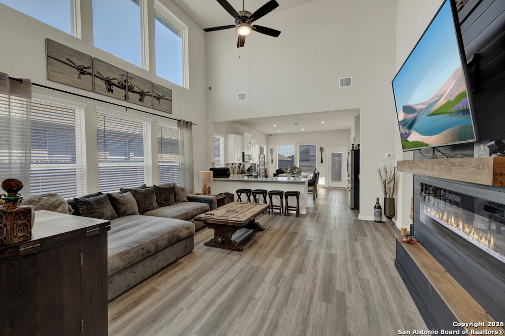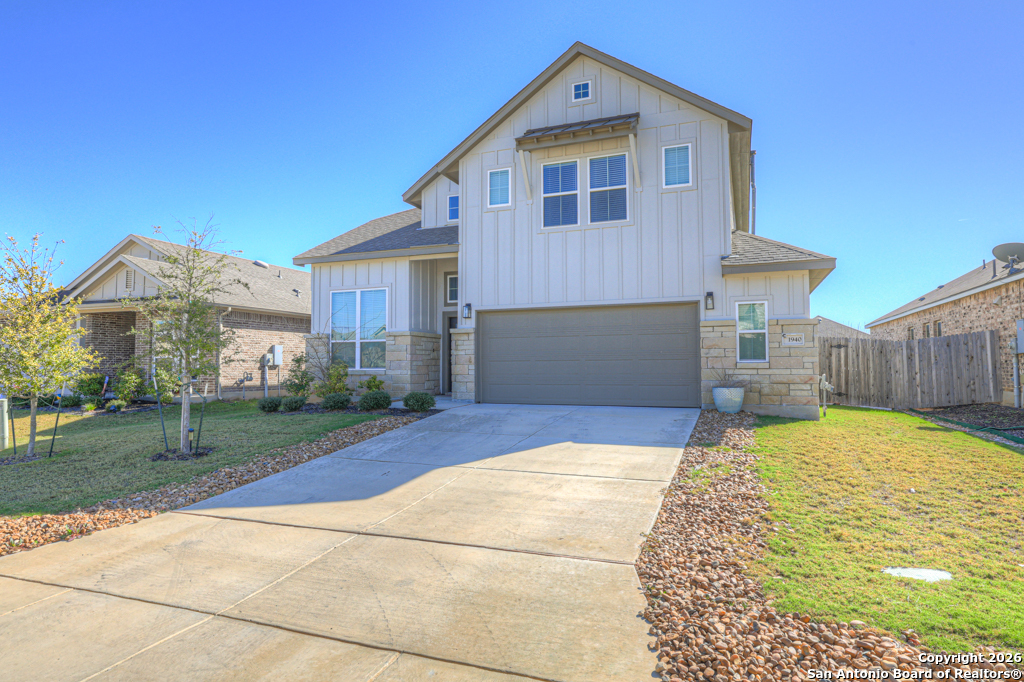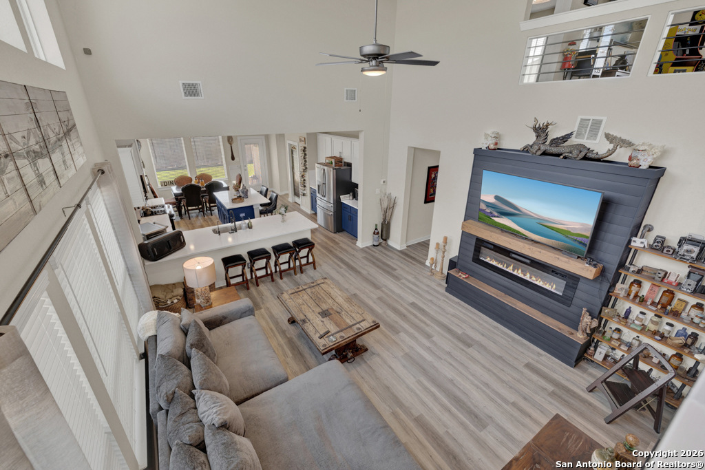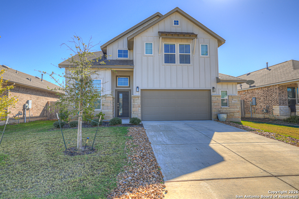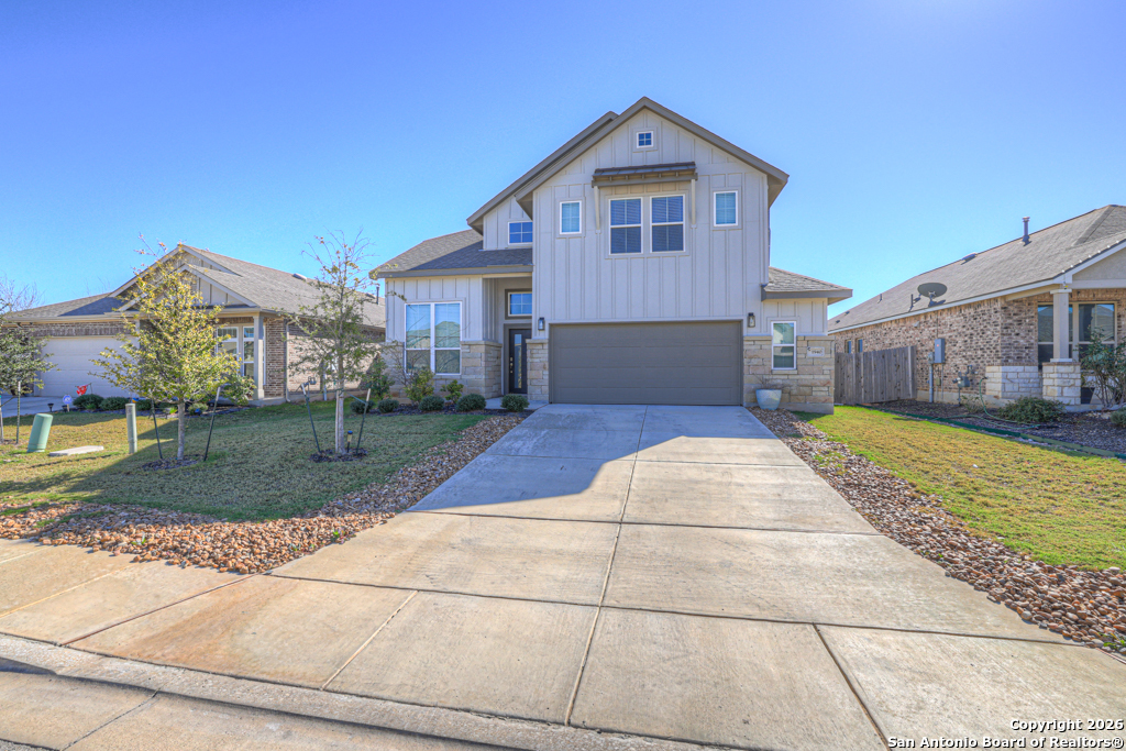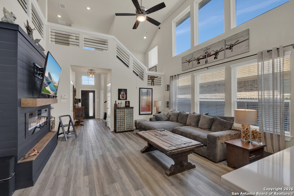 This beautifully designed Chesmar home is perfectly situated just minutes from Creekside and the vibrant shopping and dining destinations of New Braunfels. Offering a modern open-concept layout, this home is filled with natural light and showcases soaring ceilings that create a bright, welcoming atmosphere from the moment you step inside. The main living area features an electric fireplace that adds warmth and charm, seamlessly flowing into a spacious kitchen built for both everyday living and entertaining. The kitchen is highlighted by a large center island, breakfast bar, elegant quartz countertops, and a walk-in pantry, along with a dedicated dining area that's perfect for family meals and gatherings. The private downstairs primary suite is a true retreat, complete with its own fireplace and a bathroom featuring a spacious tiled walk-in shower. The laundry room connects directly to the primary closet, adding exceptional convenience and functionality. An additional bedroom on the main level is ideal for guests or a nursery. A private home office on the main level provides the ideal space for remote work, studying, or managing daily tasks. Upstairs, you'll find a versatile loft space that can be used as a second living area, game room, or study, along with two generously sized bedrooms and a full bathroom with separate sinks. Step outside to enjoy a fully fenced backyard with a wooden privacy fence, covered back porch, and lush green grass-perfect for relaxing, entertaining, or letting pets play. Residents enjoy access to community amenities including a playground, sports court, and jogging trails, making it easy to stay active and enjoy the outdoors. With quick access to Creekside, shopping, restaurants, and entertainment, this home offers the perfect blend of comfort, style, and convenience in one of New Braunfels' most desirable locations.