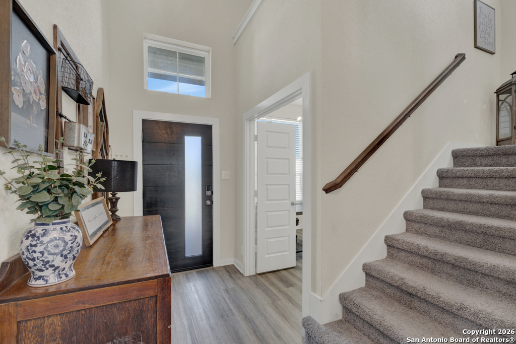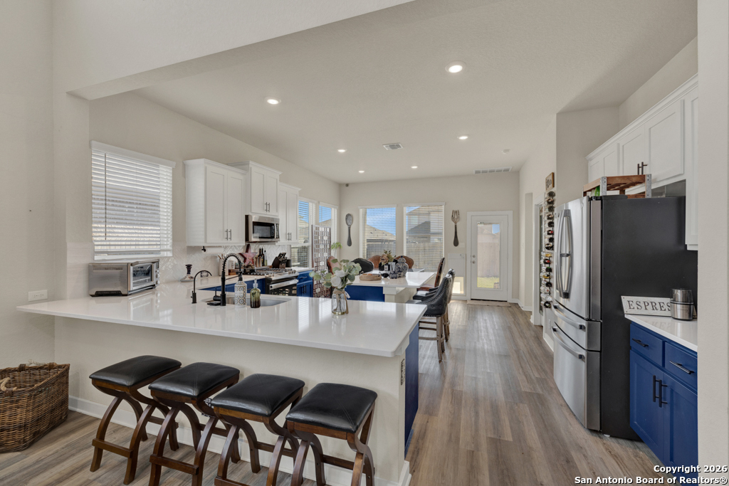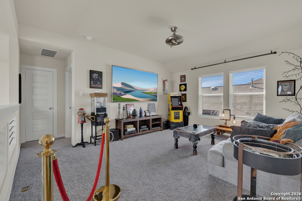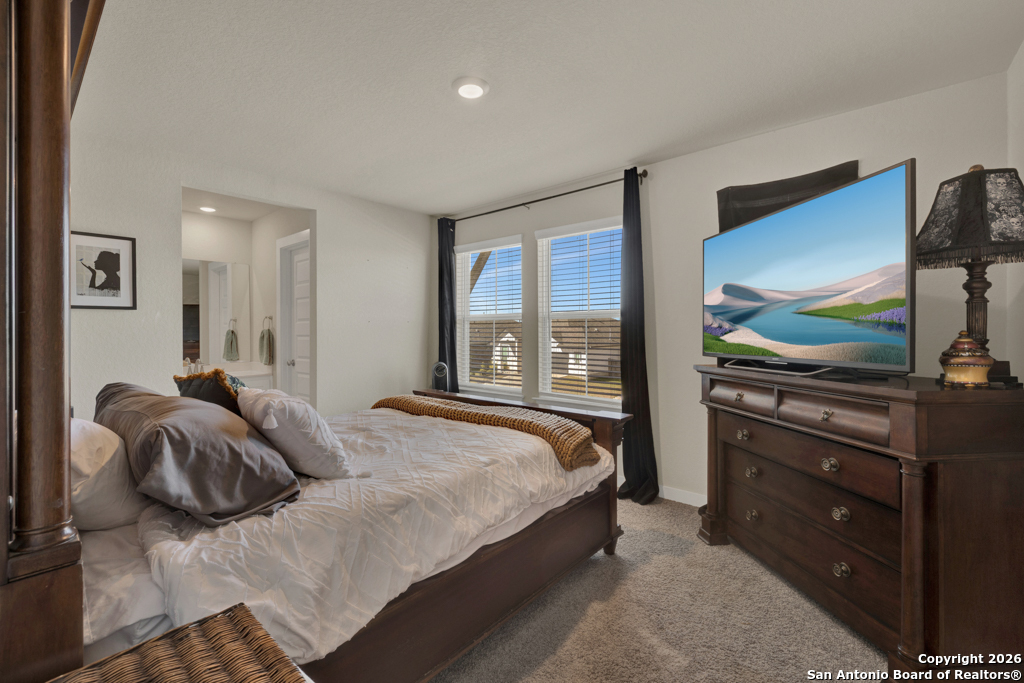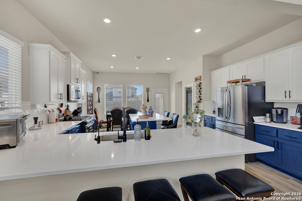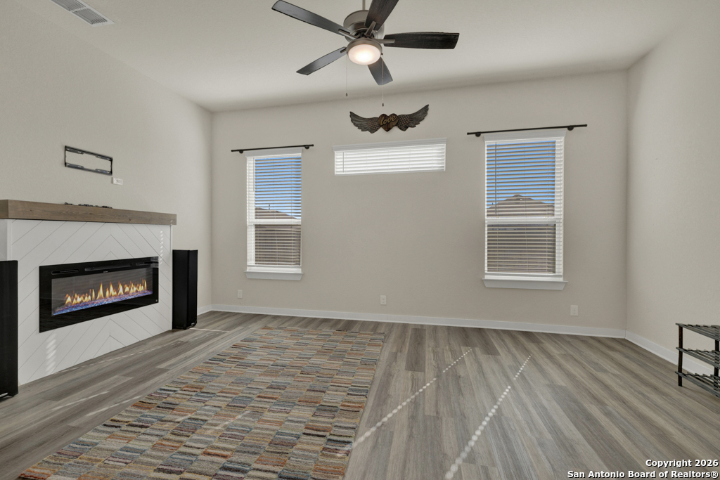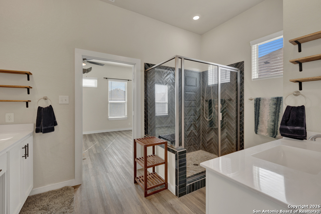 This beautifully designed Chesmar home is perfectly situated just minutes from Creekside and the vibrant shopping and dining destinations of New Braunfels. Offering a modern open-concept layout, this home is filled with natural light and showcases soaring ceilings that create a bright, welcoming atmosphere from the moment you step inside. The main living area features an electric fireplace that adds warmth and charm, seamlessly flowing into a spacious kitchen built for both everyday living and entertaining. The kitchen is highlighted by a large center island, breakfast bar, elegant quartz countertops, and a walk-in pantry, along with a dedicated dining area that's perfect for family meals and gatherings. The private downstairs primary suite is a true retreat, complete with its own fireplace and a bathroom featuring a spacious tiled walk-in shower. The laundry room connects directly to the primary closet, adding exceptional convenience and functionality. An additional bedroom on the main level is ideal for guests or a nursery. A private home office on the main level provides the ideal space for remote work, studying, or managing daily tasks. Upstairs, you'll find a versatile loft space that can be used as a second living area, game room, or study, along with two generously sized bedrooms and a full bathroom with separate sinks. Step outside to enjoy a fully fenced backyard with a wooden privacy fence, covered back porch, and lush green grass-perfect for relaxing, entertaining, or letting pets play. Residents enjoy access to community amenities including a playground, sports court, and jogging trails, making it easy to stay active and enjoy the outdoors. With quick access to Creekside, shopping, restaurants, and entertainment, this home offers the perfect blend of comfort, style, and convenience in one of New Braunfels' most desirable locations.