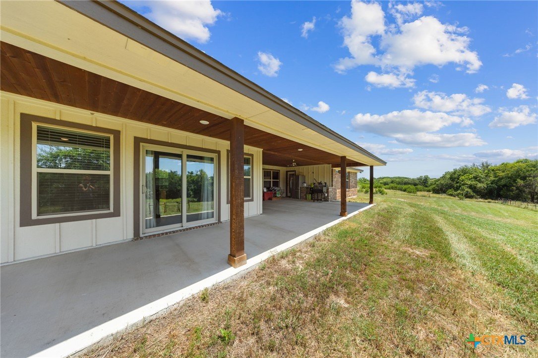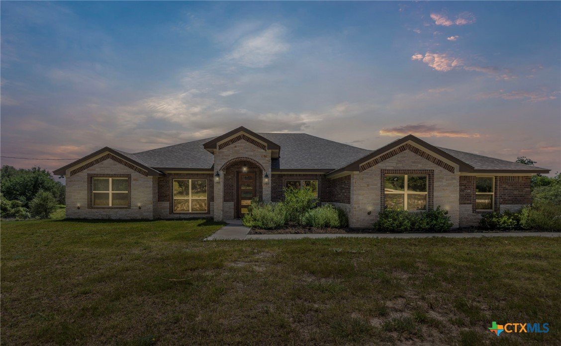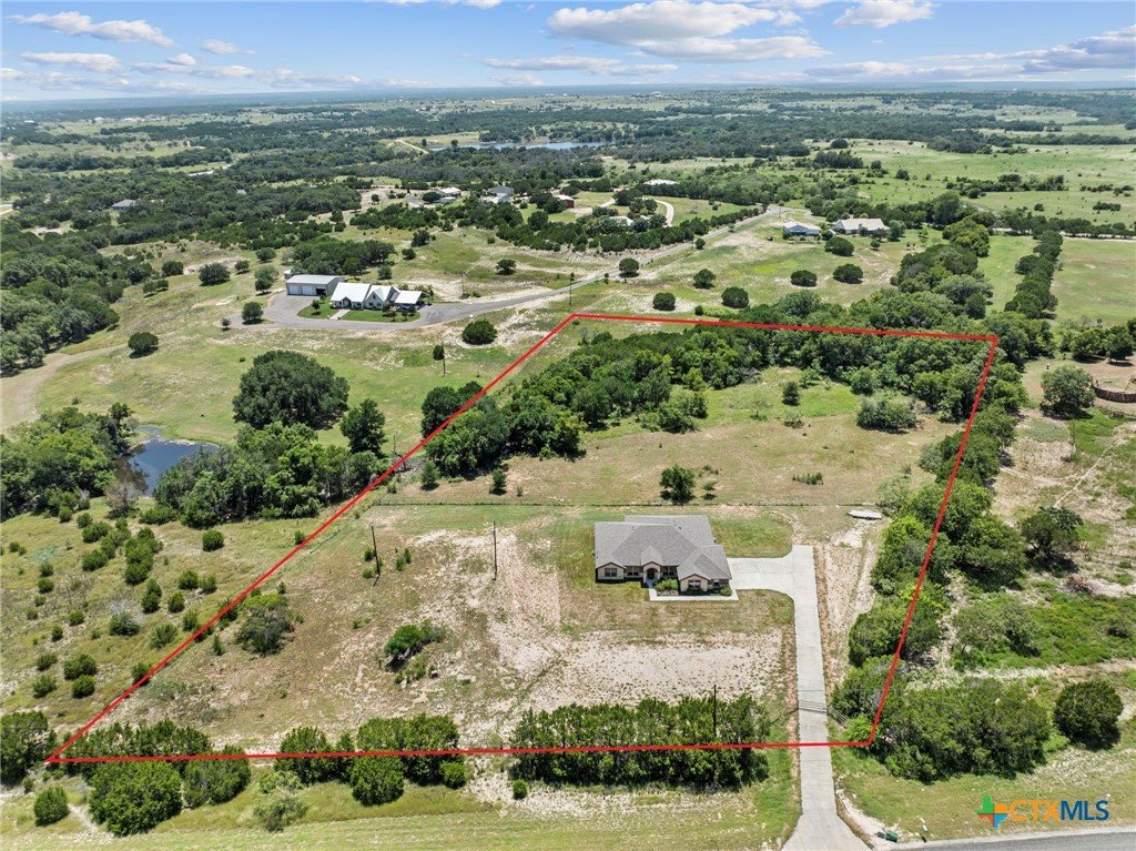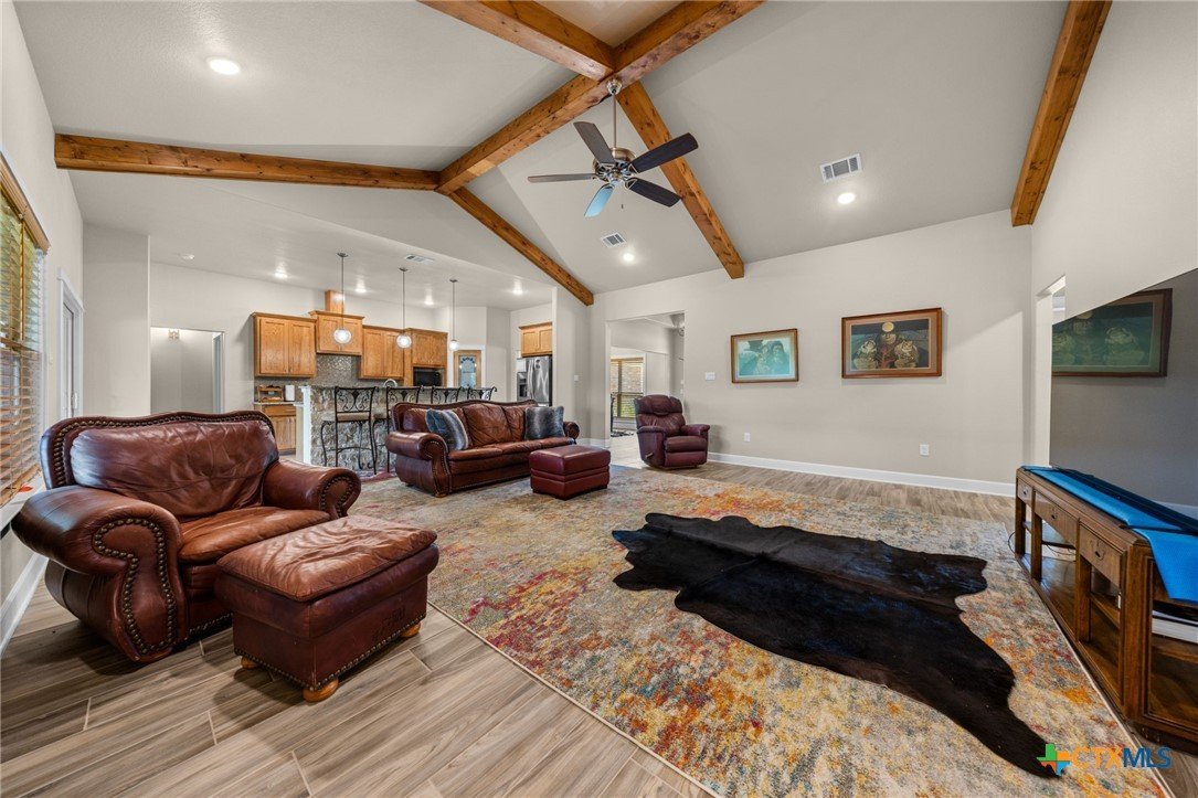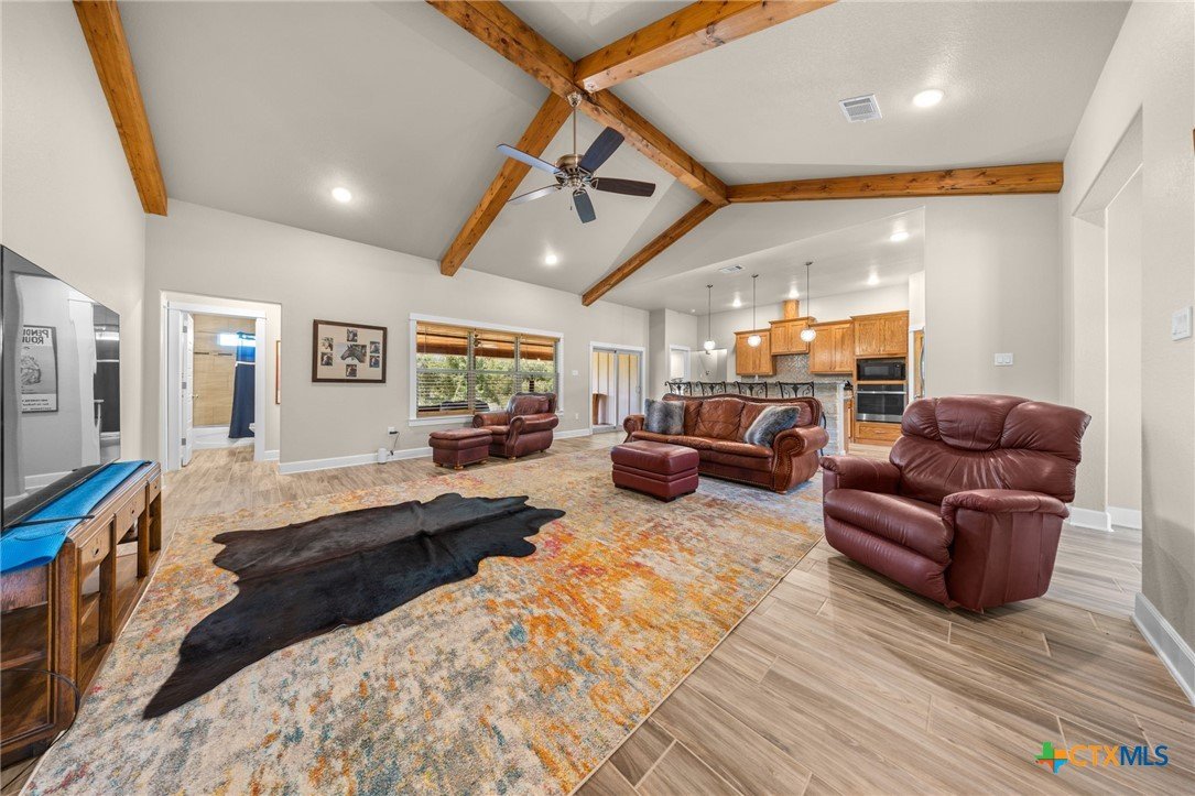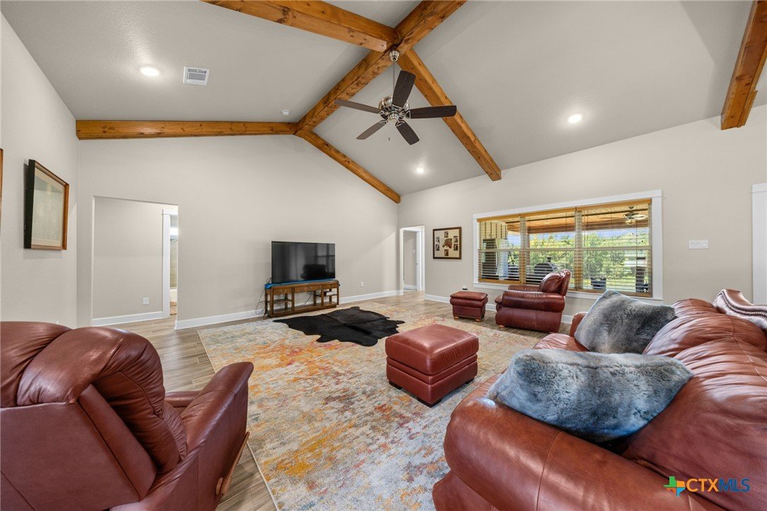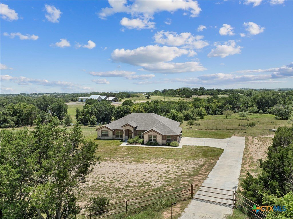 Stunning 2021 Custom Home on 4.85 Acres! This beautifully designed 4-bedroom, 3-bath home offers 2305 sq. ft. of comfortable living space with an open-concept floor plan and high-end finishes throughout. Tile flooring spans the main living areas, while plush carpet adds warmth to the bedrooms. The spacious living room features gorgeous beam-accented ceilings, creating a welcoming atmosphere for entertaining or relaxing. The gourmet kitchen is equipped with granite countertops, custom cabinetry, an eat-in bar, and a dining area just off the kitchen — perfect for gatherings. A large private office provides the ideal space for working from home. The expansive primary suite includes a luxurious en-suite bath with a walk-in shower, soaking tub, dual vanities, and a large walk-in closet. Additional highlights include a spacious laundry room, sprinkler system, and a large covered back porch with an outdoor sink — ideal for outdoor living. Situated on 4.85 acres with mature trees, a seasonal creek, and scenic views, this property offers peace, privacy, and plenty of room for animals or to add a workshop. A rare opportunity to own acreage with a nearly new custom home that blends comfort, functionality, and style.