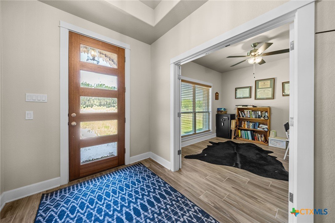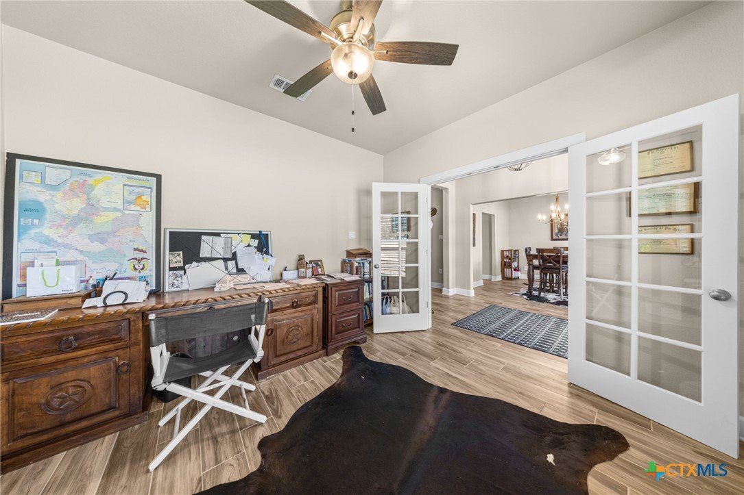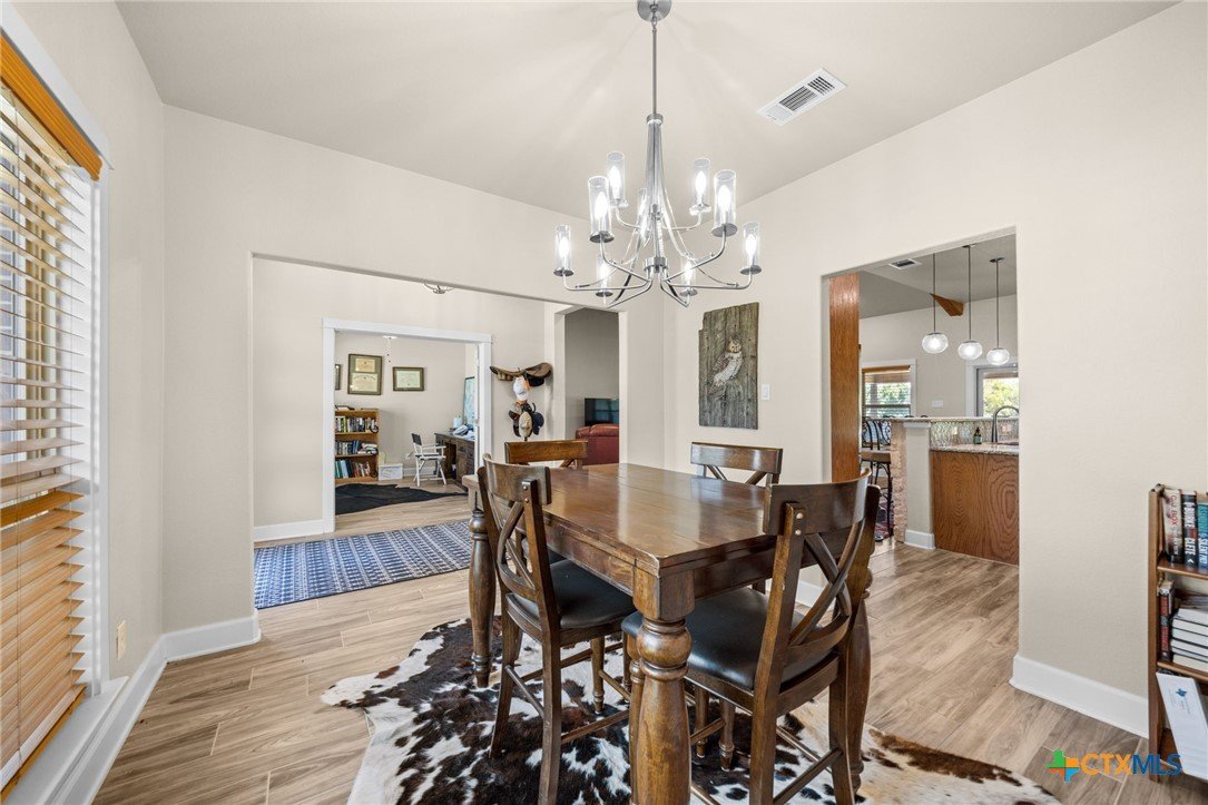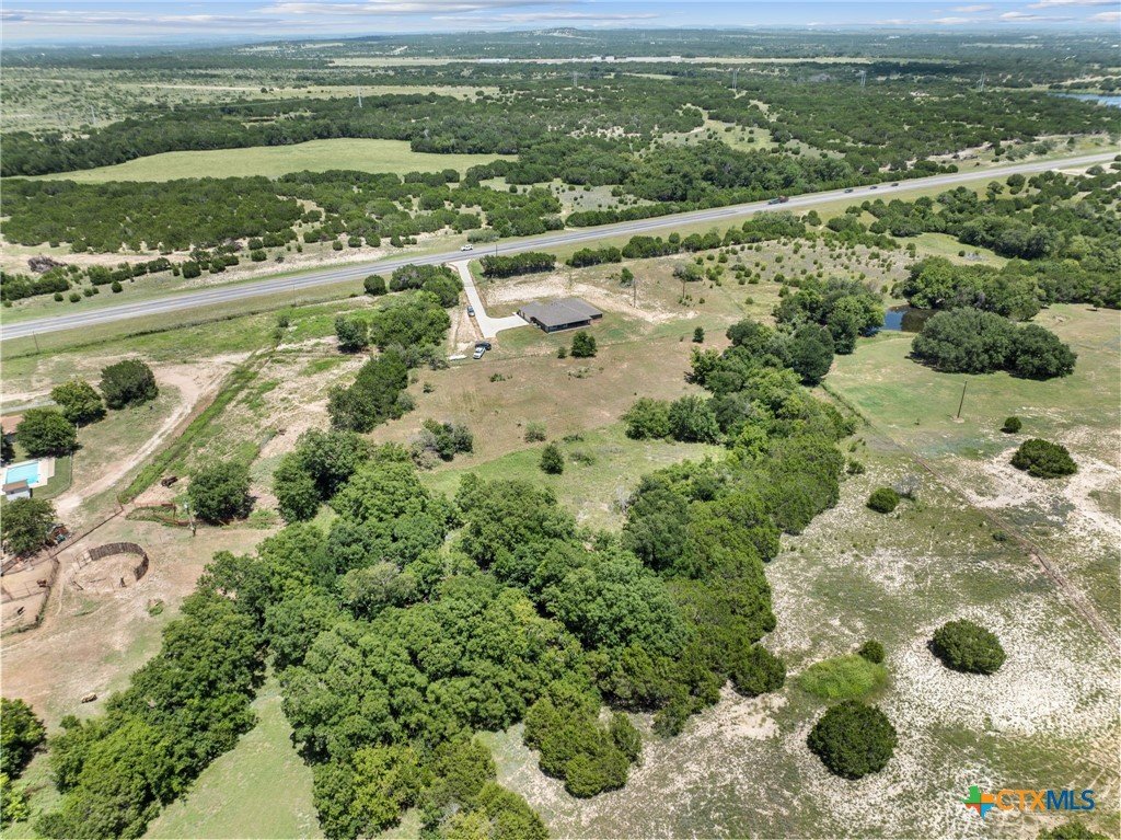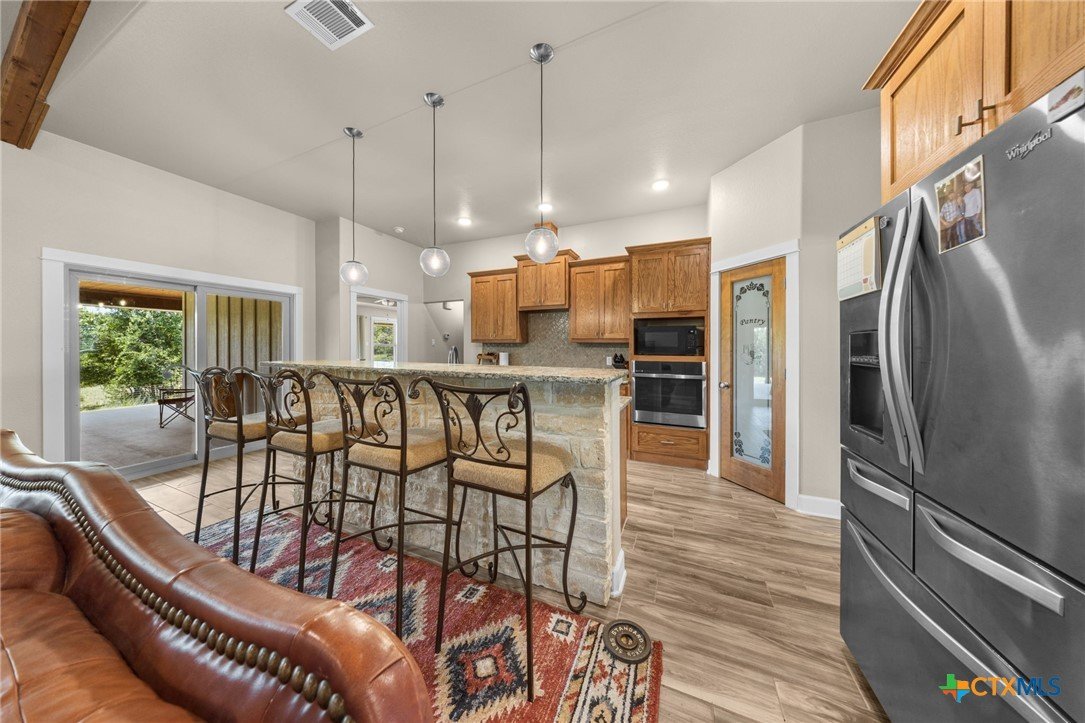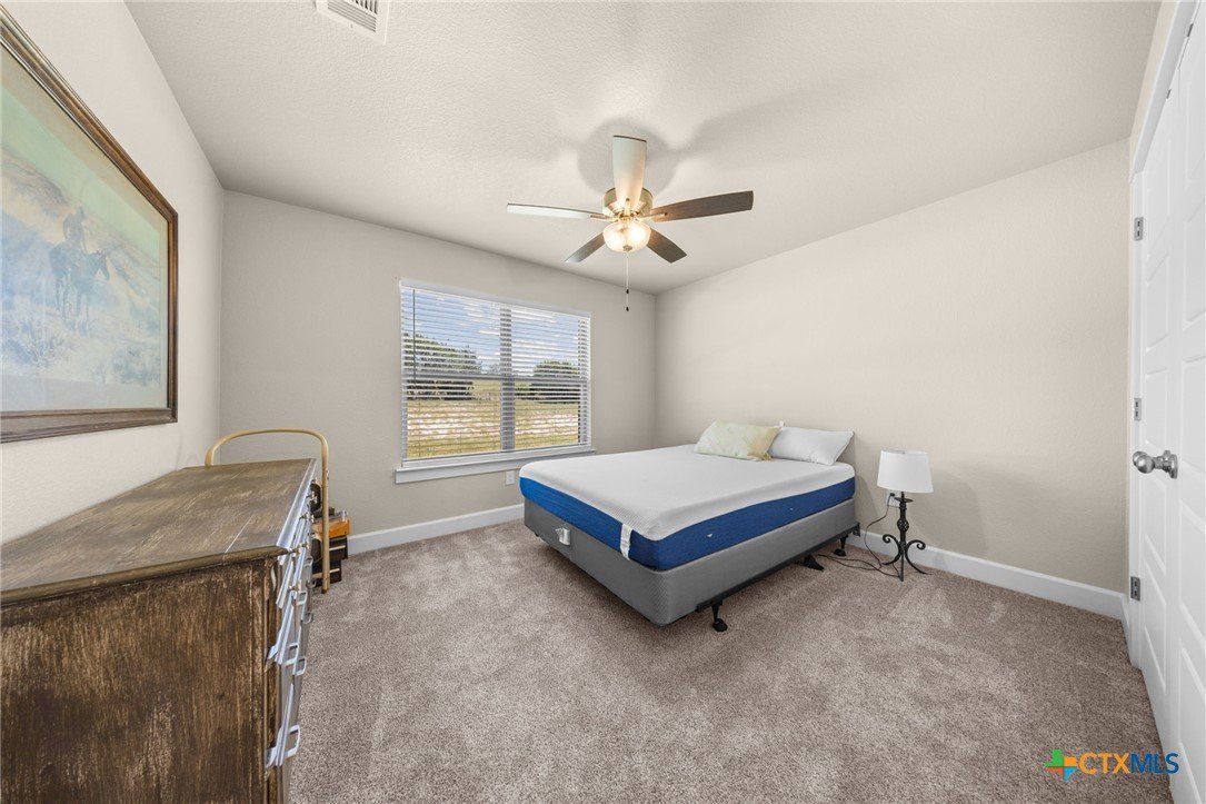 Stunning 2021 Custom Home on 4.85 Acres! This beautifully designed 4-bedroom, 3-bath home offers 2305 sq. ft. of comfortable living space with an open-concept floor plan and high-end finishes throughout. Tile flooring spans the main living areas, while plush carpet adds warmth to the bedrooms. The spacious living room features gorgeous beam-accented ceilings, creating a welcoming atmosphere for entertaining or relaxing. The gourmet kitchen is equipped with granite countertops, custom cabinetry, an eat-in bar, and a dining area just off the kitchen — perfect for gatherings. A large private office provides the ideal space for working from home. The expansive primary suite includes a luxurious en-suite bath with a walk-in shower, soaking tub, dual vanities, and a large walk-in closet. Additional highlights include a spacious laundry room, sprinkler system, and a large covered back porch with an outdoor sink — ideal for outdoor living. Situated on 4.85 acres with mature trees, a seasonal creek, and scenic views, this property offers peace, privacy, and plenty of room for animals or to add a workshop. A rare opportunity to own acreage with a nearly new custom home that blends comfort, functionality, and style.