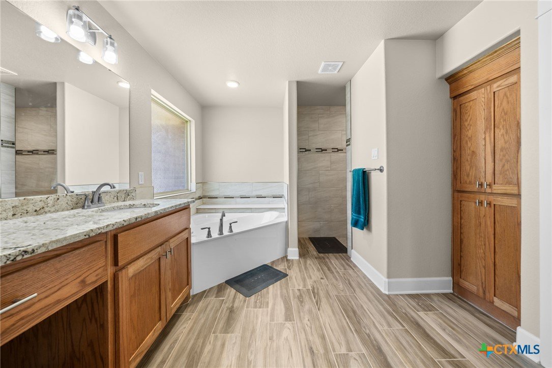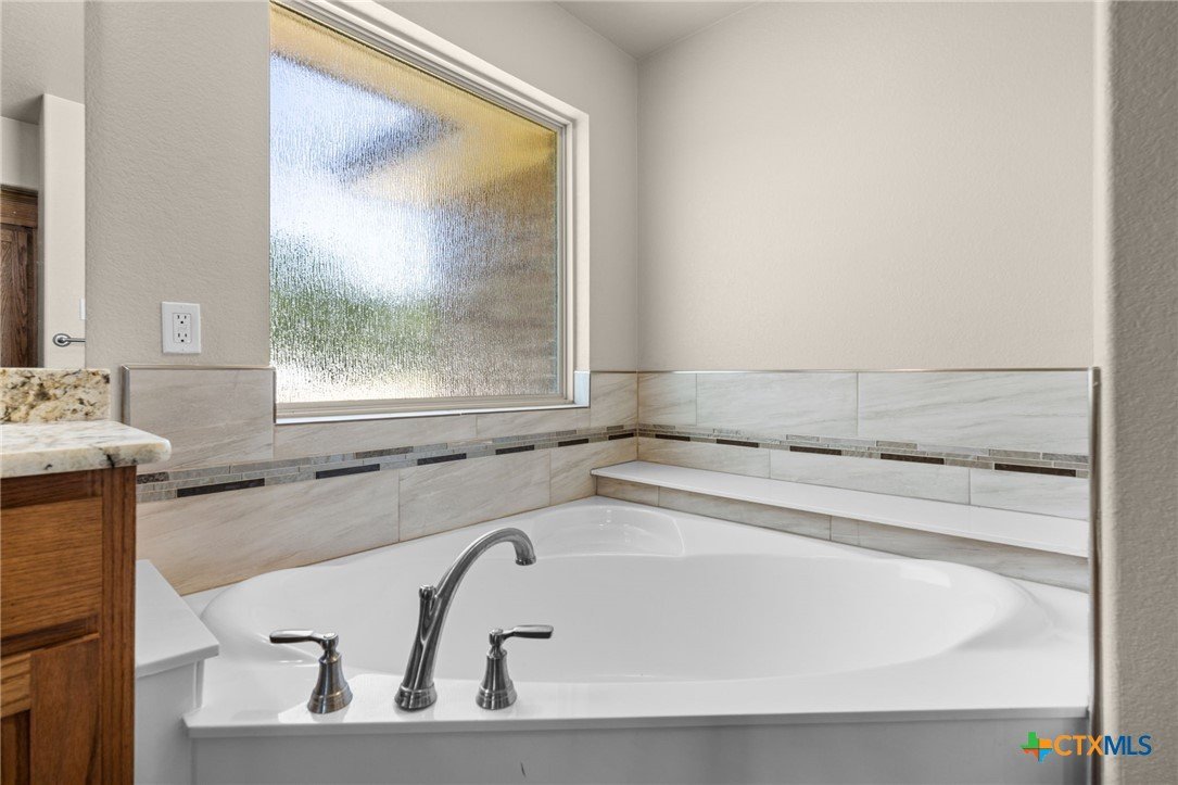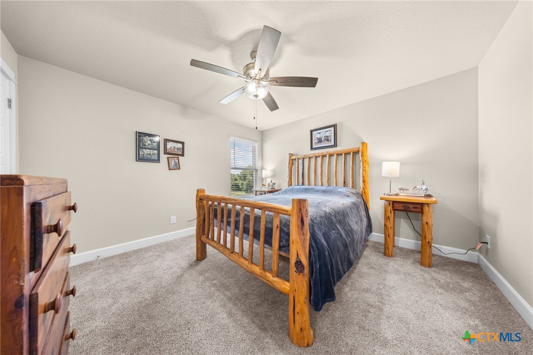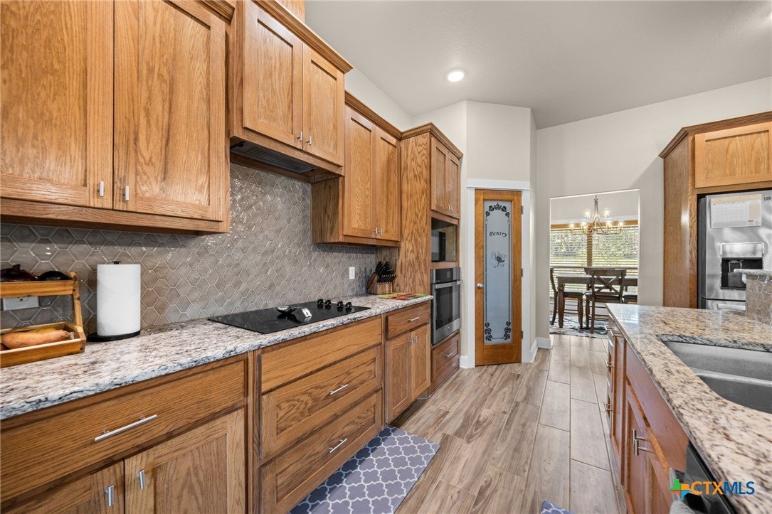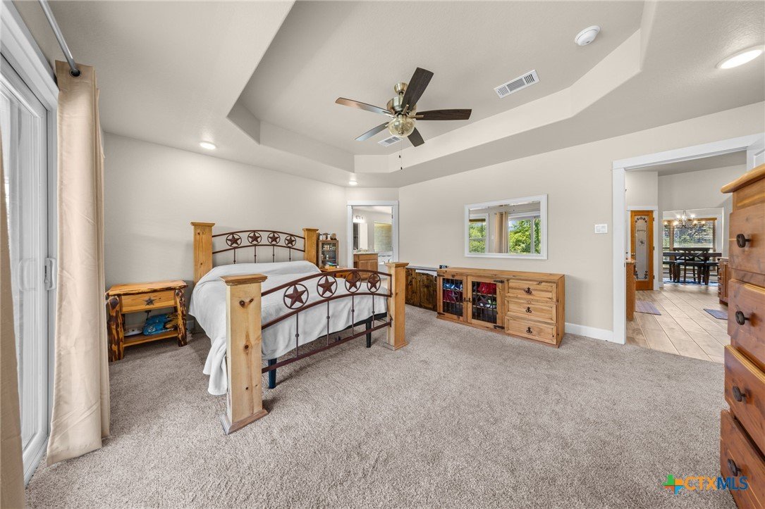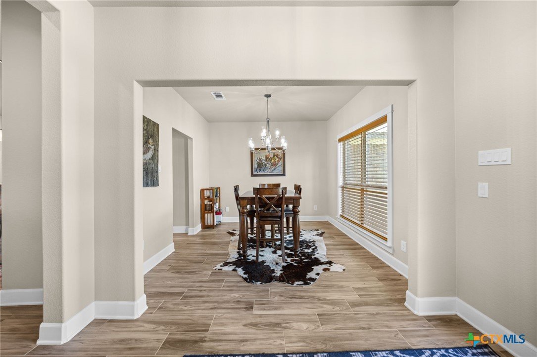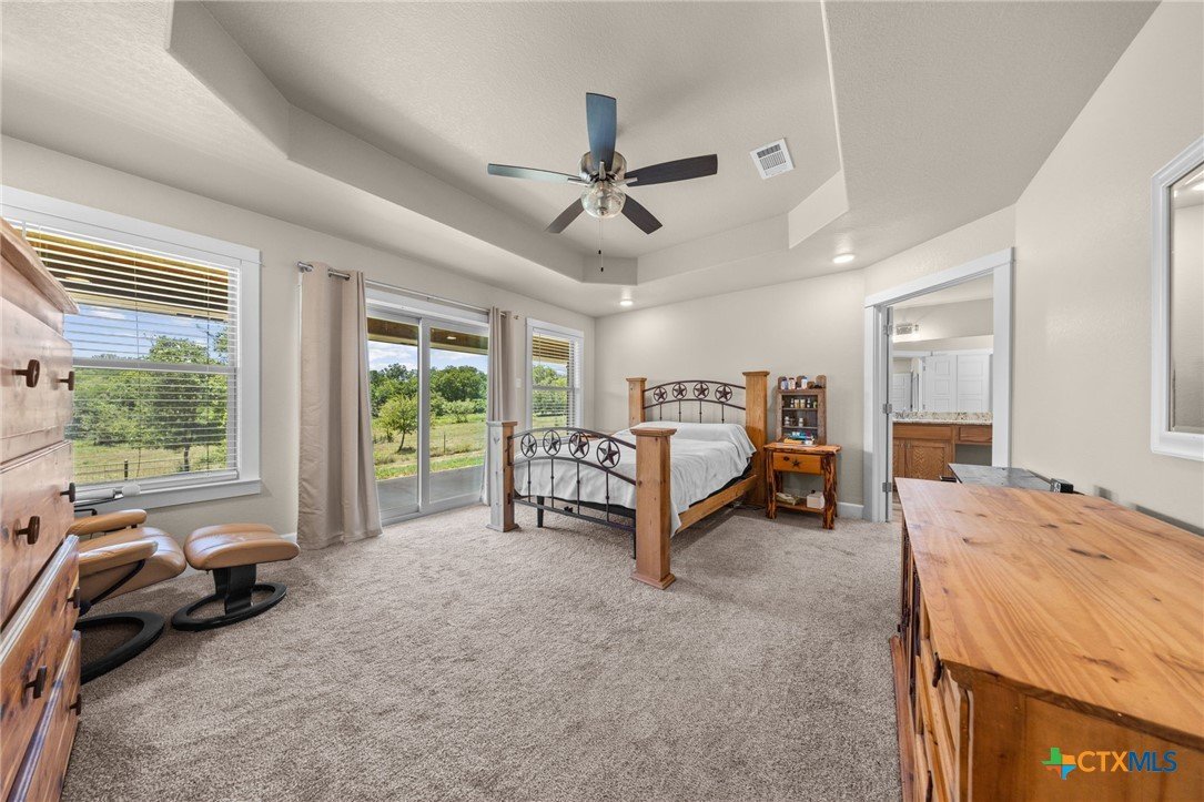 Stunning 2021 Custom Home on 4.85 Acres! This beautifully designed 4-bedroom, 3-bath home offers 2305 sq. ft. of comfortable living space with an open-concept floor plan and high-end finishes throughout. Tile flooring spans the main living areas, while plush carpet adds warmth to the bedrooms. The spacious living room features gorgeous beam-accented ceilings, creating a welcoming atmosphere for entertaining or relaxing. The gourmet kitchen is equipped with granite countertops, custom cabinetry, an eat-in bar, and a dining area just off the kitchen — perfect for gatherings. A large private office provides the ideal space for working from home. The expansive primary suite includes a luxurious en-suite bath with a walk-in shower, soaking tub, dual vanities, and a large walk-in closet. Additional highlights include a spacious laundry room, sprinkler system, and a large covered back porch with an outdoor sink — ideal for outdoor living. Situated on 4.85 acres with mature trees, a seasonal creek, and scenic views, this property offers peace, privacy, and plenty of room for animals or to add a workshop. A rare opportunity to own acreage with a nearly new custom home that blends comfort, functionality, and style.
