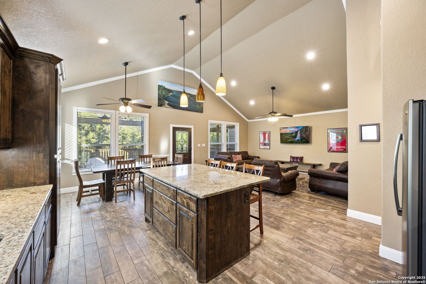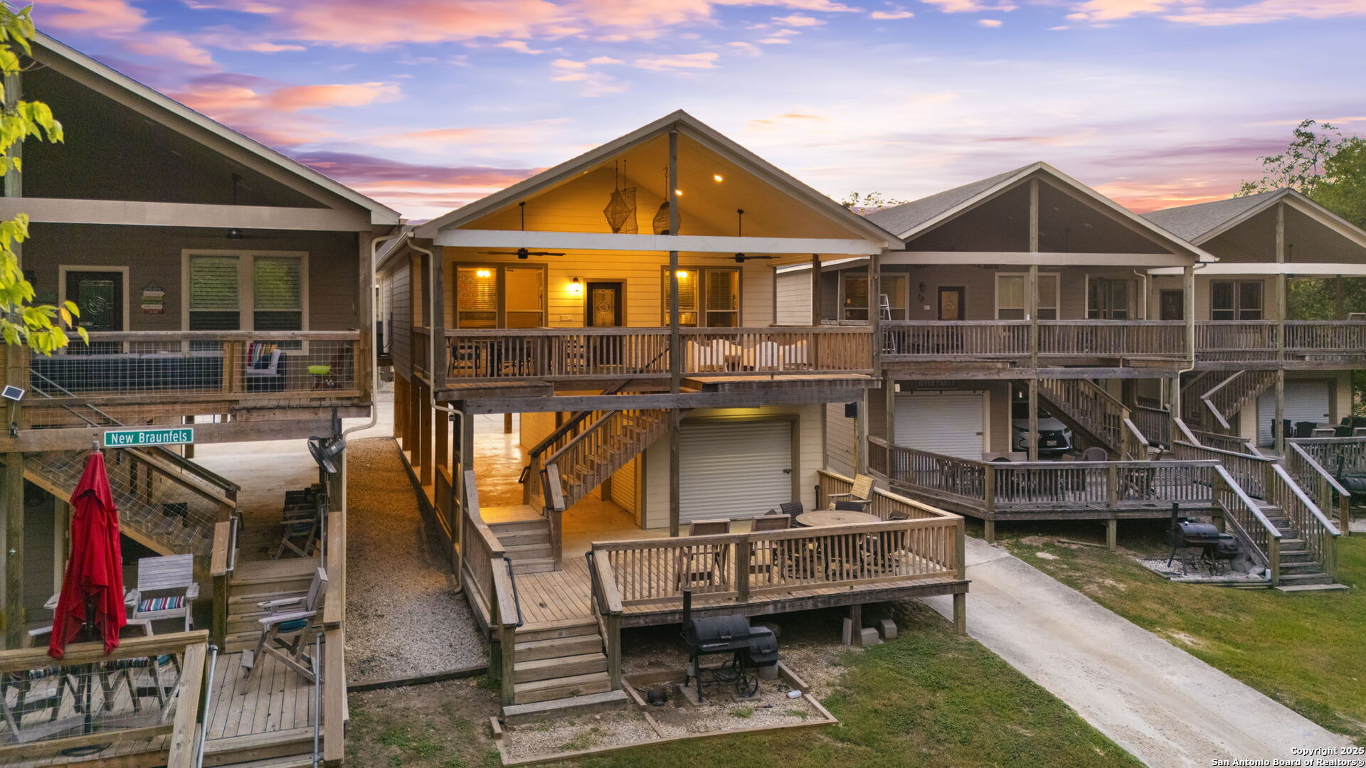 Tucked along the banks of the Guadalupe River, this beautifully designed 4-bedroom, 3-bath home offers the perfect blend of Hill Country relaxation and vacation rental opportunity. Located in a gated community with private river access, this detached condo is ideal for those who love the water, entertaining, and the laid-back charm of New Braunfels living. Step inside to an open-concept layout with soaring ceilings and a spacious kitchen featuring a large island that is perfect for gathering with friends and family. The home features two full kitchens, including one downstairs that is designed for outdoor entertaining and dining after a day on the river. Multiple decks on both the upper and lower levels extend the living space outdoors, creating a seamless connection between the home and its natural surroundings. Currently set up to comfortably sleep 14 guests, this property functions beautifully as a short-term rental or a personal getaway for weekends on the water. From tubing and live music at Whitewater Amphitheater to shopping and dining in Gruene, or family fun at Schlitterbahn, you are minutes from some of New Braunfels' most loved attractions. Whether you are looking for an income-producing investment, a riverfront retreat, or a little bit of both, 198 River Villas Court delivers the ultimate river lifestyle in the heart of the Texas Hill Country.