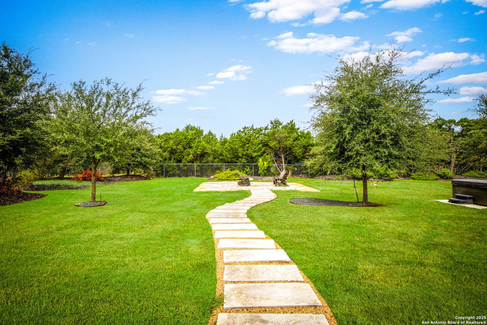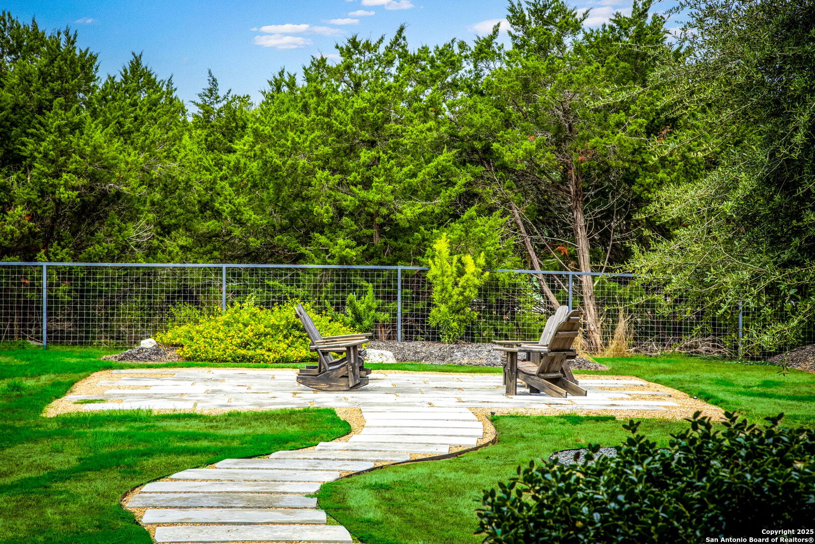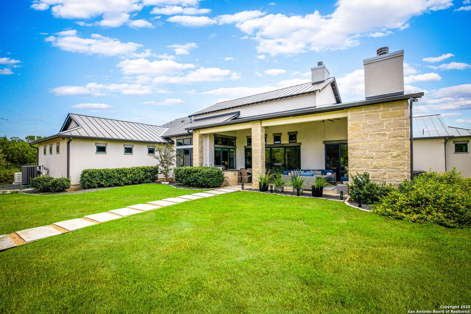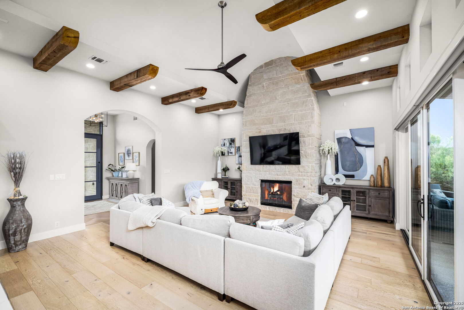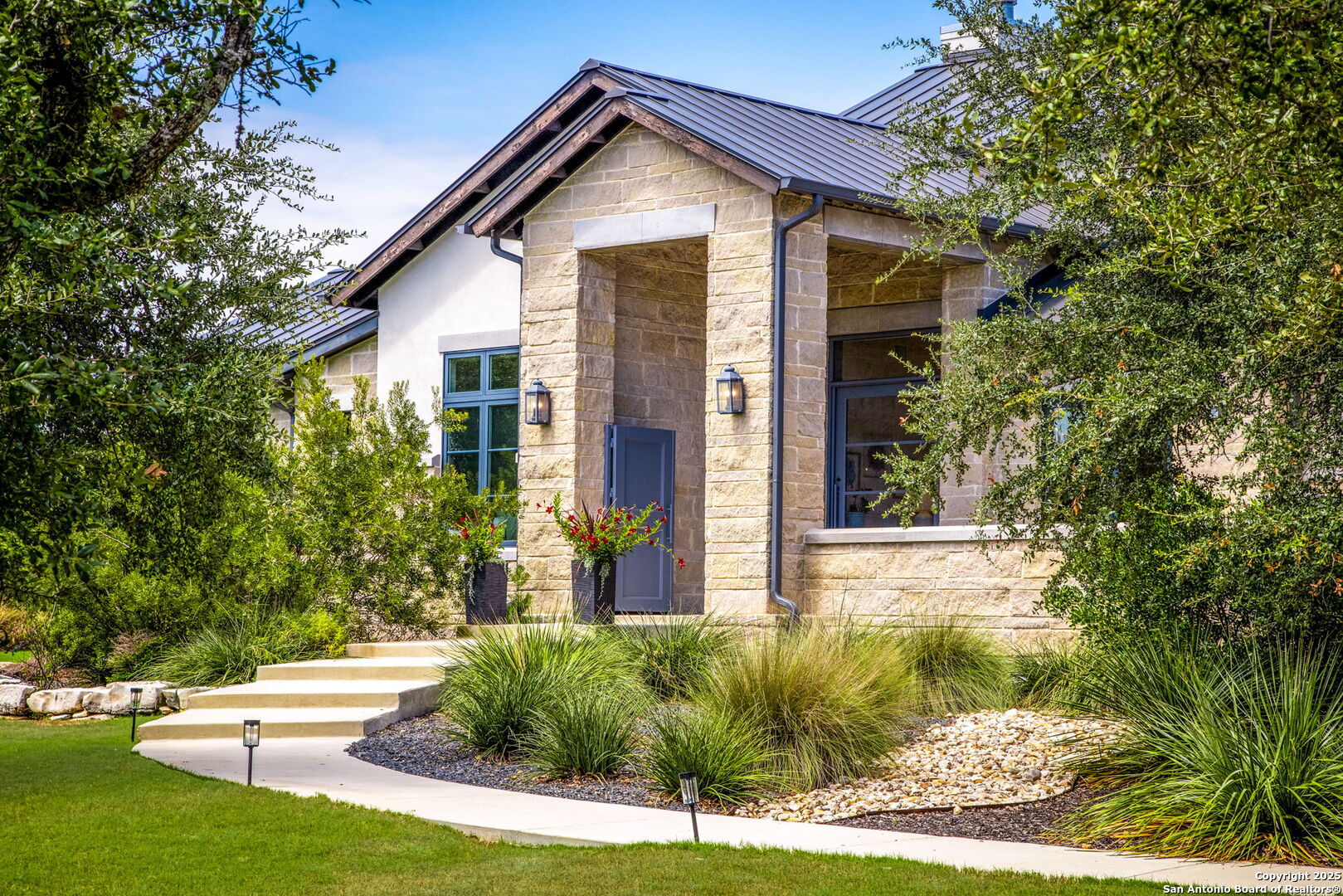 Hill Country Living, Elevated! Luxury and modern touches come together in this custom one-story home in Vintage Oaks. Behind the iron and glass pivot door, white oak floors flow through an open design where a stone fireplace, wood beams, and retractable glass doors create a seamless blend of indoor and outdoor living. The chef's kitchen impresses with Viking appliances, dual islands, and abundant cabinetry, while the master retreat offers private outdoor access and a spa-like bath featuring a walk-through shower, marble accents and soaking tub. A guest suite and Jack-and-Jill bedrooms ensure comfort for family and friends. Outdoors, enjoy a covered patio with fireplace and grill, a fully landscaped yard, and an oversized three-car garage. From quiet mornings to evenings under the Hill Country sky, this home invites you to embrace a lifestyle of beauty and ease.