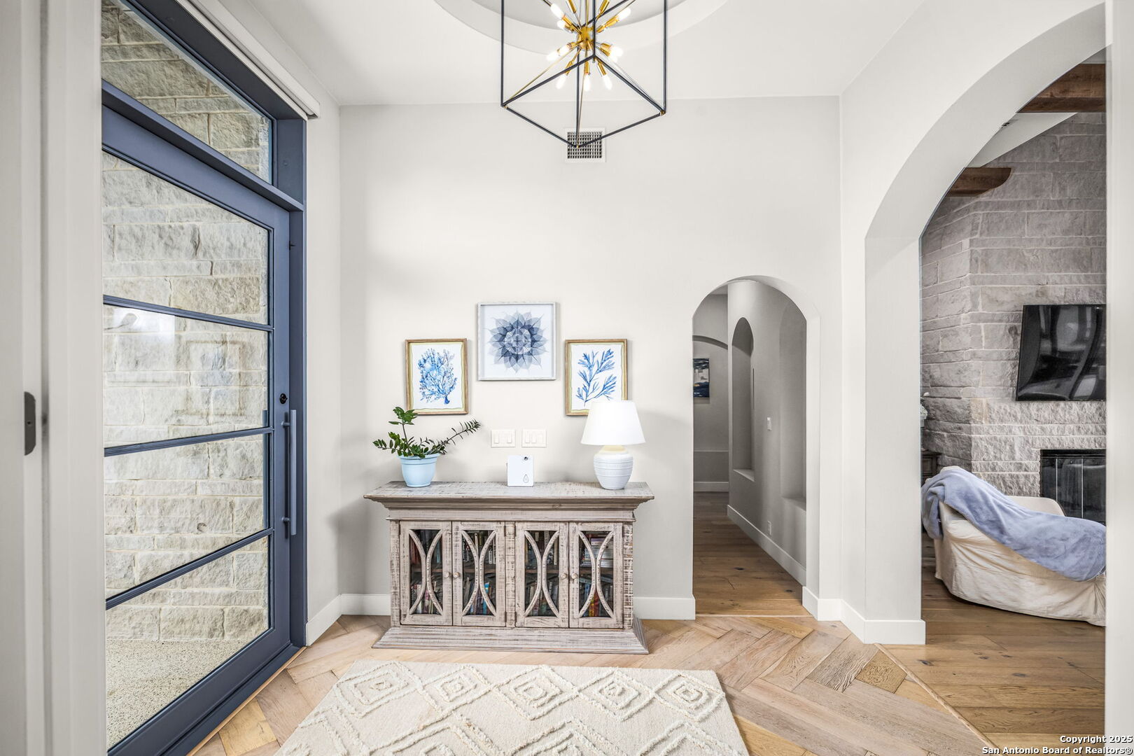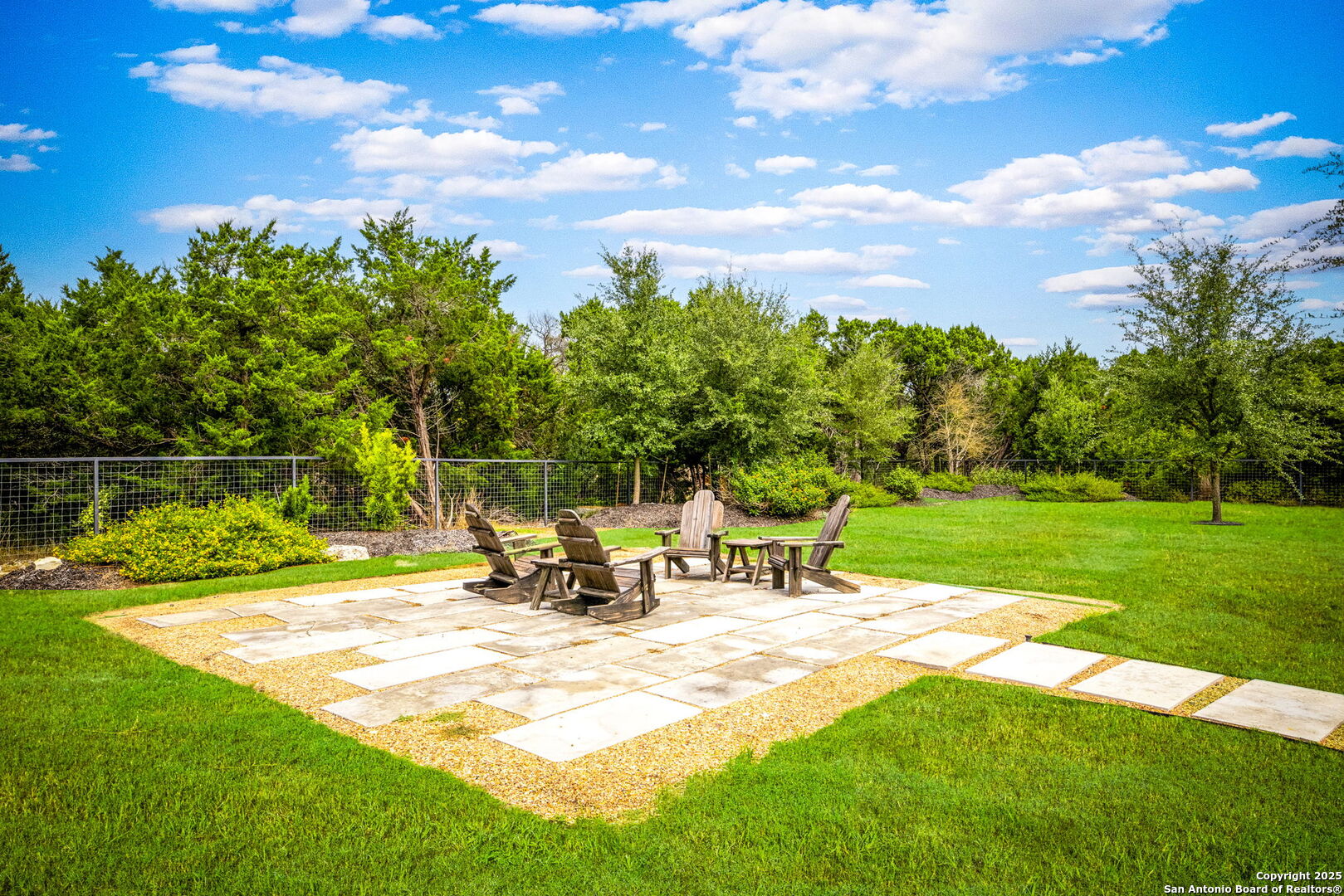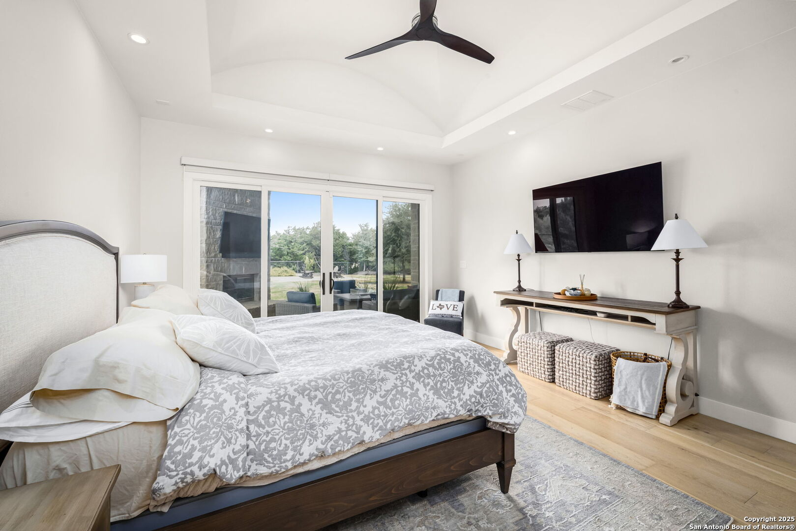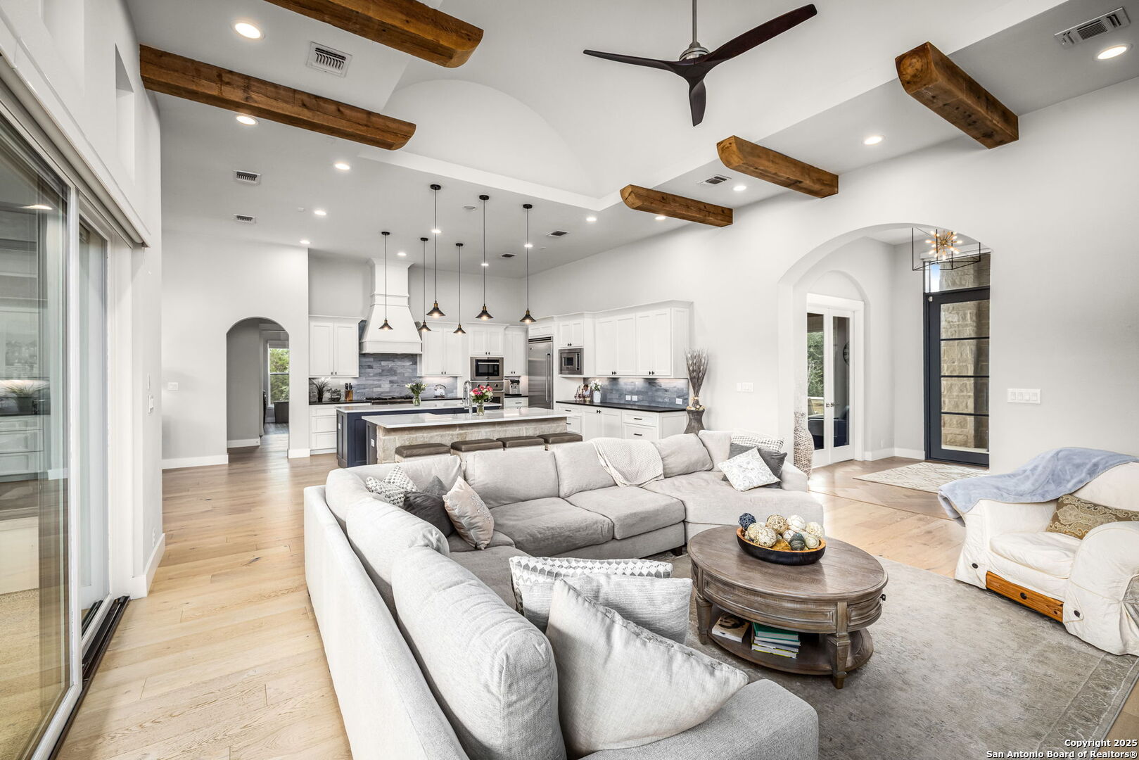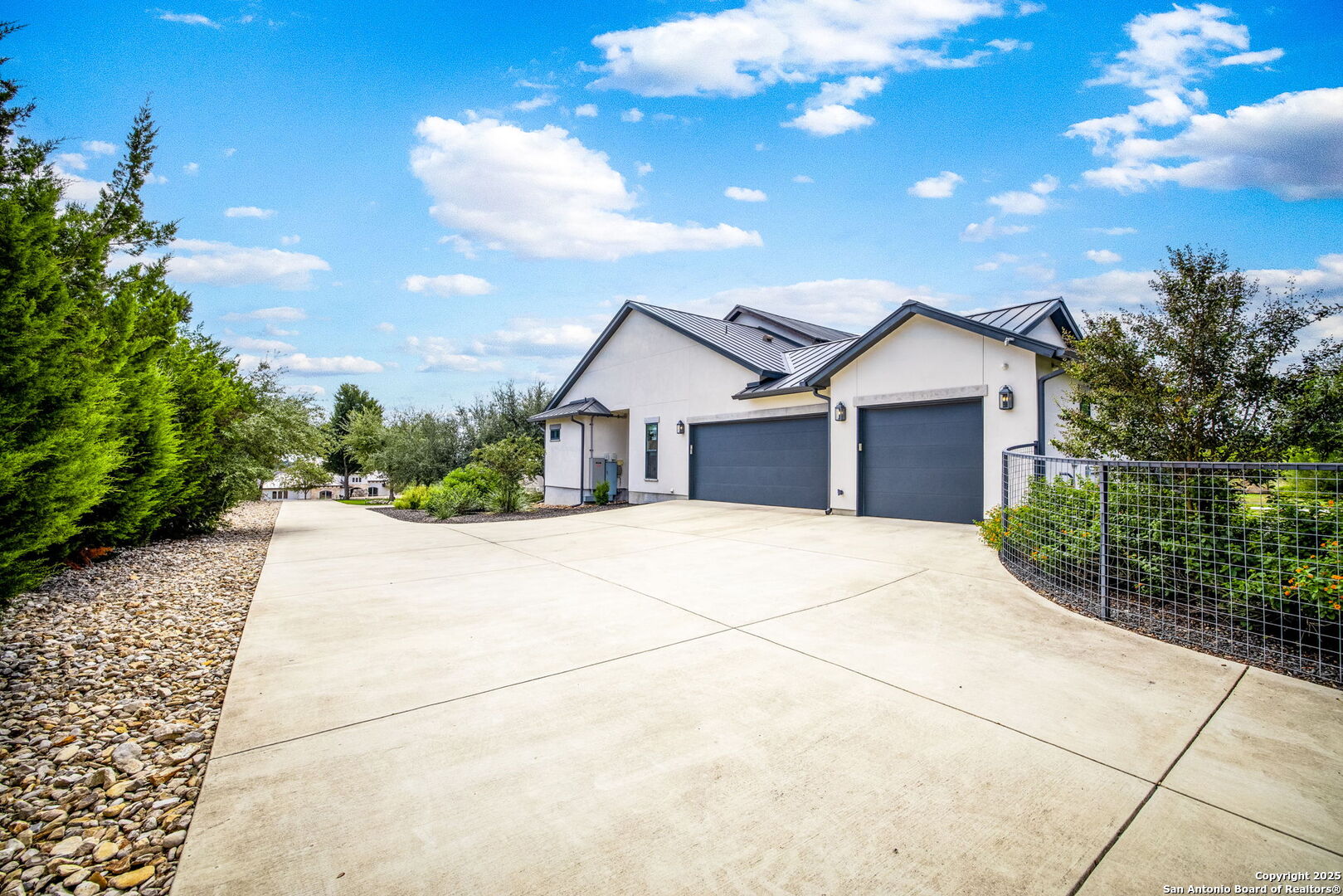 Hill Country Living, Elevated! Luxury and modern touches come together in this custom one-story home in Vintage Oaks. Behind the iron and glass pivot door, white oak floors flow through an open design where a stone fireplace, wood beams, and retractable glass doors create a seamless blend of indoor and outdoor living. The chef's kitchen impresses with Viking appliances, dual islands, and abundant cabinetry, while the master retreat offers private outdoor access and a spa-like bath featuring a walk-through shower, marble accents and soaking tub. A guest suite and Jack-and-Jill bedrooms ensure comfort for family and friends. Outdoors, enjoy a covered patio with fireplace and grill, a fully landscaped yard, and an oversized three-car garage. From quiet mornings to evenings under the Hill Country sky, this home invites you to embrace a lifestyle of beauty and ease.
