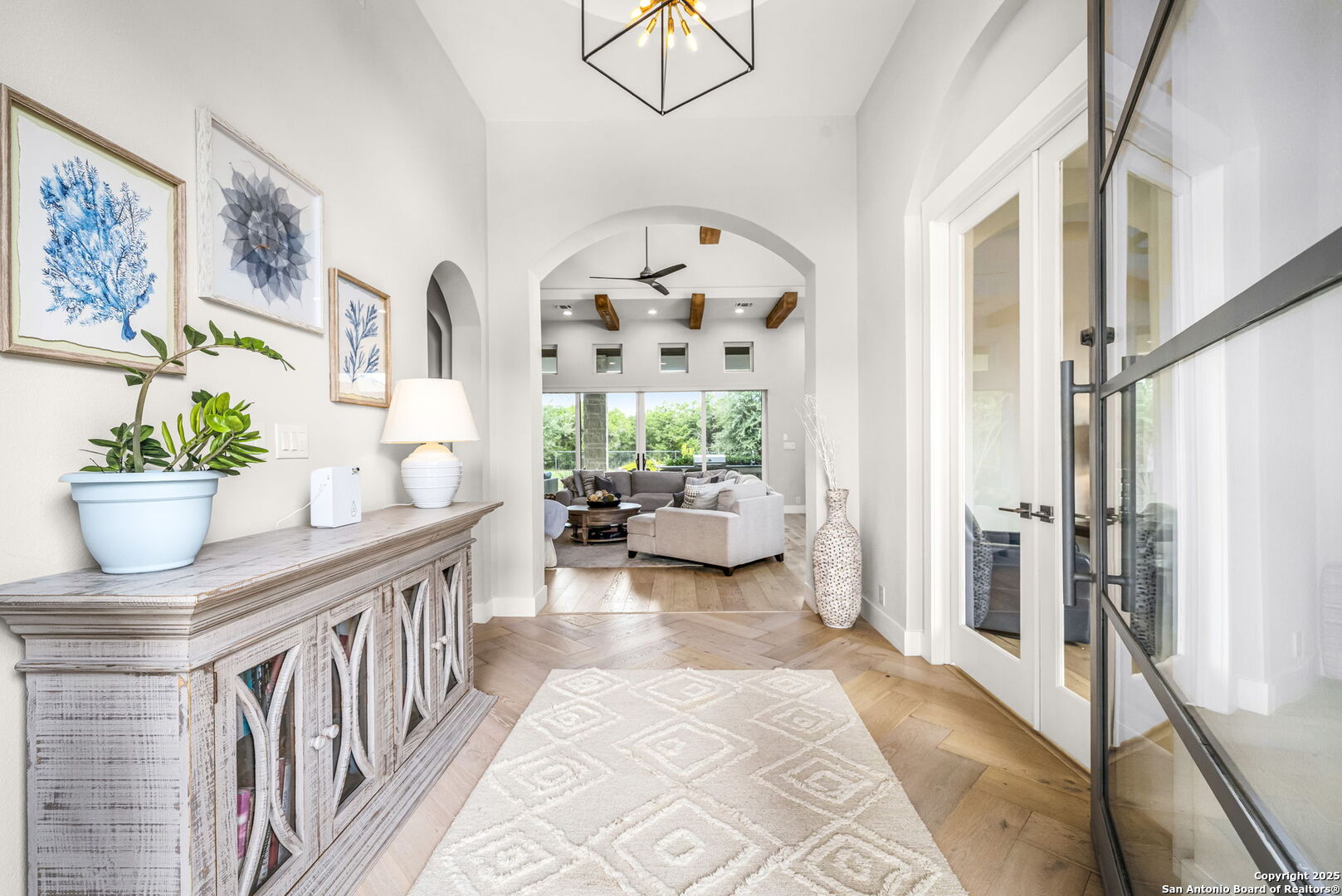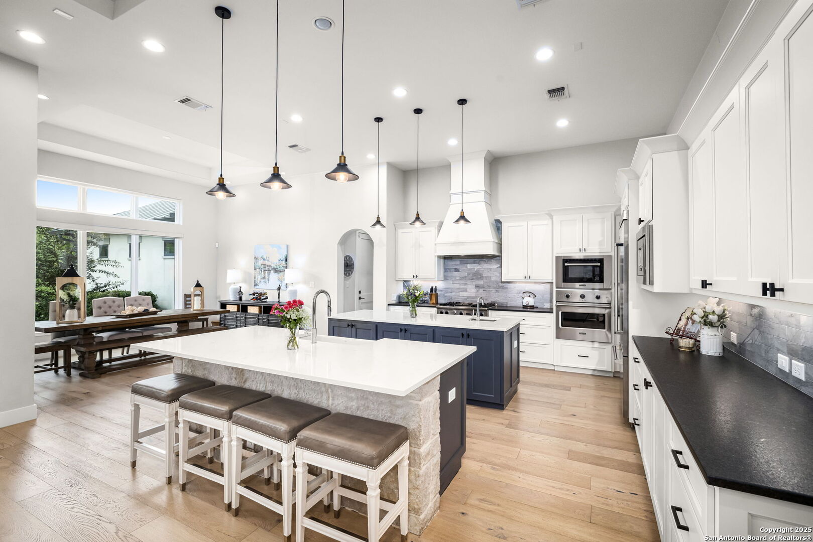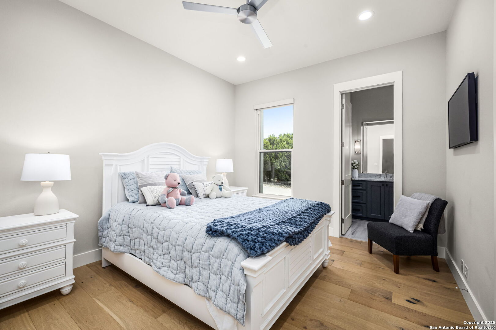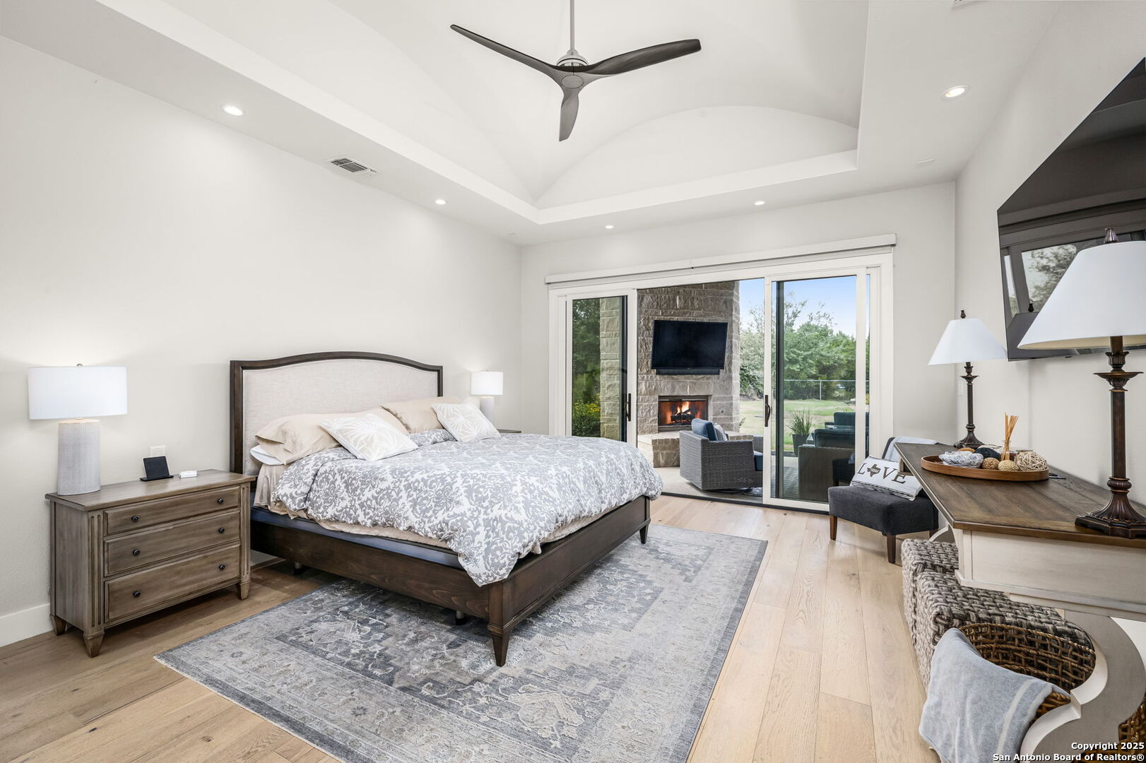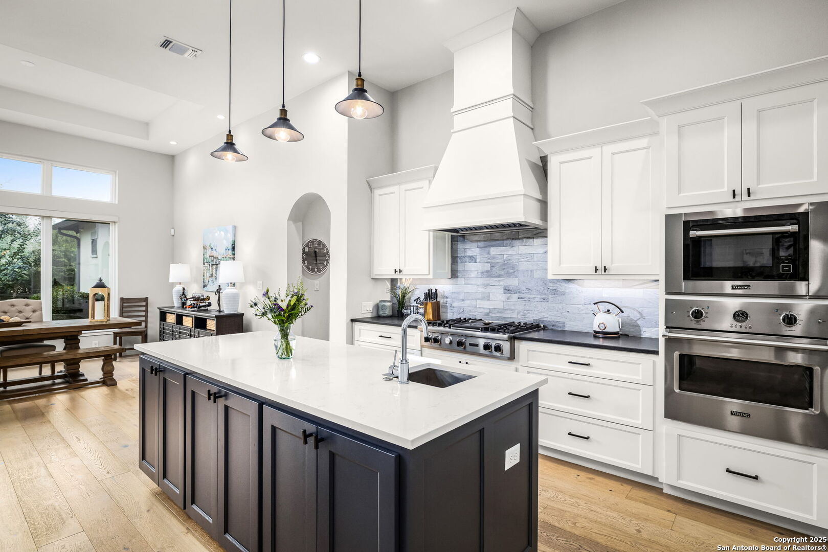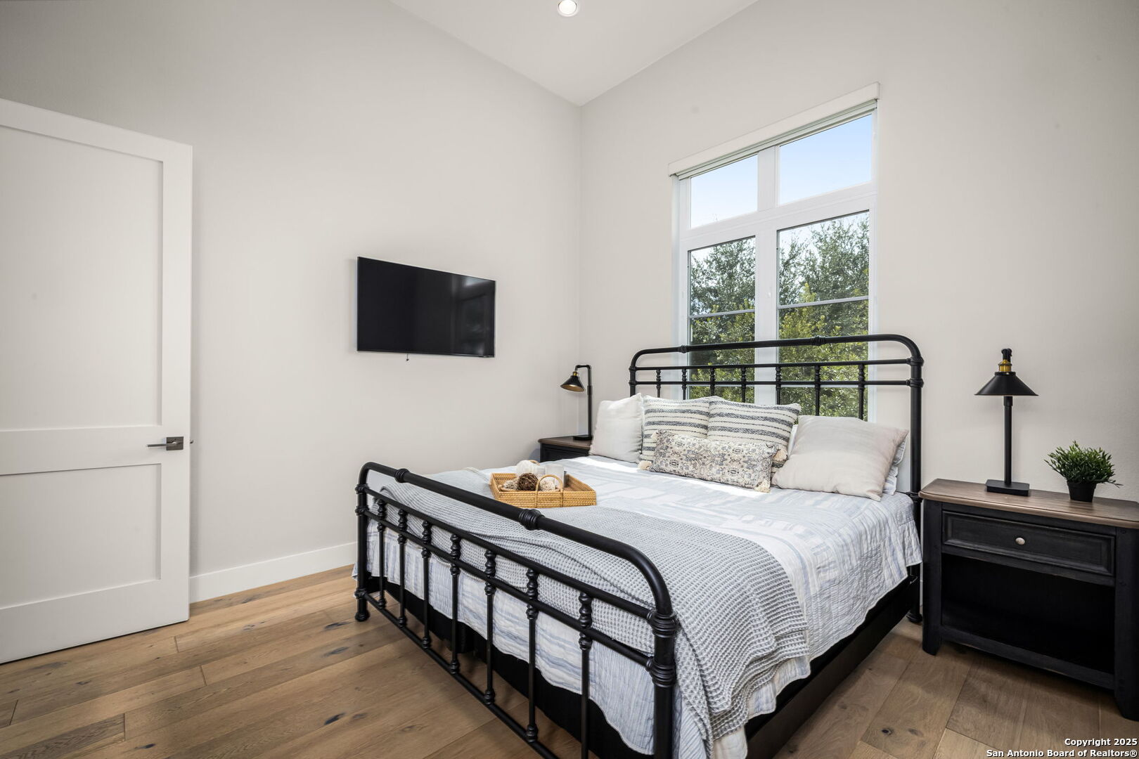 Hill Country Living, Elevated! Luxury and modern touches come together in this custom one-story home in Vintage Oaks. Behind the iron and glass pivot door, white oak floors flow through an open design where a stone fireplace, wood beams, and retractable glass doors create a seamless blend of indoor and outdoor living. The chef's kitchen impresses with Viking appliances, dual islands, and abundant cabinetry, while the master retreat offers private outdoor access and a spa-like bath featuring a walk-through shower, marble accents and soaking tub. A guest suite and Jack-and-Jill bedrooms ensure comfort for family and friends. Outdoors, enjoy a covered patio with fireplace and grill, a fully landscaped yard, and an oversized three-car garage. From quiet mornings to evenings under the Hill Country sky, this home invites you to embrace a lifestyle of beauty and ease.