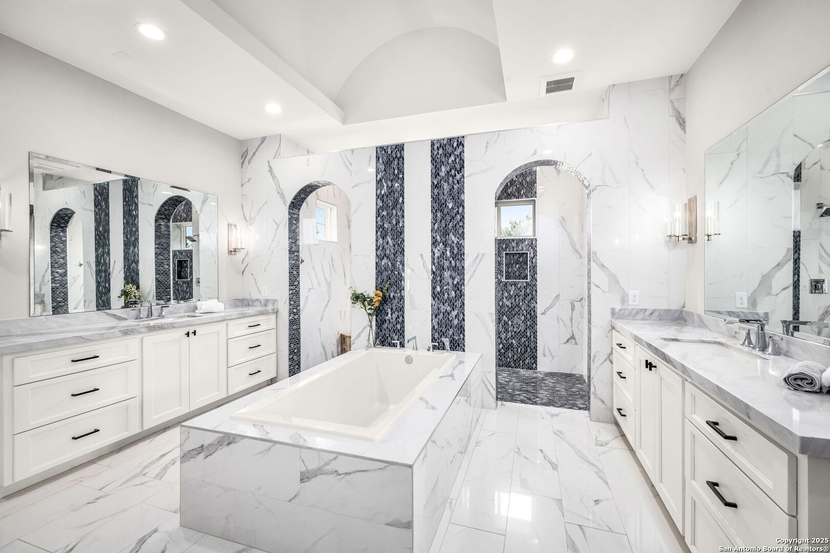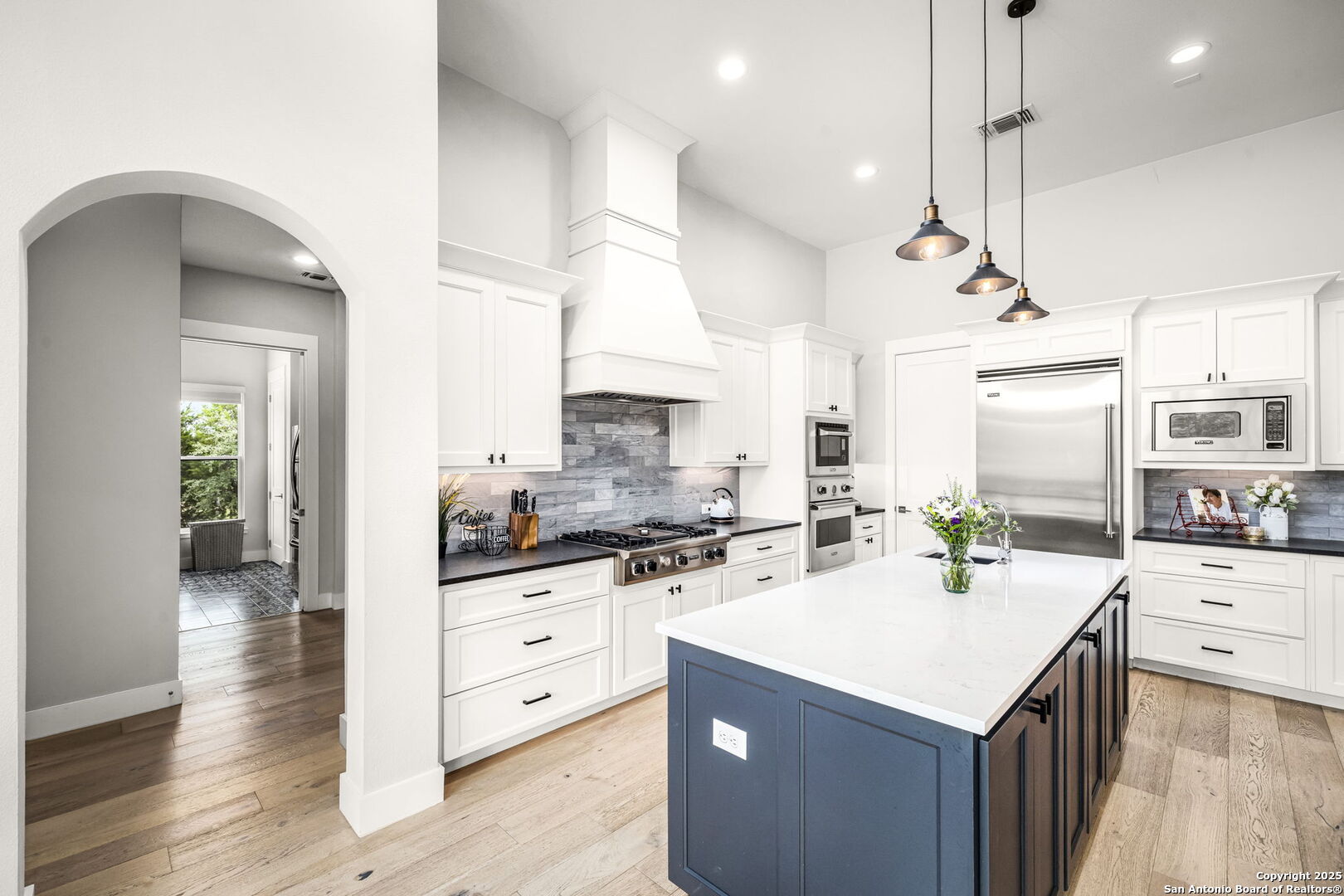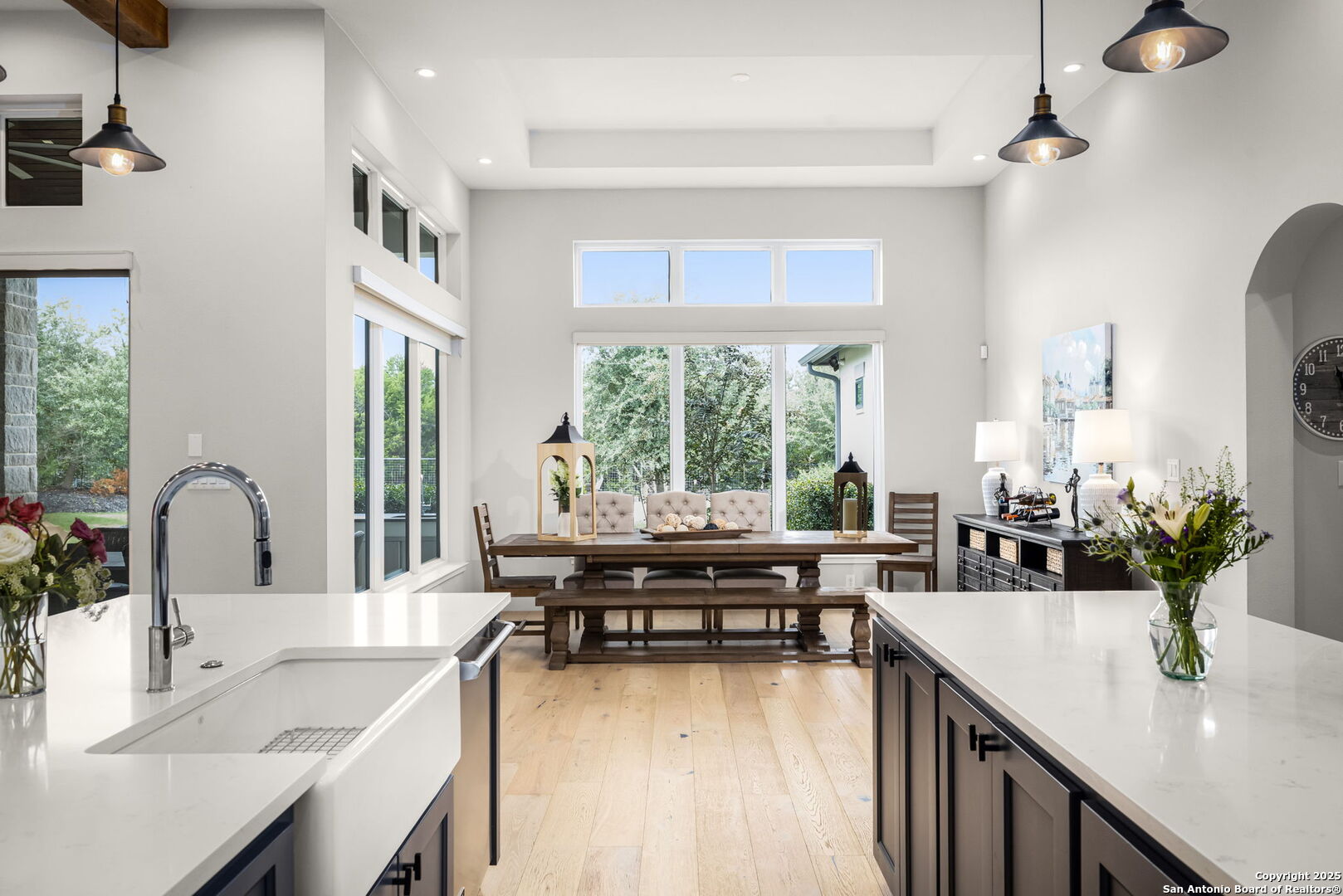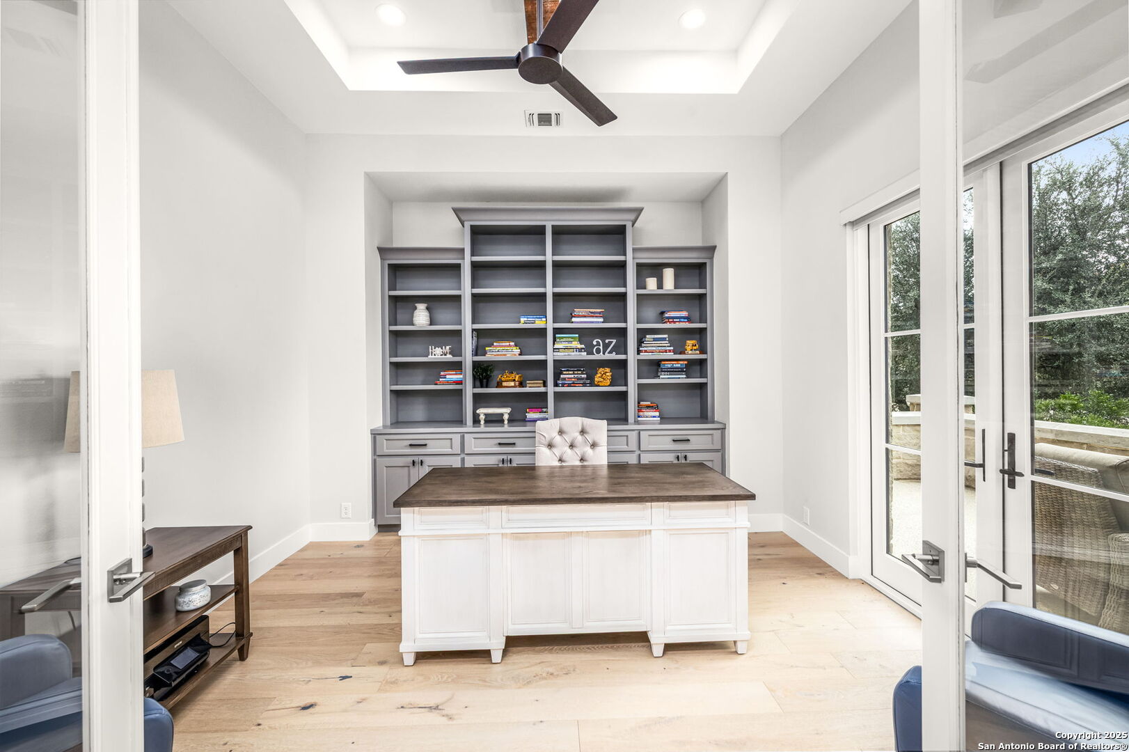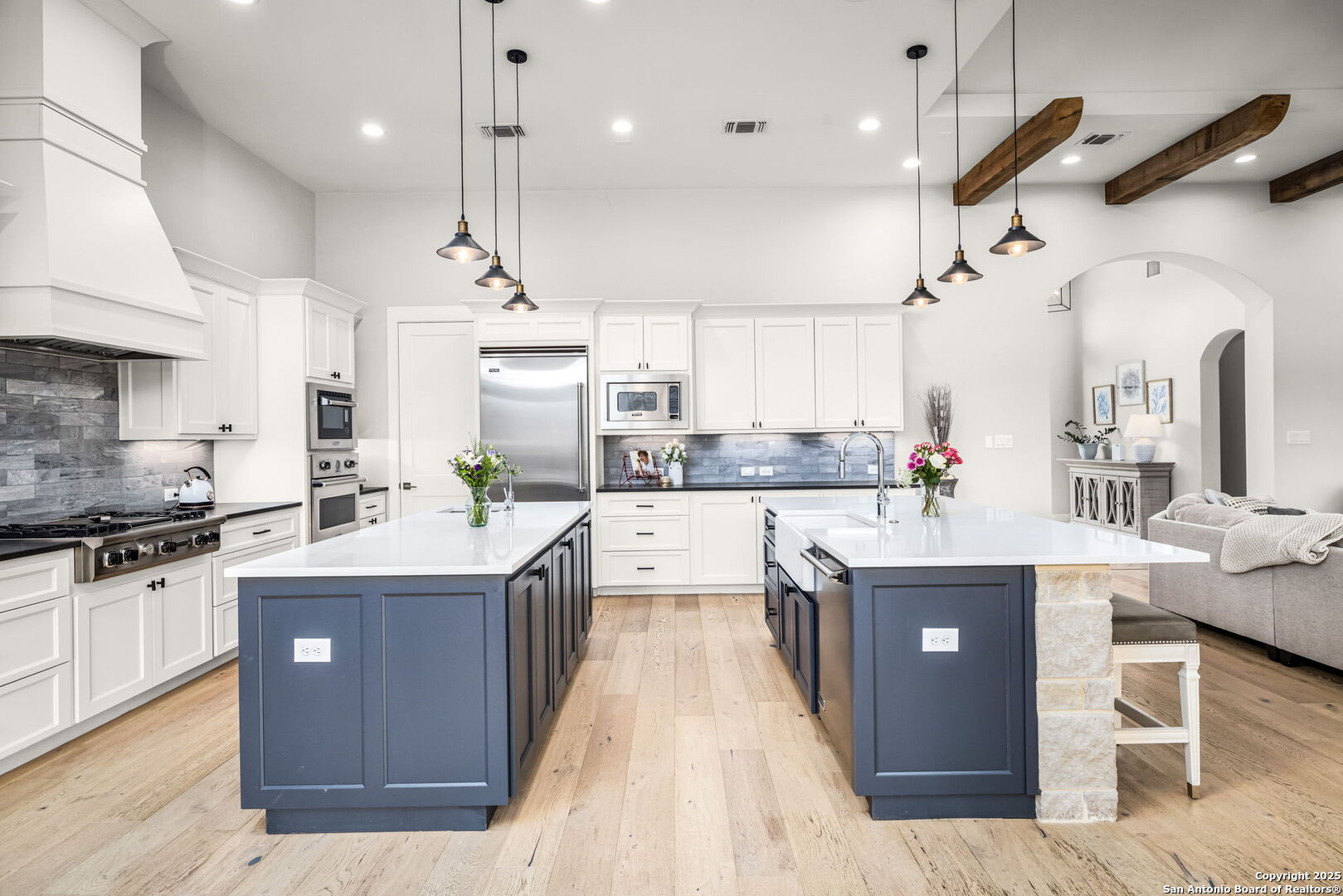 Hill Country Living, Elevated! Luxury and modern touches come together in this custom one-story home in Vintage Oaks. Behind the iron and glass pivot door, white oak floors flow through an open design where a stone fireplace, wood beams, and retractable glass doors create a seamless blend of indoor and outdoor living. The chef's kitchen impresses with Viking appliances, dual islands, and abundant cabinetry, while the master retreat offers private outdoor access and a spa-like bath featuring a walk-through shower, marble accents and soaking tub. A guest suite and Jack-and-Jill bedrooms ensure comfort for family and friends. Outdoors, enjoy a covered patio with fireplace and grill, a fully landscaped yard, and an oversized three-car garage. From quiet mornings to evenings under the Hill Country sky, this home invites you to embrace a lifestyle of beauty and ease.