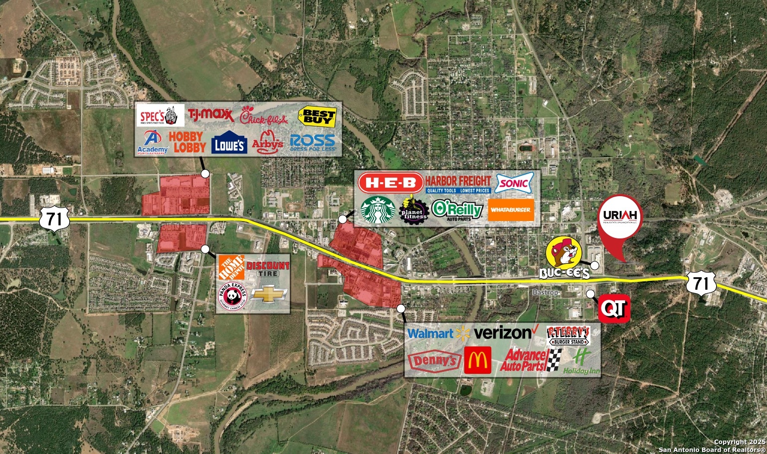 One of three parcels, 2.159 AC out of approximately 7.24 acres in Bastrop, TX. This prime site offers direct Highway 71 E frontage and sits adjacent to Buc-ee's, making it a strategic location for development. The property supports a variety of high-density residential and institutional uses, including single-family detached, duplexes, triplexes, townhomes, multifamily apartments, nursing homes, and assisted living facilities. Thoughtful transitions between land uses are encouraged, with opportunities for planned developments incorporating parks, trails, schools, and public services. Additionally, the site is near key economic hubs such as 552 Movie Studio, The Boring Company, SpaceX, and Starlink's headquarters, further enhancing its investment potential.