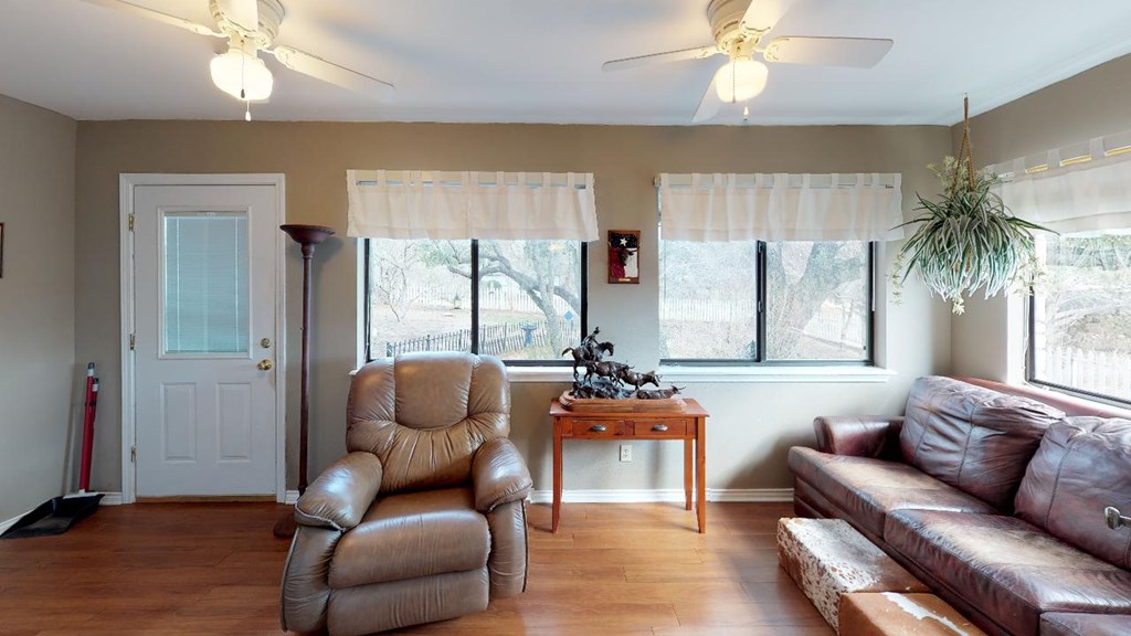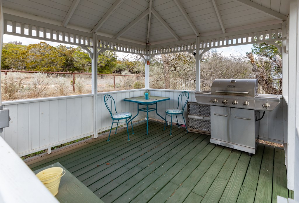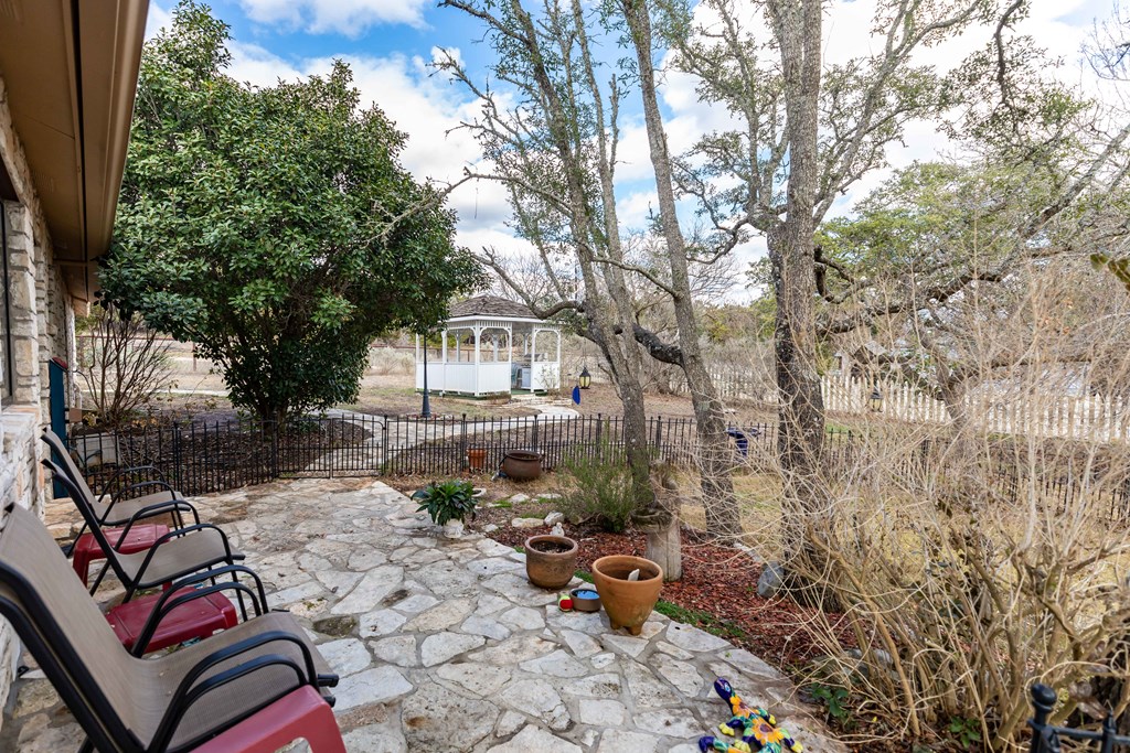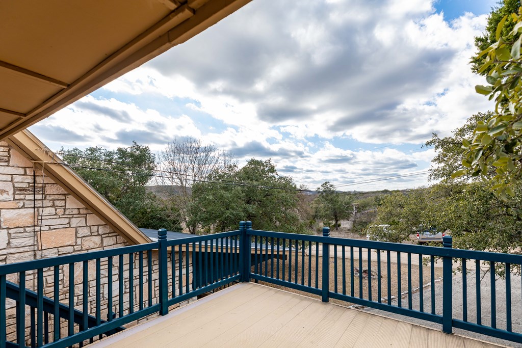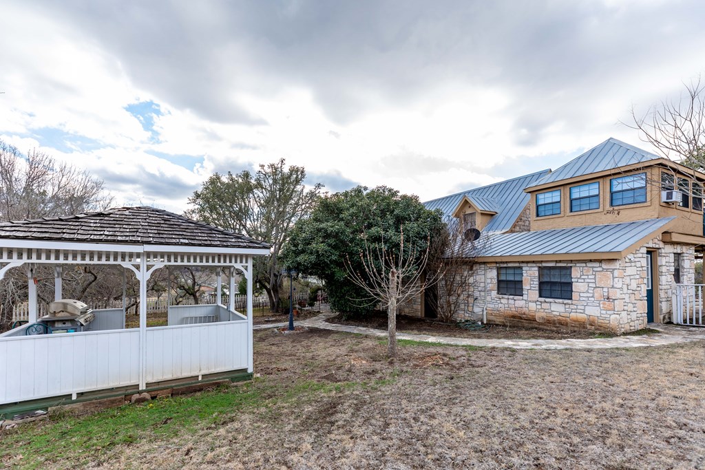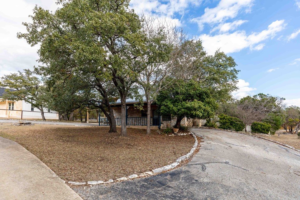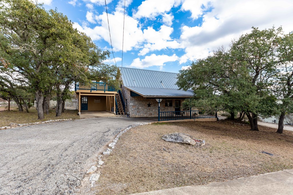 This Hill Country home is ideal for full-time living or vacation getaway! Located in a quiet neighborhood away from traffic, this 3BR/2.5BA offers warmth and personality throughout. Driveway leads to covered front entry & open living with fireplace/dining/galley kitchen. Master BR down has bath and 2 walk-in closets & two secondary BRs upstairs are connected by sitting area w/built-ins. Sunroom at back opens to fenced yard w/gazebo & entertaining space. Separate downstairs guest room and bath opens to 1 car carport. Stairs from carport lead to studio w/lots of natural light & a large deck. Both are climate controlled. Ownership includes interest in river park. Maintenance fees pay for trash pick-up & water. Square footage is approximate.