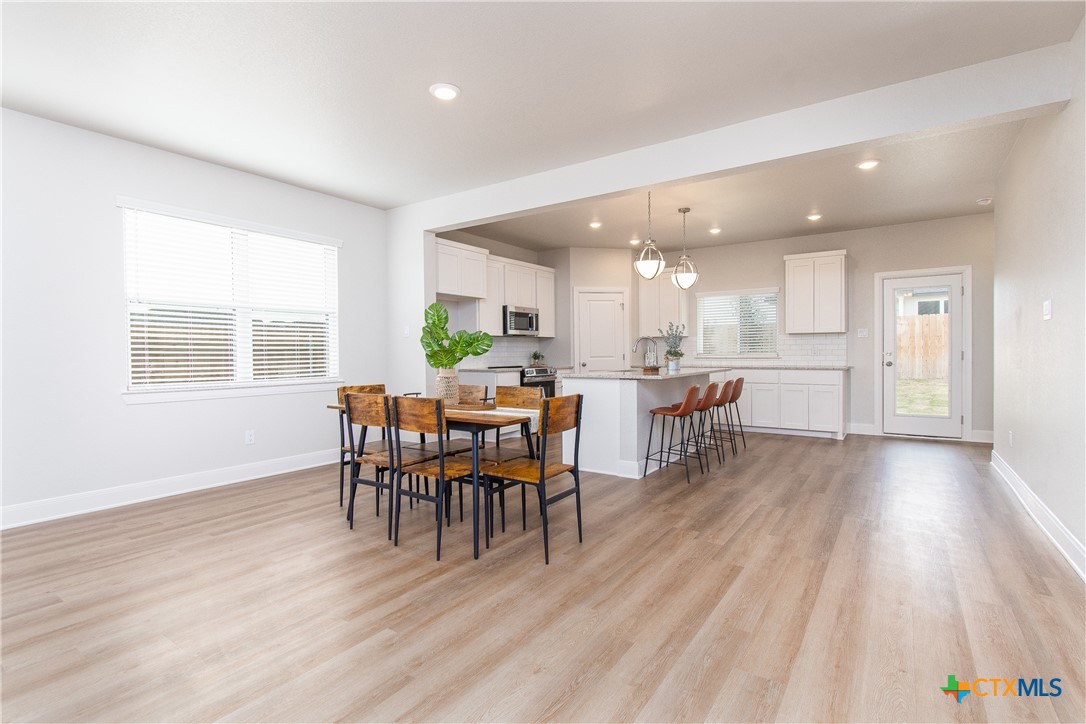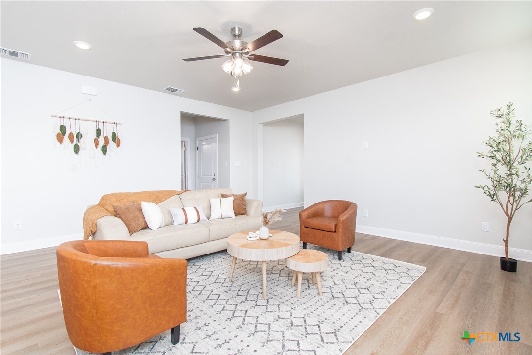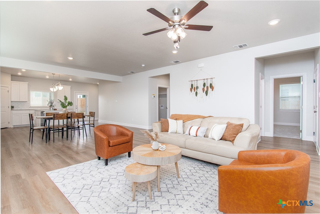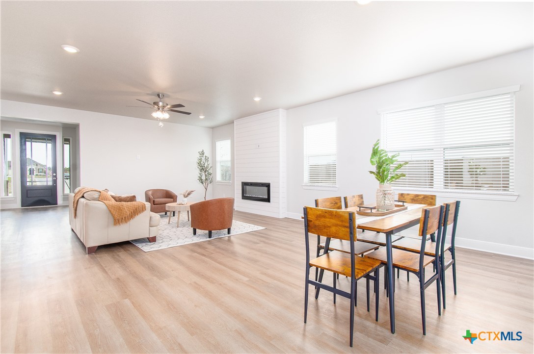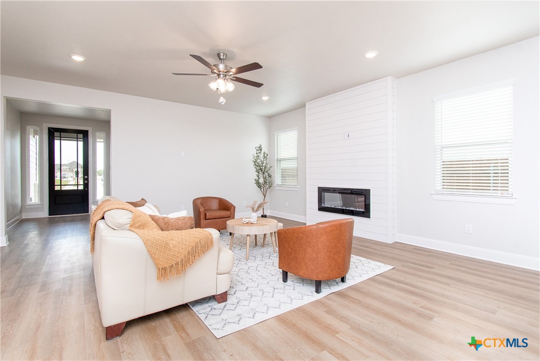 This stunning new construction home features a harmonious blend of modern design and functional living, showcased through its neutral color palette that enhances the airy feel throughout. The spacious layout includes three inviting bedrooms and a dedicated office or study, ideal for work or leisure. The master suite boasts a generous walk-in closet that conveniently connects to the laundry room, adding ease to daily routines. A cozy electric fireplace serves as a focal point in the living area, while the nice-sized covered patio and charming front porch provide perfect spots for relaxation and entertaining. This home is designed to meet the needs of contemporary living with style and comfort.