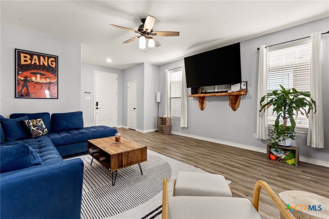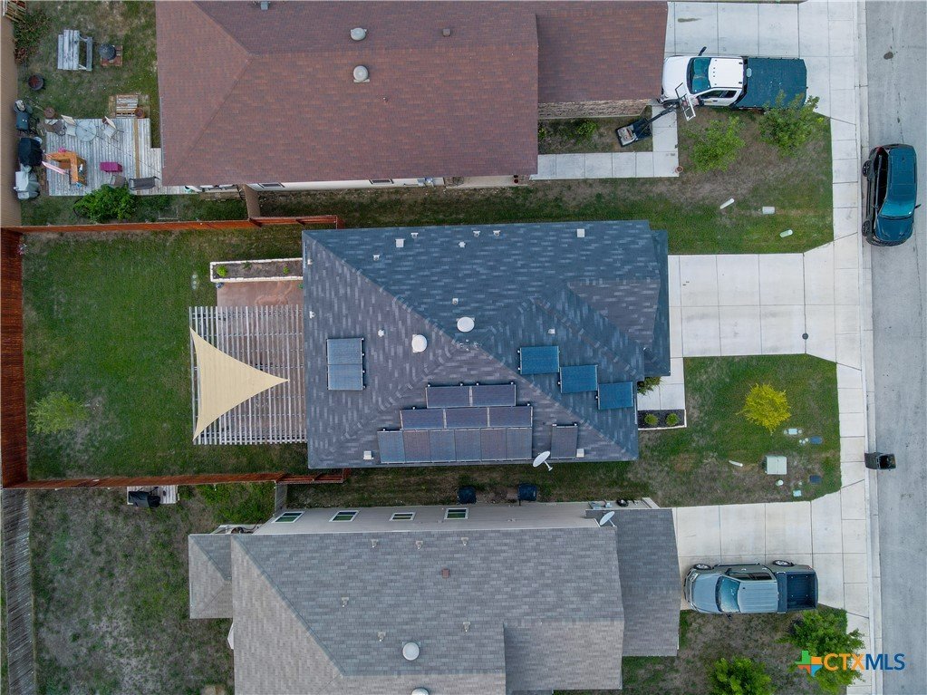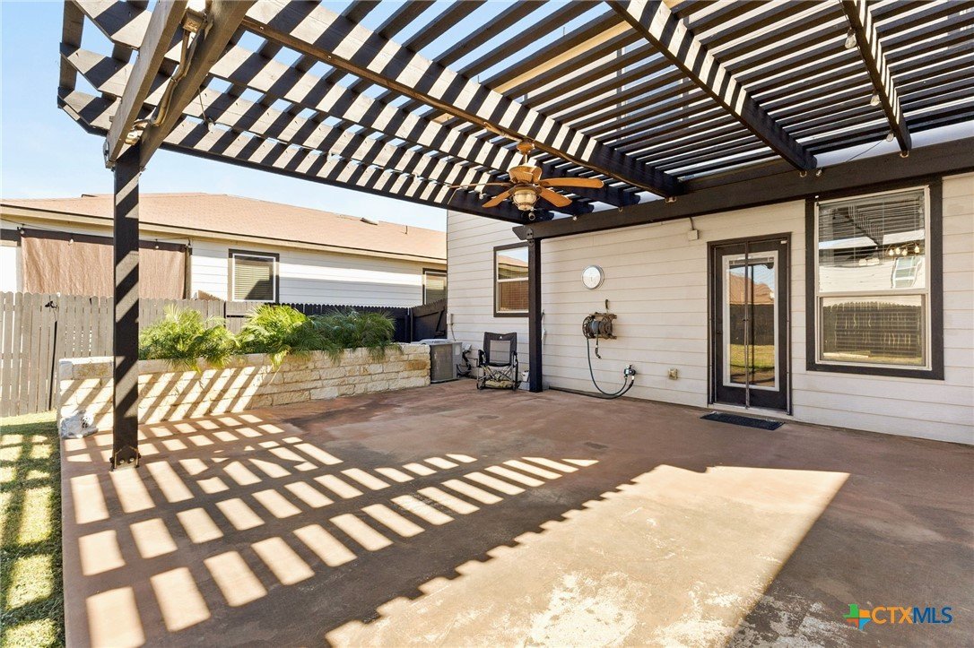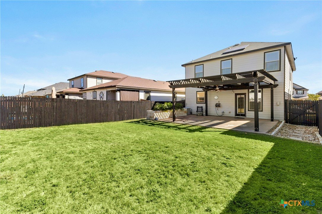Nestled in the desirable West Village at Creekside, this beautiful two-story home offers a perfect blend of comfort, style, and energy efficiency. Featuring 3 spacious bedrooms, 2.5 bathrooms, and thoughtfully designed living spaces, it’s ideal for both relaxation and entertaining. Downstairs, you’ll find a welcoming living room anchored by a custom handmade mantel on the entertainment wall. The large kitchen includes generous counter space, a tile backsplash and accent wall, plus a seamless flow into the dining area—perfect for everyday living and hosting. A convenient laundry room/pantry completes the downstairs layout. Upstairs, a versatile flex space offers endless possibilities as a game room, additional living area, or home office. All three bedrooms are generously sized, with the primary suite featuring a spacious bathroom complete with double vanity, separate shower, garden tub, and an expansive walk-in closet. Step outside to enjoy a freshly painted backyard fence, extended patio with pergola, and a charming stone flower box. The large backyard provides plenty of room for outdoor entertaining or gardening. The stucco exterior gives the home timeless curb appeal, while owned solar panels provide valuable energy savings for the new owners. A wonderful opportunity in a sought-after New Braunfels location—close to shopping, dining, and easy access to I-35.