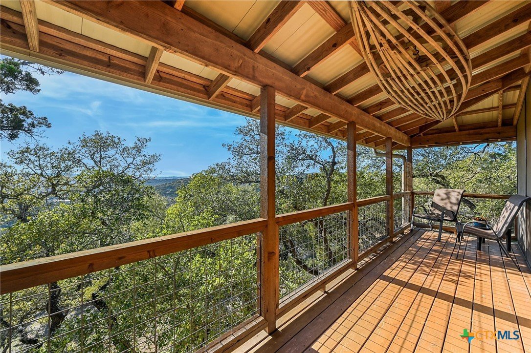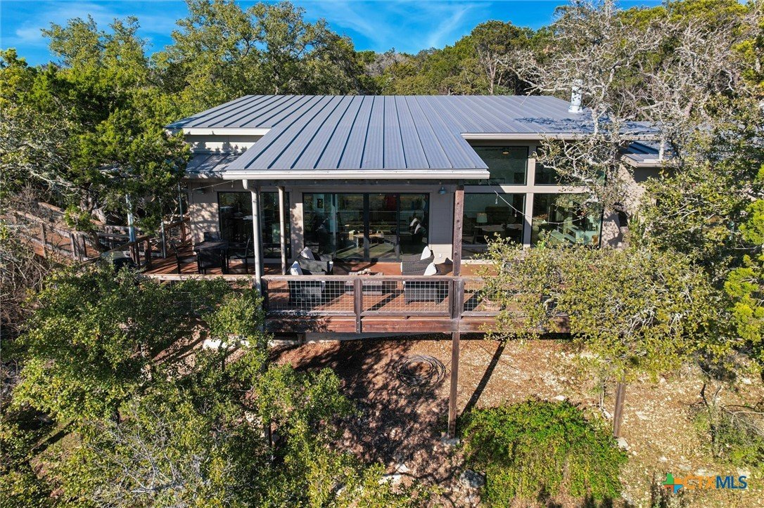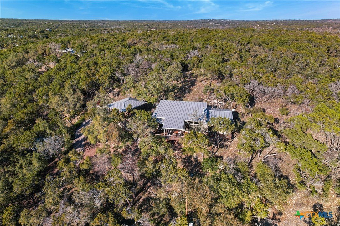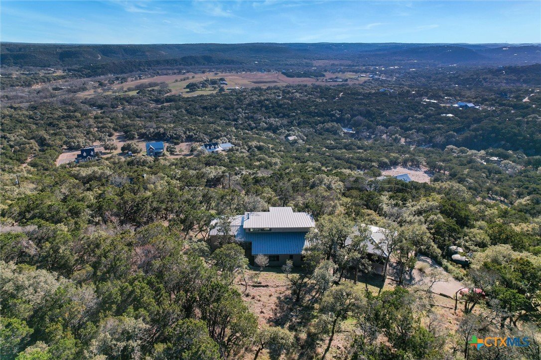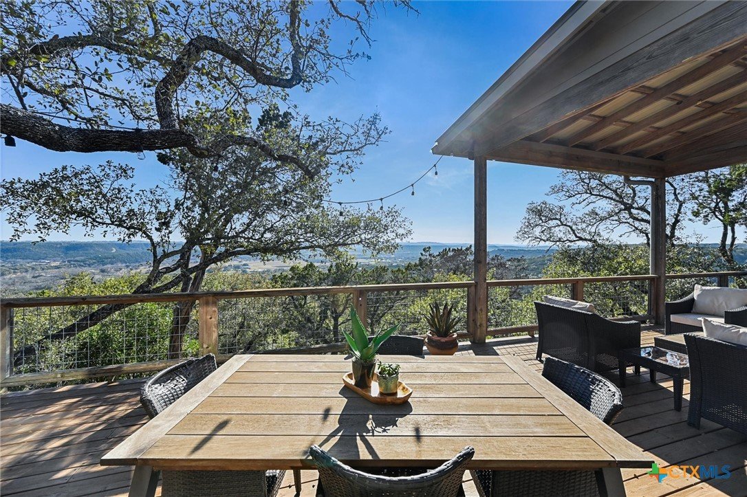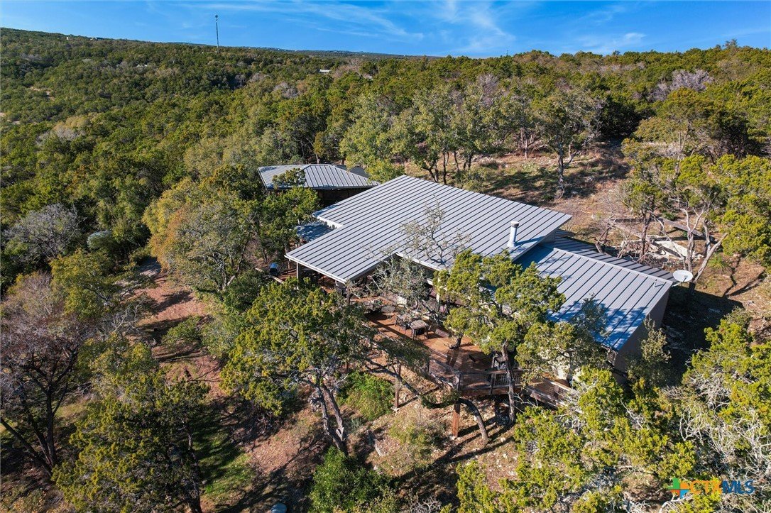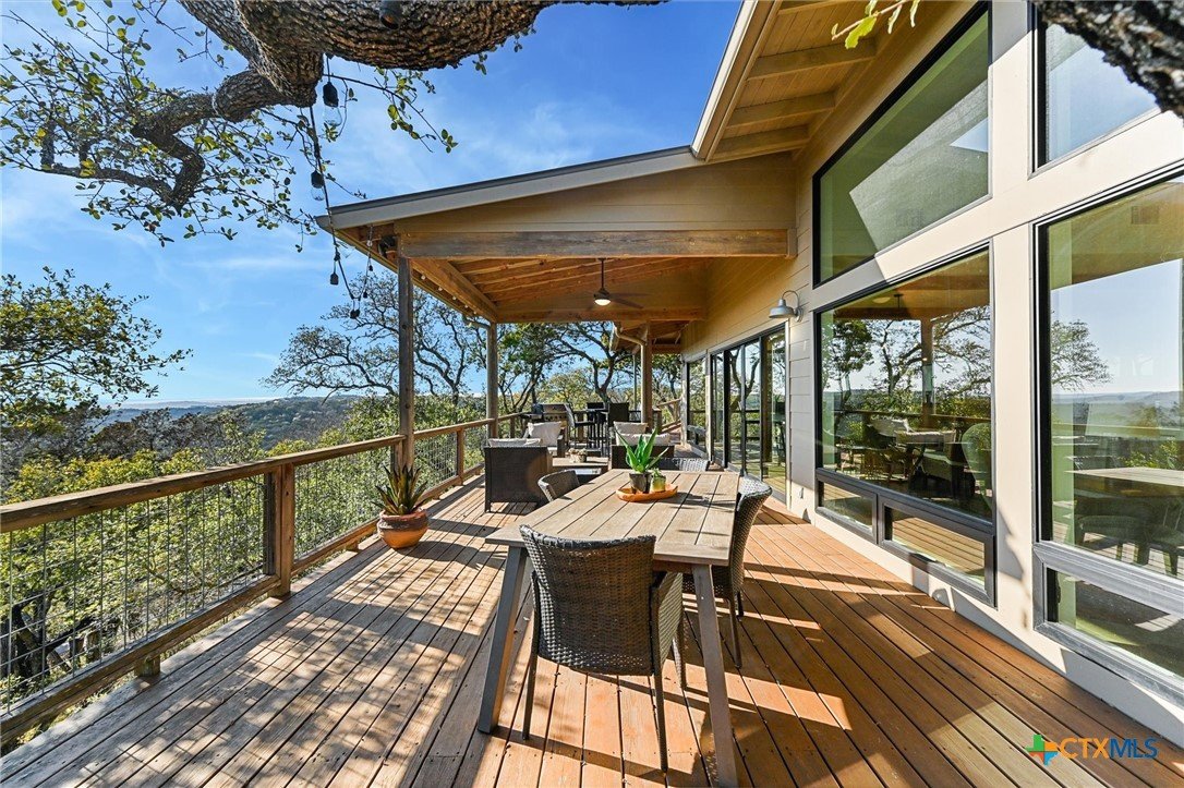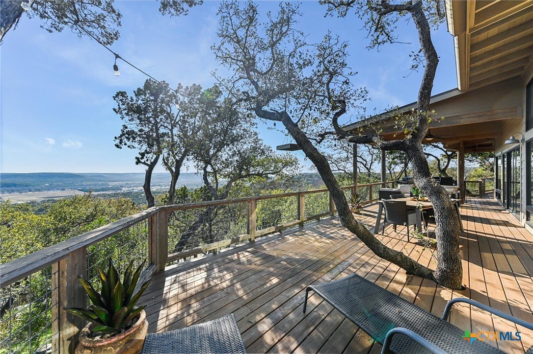 Discover Hill Country living at its finest with this stunning modern custom home, perfectly situated in the heart of the Texas Hill Country. Designed with exquisite craftsmanship and high-end aesthetics, this one-of-a-kind retreat offers breathtaking long-distance sunset views overlooking the Wimberley Valley and Devil’s Backbone. Exceptional Features: Hill Country Modern Design with a standing seam metal roof; Expansive 1,100 sq. ft. deck for seamless outdoor entertaining; Elevated bridge walkway leading to a spacious screened-in area above the detached carport; Light-filled interior with high-definition Coretec flooring and sloped ceilings; Gourmet kitchen featuring custom painted maple cabinetry, granite counters, and KitchenAid stainless steel appliances; Wet bar and wood-burning fireplace in the living area for cozy gatherings; Energy-efficient dark bronze Low-E RAM windows & spray foam insulation; Luxury finishes including Kohler plumbing fixtures; Steel driveway gate with opener for added privacy. Outdoor Paradise includes: Nestled on 1.83+/- acres among majestic live oaks and Hill Country wildlife; Professionally landscaped grounds with a 20,000-gallon rainwater collection system; Private backyard firepit with native rock walls and cedar accent columns; 12’ x 12’ detached flex space with a Mitsubishi split system—perfect for a gym, office, or studio. Just minutes from Downtown Wimberley, offering quaint shops, dining, and entertainment. This home is a true Hill Country gem, offering a rare blend of privacy, luxury, and natural beauty. Don’t miss this incredible opportunity—schedule your private showing today!