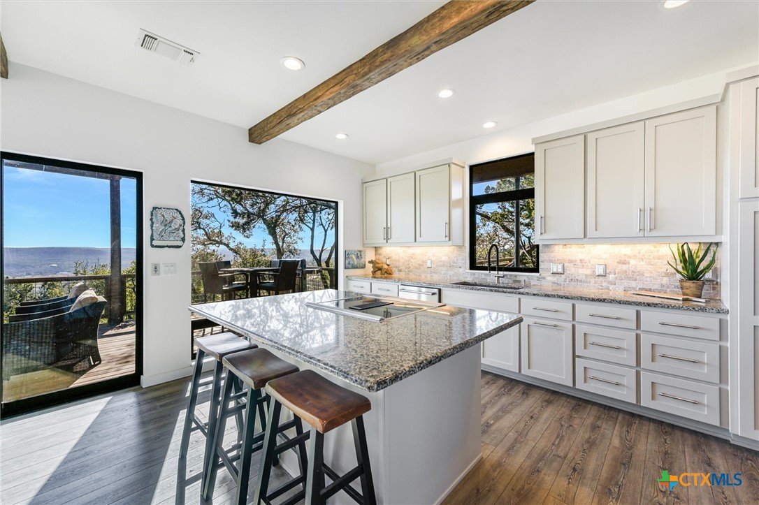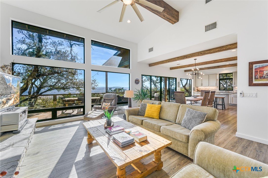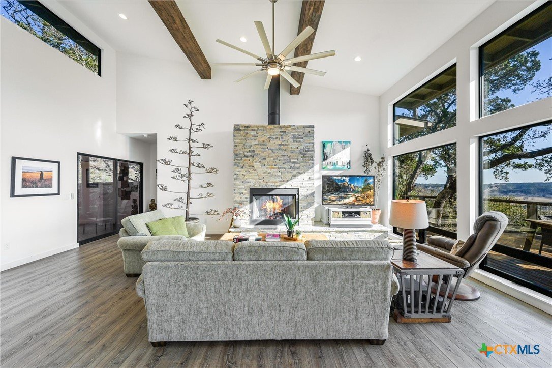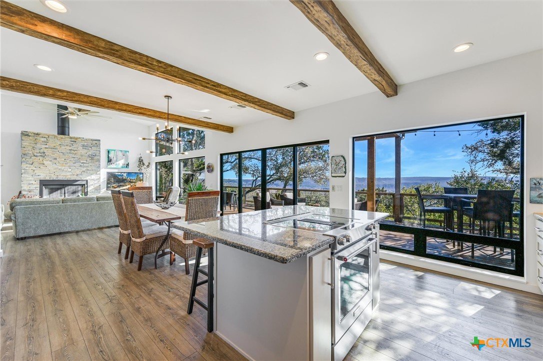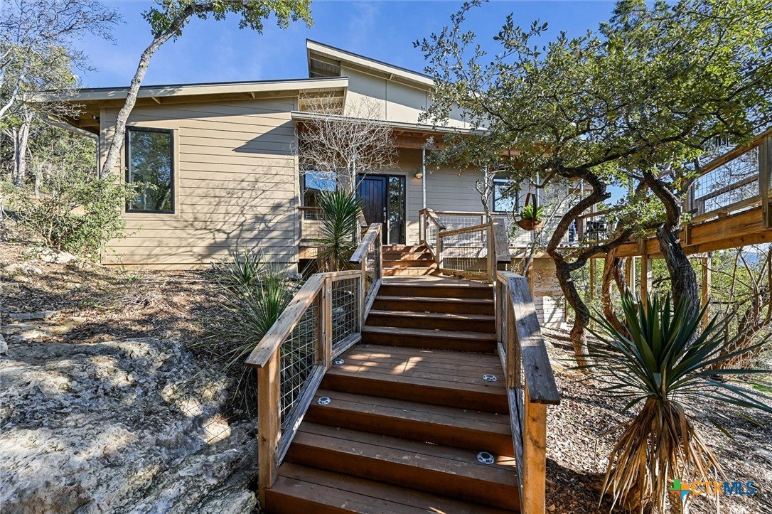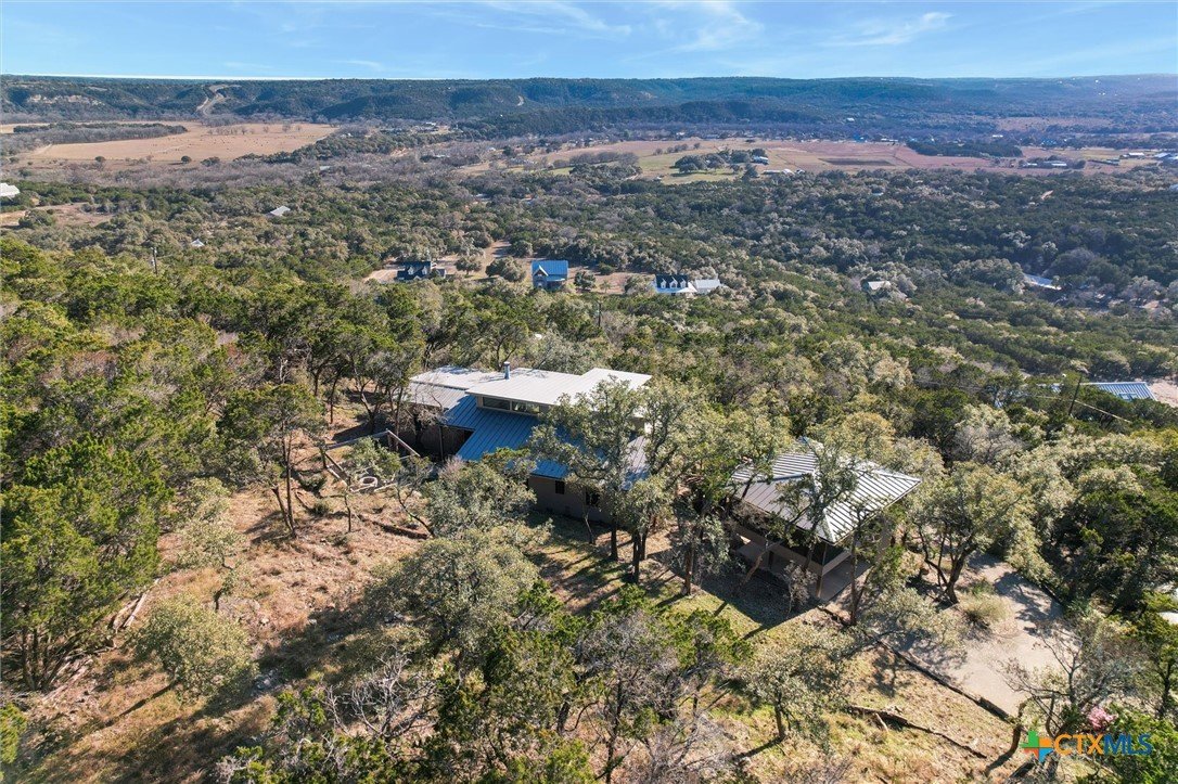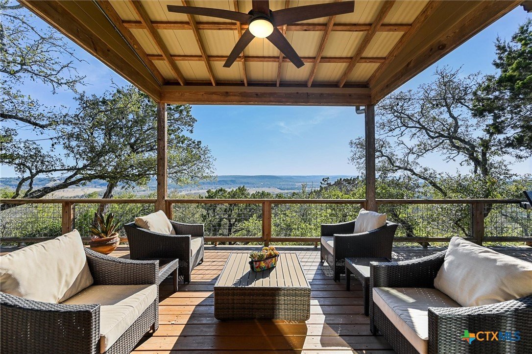 Discover Hill Country living at its finest with this stunning modern custom home, perfectly situated in the heart of the Texas Hill Country. Designed with exquisite craftsmanship and high-end aesthetics, this one-of-a-kind retreat offers breathtaking long-distance sunset views overlooking the Wimberley Valley and Devil’s Backbone. Exceptional Features: Hill Country Modern Design with a standing seam metal roof; Expansive 1,100 sq. ft. deck for seamless outdoor entertaining; Elevated bridge walkway leading to a spacious screened-in area above the detached carport; Light-filled interior with high-definition Coretec flooring and sloped ceilings; Gourmet kitchen featuring custom painted maple cabinetry, granite counters, and KitchenAid stainless steel appliances; Wet bar and wood-burning fireplace in the living area for cozy gatherings; Energy-efficient dark bronze Low-E RAM windows & spray foam insulation; Luxury finishes including Kohler plumbing fixtures; Steel driveway gate with opener for added privacy. Outdoor Paradise includes: Nestled on 1.83+/- acres among majestic live oaks and Hill Country wildlife; Professionally landscaped grounds with a 20,000-gallon rainwater collection system; Private backyard firepit with native rock walls and cedar accent columns; 12’ x 12’ detached flex space with a Mitsubishi split system—perfect for a gym, office, or studio. Just minutes from Downtown Wimberley, offering quaint shops, dining, and entertainment. This home is a true Hill Country gem, offering a rare blend of privacy, luxury, and natural beauty. Don’t miss this incredible opportunity—schedule your private showing today!