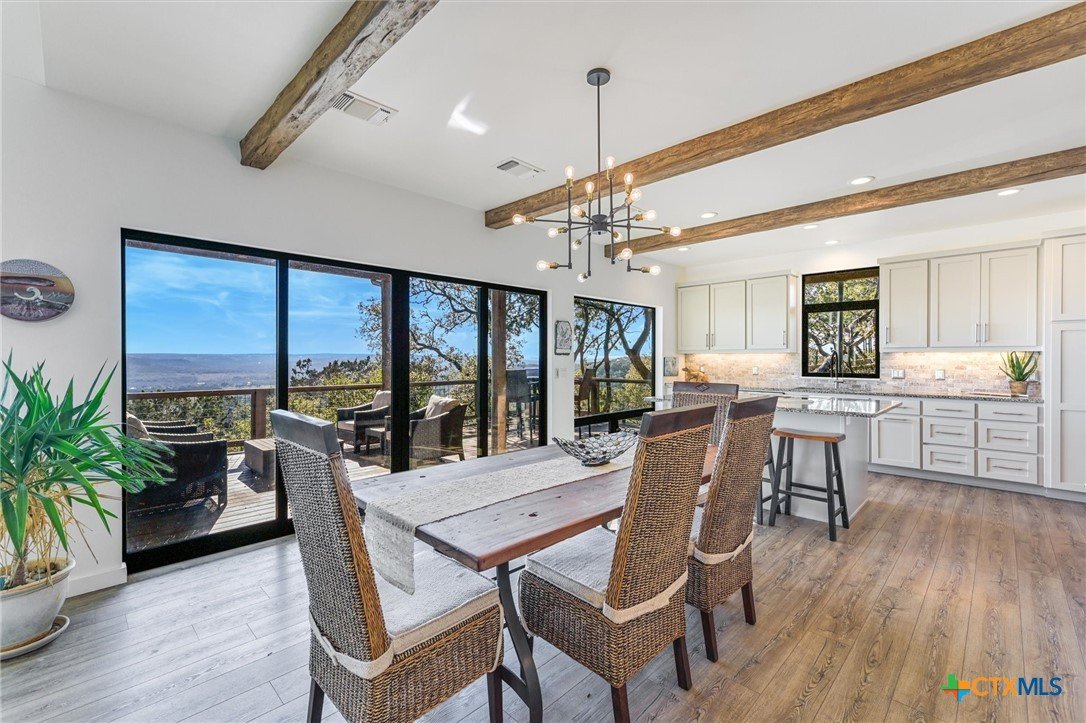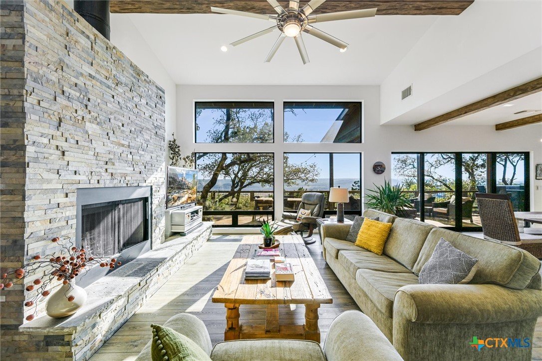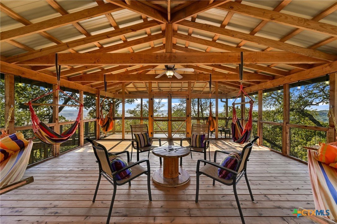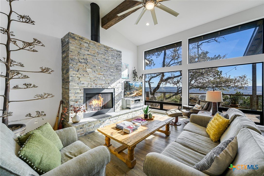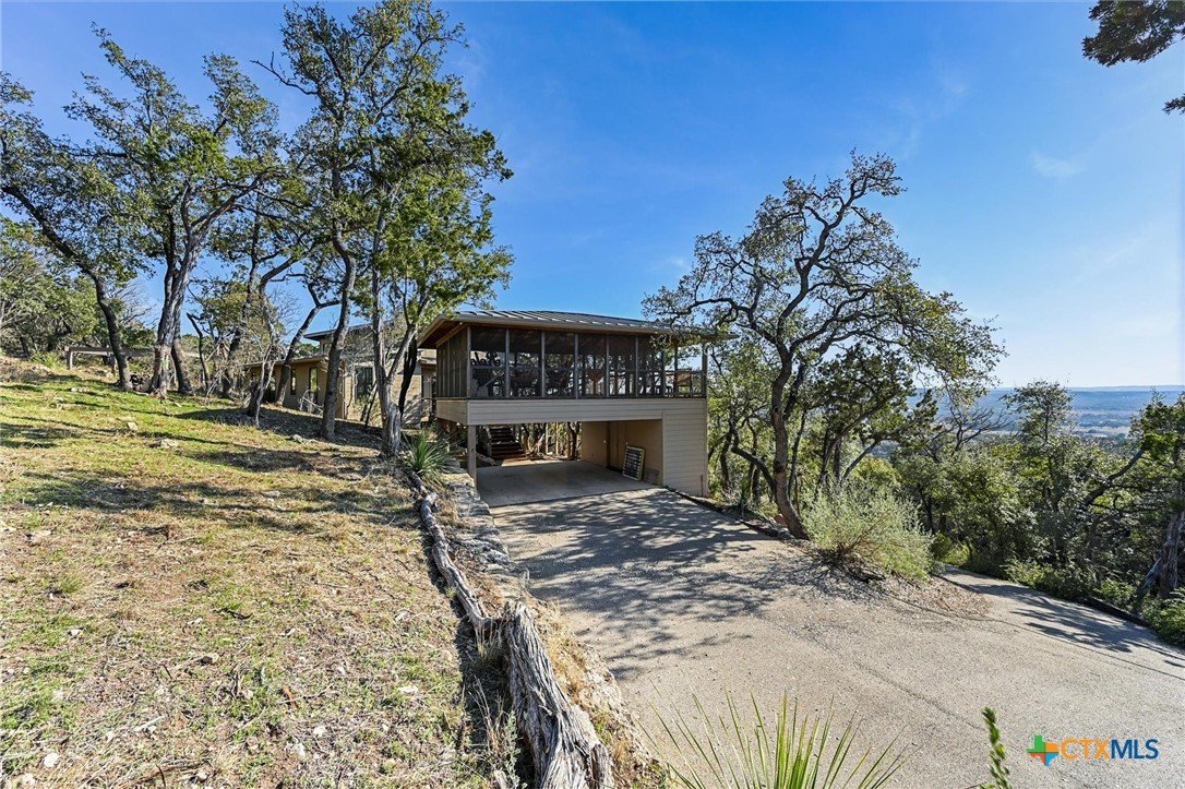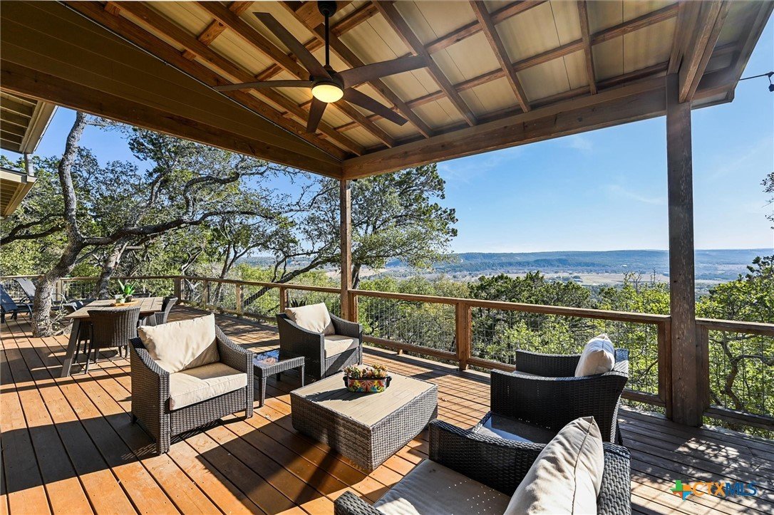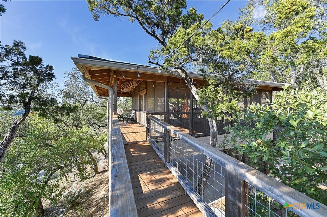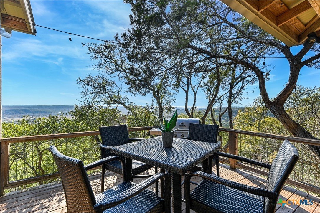 Discover Hill Country living at its finest with this stunning modern custom home, perfectly situated in the heart of the Texas Hill Country. Designed with exquisite craftsmanship and high-end aesthetics, this one-of-a-kind retreat offers breathtaking long-distance sunset views overlooking the Wimberley Valley and Devil’s Backbone. Exceptional Features: Hill Country Modern Design with a standing seam metal roof; Expansive 1,100 sq. ft. deck for seamless outdoor entertaining; Elevated bridge walkway leading to a spacious screened-in area above the detached carport; Light-filled interior with high-definition Coretec flooring and sloped ceilings; Gourmet kitchen featuring custom painted maple cabinetry, granite counters, and KitchenAid stainless steel appliances; Wet bar and wood-burning fireplace in the living area for cozy gatherings; Energy-efficient dark bronze Low-E RAM windows & spray foam insulation; Luxury finishes including Kohler plumbing fixtures; Steel driveway gate with opener for added privacy. Outdoor Paradise includes: Nestled on 1.83+/- acres among majestic live oaks and Hill Country wildlife; Professionally landscaped grounds with a 20,000-gallon rainwater collection system; Private backyard firepit with native rock walls and cedar accent columns; 12’ x 12’ detached flex space with a Mitsubishi split system—perfect for a gym, office, or studio. Just minutes from Downtown Wimberley, offering quaint shops, dining, and entertainment. This home is a true Hill Country gem, offering a rare blend of privacy, luxury, and natural beauty. Don’t miss this incredible opportunity—schedule your private showing today!
