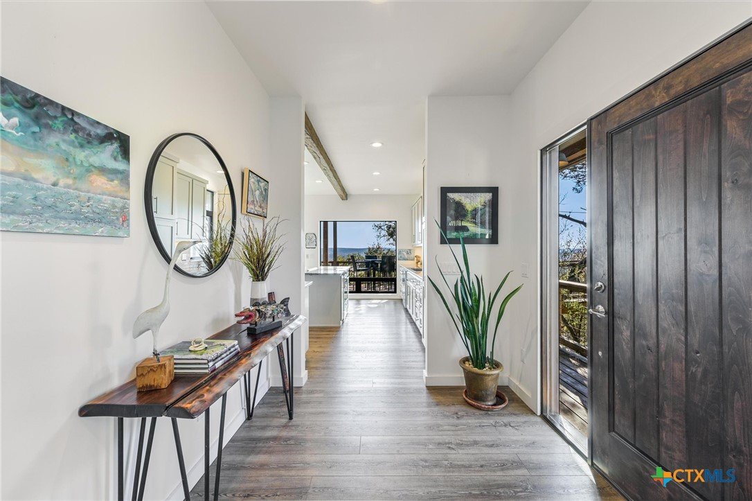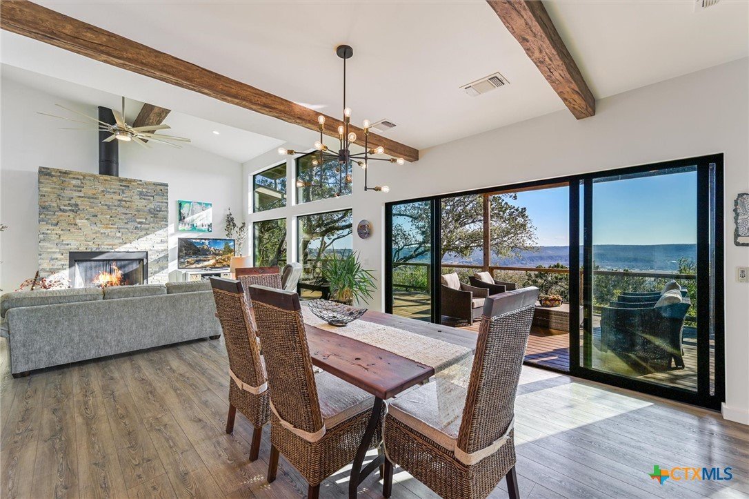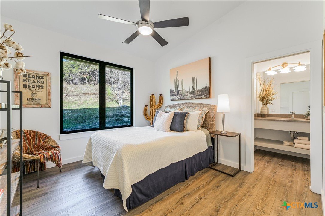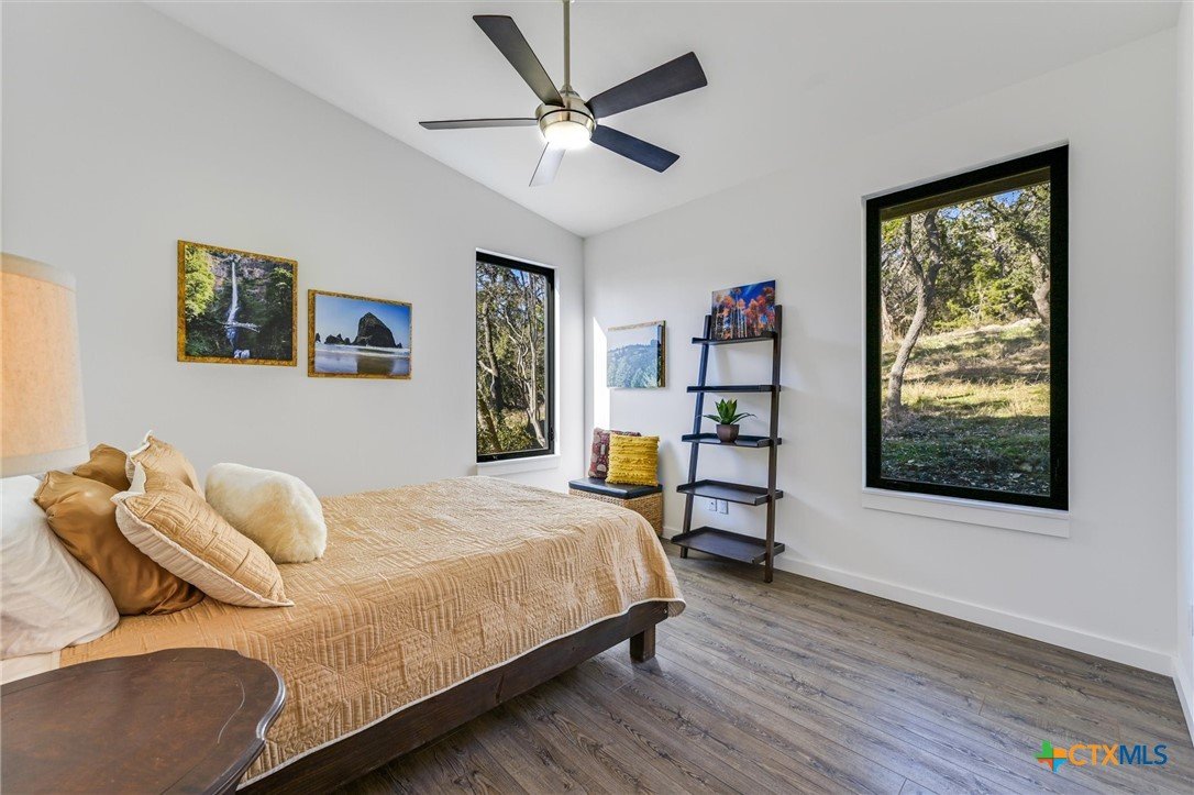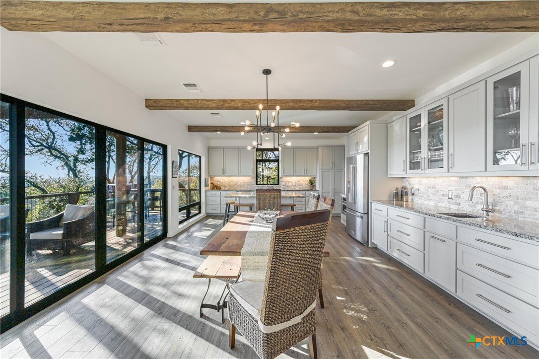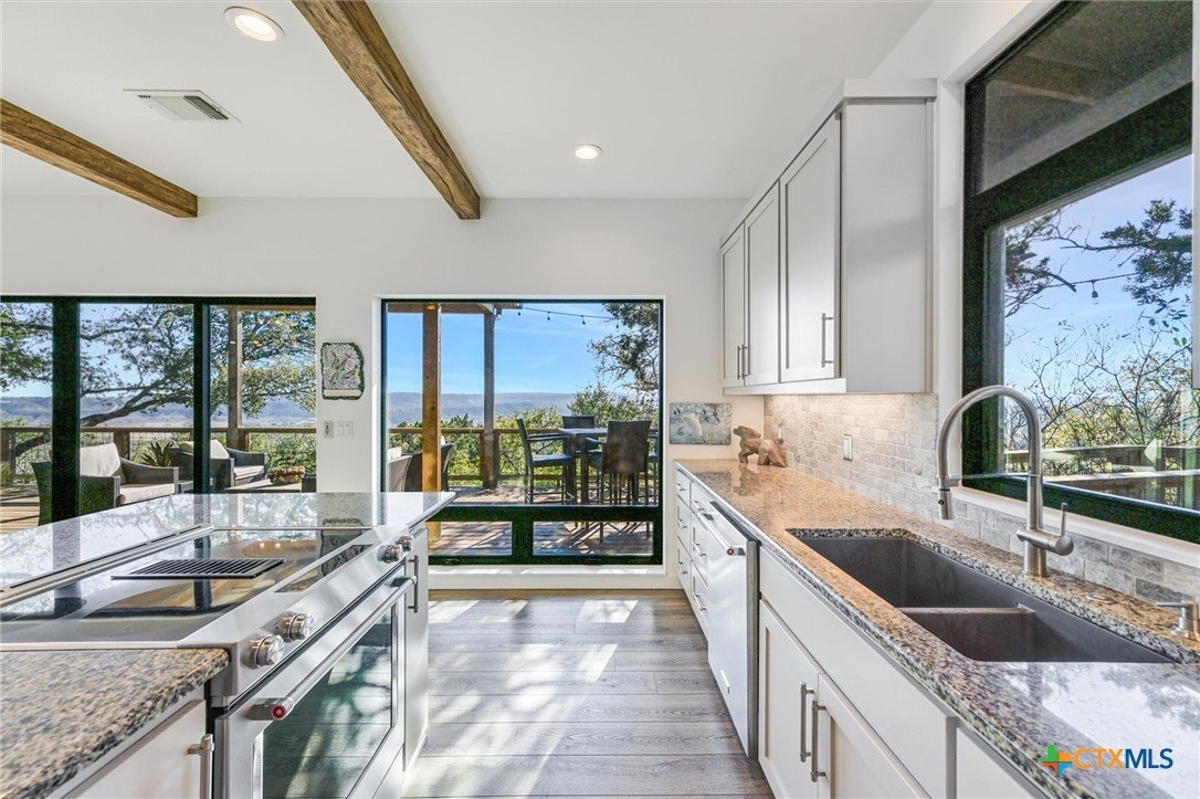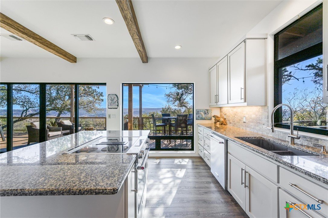 Discover Hill Country living at its finest with this stunning modern custom home, perfectly situated in the heart of the Texas Hill Country. Designed with exquisite craftsmanship and high-end aesthetics, this one-of-a-kind retreat offers breathtaking long-distance sunset views overlooking the Wimberley Valley and Devil’s Backbone. Exceptional Features: Hill Country Modern Design with a standing seam metal roof; Expansive 1,100 sq. ft. deck for seamless outdoor entertaining; Elevated bridge walkway leading to a spacious screened-in area above the detached carport; Light-filled interior with high-definition Coretec flooring and sloped ceilings; Gourmet kitchen featuring custom painted maple cabinetry, granite counters, and KitchenAid stainless steel appliances; Wet bar and wood-burning fireplace in the living area for cozy gatherings; Energy-efficient dark bronze Low-E RAM windows & spray foam insulation; Luxury finishes including Kohler plumbing fixtures; Steel driveway gate with opener for added privacy. Outdoor Paradise includes: Nestled on 1.83+/- acres among majestic live oaks and Hill Country wildlife; Professionally landscaped grounds with a 20,000-gallon rainwater collection system; Private backyard firepit with native rock walls and cedar accent columns; 12’ x 12’ detached flex space with a Mitsubishi split system—perfect for a gym, office, or studio. Just minutes from Downtown Wimberley, offering quaint shops, dining, and entertainment. This home is a true Hill Country gem, offering a rare blend of privacy, luxury, and natural beauty. Don’t miss this incredible opportunity—schedule your private showing today!