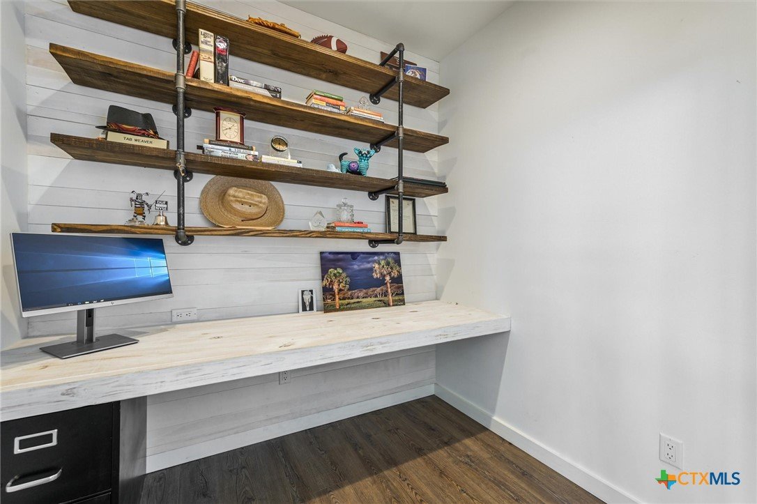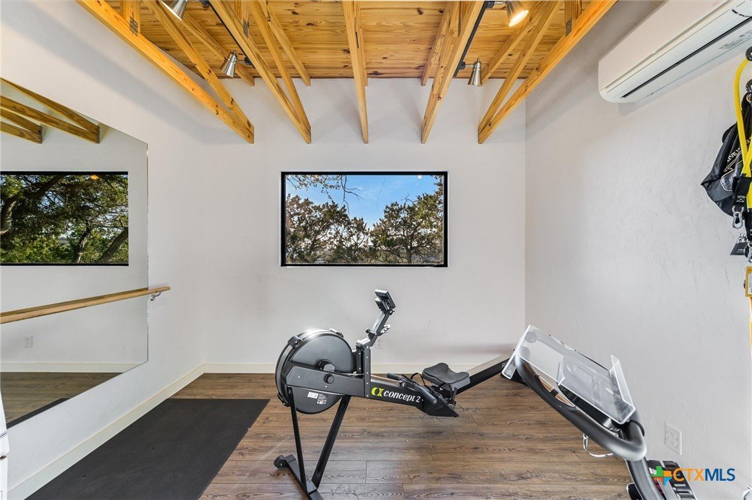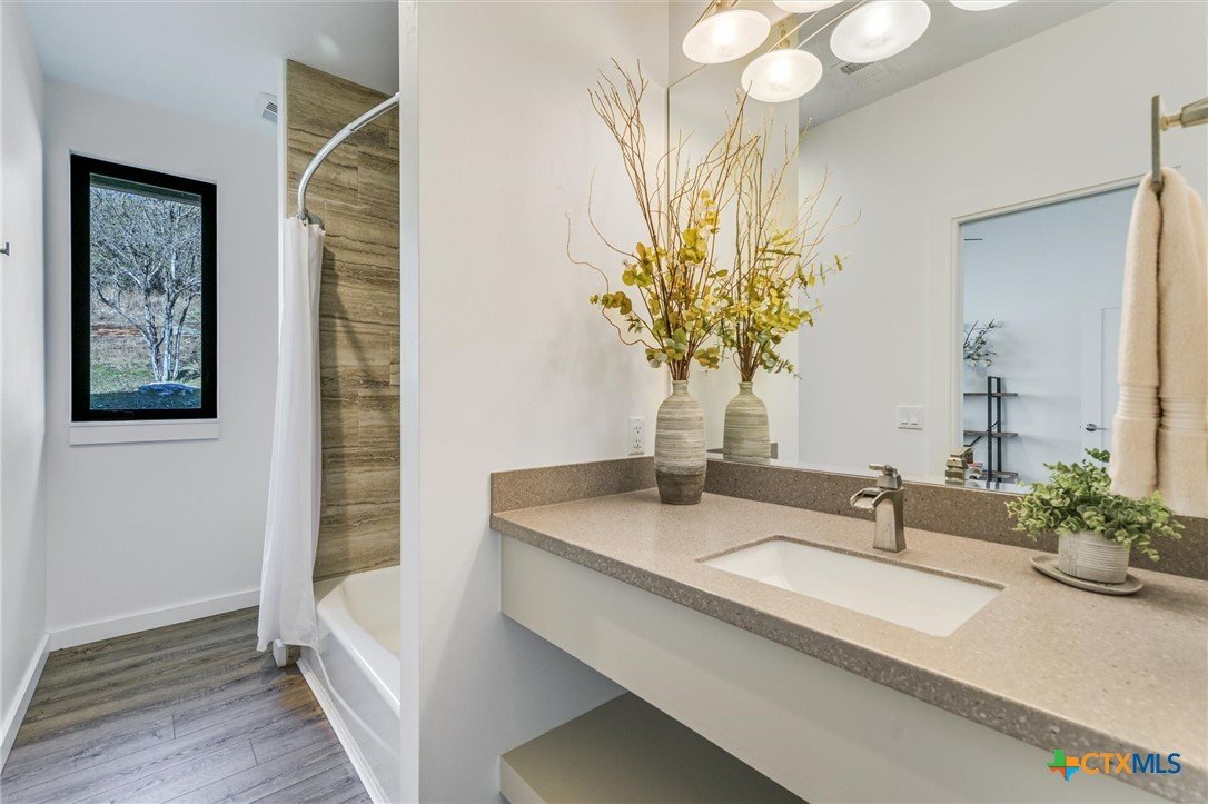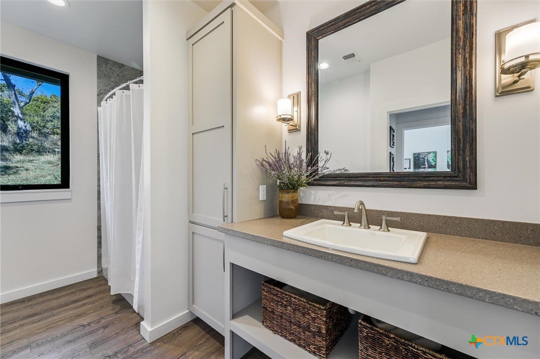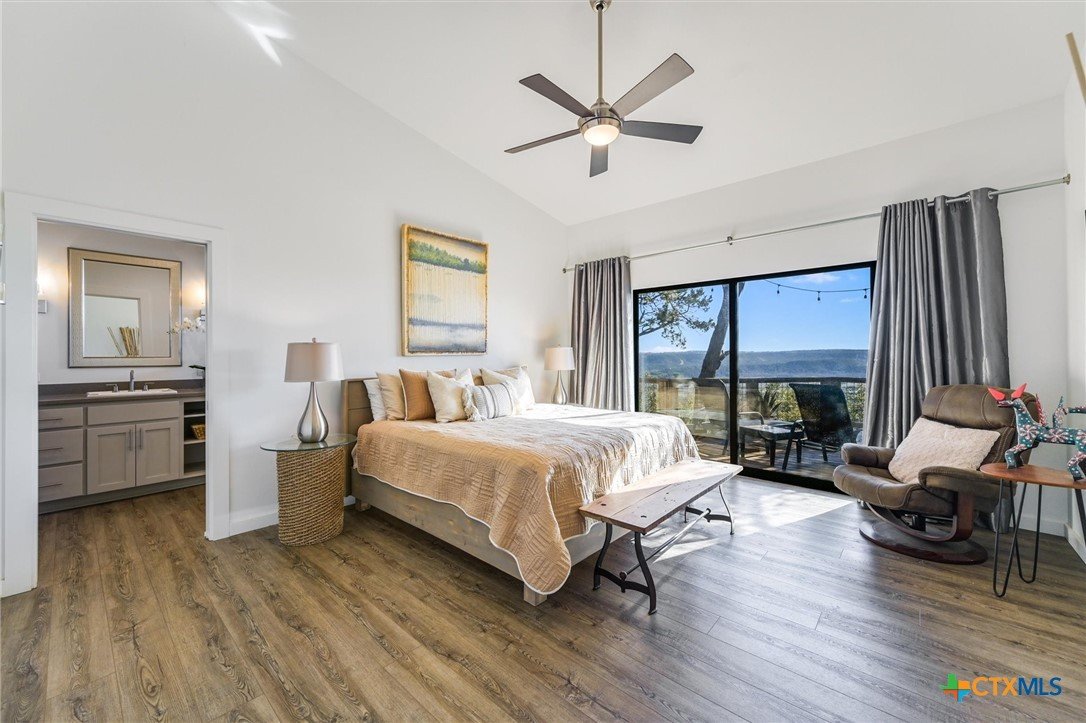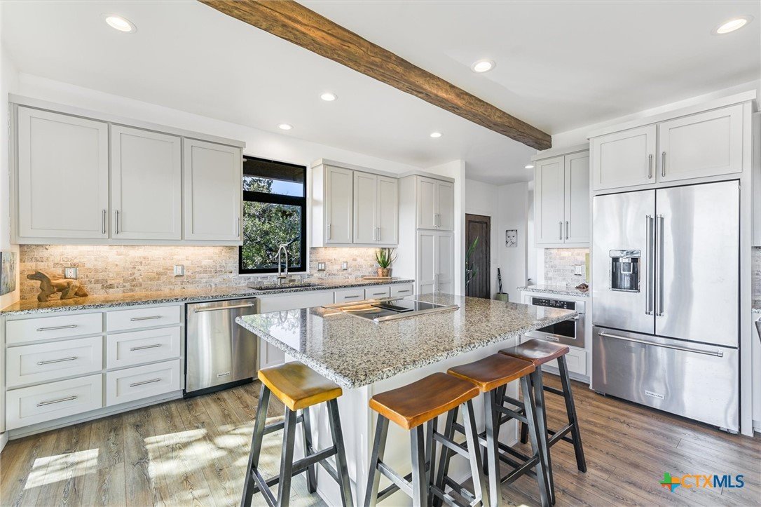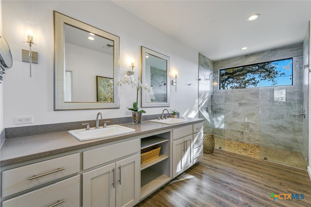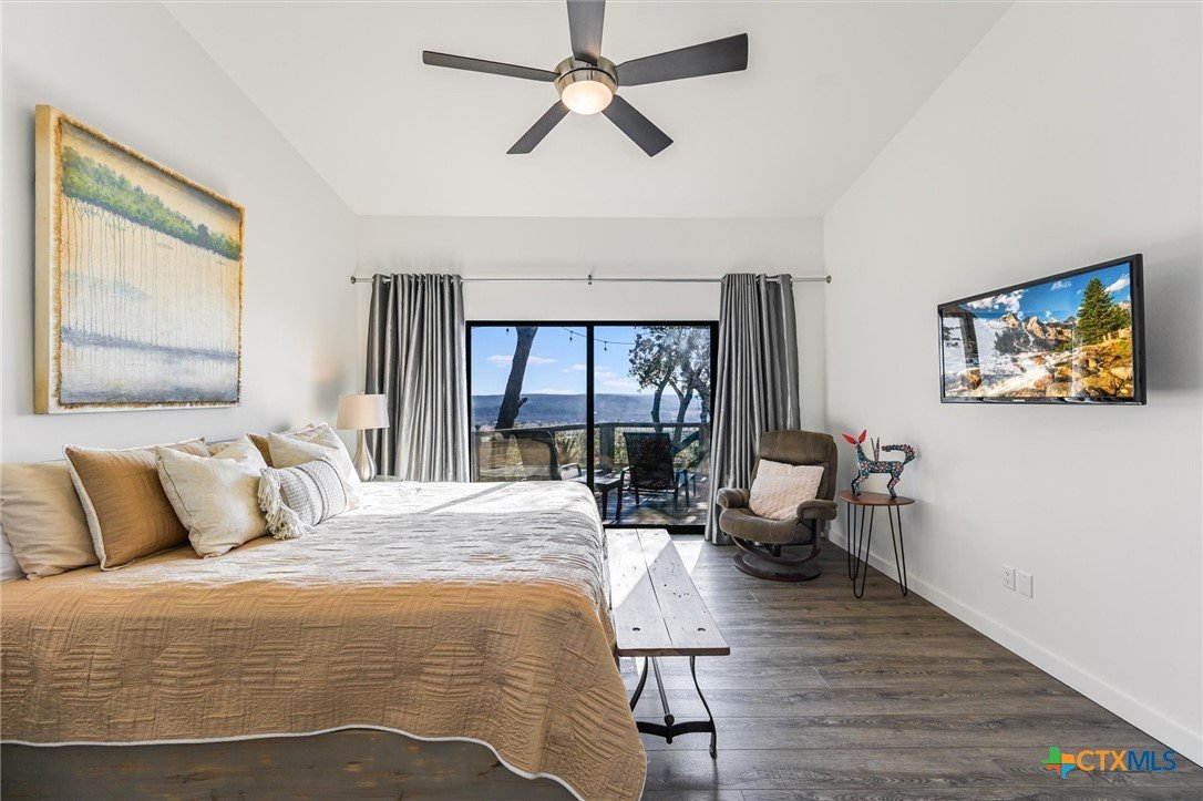 Discover Hill Country living at its finest with this stunning modern custom home, perfectly situated in the heart of the Texas Hill Country. Designed with exquisite craftsmanship and high-end aesthetics, this one-of-a-kind retreat offers breathtaking long-distance sunset views overlooking the Wimberley Valley and Devil’s Backbone. Exceptional Features: Hill Country Modern Design with a standing seam metal roof; Expansive 1,100 sq. ft. deck for seamless outdoor entertaining; Elevated bridge walkway leading to a spacious screened-in area above the detached carport; Light-filled interior with high-definition Coretec flooring and sloped ceilings; Gourmet kitchen featuring custom painted maple cabinetry, granite counters, and KitchenAid stainless steel appliances; Wet bar and wood-burning fireplace in the living area for cozy gatherings; Energy-efficient dark bronze Low-E RAM windows & spray foam insulation; Luxury finishes including Kohler plumbing fixtures; Steel driveway gate with opener for added privacy. Outdoor Paradise includes: Nestled on 1.83+/- acres among majestic live oaks and Hill Country wildlife; Professionally landscaped grounds with a 20,000-gallon rainwater collection system; Private backyard firepit with native rock walls and cedar accent columns; 12’ x 12’ detached flex space with a Mitsubishi split system—perfect for a gym, office, or studio. Just minutes from Downtown Wimberley, offering quaint shops, dining, and entertainment. This home is a true Hill Country gem, offering a rare blend of privacy, luxury, and natural beauty. Don’t miss this incredible opportunity—schedule your private showing today!