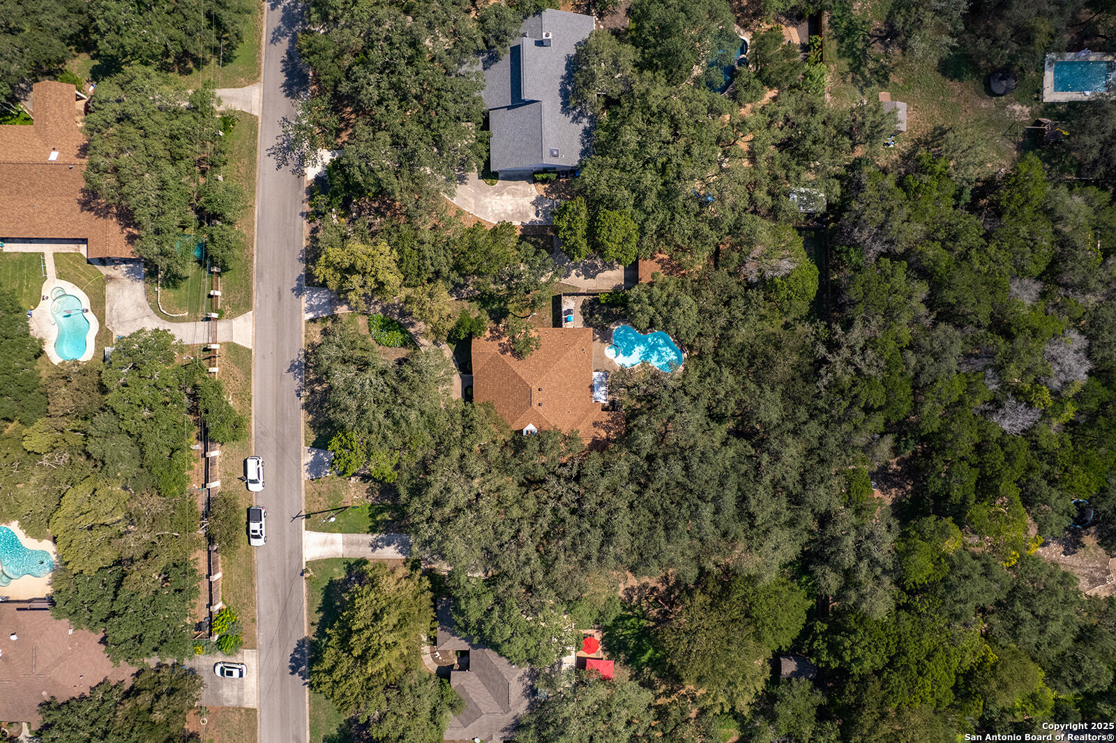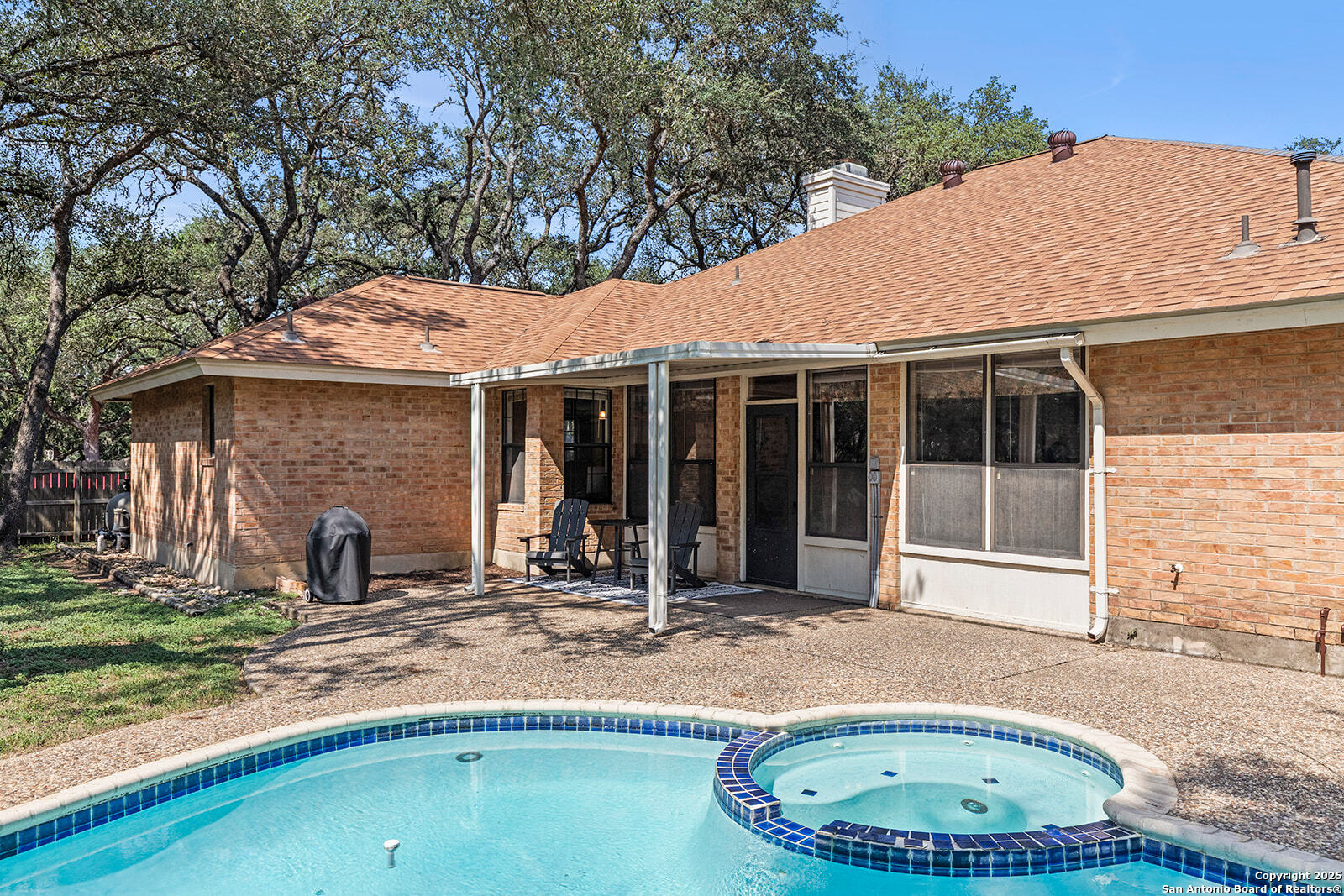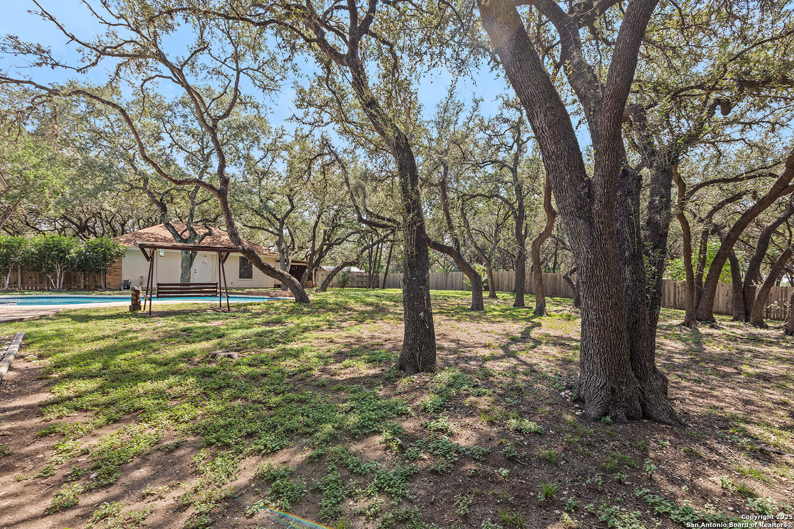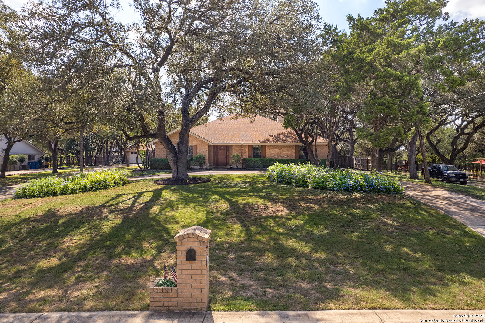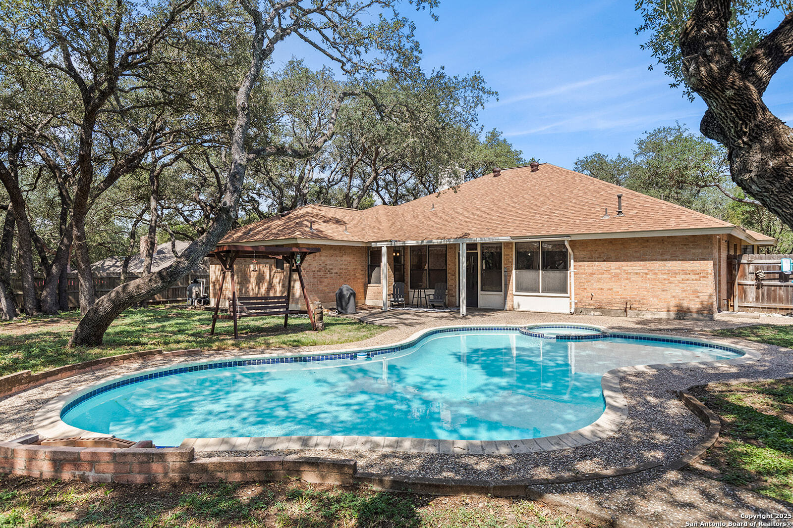 Enjoy country-style living with an easy reach to shopping and all the city conveniences offered by San Antonio and New Braunfels. The community is filled with large, tree-studded lots that provide a calm and relaxed environment. The home is very well maintained with an inviting oversized living room accented by a wood-burning fireplace. There is a wet-bar area for entertaining situated between the living room, enclosed back porch and the primary lounge area. There is a private office/4th bedroom with French doors and built-ins adjacent to the living area. The custom book cases add a library feel to the space but also remains entirely appropriate as an add'l bedroom. A spacious primary bath offers double vanities, jetted tub, shower and large walk-in closet. A large sitting area completes the primary suite. Outside has a covered patio, a NEWLY resurfaced in-ground pool for you to enjoy in a truly park-like setting. The roof was installed in 2022. The oversized detached garage has large storage areas plus a partially floored attic. The home also has a high-end water softener system in place. This property has a pre-paid home warranty that will be transferred to the new owner upon closing and funding THAT IS IN PLACE UNTIL OCTOBER 2029!!!!! NO WORRIES!