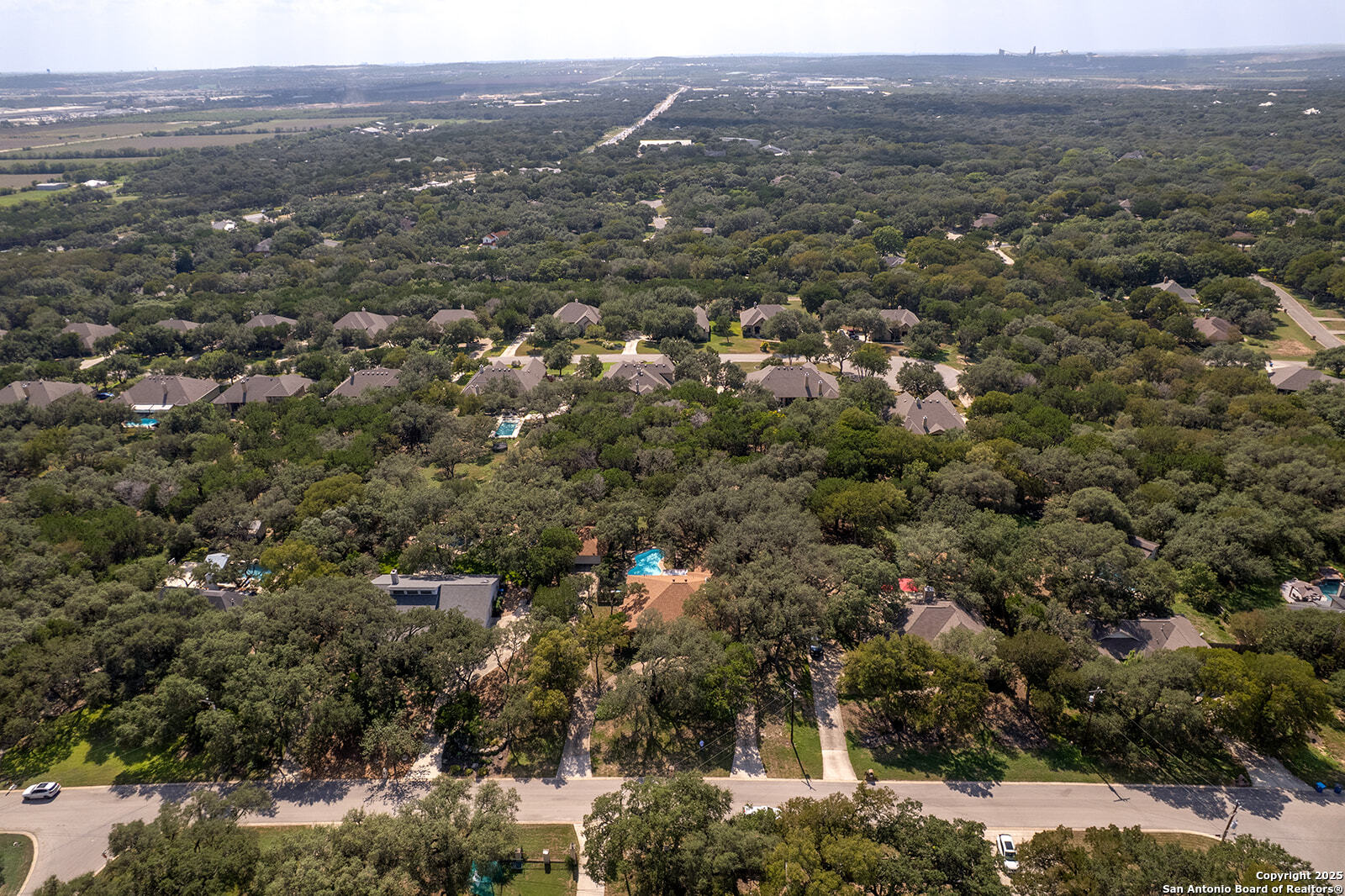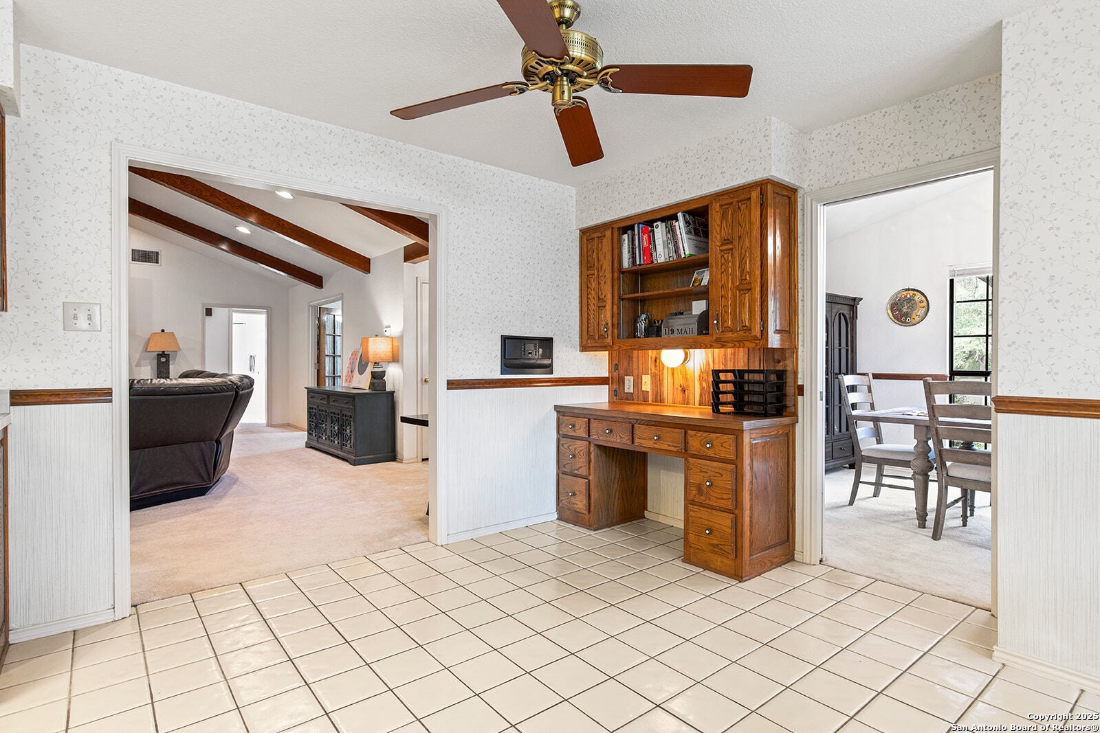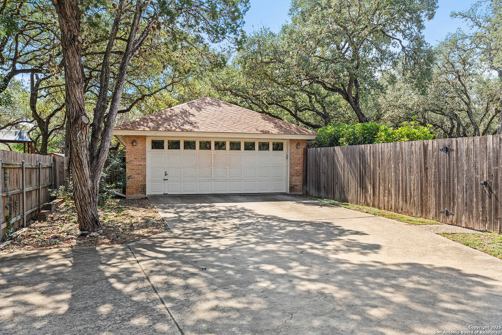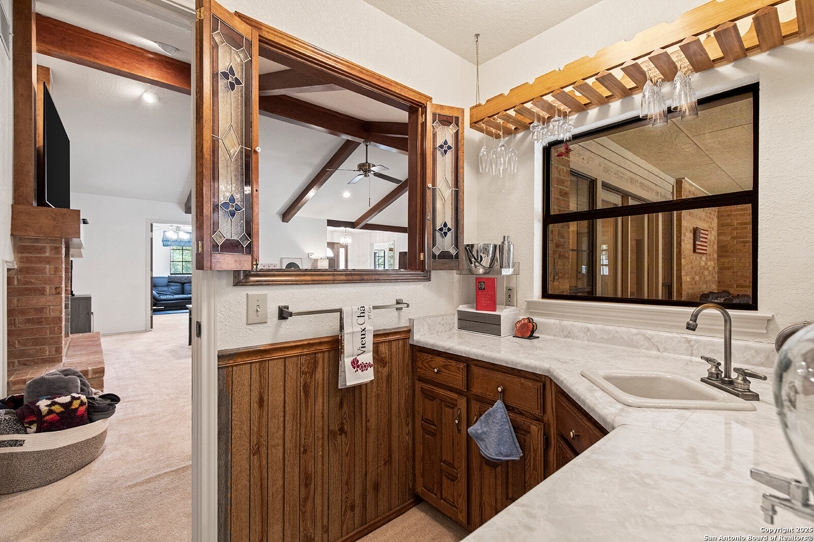 Enjoy country-style living with an easy reach to shopping and all the city conveniences offered by San Antonio and New Braunfels. The community is filled with large, tree-studded lots that provide a calm and relaxed environment. The home is very well maintained with an inviting oversized living room accented by a wood-burning fireplace. There is a wet-bar area for entertaining situated between the living room, enclosed back porch and the primary lounge area. There is a private office/4th bedroom with French doors and built-ins adjacent to the living area. The custom book cases add a library feel to the space but also remains entirely appropriate as an add'l bedroom. A spacious primary bath offers double vanities, jetted tub, shower and large walk-in closet. A large sitting area completes the primary suite. Outside has a covered patio, a NEWLY resurfaced in-ground pool for you to enjoy in a truly park-like setting. The roof was installed in 2022. The oversized detached garage has large storage areas plus a partially floored attic. The home also has a high-end water softener system in place. This property has a pre-paid home warranty that will be transferred to the new owner upon closing and funding THAT IS IN PLACE UNTIL OCTOBER 2029!!!!! NO WORRIES!