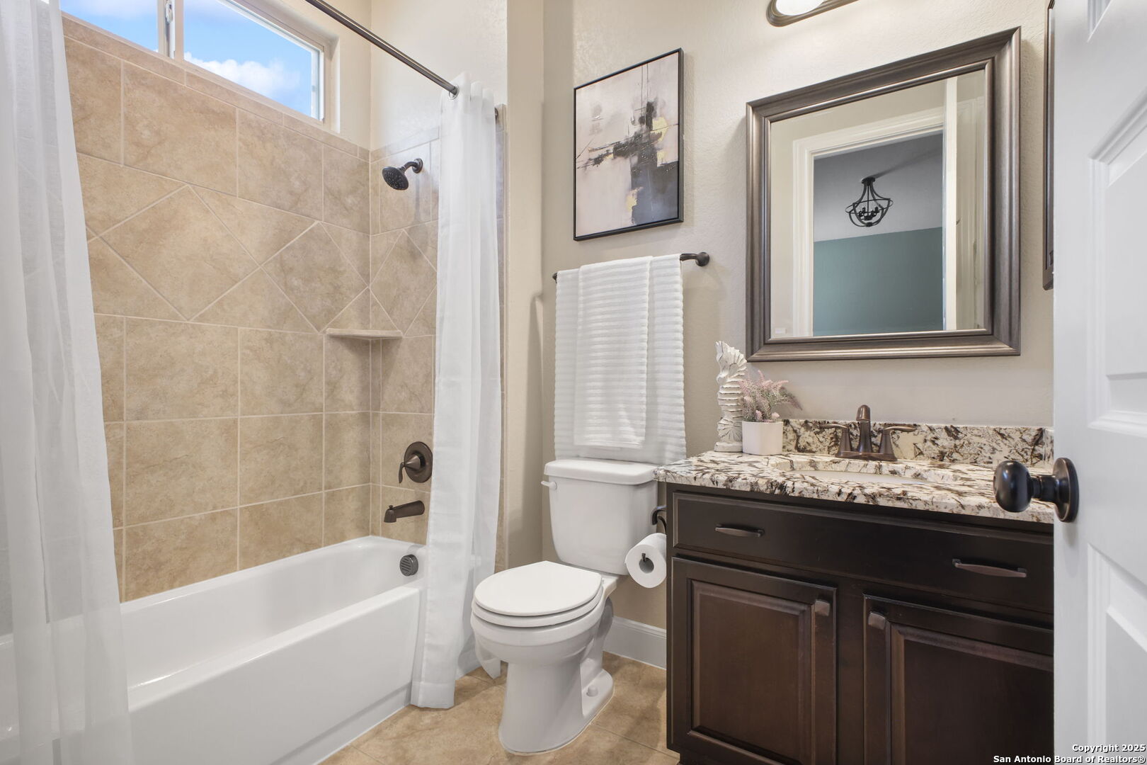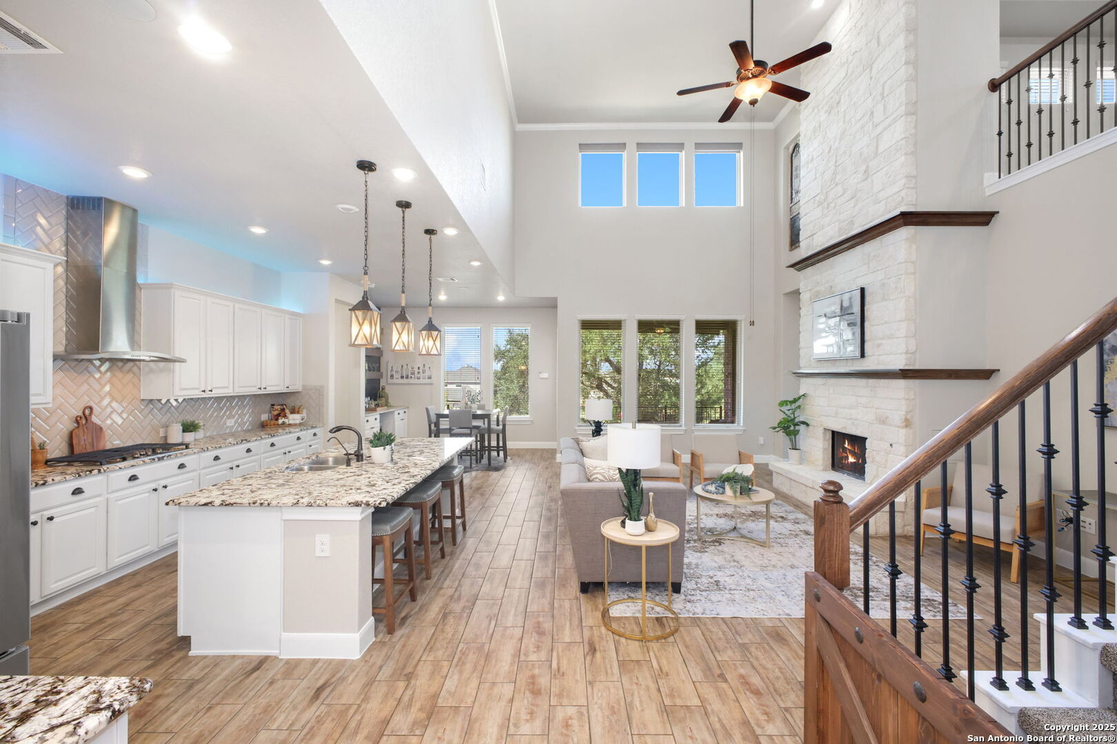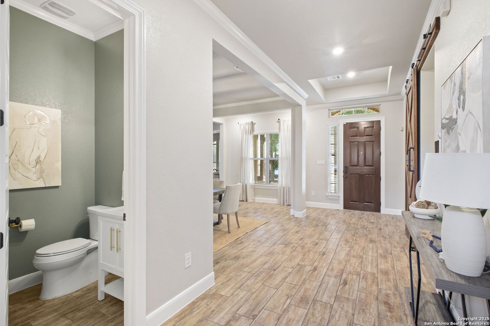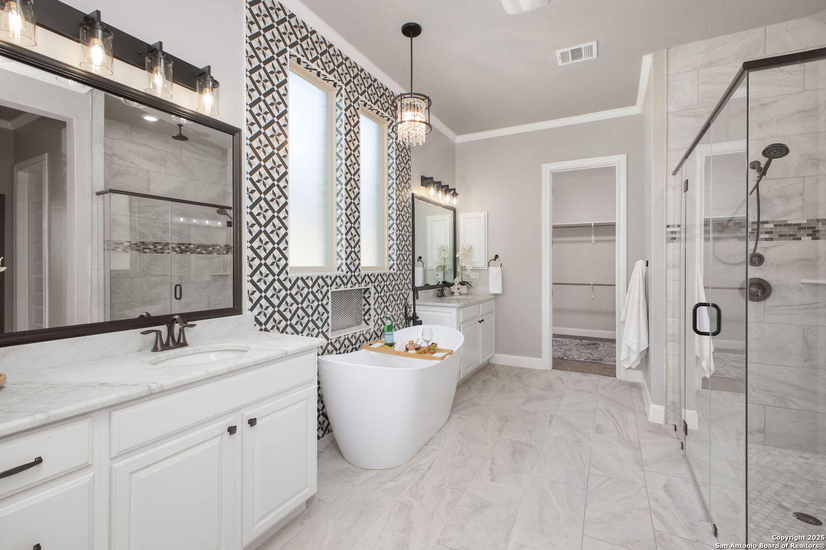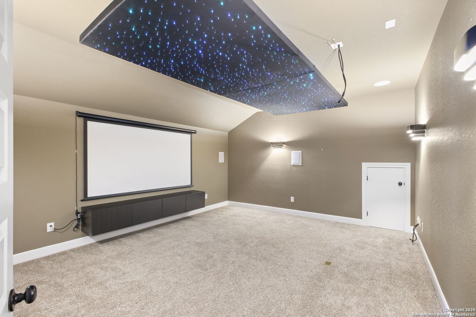 This stunning 5-bedroom, 4.5-bath home in the highly sought-after West Point community offers the perfect blend of luxury and functionality. The spacious open floor plan includes a dedicated home office, a formal dining room, a star lit-media room, a loft, and an eat-in kitchen designed for entertaining. On the main level, the primary suite retreat features a spa-inspired bathroom with a seamless glass rain shower and a standalone soaking tub overlooking the serene backyard. A private guest suite with its own full bath is also located downstairs, along with two additional bedrooms connected by a hallway bath, providing plenty of space for family or visitors. The mudroom and laundry room with utility sink add convenience, while Lutron blinds in the living room and Bali blinds in the primary suite elevate the finishes. The fully epoxy-coated tandem three-car garage is insulated and offers overhead storage. Upstairs, you'll find a bright and open loft area, an additional bedroom with a full bath, and media room complete with surround sound, screen projection system and wall sconces. Step outside to an extended covered patio with a gas hookup and a second patio space, all backing to a true greenbelt with no rear neighbors for unmatched privacy. Located close to shopping, dining, top-rated schools, and major highways, this home checks every box. Don't wait-schedule your private showing today!