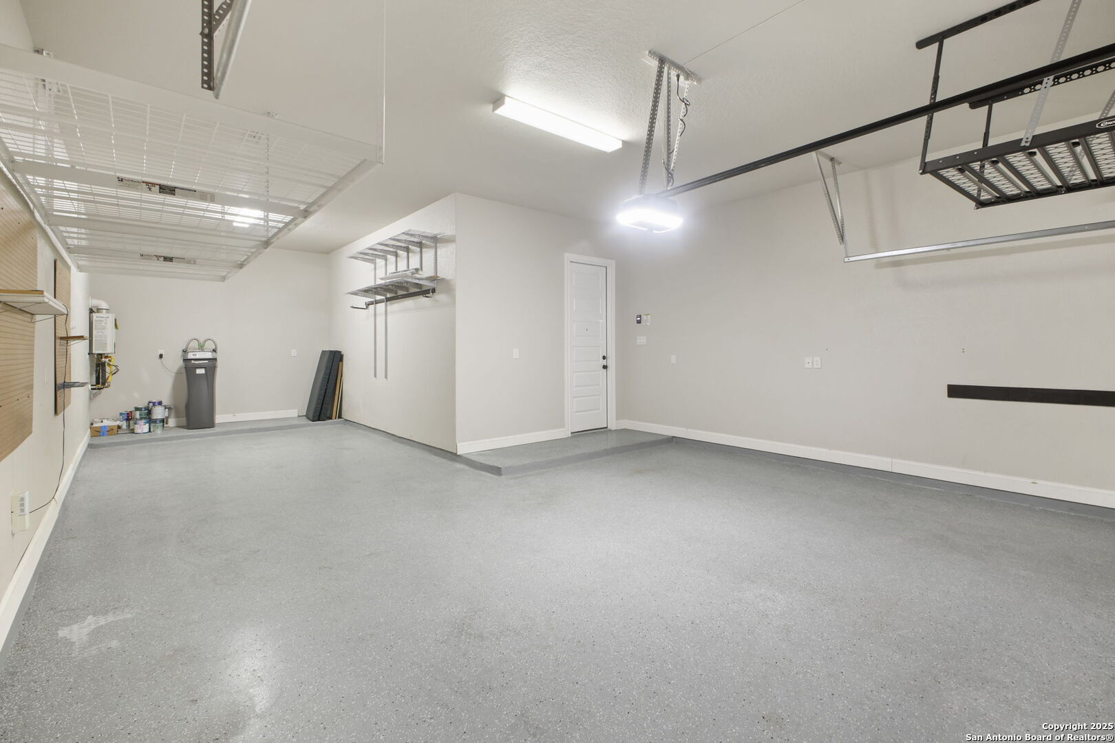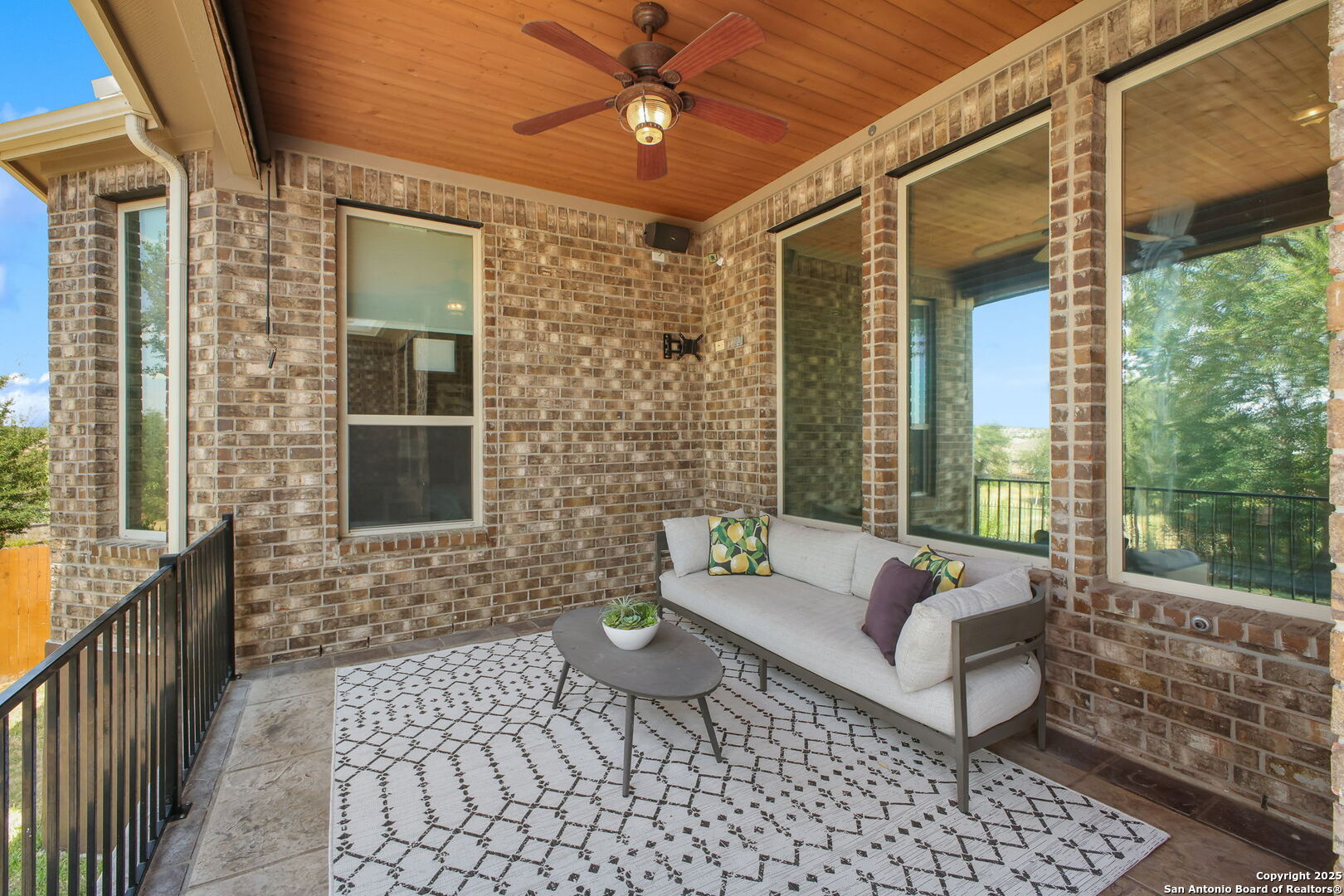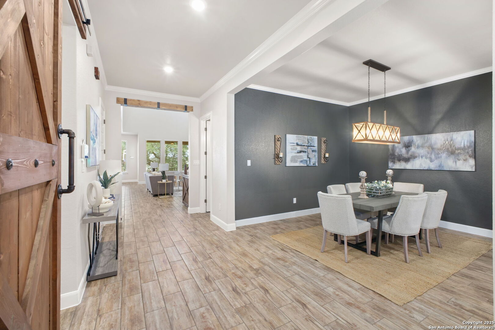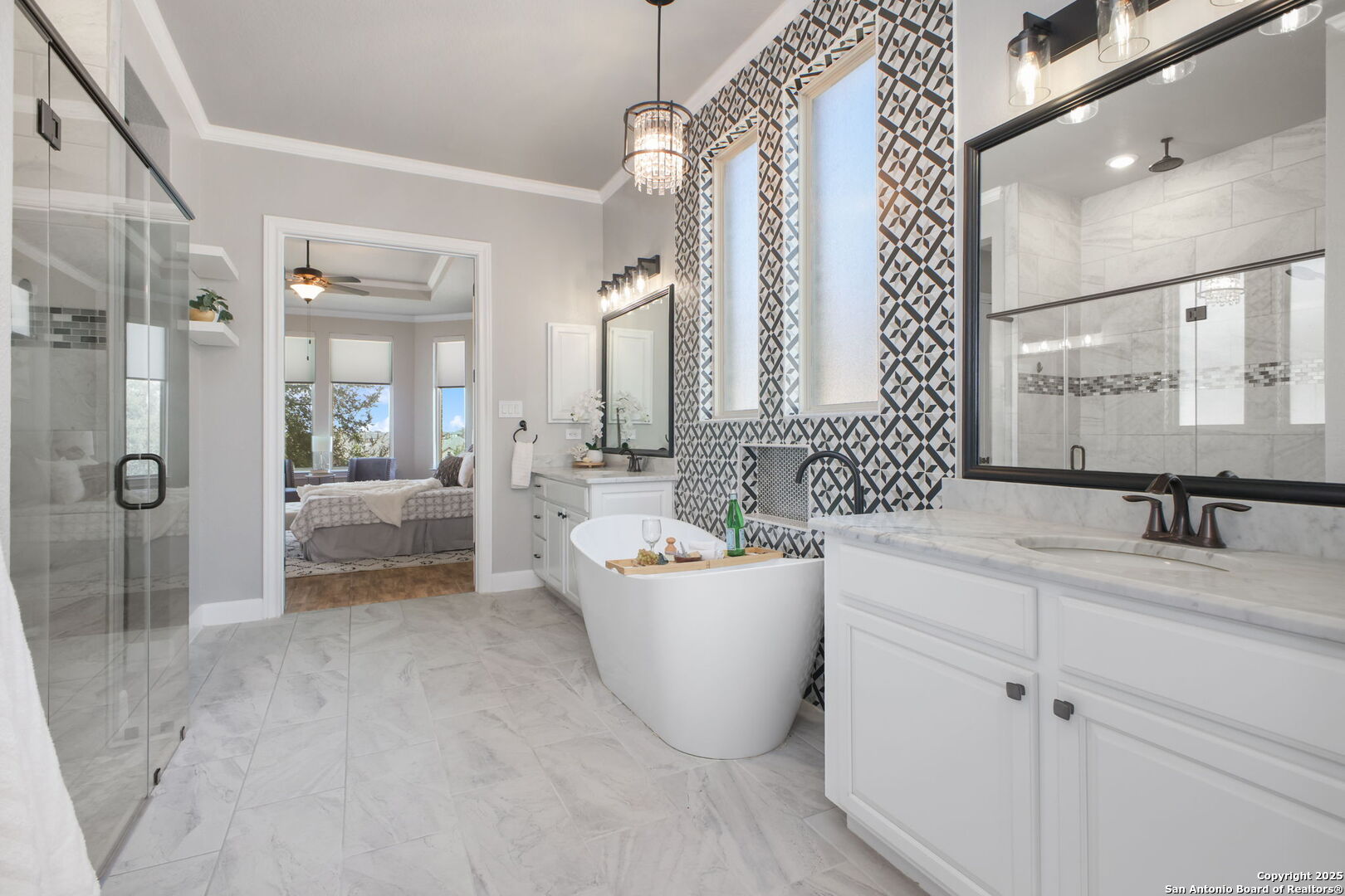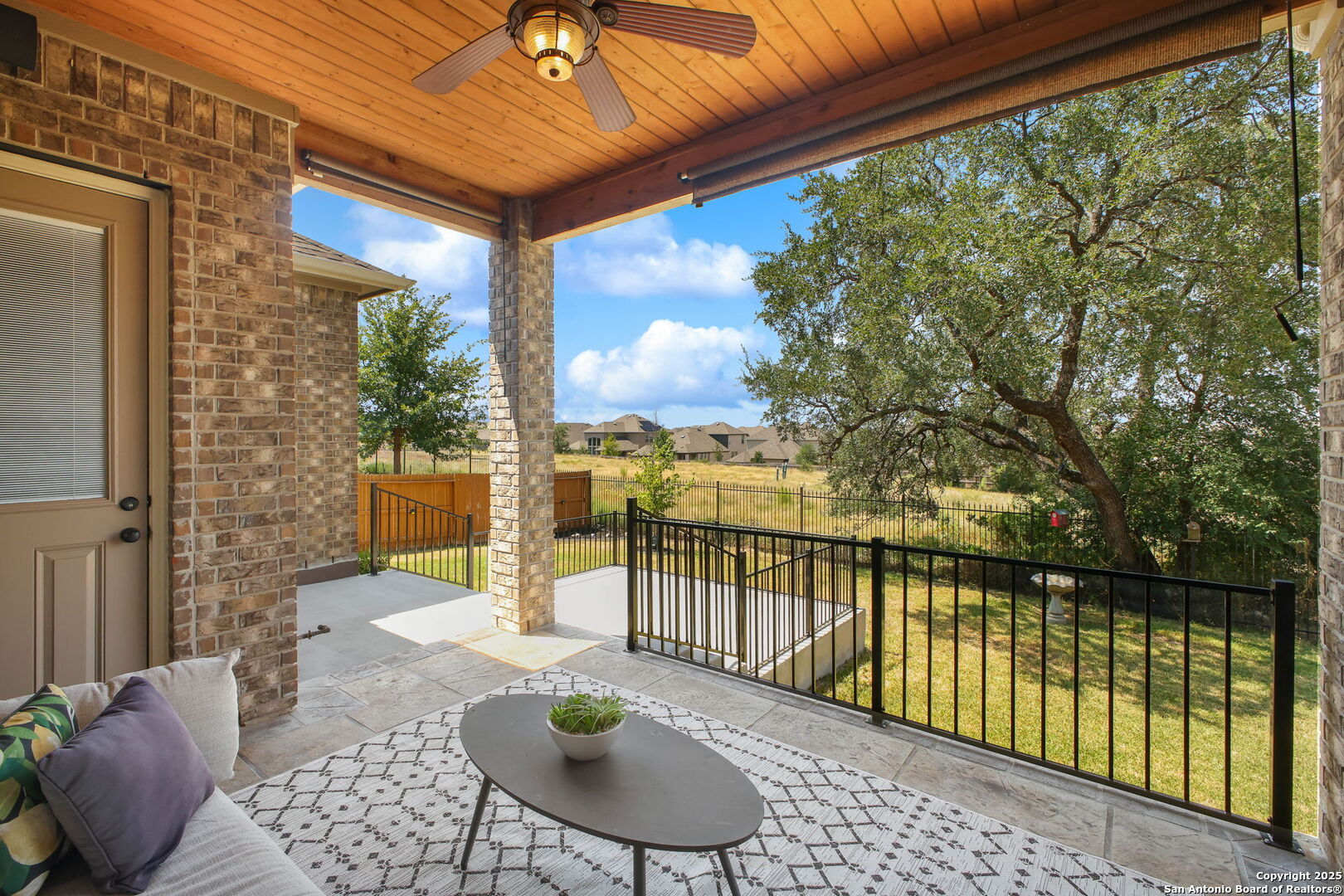 This stunning 5-bedroom, 4.5-bath home in the highly sought-after West Point community offers the perfect blend of luxury and functionality. The spacious open floor plan includes a dedicated home office, a formal dining room, a star lit-media room, a loft, and an eat-in kitchen designed for entertaining. On the main level, the primary suite retreat features a spa-inspired bathroom with a seamless glass rain shower and a standalone soaking tub overlooking the serene backyard. A private guest suite with its own full bath is also located downstairs, along with two additional bedrooms connected by a hallway bath, providing plenty of space for family or visitors. The mudroom and laundry room with utility sink add convenience, while Lutron blinds in the living room and Bali blinds in the primary suite elevate the finishes. The fully epoxy-coated tandem three-car garage is insulated and offers overhead storage. Upstairs, you'll find a bright and open loft area, an additional bedroom with a full bath, and media room complete with surround sound, screen projection system and wall sconces. Step outside to an extended covered patio with a gas hookup and a second patio space, all backing to a true greenbelt with no rear neighbors for unmatched privacy. Located close to shopping, dining, top-rated schools, and major highways, this home checks every box. Don't wait-schedule your private showing today!