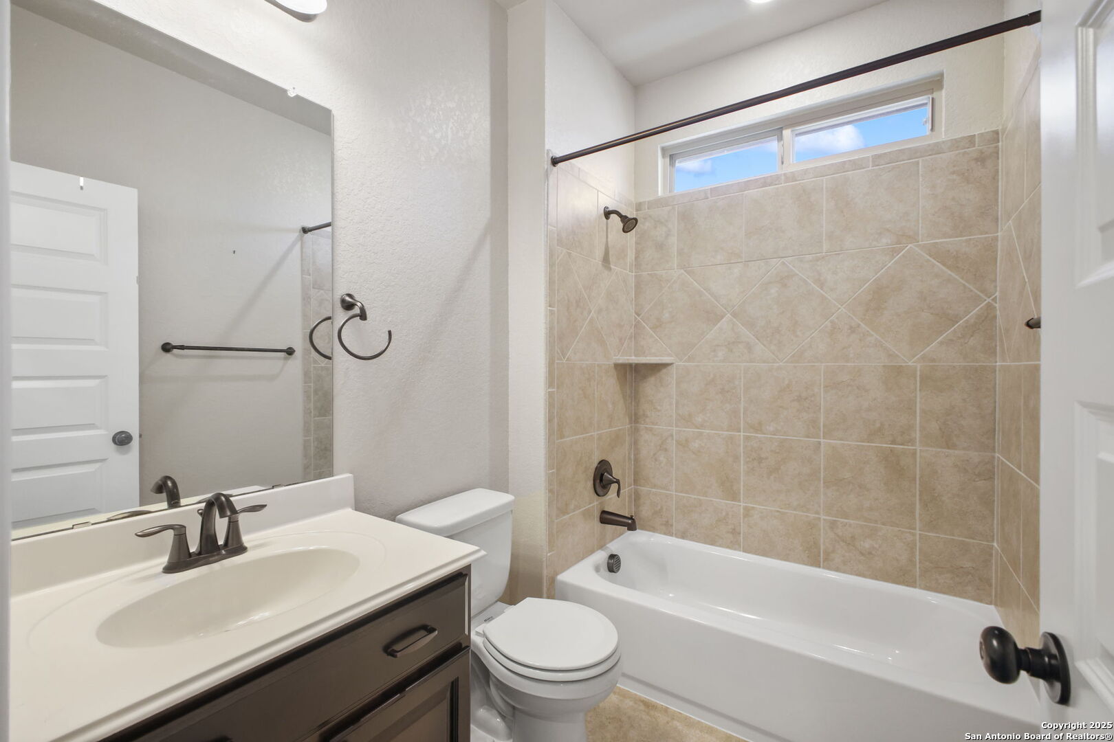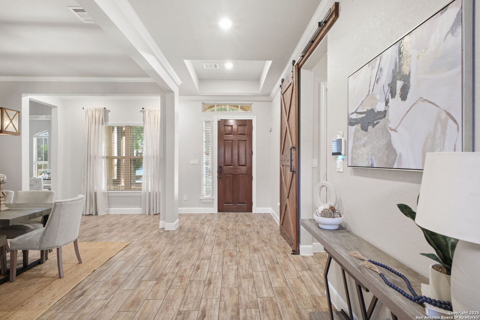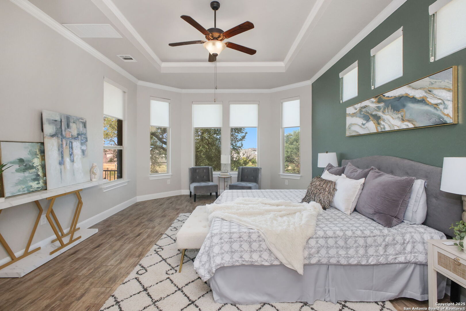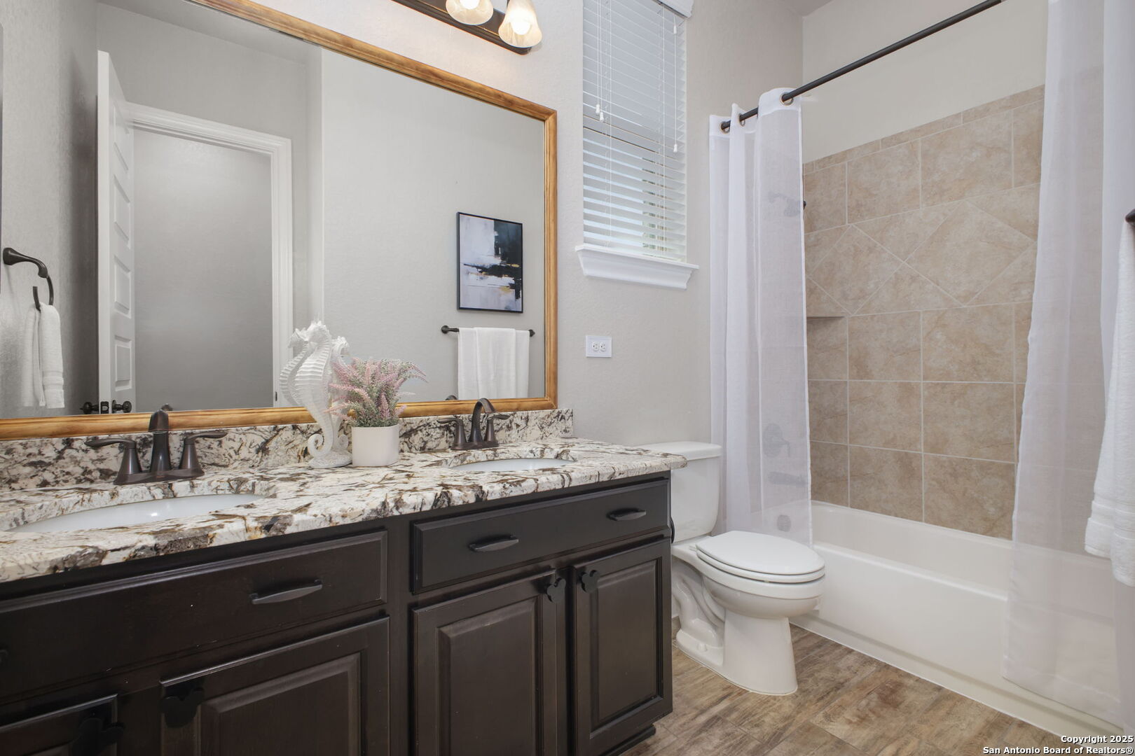 This stunning 5-bedroom, 4.5-bath home in the highly sought-after West Point community offers the perfect blend of luxury and functionality. The spacious open floor plan includes a dedicated home office, a formal dining room, a star lit-media room, a loft, and an eat-in kitchen designed for entertaining. On the main level, the primary suite retreat features a spa-inspired bathroom with a seamless glass rain shower and a standalone soaking tub overlooking the serene backyard. A private guest suite with its own full bath is also located downstairs, along with two additional bedrooms connected by a hallway bath, providing plenty of space for family or visitors. The mudroom and laundry room with utility sink add convenience, while Lutron blinds in the living room and Bali blinds in the primary suite elevate the finishes. The fully epoxy-coated tandem three-car garage is insulated and offers overhead storage. Upstairs, you'll find a bright and open loft area, an additional bedroom with a full bath, and media room complete with surround sound, screen projection system and wall sconces. Step outside to an extended covered patio with a gas hookup and a second patio space, all backing to a true greenbelt with no rear neighbors for unmatched privacy. Located close to shopping, dining, top-rated schools, and major highways, this home checks every box. Don't wait-schedule your private showing today!