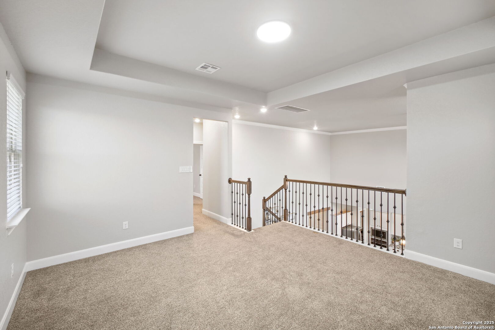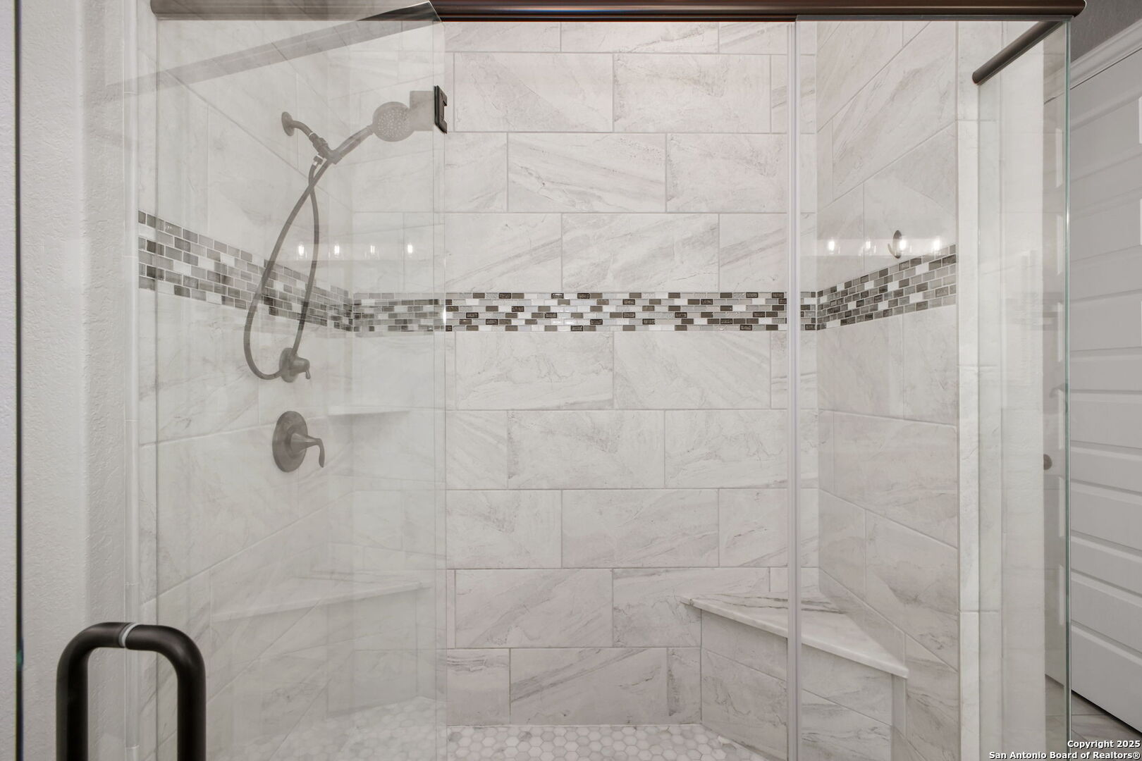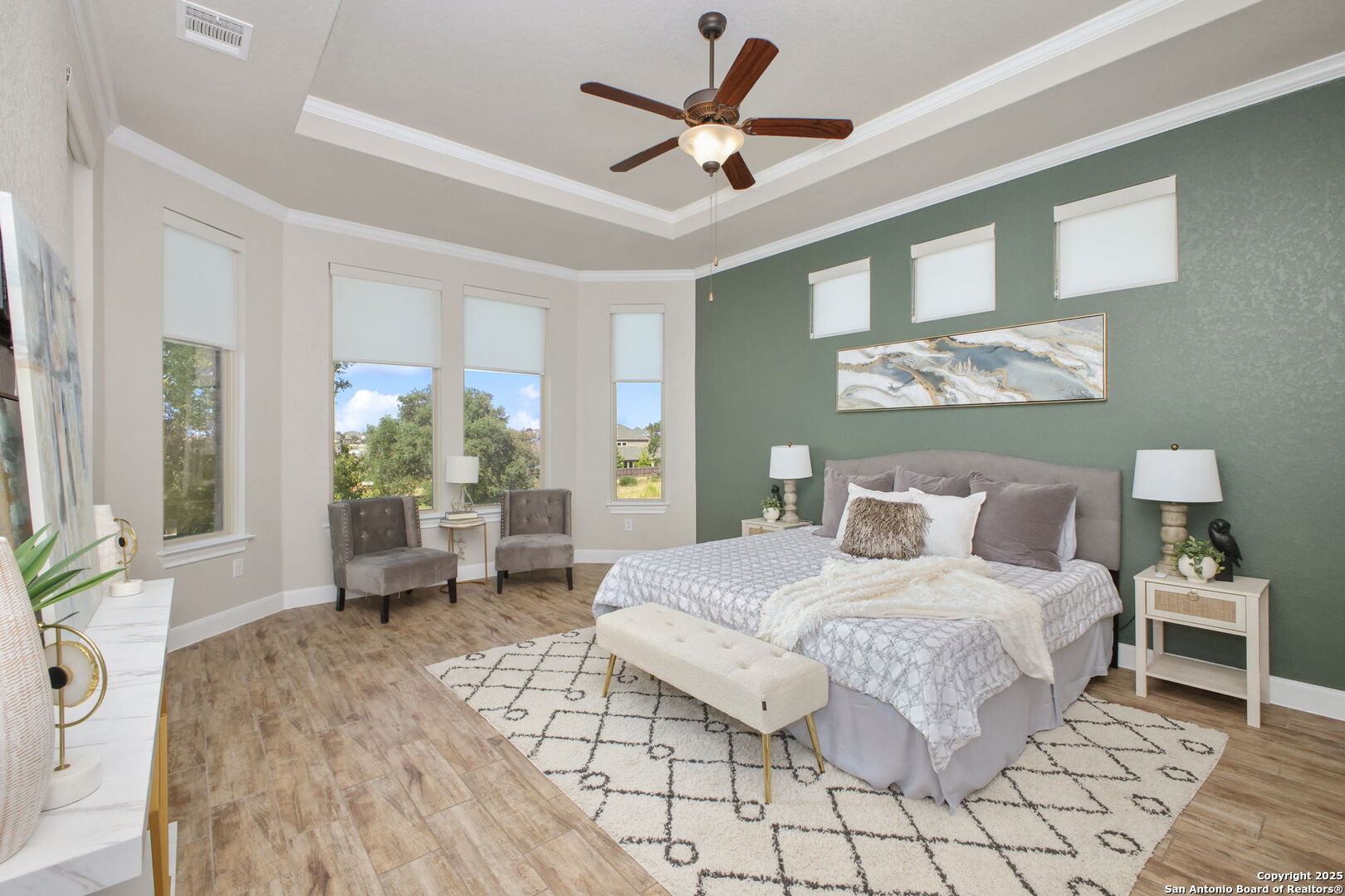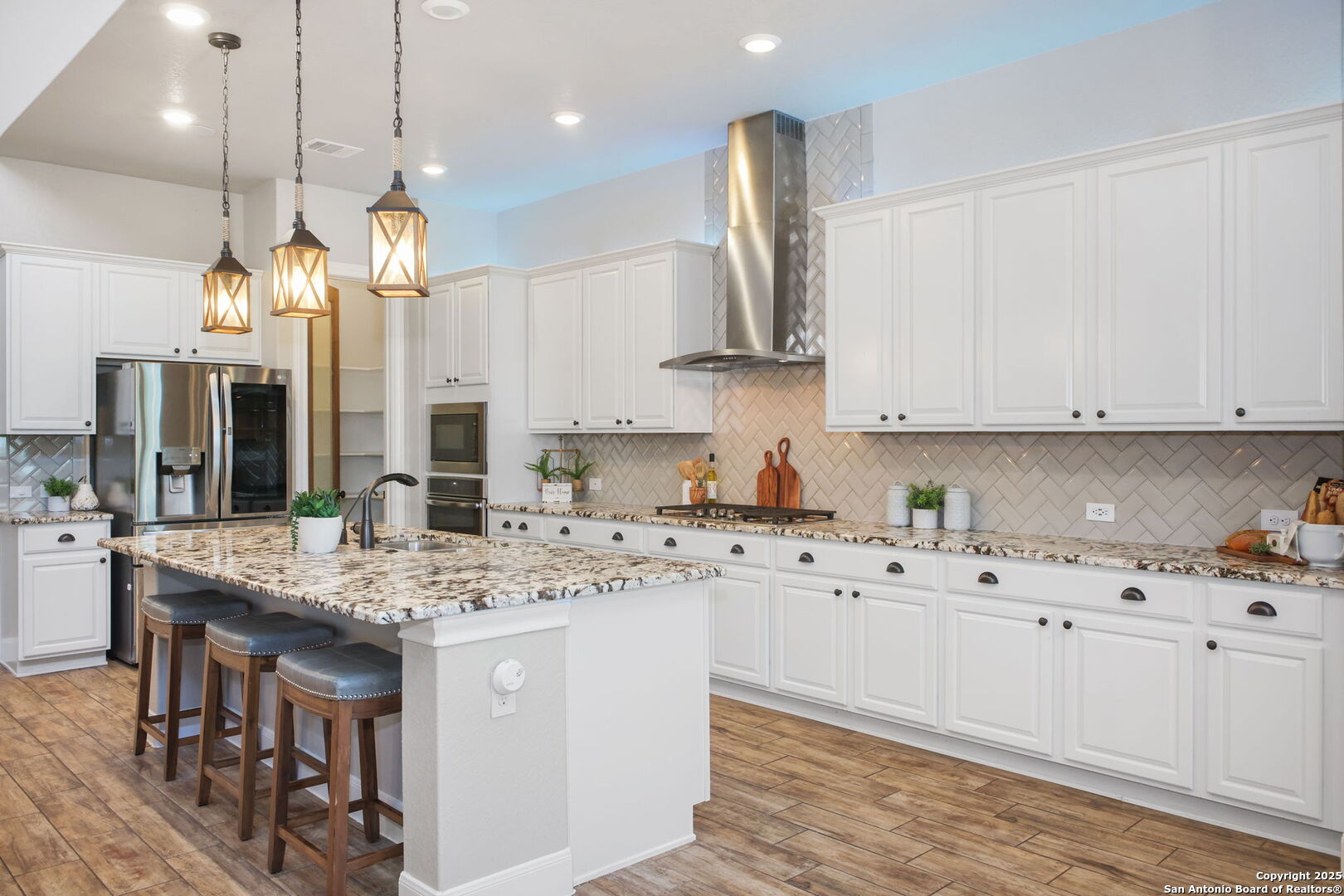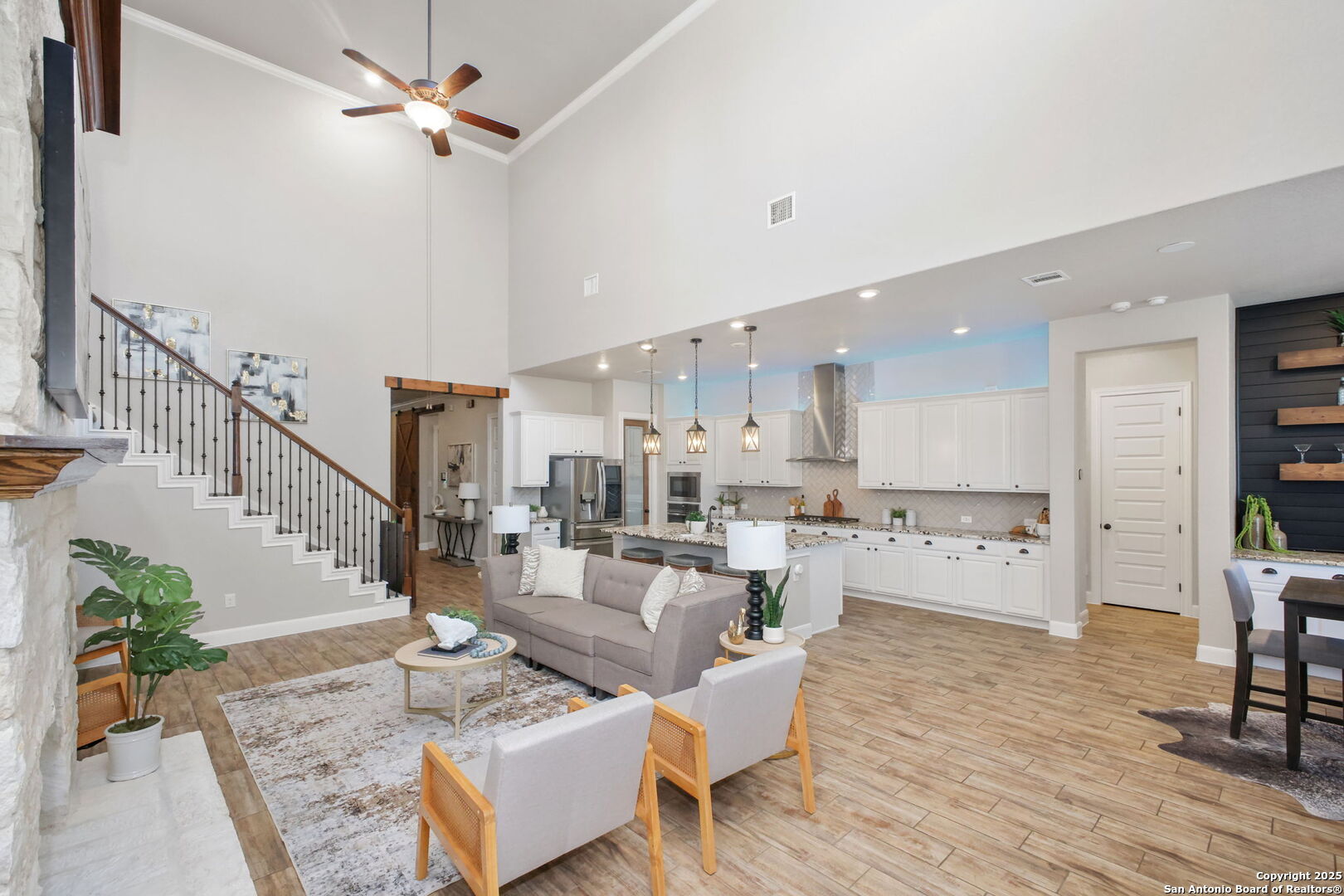 This stunning 5-bedroom, 4.5-bath home in the highly sought-after West Point community offers the perfect blend of luxury and functionality. The spacious open floor plan includes a dedicated home office, a formal dining room, a star lit-media room, a loft, and an eat-in kitchen designed for entertaining. On the main level, the primary suite retreat features a spa-inspired bathroom with a seamless glass rain shower and a standalone soaking tub overlooking the serene backyard. A private guest suite with its own full bath is also located downstairs, along with two additional bedrooms connected by a hallway bath, providing plenty of space for family or visitors. The mudroom and laundry room with utility sink add convenience, while Lutron blinds in the living room and Bali blinds in the primary suite elevate the finishes. The fully epoxy-coated tandem three-car garage is insulated and offers overhead storage. Upstairs, you'll find a bright and open loft area, an additional bedroom with a full bath, and media room complete with surround sound, screen projection system and wall sconces. Step outside to an extended covered patio with a gas hookup and a second patio space, all backing to a true greenbelt with no rear neighbors for unmatched privacy. Located close to shopping, dining, top-rated schools, and major highways, this home checks every box. Don't wait-schedule your private showing today!
