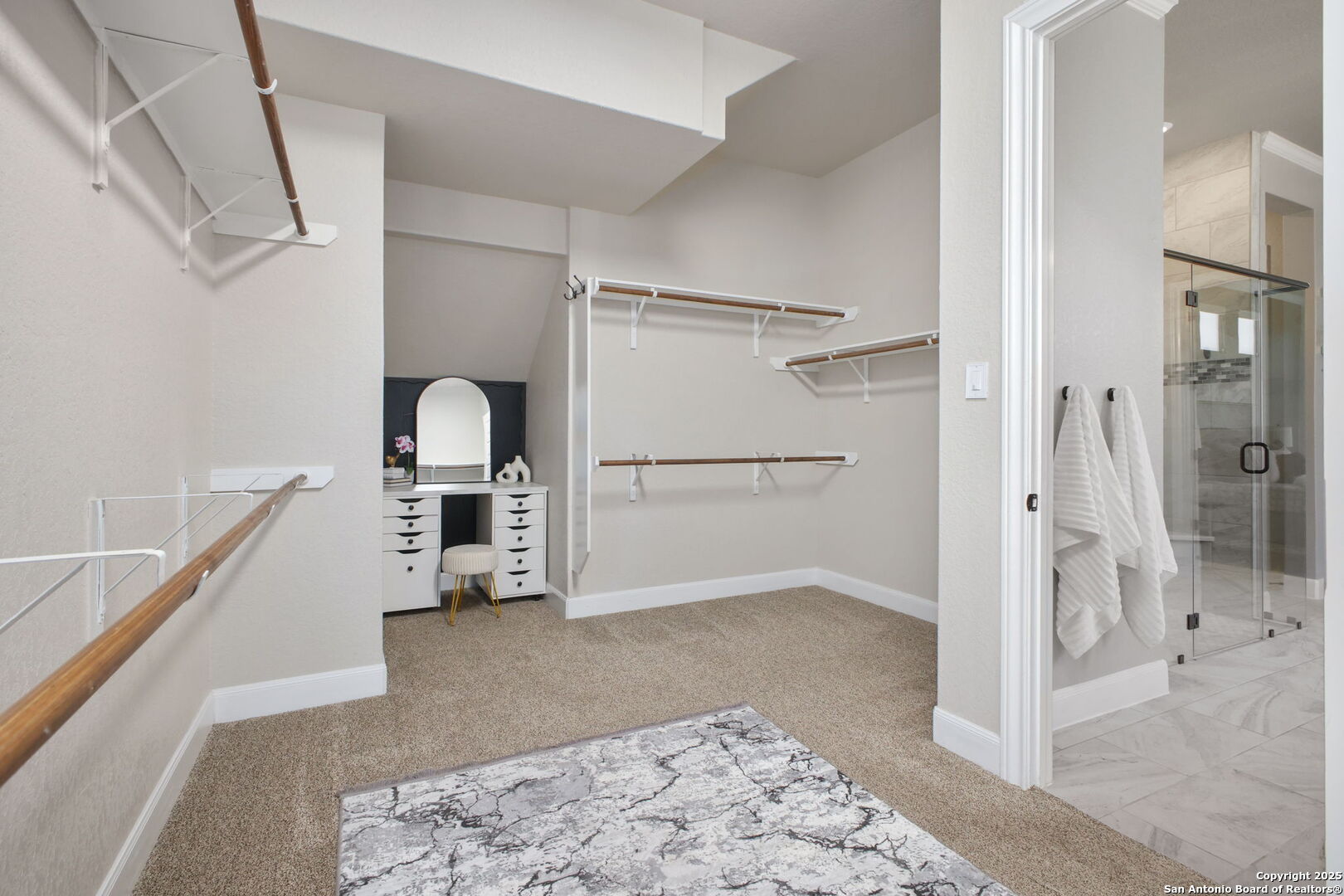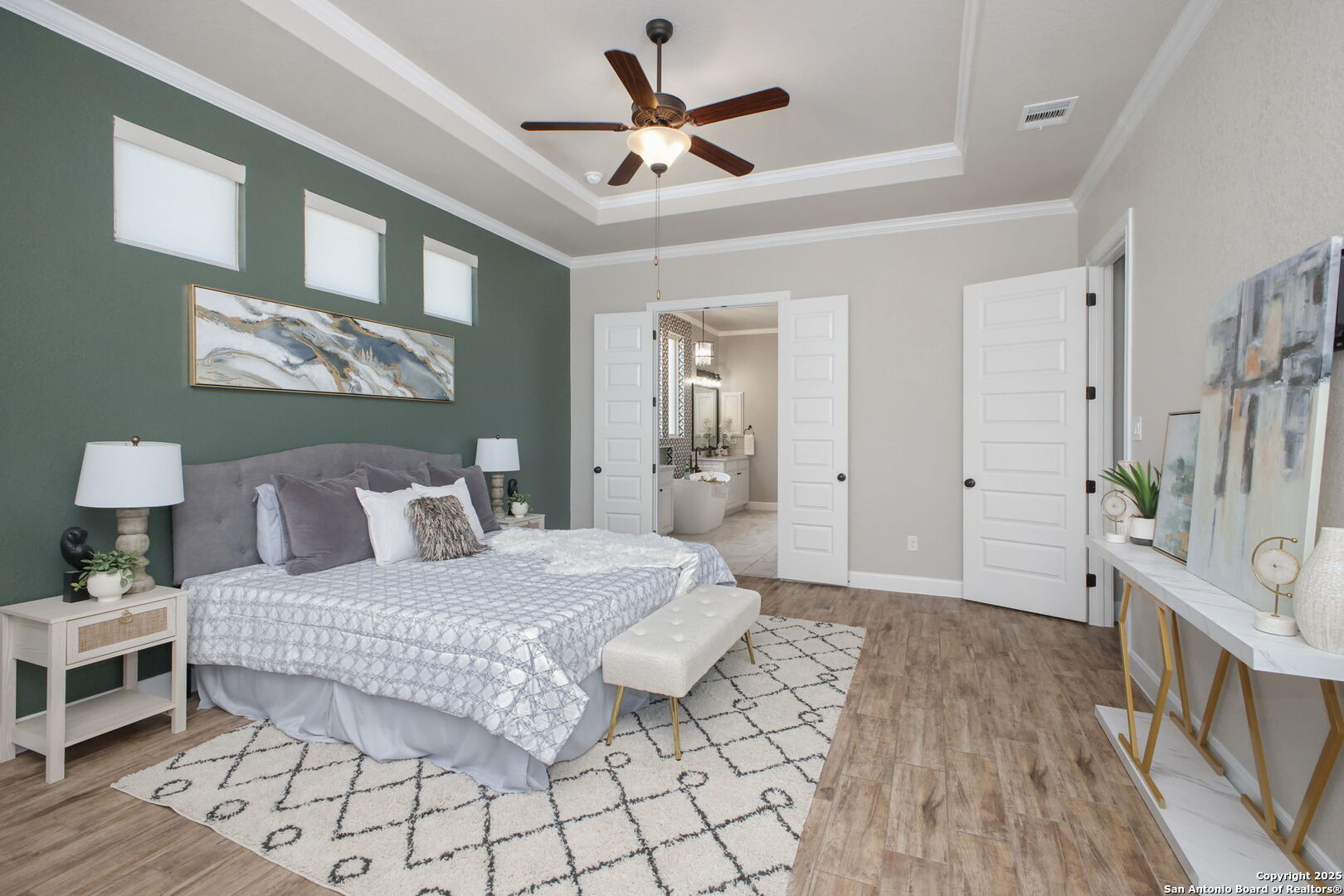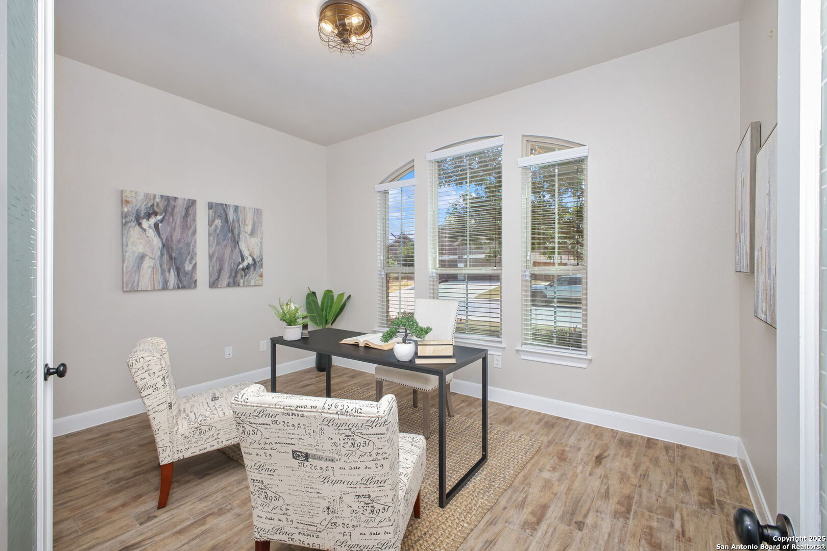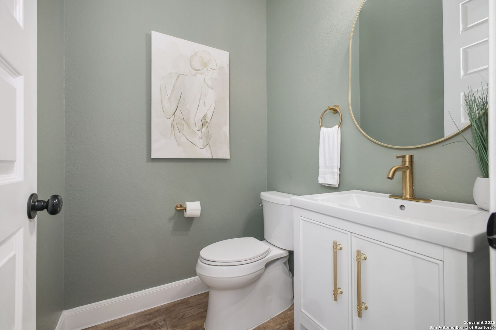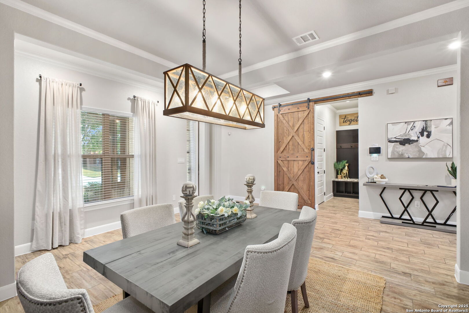 This stunning 5-bedroom, 4.5-bath home in the highly sought-after West Point community offers the perfect blend of luxury and functionality. The spacious open floor plan includes a dedicated home office, a formal dining room, a star lit-media room, a loft, and an eat-in kitchen designed for entertaining. On the main level, the primary suite retreat features a spa-inspired bathroom with a seamless glass rain shower and a standalone soaking tub overlooking the serene backyard. A private guest suite with its own full bath is also located downstairs, along with two additional bedrooms connected by a hallway bath, providing plenty of space for family or visitors. The mudroom and laundry room with utility sink add convenience, while Lutron blinds in the living room and Bali blinds in the primary suite elevate the finishes. The fully epoxy-coated tandem three-car garage is insulated and offers overhead storage. Upstairs, you'll find a bright and open loft area, an additional bedroom with a full bath, and media room complete with surround sound, screen projection system and wall sconces. Step outside to an extended covered patio with a gas hookup and a second patio space, all backing to a true greenbelt with no rear neighbors for unmatched privacy. Located close to shopping, dining, top-rated schools, and major highways, this home checks every box. Don't wait-schedule your private showing today!